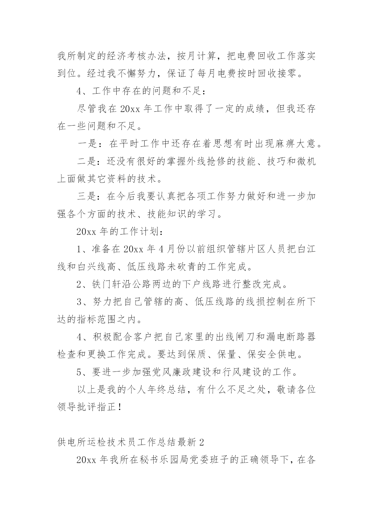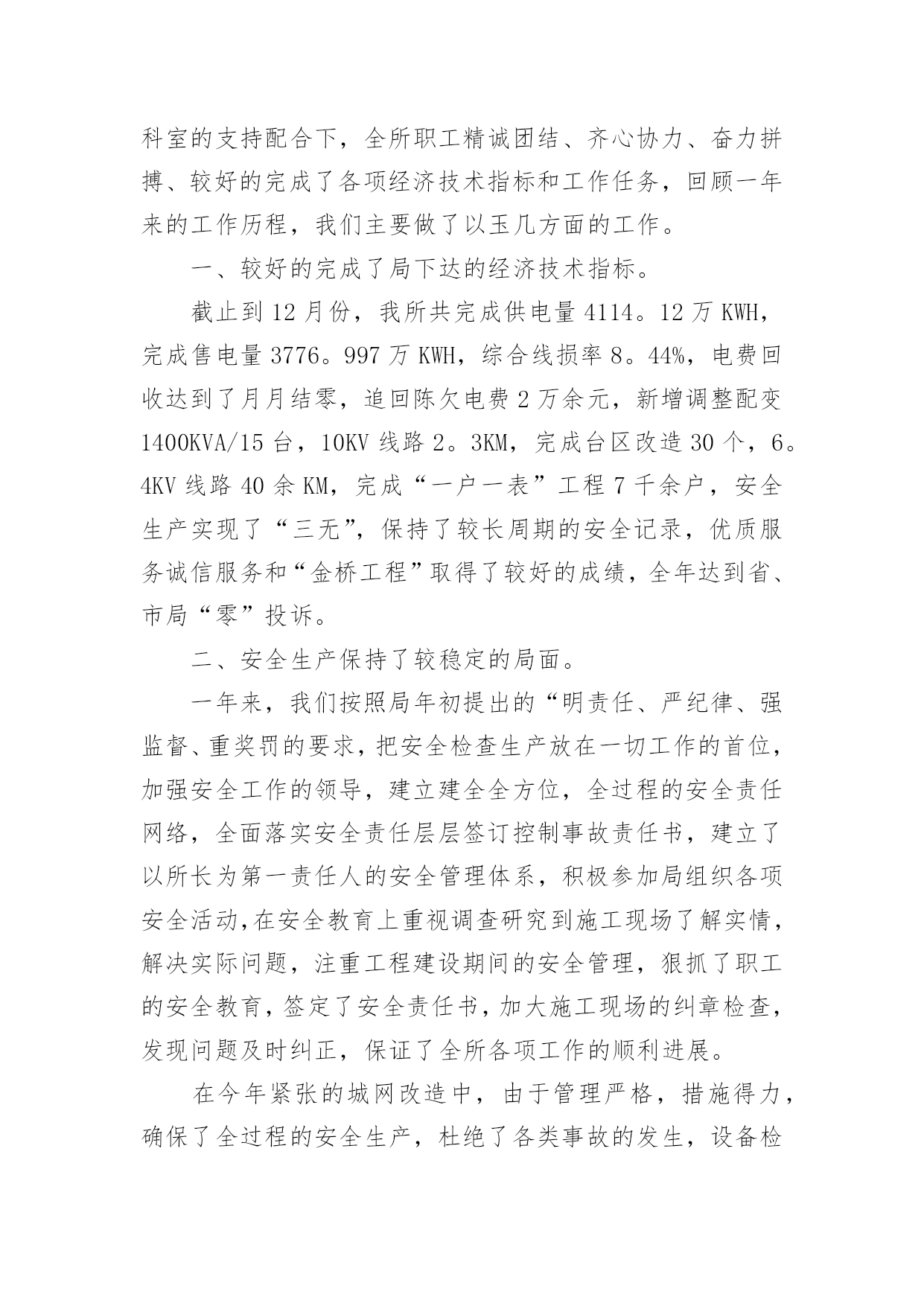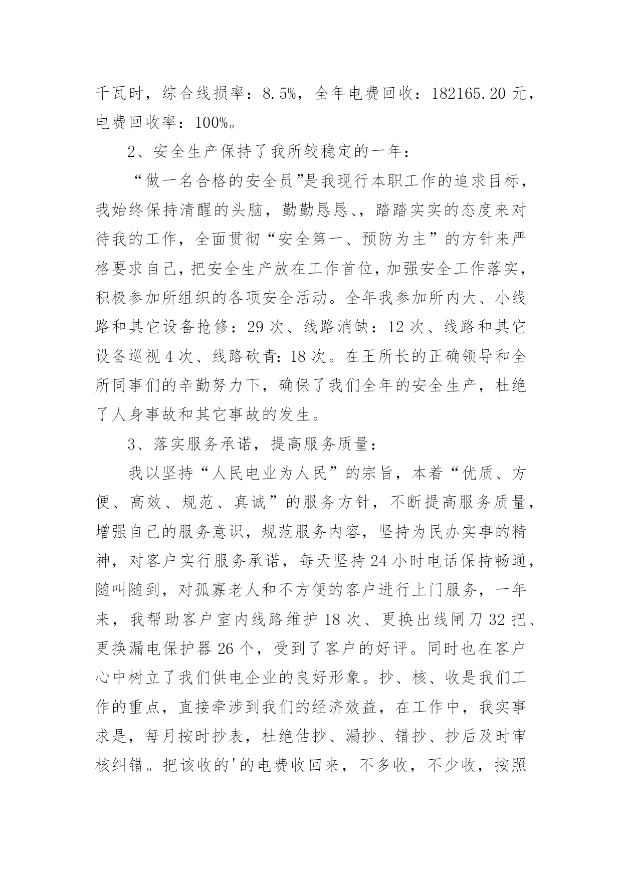供电所运检技术员工作总结最新总结是对取得的成绩、存在的问题及得到的经验和教训等方面情况进行评价与描述的一种书面材料,它是增长才干的一种好办法,因此,让我们写一份总结吧。我们该怎么去写总结呢?下面是小编为大家收集的供电所运检技术员工作总结最新,仅供参考,大家一起来看看吧。供电所运检技术员工作总结最新1光阴似箭,日月如梭,转眼又是一年,在这一年来,我们在供电局党委和供电所长和谭所长的正确领导下,以及两乡一镇政府的大力支持和全所同事们的帮助下,我以公司提出的“团结、诚信、高效、创新”的企业精神为核心,以安全生产为基础,以经济效益为中心,坚持严格要求自己,强化形象,提高自身素质,做好本职工作,以诚待人,爱岗敬业讲奉献。正确认识自身的工作和价值,正确处理苦与乐,得与失、个人利益和集体利益的关系,坚持甘于奉献、诚实敬业。通过一年的辛苦努力,我较好的完成了各项工作任务指标。现将我一年来的工作情况向局领导和所长简要总结如下:1、经济效益完成情况:今年来,我共计抄收公变和专变11个,截止到12月份,共计完成了全年供电量:389521千瓦时,售电量:356286千瓦时,综合线损率:8.5%,全年电费回收:182165.20元,电费回收率:100%。2、安全生产保持了我所较稳定的一年:“做一名合格的安全员”是我现行本职工作的追求目标,我始终保持清醒的头脑,勤勤恳恳、,踏踏实实的态度来对待我的工作,全面贯彻“安全第一、预防为主”的方针来严格要求自己,把安全生产放在工作首位,加强安全工作落实,积极参加所组织的各项安全活动。全年我参加所内大、小线路和其它设备抢修:29次、线路消缺:12次、线路和其它设备巡视4次、线路砍青:18次。在王所长的正确领导和全所同事们的辛勤努力下,确保了我们全年的安全生产,杜绝了人身事故和其它事故的发生。3、落实服务承诺,提高服务质量:我以坚持“人民电业为人民”的宗旨,本着“优质、方便、高效、规范、真诚”的服务方针,不断提高服务质量,增强自己的服务意识,规范服务内容,坚持为民办实事的精神,对客户实行服务承诺,每天坚持24小时电话保持畅通,随叫随到,对孤寡老人和不方便的客户进行上门服务,一年来,我帮助客户室内线路维护18次、更换出线闸刀32把、更换漏电保护器26个,受到了客户的好评。同时也在客户心中树立了我们供电企业的良好形象。抄、核、收是我们工作的重点,直接牵涉到我们的经济效益,在工作中,我实事求是,每月按时抄表,杜绝估抄、漏抄、错抄、抄后及时审核纠错。把该收的'的电费收回来,不多收,不少收,按照我所制定的经济考核办法,按月计算,把电费回收工作落实到位。经过我不懈努力,保证了每月电费按时回收接零。4、工作中存在的问题和不足:尽管我在20xx年工作中取得了一定的成绩,但我还存在一些问题和不足。一是:在平时工作中还存在着思想有时出现麻痹大意。二是:还没有很好的掌握外线抢修的技能、技巧和微机上面做其它资料的技术。三是:在今后我要认真把各项工作努力做好和进一步加强各个方面的技术、技能知识的学习。20xx年的工作计划:1、准备在20xx年4月份以前组织管辖片区人员把白江线和白兴线高、低压线路未砍青的工作完成。2、铁门轩沿公路两边的下户线路进行整改完成。3、努力把自己管辖的高、低压线路的线损控制在所下达的指标范围之内。4、积极配合客户把自己家里的出线闸刀和漏电断路器检查和更换工作完成。要达到保质、保量、保安全供电。5、要进一步加强党风廉政建设和行风建设的工作。以上是我的个人年终总结,有什么不足之处,敬请各位领导批评指正!供电所运检技术员工作总结最新220xx年我所在秘书乐园局党委班子的正确领导下,在各科室的支持配合下,全所职工精诚团结、齐心协力、奋力拼搏、较好的完成了各项经济技术指标和工作任务,回顾一年来的工作历程,我们主要做了以玉几方面的工作。一、较好的完成了局下达的经济技术指标。截止到12月份,我所共完成供电量4114。12万KWH,完成售电量3776。997万KWH,综合线损率8。44%,电费回收达到了月月结零,追回陈欠电费2万余元,新增调整配变1400KVA/15台,10KV线路2。3KM,完成台区改造30个,6。4KV线路40余KM,完成“一户一表”工程7千余户,安全生产实现了“三无”,保持了较长周期的安全记录,优质服务诚信服务和“金桥工程”取得了较好的成绩,全年达到省、市局“零”投诉。二、安全生产保持了较稳定的局面。一年来,我们按照局年初提出的“明责任、严纪律、强监督、重奖罚的要求,把安全检查生产放在一切工作的首位,加强安全工作的领导,建立建全全方位,全过程的安全责任网络,全面落实安全责任层层签订控制事故责任书,建立了以所长为第一责任人的安全管理体系,积极参加局组织各项安全活动,在安全教育上重视调查研究到施工现场了解实情,解