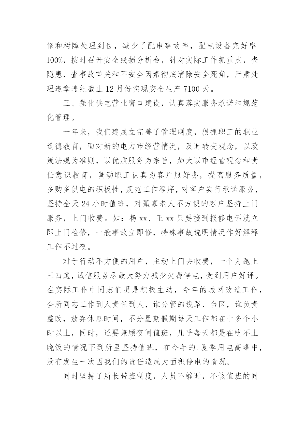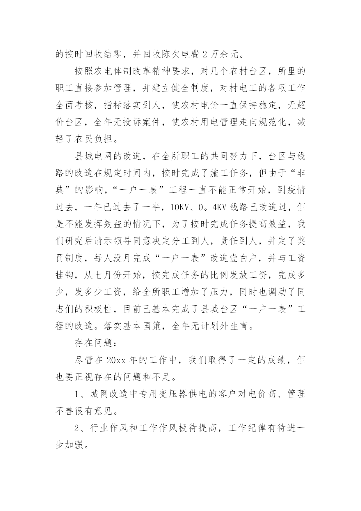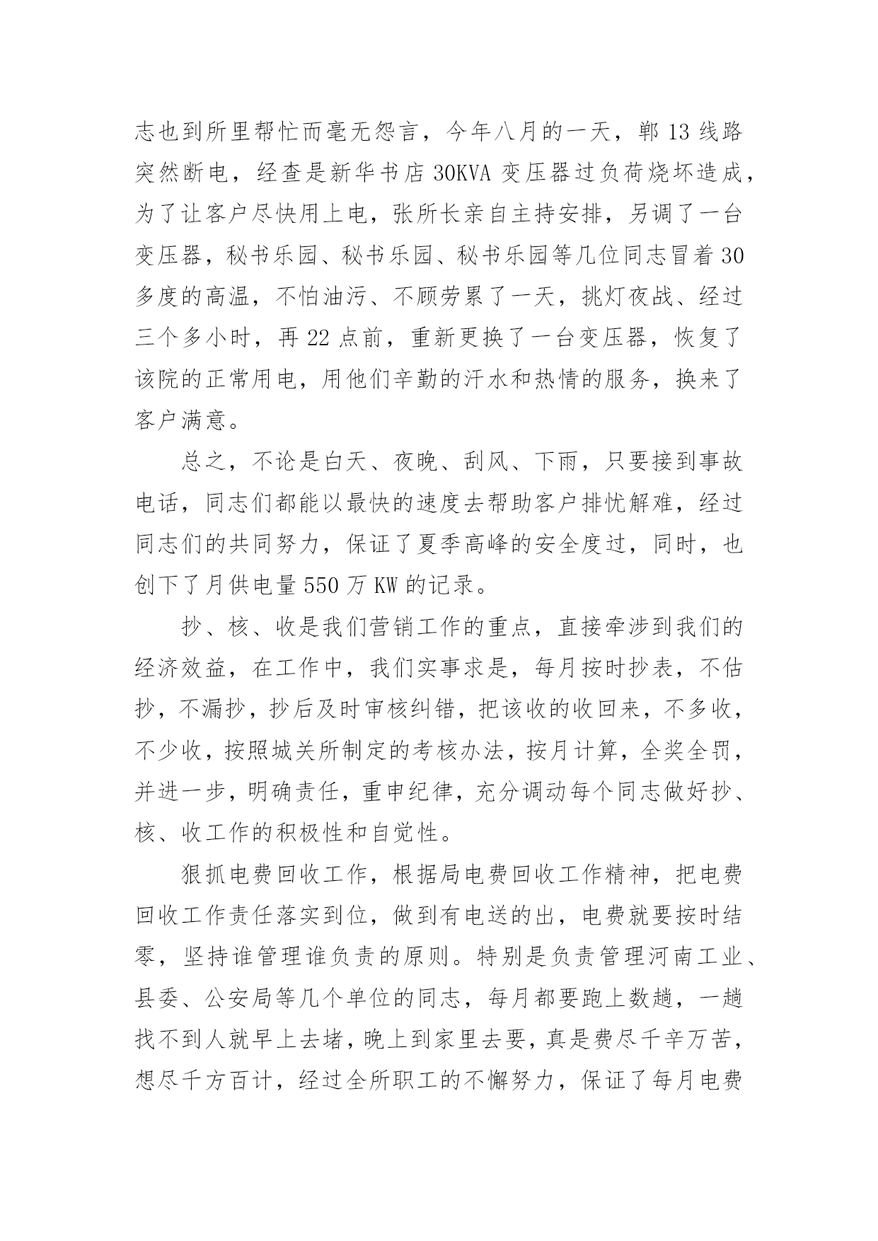 供电所运检技术员工作总结最新总结是对取得的成绩、存在的问题及得到的经验和教训等方面情况进行评价与描述的一种书面材料,它是增长才干的一种好办法,因此,让我们写一份总结吧。我们该怎么去写总结呢?下面是小编为大家收集的供电所运检技术员工作总结最新,仅供参考,大家一起来看看吧。供电所运检技术员工作总结最新1光阴似箭,日月如梭,转眼又是一年,在这一年来,我们在供电局党委和供电所长和谭所长的正确领导下,以及两乡一镇政府的大力支持和全所同事们的帮助下,我以公司提出的“团结、诚信、高效、创新”的企业精神为核心,以安全生产为基础,以经济效益为中心,坚持严格要求自己,强化形象,提高自身素质,做好本职工作,以诚待人,爱岗敬业讲奉献。正确认识自身的工作和价值,正确处理苦与乐,得与失、个人利益和集体利益的关系,坚持甘于奉献、诚实敬业。通过一年的辛苦努力,我较好的完成了各项工作任务指标。现将我一年来的工作情况向局领导和所长简要总结如下:1、经济效益完成情况:今年来,我共计抄收公变和专变11个,截止到12月份,共计完成了全年供电量:389521千瓦时,售电量:356286千瓦时,综合线损率:8.5%,全年电费回收:182165.20元,电费回收率:100%。2、安全生产保持了我所较稳定的一年:“做一名合格的安全员”是我现行本职工作的追求目标,我始终保持清醒的头脑,勤勤恳恳、,踏踏实实的态度来对待我的工作,全面贯彻“安全第一、预防为主”的方针来严格要求自己,把安全生产放在工作首位,加强安全工作落实,积极参加所组织的各项安全活动。全年我参加所内大、小线路和其它设备抢修:29次、线路消缺:12次、线路和其它设备巡视4次、线路砍青:18次。在王所长的正确领导和全所同事们的辛勤努力下,确保了我们全年的安全生产,杜绝了人身事故和其它事故的发生。3、落实服务承诺,提高服务质量:我以坚持“人民电业为人民”的宗旨,本着“优质、方便、高效、规范、真诚”的服务方针,不断提高服务质量,增强自己的服务意识,规范服务内容,坚持为民办实事的精神,对客户实行服务承诺,每天坚持24小时电话保持畅通,随叫随到,对孤寡老人和不方便的客户进行上门服务,一年来,我帮助客户室内线路维护18次、更换出线闸刀32把、更换漏电保护器26个,受到了客户的好评。同时也在客户心中树立了我们供电企业的良好形象。抄、核、收是我们工作的重点,直接牵涉到我们的经济效益,在工作中,我实事求是,每月按时抄表,杜绝估抄、漏抄、错抄、抄后及时审核纠错。把该收的'的电费收回来,不多收,不少收,按照我所制定的经济考核办法,按月计算,把电费回收工作落实到位。经过我不懈努力,保证了每月电费按时回收接零。4、工作中存在的问题和不足:尽管我在20xx年工作中取得了一定的成绩,但我还存在一些问题和不足。一是:在平时工作中还存在着思想有时出现麻痹大意。二是:还没有很好的掌握外线抢修的技能、技巧和微机上面做其它资料的技术。三是:在今后我要认真把各项工作努力做好和进一步加强各个方面的技术、技能知识的学习。20xx年的工作计划:1、准备在20xx年4月份以前组织管辖片区人员把白江线和白兴线高、低压线路未砍青的工作完成。2、铁门轩沿公路两边的下户线路进行整改完成。3、努力把自己管辖的高、低压线路的线损控制在所下达的指标范围之内。4、积极配合客户把自己家里的出线闸刀和漏电断路器检查和更换工作完成。要达到保质、保量、保安全供电。5、要进一步加强党风廉政建设和行风建设的工作。以上是我的个人年终总结,有什么不足之处,敬请各位领导批评指正!供电所运检技术员工作总结最新220xx年我所在秘书乐园局党委班子的正确领导下,在各科室的支持配合下,全所职工精诚团结、齐心协力、奋力拼搏、较好的完成了各项经济技术指标和工作任务,回顾一年来的工作历程,我们主要做了以玉几方面的工作。一、较好的完成了局下达的经济技术指标。截止到12月份,我所共完成供电量4114。12万KWH,完成售电量3776。997万KWH,综合线损率8。44%,电费回收达到了月月结零,追回陈欠电费2万余元,新增调整配变1400KVA/15台,10KV线路2。3KM,完成台区改造30个,6。4KV线路40余KM,完成“一户一表”工程7千余户,安全生产实现了“三无”,保持了较长周期的安全记录,优质服务诚信服务和“金桥工程”取得了较好的成绩,全年达到省、市局“零”投诉。二、安全生产保持了较稳定的局面。一年来,我们按照局年初提出的“明责任、严纪律、强监督、重奖罚的要求,把安全检查生产放在一切工作的首位,加强安全工作的领导,建立建全全方位,全过程的安全责任网络,全面落实安全责任层层签订控制事故责任书,建立了以所长为第一责任人的安全管理体系,积极参加局组织各项安全活动,在安全教育上重视调查研究到施工现场了解实情,解