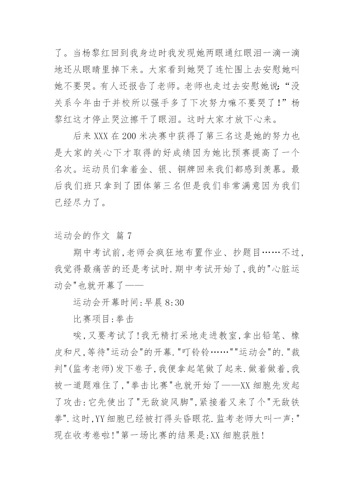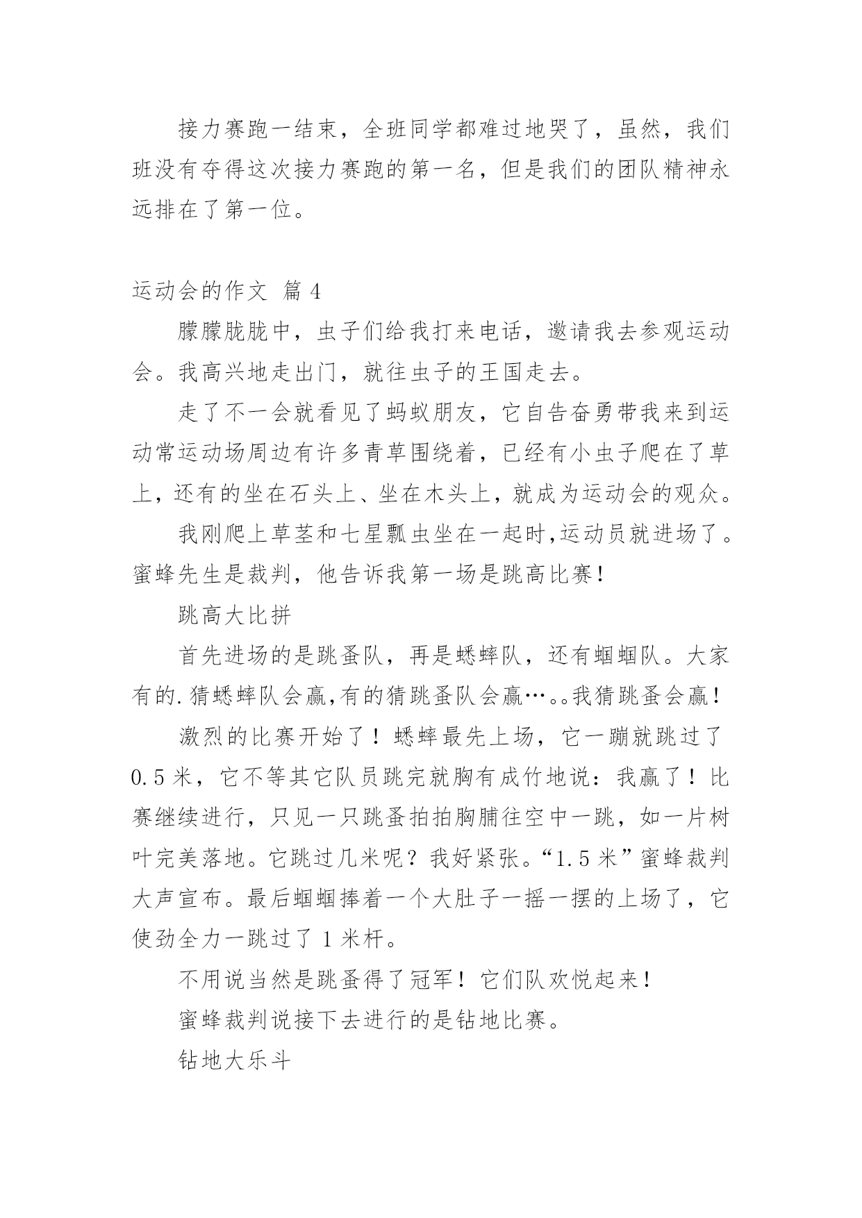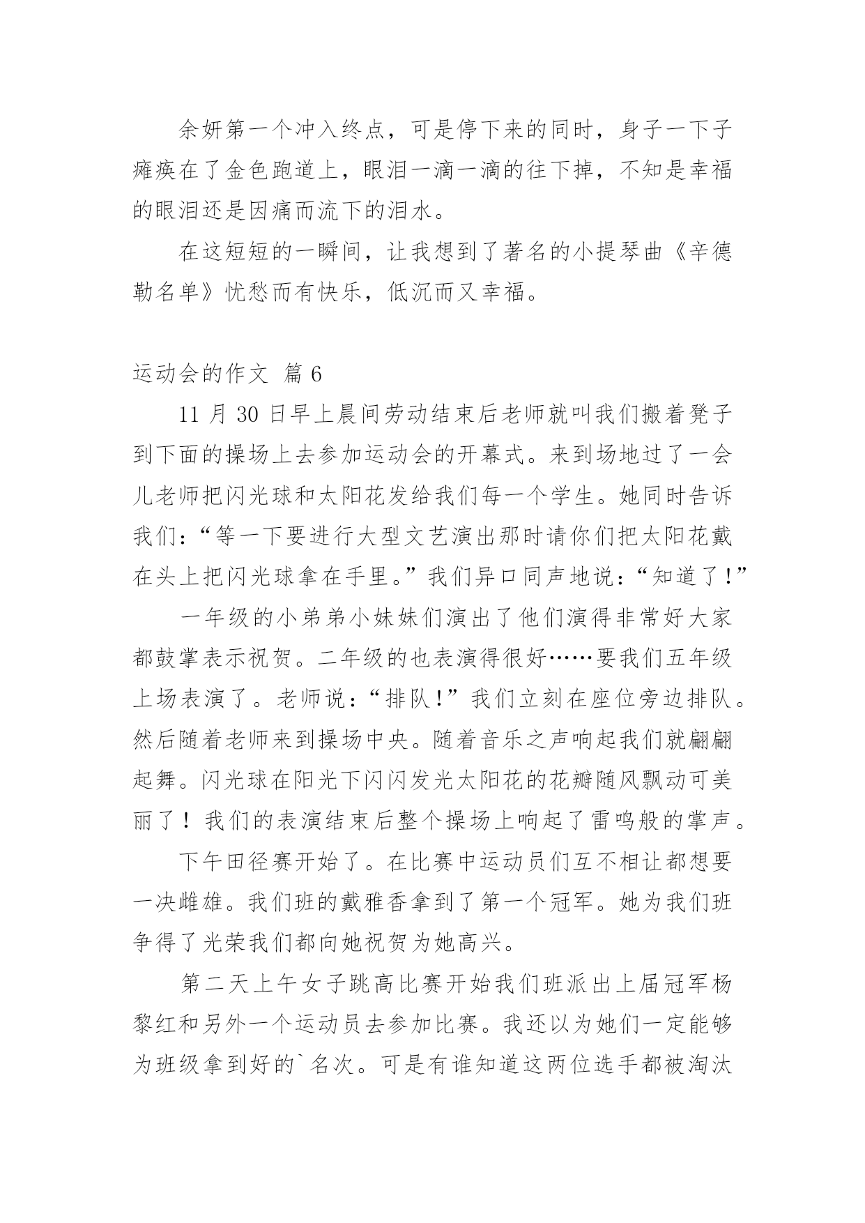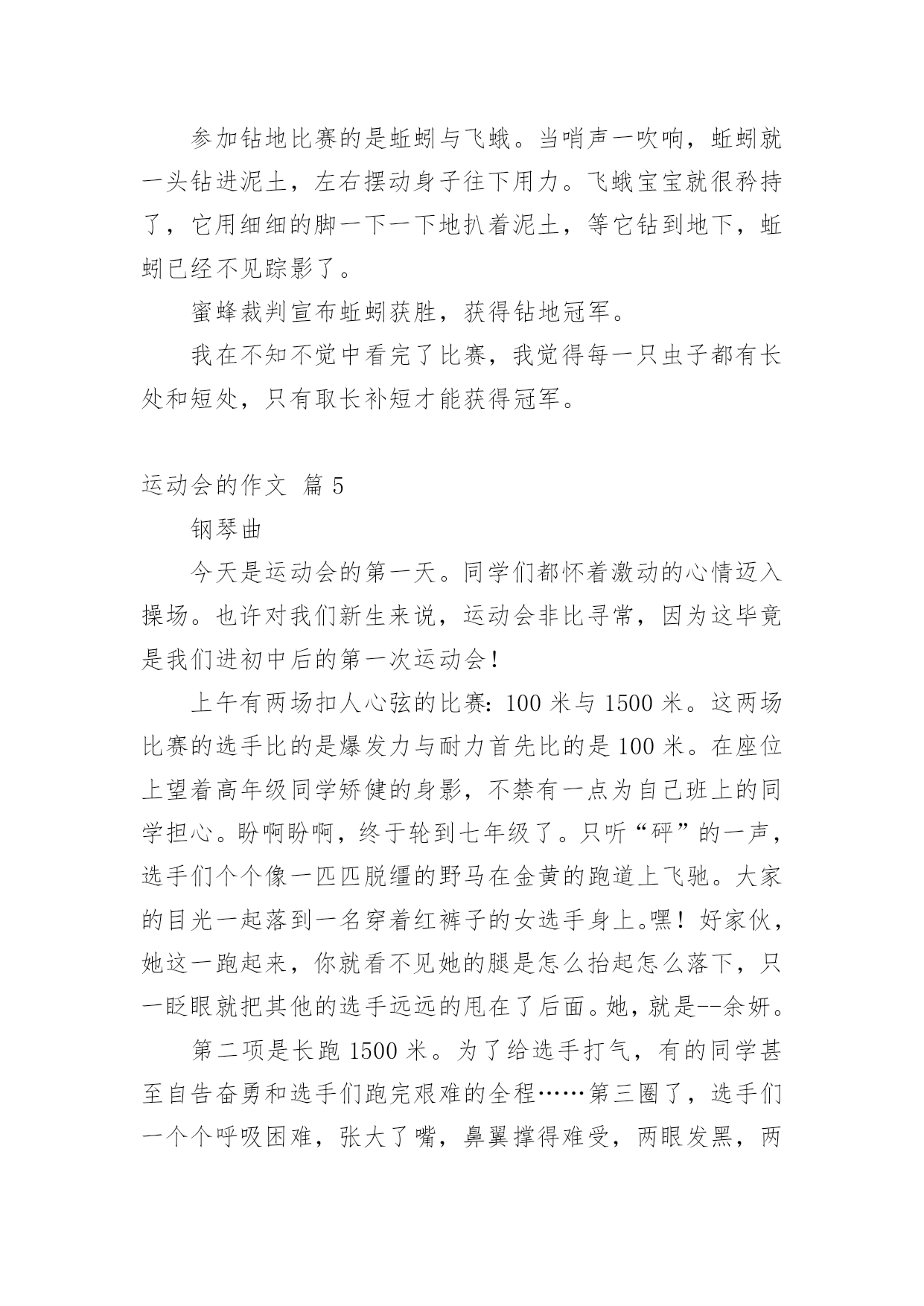 运动会的作文【精品】运动会的作文汇总10篇无论是在学校还是在社会中,大家都不可避免地会接触到作文吧,借助作文可以宣泄心中的情感,调节自己的心情。那么问题来了,到底应如何写一篇优秀的作文呢?以下是小编为大家收集的运动会的作文10篇,欢迎阅读,希望大家能够喜欢。运动会的作文篇1运动健将们,用你的实力,用你的精神,去开拓出,一片属于你的长跑天地!超越对手,超越自我,是我们的目标,是我们的信念。在转凉的初冬,在喧嚣的田径场上。你们点燃了如火的热情。运动员们,无论成败,我们都为你们感到自豪,你们永远是我们的骄傲!有多少次挥汗如雨,伤痛曾添满记忆,只因为始终相信,去拼搏才能胜利。总在鼓舞自我,要成功就得努力。热血在赛场沸腾,巨人在赛场升起。相信自我,你将赢得胜利,创造奇迹;相信自我,梦想在你手中,这是你的天地。当一切过去,你们将是第一。相信自我,你们将超越极限,超越自我!相信自我,加油吧,健儿们,相信你自我。年轻的'我们自信飞扬,青春的气息如同出生的朝阳,蓬勃的力量如同阳光的挥洒。此时此刻,跑道便是我们精彩的舞台,声声加油便是我们最高的奖项!论何成功,谈何荣辱,心中的信念只有一个:拼搏!踏上跑道,是一种选取。离开起点,是一种勇气。驰骋赛场,是一种胜利。健儿们,加油吧,我们是你们坚强的后盾!也许流星并不少见,但它燃烧的刹那,留给人间最美丽的回忆!也许笑脸并不少见,但胜利的喜悦,总会留给世界精彩的一瞬!是的,那些以前美妙的东西只有短短的一瞬间,但那却把最辉煌的一刻留给了人间。胜利,是每个人所追求的,胜利的喜悦,是胜利与重新开始的转折,胜利是新的开始!运动会的作文篇2“感恩的心,感谢有你!”每次听到这首歌,我就想到那次运动会前夕——黑夜里,爸爸陪我练垒球的情景……再过几天,就是一年一度的秋季运动会了。我是垒球运动员,照平常比赛来看,我的.实力非凡,拿个第一第二不成问题。但有句老话“成功只属于过去”。为了能继续在这届运动会上夺冠,这些天每次一吃完晚饭,老爸总会陪上我,去外面练垒球。即使工作再忙,也没有间断过。练球的时候,我总是回想着爸爸一再叮嘱过的话,他说“力度要适当,还要划出标准的抛物线。”一次又一次,一天又一天。我气馁的时候,他不打我,也不骂我,而是不停地鼓励我。所以即使我再枯燥,再精疲力竭,也都能在不断的练习中,超越自己。让我内疚的是一次我为了扔得更远些,一用力,球竟然落到了爸爸的车子上。这下,我慌了,都砸到车子了,这力道也太大了点吧!当我以为一定免不了一顿皮肉之苦的时候,爸爸竟然宽容地对我说:“没关系,下次小心一点!”而我知道那一砸,修理车子定要花费不少钱。那次运动会,我得了第一名――我没有辜负爸爸的期望!感恩这次机会,让我更加深切地感受到了爸爸的爱。爸爸,您的一个微笑,一个眼神,一句劝勉,都使我受益匪浅。我想对您说:“感恩的心,感谢有你,老爸!”运动会的作文篇3星期五,天气晴朗,万里无云,学校举行了一年一度的冬季运动会。比赛的项目有:跑步、跳高、跳远、跳绳等,其中,让我最难忘的就是接力赛跑的.那一刻。只听裁判员一声哨响,五名同学像利箭一样射出,比赛刚开始,我们班还可以数一数二,可是,当轮到石云琴同学接棒时,只听到“砰”的一声,接力棒落到了地上,这一刻,永远留在了我的心中。“完了!完了!”我大声地喊着。轮到我接棒时,我心里想:我们一定要把第一夺回来,于是我一把抓过接力棒,飞快地向前冲去,此时,耳边只听见同学们在拼命的呼喊:“加油,加油”在同学们的呼喊声中,返回时,我发现自己已经超过了一名同学。但是比赛最终我们班还是排在了第三名。接力赛跑一结束,全班同学都难过地哭了,虽然,我们班没有夺得这次接力赛跑的第一名,但是我们的团队精神永远排在了第一位。运动会的作文篇4朦朦胧胧中,虫子们给我打来电话,邀请我去参观运动会。我高兴地走出门,就往虫子的王国走去。走了不一会就看见了蚂蚁朋友,它自告奋勇带我来到运动常运动场周边有许多青草围绕着,已经有小虫子爬在了草上,还有的坐在石头上、坐在木头上,就成为运动会的观众。我刚爬上草茎和七星瓢虫坐在一起时,运动员就进场了。蜜蜂先生是裁判,他告诉我第一场是跳高比赛!跳高大比拼首先进场的是跳蚤队,再是蟋蟀队,还有蝈蝈队。大家有的.猜蟋蟀队会赢,有的猜跳蚤队会赢…。。我猜跳蚤会赢!激烈的比赛开始了!蟋蟀最先上场,它一蹦就跳过了0.5米,它不等其它队员跳完就胸有成竹地说:我赢了!比赛继续进行,只见一只跳蚤拍拍胸脯往空中一跳,如一片树叶完美落地。它跳过几米呢?我好紧张。“1.5米”蜜蜂裁判大声宣布。最后蝈蝈捧着一个大肚子一摇一摆的上场了,它使劲全力一跳过了1米杆。不用说当然是跳蚤得了冠军!它们队欢悦起来!蜜蜂裁判说接下去进行的是钻地比赛。钻地大乐斗参加钻地比赛的是蚯蚓与飞蛾。当哨声一吹响,蚯蚓就一头钻进泥土,左右摆动身子往