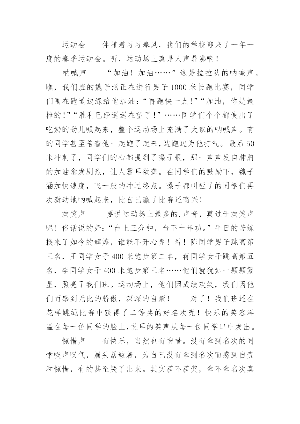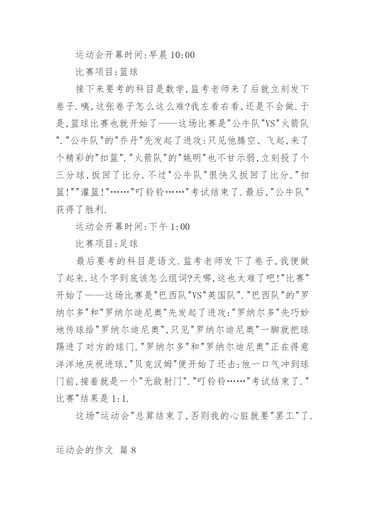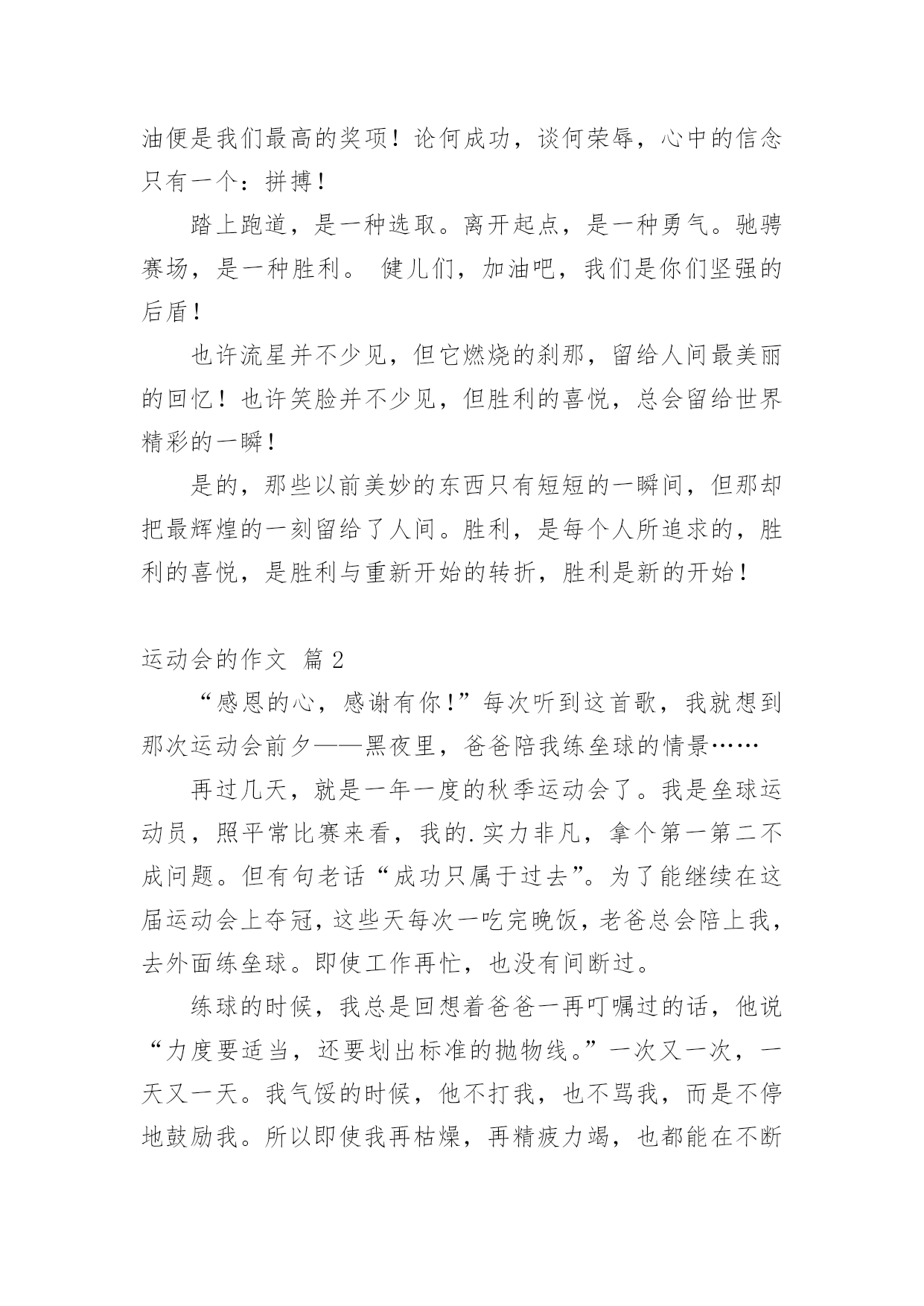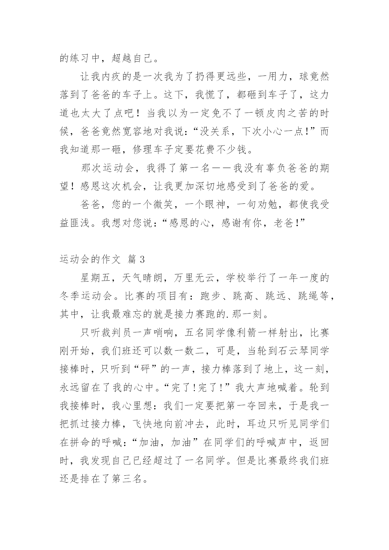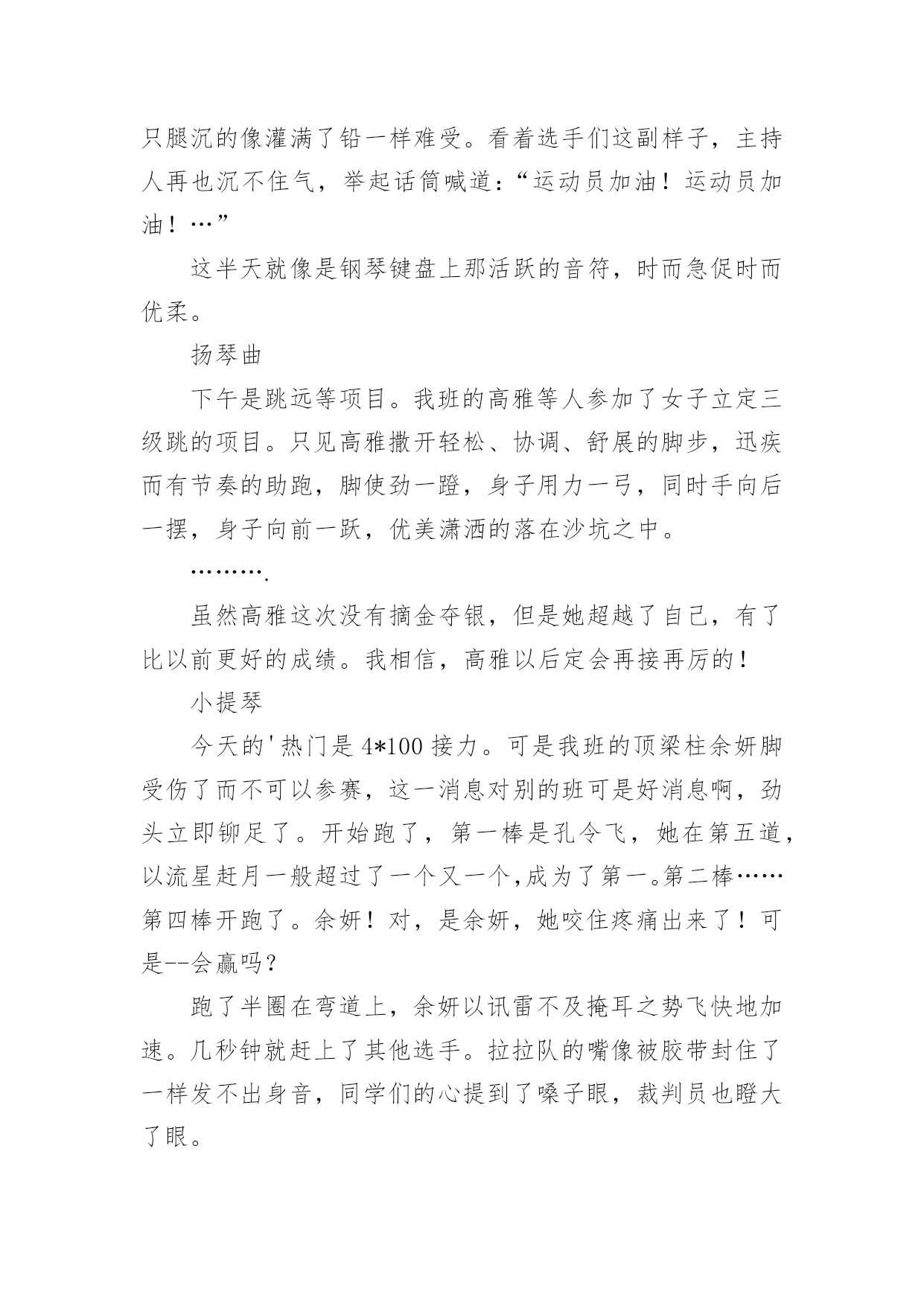 运动会的作文【精品】运动会的作文汇总10篇无论是在学校还是在社会中,大家都不可避免地会接触到作文吧,借助作文可以宣泄心中的情感,调节自己的心情。那么问题来了,到底应如何写一篇优秀的作文呢?以下是小编为大家收集的运动会的作文10篇,欢迎阅读,希望大家能够喜欢。运动会的作文篇1运动健将们,用你的实力,用你的精神,去开拓出,一片属于你的长跑天地!超越对手,超越自我,是我们的目标,是我们的信念。在转凉的初冬,在喧嚣的田径场上。你们点燃了如火的热情。运动员们,无论成败,我们都为你们感到自豪,你们永远是我们的骄傲!有多少次挥汗如雨,伤痛曾添满记忆,只因为始终相信,去拼搏才能胜利。总在鼓舞自我,要成功就得努力。热血在赛场沸腾,巨人在赛场升起。相信自我,你将赢得胜利,创造奇迹;相信自我,梦想在你手中,这是你的天地。当一切过去,你们将是第一。相信自我,你们将超越极限,超越自我!相信自我,加油吧,健儿们,相信你自我。年轻的'我们自信飞扬,青春的气息如同出生的朝阳,蓬勃的力量如同阳光的挥洒。此时此刻,跑道便是我们精彩的舞台,声声加油便是我们最高的奖项!论何成功,谈何荣辱,心中的信念只有一个:拼搏!踏上跑道,是一种选取。离开起点,是一种勇气。驰骋赛场,是一种胜利。健儿们,加油吧,我们是你们坚强的后盾!也许流星并不少见,但它燃烧的刹那,留给人间最美丽的回忆!也许笑脸并不少见,但胜利的喜悦,总会留给世界精彩的一瞬!是的,那些以前美妙的东西只有短短的一瞬间,但那却把最辉煌的一刻留给了人间。胜利,是每个人所追求的,胜利的喜悦,是胜利与重新开始的转折,胜利是新的开始!运动会的作文篇2“感恩的心,感谢有你!”每次听到这首歌,我就想到那次运动会前夕——黑夜里,爸爸陪我练垒球的情景……再过几天,就是一年一度的秋季运动会了。我是垒球运动员,照平常比赛来看,我的.实力非凡,拿个第一第二不成问题。但有句老话“成功只属于过去”。为了能继续在这届运动会上夺冠,这些天每次一吃完晚饭,老爸总会陪上我,去外面练垒球。即使工作再忙,也没有间断过。练球的时候,我总是回想着爸爸一再叮嘱过的话,他说“力度要适当,还要划出标准的抛物线。”一次又一次,一天又一天。我气馁的时候,他不打我,也不骂我,而是不停地鼓励我。所以即使我再枯燥,再精疲力竭,也都能在不断的练习中,超越自己。让我内疚的是一次我为了扔得更远些,一用力,球竟然落到了爸爸的车子上。这下,我慌了,都砸到车子了,这力道也太大了点吧!当我以为一定免不了一顿皮肉之苦的时候,爸爸竟然宽容地对我说:“没关系,下次小心一点!”而我知道那一砸,修理车子定要花费不少钱。那次运动会,我得了第一名――我没有辜负爸爸的期望!感恩这次机会,让我更加深切地感受到了爸爸的爱。爸爸,您的一个微笑,一个眼神,一句劝勉,都使我受益匪浅。我想对您说:“感恩的心,感谢有你,老爸!”运动会的作文篇3星期五,天气晴朗,万里无云,学校举行了一年一度的冬季运动会。比赛的项目有:跑步、跳高、跳远、跳绳等,其中,让我最难忘的就是接力赛跑的.那一刻。只听裁判员一声哨响,五名同学像利箭一样射出,比赛刚开始,我们班还可以数一数二,可是,当轮到石云琴同学接棒时,只听到“砰”的一声,接力棒落到了地上,这一刻,永远留在了我的心中。“完了!完了!”我大声地喊着。轮到我接棒时,我心里想:我们一定要把第一夺回来,于是我一把抓过接力棒,飞快地向前冲去,此时,耳边只听见同学们在拼命的呼喊:“加油,加油”在同学们的呼喊声中,返回时,我发现自己已经超过了一名同学。但是比赛最终我们班还是排在了第三名。接力赛跑一结束,全班同学都难过地哭了,虽然,我们班没有夺得这次接力赛跑的第一名,但是我们的团队精神永远排在了第一位。运动会的作文篇4朦朦胧胧中,虫子们给我打来电话,邀请我去参观运动会。我高兴地走出门,就往虫子的王国走去。走了不一会就看见了蚂蚁朋友,它自告奋勇带我来到运动常运动场周边有许多青草围绕着,已经有小虫子爬在了草上,还有的坐在石头上、坐在木头上,就成为运动会的观众。我刚爬上草茎和七星瓢虫坐在一起时,运动员就进场了。蜜蜂先生是裁判,他告诉我第一场是跳高比赛!跳高大比拼首先进场的是跳蚤队,再是蟋蟀队,还有蝈蝈队。大家有的.猜蟋蟀队会赢,有的猜跳蚤队会赢…。。我猜跳蚤会赢!激烈的比赛开始了!蟋蟀最先上场,它一蹦就跳过了0.5米,它不等其它队员跳完就胸有成竹地说:我赢了!比赛继续进行,只见一只跳蚤拍拍胸脯往空中一跳,如一片树叶完美落地。它跳过几米呢?我好紧张。“1.5米”蜜蜂裁判大声宣布。最后蝈蝈捧着一个大肚子一摇一摆的上场了,它使劲全力一跳过了1米杆。不用说当然是跳蚤得了冠军!它们队欢悦起来!蜜蜂裁判说接下去进行的是钻地比赛。钻地大乐斗参加钻地比赛的是蚯蚓与飞蛾。当哨声一吹响,蚯蚓就一头钻进泥土,左右摆动身子往