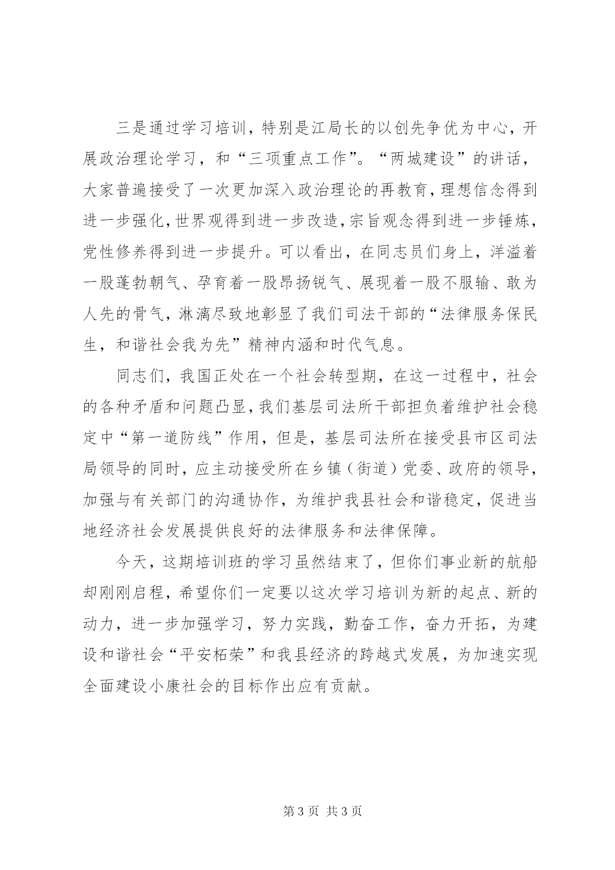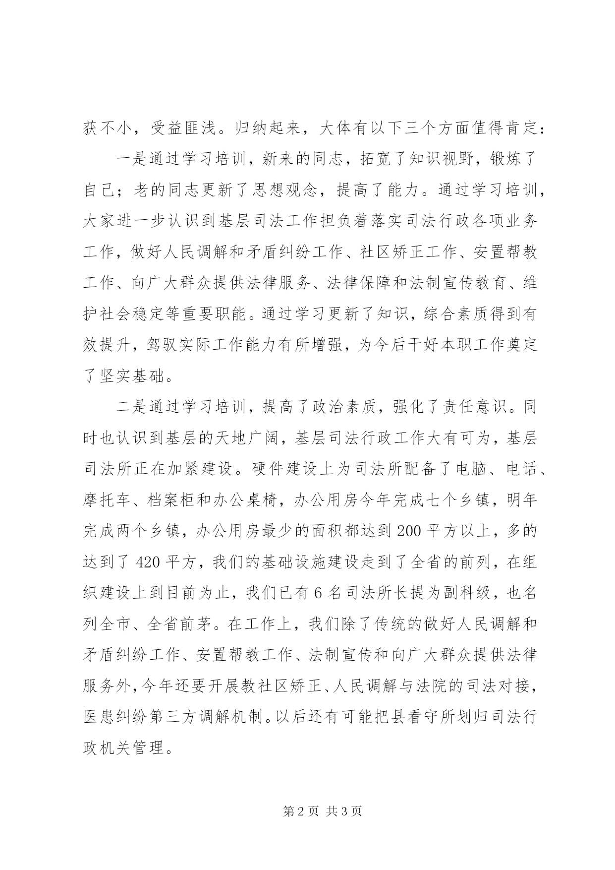 第PAGE\*Arabic\*MERGEFORMAT3页共NUMPAGES\*MERGEFORMAT3页司法所培训总结同志们:今天为期二天的司法所干部业务培训,经过大家的共同努力,圆满完成了培训任务,达到了预期目的,这次培训既是新来同志的业务培训,也是老同志一次再教育再提高。这次培训班时间虽然短,但内容很丰富,有局长在开幕式讲话中的全局工作和政治理论,纪检组长的廉政建设、也有股室负责人的业务知识讲解,还有xx镇的司法所、全国优秀人民调解员、省优秀司法所长、县“十佳公仆”,怎样当好司法所长和做好人民调解工作的现身说法。这次业务培训取得了圆满完成,我认为。一是领导高度重视,局长早早就进行了布置,并亲自查看培训的各个环节,从人员的安排到授课的内容都一一进行布置;二是准备充分。这次业务培训早布置、早准备,在此次培训中制定了明确的培训工作流程,派出有丰富工作经验的股室负责人、司法所所长主讲,将培训工作落实到个人,他们都做了精心准备,培训内容贯穿于整个基层司法行政工作。在学习过程中同志们能做到严格遵守纪律、认真听讲,并做好笔记。三是内容实用,培训方法灵活,学习氛围浓厚。四是始终把政治理论、党性锻炼、廉政建设贯穿于业务培训全过程。回过头来看这短暂而又充实的学习生活,大家一致感到,收获不小,受益匪浅。归纳起来,大体有以下三个方面值得肯定:一是通过学习培训,新来的同志,拓宽了知识视野,锻炼了自己;老的同志更新了思想观念,提高了能力。通过学习培训,大家进一步认识到基层司法工作担负着落实司法行政各项业务工作,做好人民调解和矛盾纠纷工作、社区矫正工作、安置帮教工作、向广大群众提供法律服务、法律保障和法制宣传教育、维护社会稳定等重要职能。通过学习更新了知识,综合素质得到有效提升,驾驭实际工作能力有所增强,为今后干好本职工作奠定了坚实基础。二是通过学习培训,提高了政治素质,强化了责任意识。同时也认识到基层的天地广阔,基层司法行政工作大有可为,基层司法所正在加紧建设。硬件建设上为司法所配备了电脑、电话、摩托车、档案柜和办公桌椅,办公用房今年完成七个乡镇,明年完成两个乡镇,办公用房最少的面积都达到200平方以上,多的达到了420平方,我们的基础设施建设走到了全省的前列,在组织建设上到目前为止,我们已有6名司法所长提为副科级,也名列全市、全省前茅。在工作上,我们除了传统的做好人民调解和矛盾纠纷工作、安置帮教工作、法制宣传和向广大群众提供法律服务外,今年还要开展教社区矫正、人民调解与法院的司法对接,医患纠纷第三方调解机制。以后还有可能把县看守所划归司法行政机关管理。三是通过学习培训,特别是江局长的以创先争优为中心,开展政治理论学习,和“三项重点工作”。“两城建设”的讲话,大家普遍接受了一次更加深入政治理论的再教育,理想信念得到进一步强化,世界观得到进一步改造,宗旨观念得到进一步锤炼,党性修养得到进一步提升。可以看出,在同志员们身上,洋溢着一股蓬勃朝气、孕育着一股昂扬锐气、展现着一股不服输、敢为人先的骨气,淋漓尽致地彰显了我们司法干部的“法律服务保民生,和谐社会我为先”精神内涵和时代气息。同志们,我国正处在一个社会转型期,在这一过程中,社会的各种矛盾和问题凸显,我们基层司法所干部担负着维护社会稳定中“第一道防线”作用,但是,基层司法所在接受县市区司法局领导的同时,应主动接受所在乡镇(街道)党委、政府的领导,加强与有关部门的沟通协作,为维护我县社会和谐稳定,促进当地经济社会发展提供良好的法律服务和法律保障。今天,这期培训班的学习虽然结束了,但你们事业新的航船却刚刚启程,希望你们一定要以这次学习培训为新的起点、新的动力,进一步加强学习,努力实践,勤奋工作,奋力开拓,为建设和谐社会“平安柘荣”和我县经济的跨越式发展,为加速实现全面建设小康社会的目标作出应有贡献。