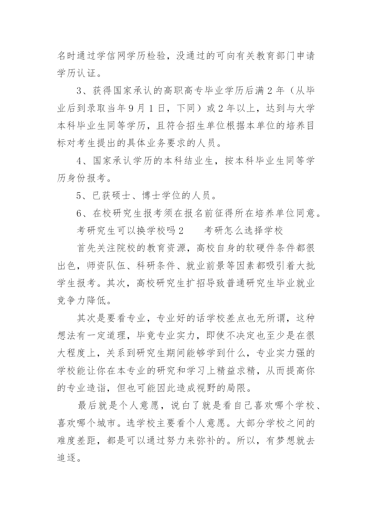 考研究生可以换学校吗考研可以换学校。考研究生可以换学校吗1考研可以考多个学校吗不可以,考研的笔试科目中,专业课每一个学校都是不同的,但是考试时间是相同的,所以每个考生只能选择参加一个学校的考试。考生假如过了国家线后没能进入复试,就可选择调剂。调剂就可以报多个学校进行调剂。考生在初试的时候只能报一所学校,因为专业课一般都是自主命题,你考哪个学校就是那个学校出题,不可以既报人大又报其他的,如果报一个学校,没有考上,但是过了国家线的话,明年的3月份是可以调剂的,调剂的时候是可以同时选3所平行志愿的。考研需要的条件具体如下:①中华人民共和国公民。②拥护中国共产党的领导,品德良好,遵纪守法。③身体健康状况符合国家和招生单位规定的体检要求。④考生学业水平必须符合下列条件之一:1、国家承认学历的应届本科毕业生(含普通高校、成人高校、普通高校举办的成人高等学历教育应届本科毕业生)及自学考试和网络教育届时可毕业本科生,录取当年9月1日前须取得国家承认的本科毕业证书)。2、具有国家承认的`大学本科毕业学历的人员,要求报名时通过学信网学历检验,没通过的可向有关教育部门申请学历认证。3、获得国家承认的高职高专毕业学历后满2年(从毕业后到录取当年9月1日,下同)或2年以上,达到与大学本科毕业生同等学历,且符合招生单位根据本单位的培养目标对考生提出的具体业务要求的人员。4、国家承认学历的本科结业生,按本科毕业生同等学历身份报考。5、已获硕士、博士学位的人员。6、在校研究生报考须在报名前征得所在培养单位同意。考研究生可以换学校吗2考研怎么选择学校首先关注院校的教育资源,高校自身的软硬件条件都很出色,师资队伍、科研条件、就业前景等因素都吸引着大批学生报考。其次,高校研究生扩招导致普通研究生毕业就业竞争力降低。其次是要看专业,专业好的话学校差点也无所谓,这种想法有一定道理,毕竟专业实力,即使不决定也至少是在很大程度上,关系到研究生期间能够学到什么,专业实力强的学校能让你在本专业的研究和学习上精益求精,从而提高你的专业造诣,但也可能因此造成视野的局限。最后就是个人意愿,说白了就是看自己喜欢哪个学校、喜欢哪个城市。选学校主要看个人意愿。大部分学校之间的难度差距,都是可以通过努力来弥补的。所以,有梦想就去追逐。考研哪些院校容易被录取总体上来说,上线几率高的学校,集中在位置偏僻的211院校以及地方高校中,尤其是省立师范大学。前者如西南大学,后者如河北大学、山东师范大学等。从学校的整体水平来考虑的话,这类学校还是有一定实力的,所以这些学校的“性价比”都是很高的'。还有就是冷门专业的大学,目标院校的专业越冷门,考研党考上的可能性就越大。当专业冷到一定程度,比如冷到几乎无人问津的程度时,要是谁报考了这样的专业,只要分数不是太烂,被目标院校录取是妥妥的事情。二本院校考研的成功几率是很高的,一般情况下,二本大学在考研志愿填报这个环节中偏居B区这一隅,相对而言被录取的难度是比较小的。“考研党”在实力不是太差的情况下,基本上报考这样的学校可以成功,但是很多情况下,就算本科是二本的大学生,在考研的时候也不喜欢报二本的目标院校;而本科是985、211的大学生,更不会在考研的时候对二本院校“情有独钟”。