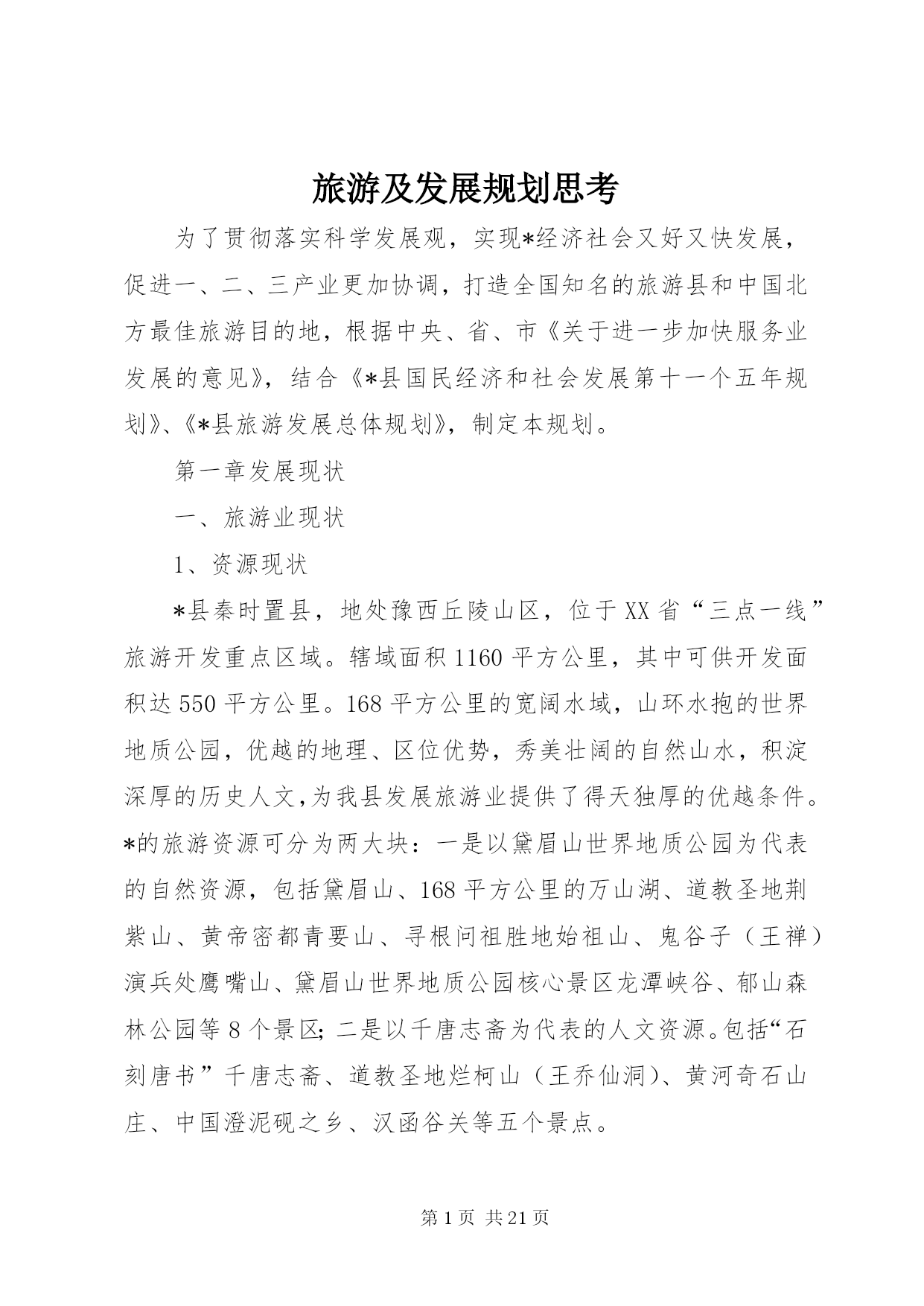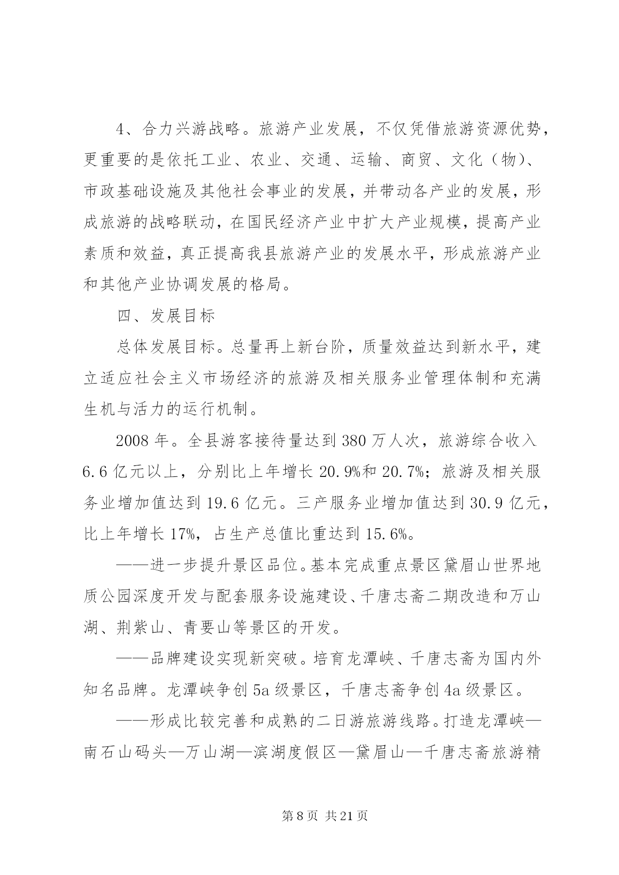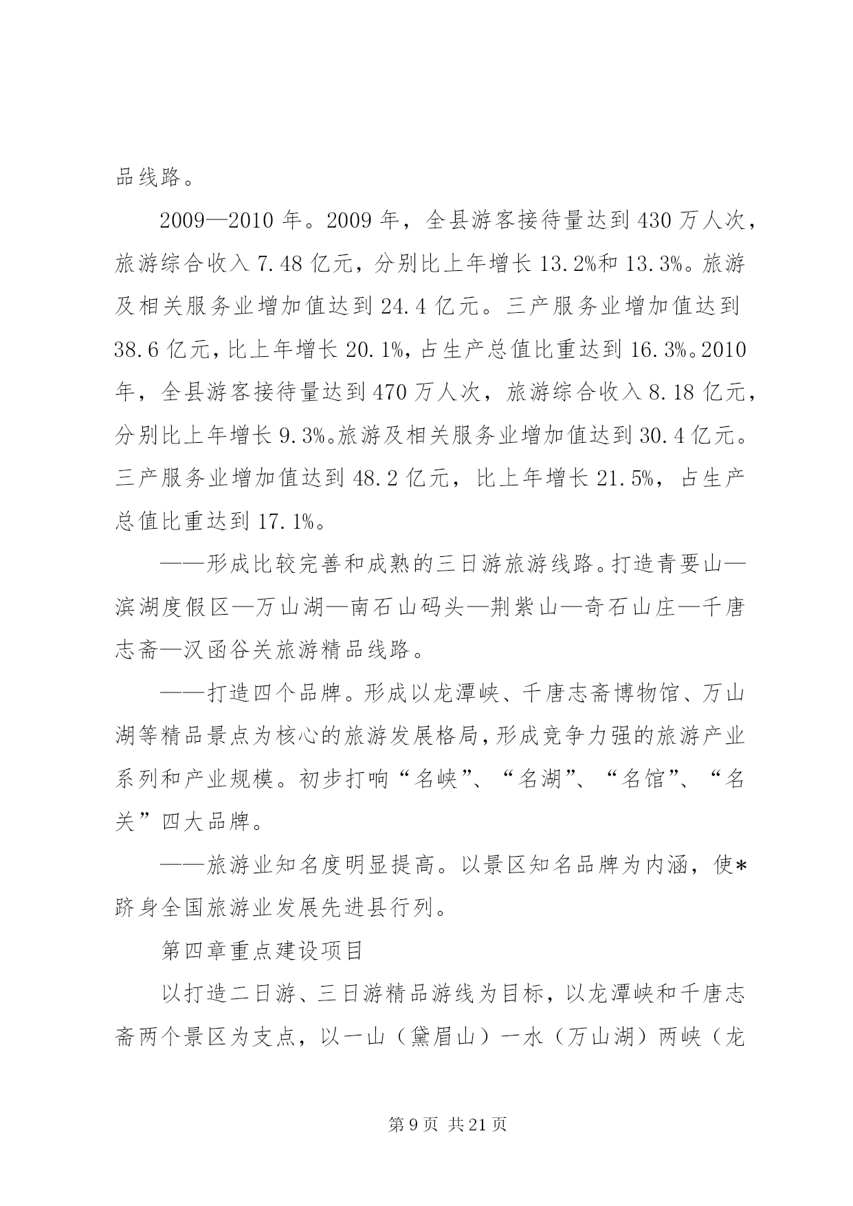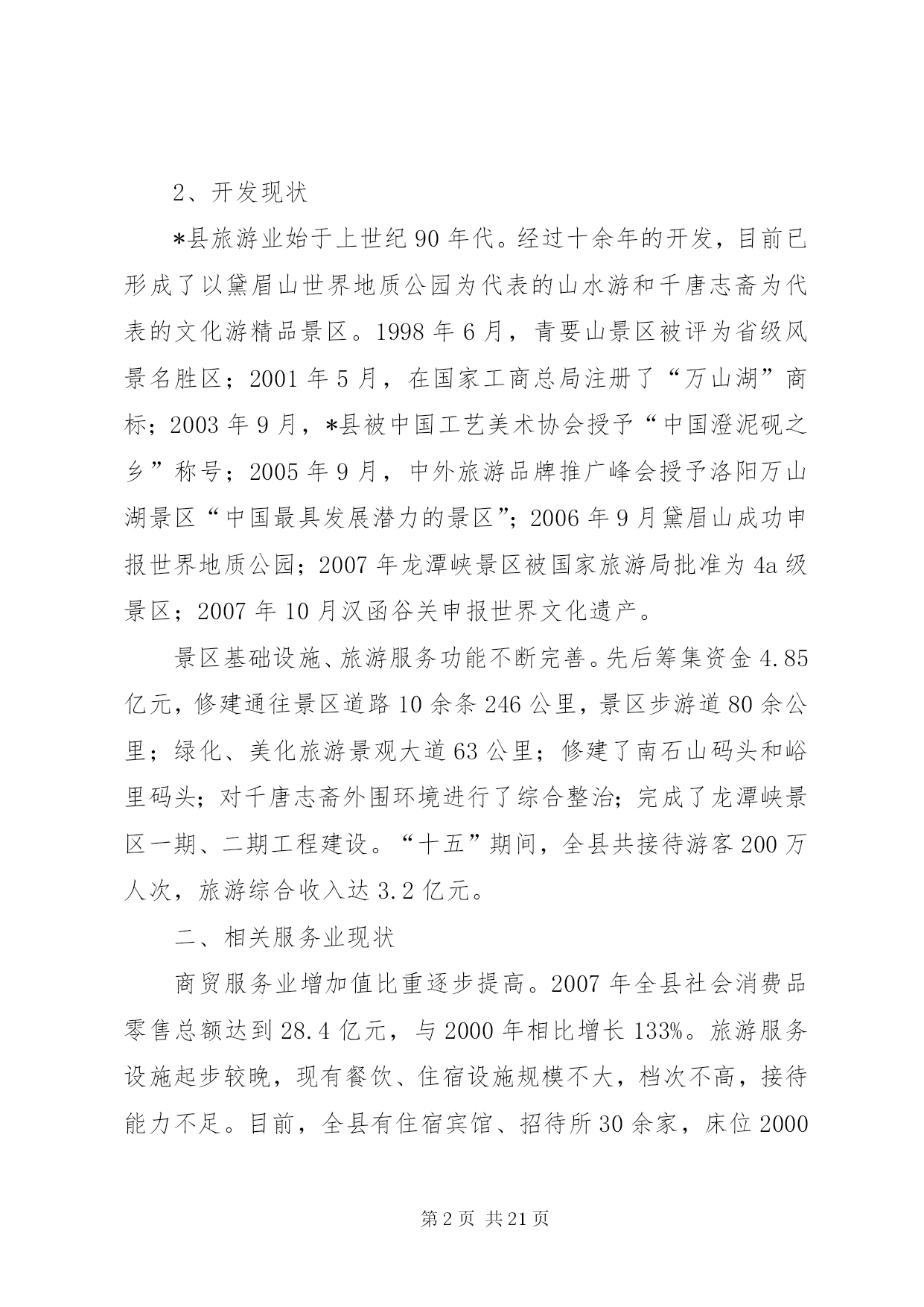 第PAGE\*Arabic\*MERGEFORMAT21页共NUMPAGES\*MERGEFORMAT21页旅游及发展规划思考为了贯彻落实科学发展观,实现*经济社会又好又快发展,促进一、二、三产业更加协调,打造全国知名的旅游县和中国北方最佳旅游目的地,根据中央、省、市《关于进一步加快服务业发展的意见》,结合《*县国民经济和社会发展第十一个五年规划》、《*县旅游发展总体规划》,制定本规划。第一章发展现状一、旅游业现状1、资源现状*县秦时置县,地处豫西丘陵山区,位于XX省“三点一线”旅游开发重点区域。辖域面积1160平方公里,其中可供开发面积达550平方公里。168平方公里的宽阔水域,山环水抱的世界地质公园,优越的地理、区位优势,秀美壮阔的自然山水,积淀深厚的历史人文,为我县发展旅游业提供了得天独厚的优越条件。*的旅游资源可分为两大块:一是以黛眉山世界地质公园为代表的自然资源,包括黛眉山、168平方公里的万山湖、道教圣地荆紫山、黄帝密都青要山、寻根问祖胜地始祖山、鬼谷子(王禅)演兵处鹰嘴山、黛眉山世界地质公园核心景区龙潭峡谷、郁山森林公园等8个景区;二是以千唐志斋为代表的人文资源。包括“石刻唐书”千唐志斋、道教圣地烂柯山(王乔仙洞)、黄河奇石山庄、中国澄泥砚之乡、汉函谷关等五个景点。2、开发现状*县旅游业始于上世纪90年代。经过十余年的开发,目前已形成了以黛眉山世界地质公园为代表的山水游和千唐志斋为代表的文化游精品景区。1998年6月,青要山景区被评为省级风景名胜区;2001年5月,在国家工商总局注册了“万山湖”商标;2003年9月,*县被中国工艺美术协会授予“中国澄泥砚之乡”称号;2005年9月,中外旅游品牌推广峰会授予洛阳万山湖景区“中国最具发展潜力的景区”;2006年9月黛眉山成功申报世界地质公园;2007年龙潭峡景区被国家旅游局批准为4a级景区;2007年10月汉函谷关申报世界文化遗产。景区基础设施、旅游服务功能不断完善。先后筹集资金4.85亿元,修建通往景区道路10余条246公里,景区步游道80余公里;绿化、美化旅游景观大道63公里;修建了南石山码头和峪里码头;对千唐志斋外围环境进行了综合整治;完成了龙潭峡景区一期、二期工程建设。“十五”期间,全县共接待游客200万人次,旅游综合收入达3.2亿元。二、相关服务业现状商贸服务业增加值比重逐步提高。2007年全县社会消费品零售总额达到28.4亿元,与2000年相比增长133%。旅游服务设施起步较晚,现有餐饮、住宿设施规模不大,档次不高,接待能力不足。目前,全县有住宿宾馆、招待所30余家,床位2000余张。其中,中型及以上宾馆12家,小型宾馆、招待所占半数以上。全县还没有一家星级饭店。景区内设施规范,条件较好的农家宾馆建设刚刚起步,还处于自发状态。旅游商品的开发尚处于初级阶段,未形成产业化、规模化。完整的旅游商品系列还未形成。旅游商品开发尚未融入旅游产业体系,与旅游业的良性互动机制尚未形成。市场网络建设有待进一步完善。交通道路四通八达。现有干线公路3条156公里,县乡公路40条435公里。景区外部铁路和公路已基本形成网络,对外交通条件较好;景区内部道路技术标准不高,很多是尽端式,没有形成网络。水上游览交通尚缺乏规划及组织协调,船舶发展尚处于无序状态。文化基础设施不断完善。投资2000万元XX县区文化中心、图书馆、博物馆,总面积13880平方米。演艺团队相对薄弱,演艺活动尚欠丰富,地方特色浓郁的表演和娱乐项目尚需进一步开发;民间曲艺活动内容丰富,社会演艺力量有待整合。休闲娱乐及表演场所建设需进一步加强。文物资源丰富。目前,全县境内拥有国家级文物保护单位一处,省级文物保护单位6处,市县级保护单位32处,一般保护单位160多处。电信、物流、金融、保险等现代服务业也得到了长足发展。第二章有利因素与不利因素我县发展以旅游为主导的第三产业,存在诸多有利因素和一些不利因素。一、有利因素一是进入二十一世纪以来,世界经济正由“工业型经济”向“服务型经济”转变,服务型经济已成为未来世界经济发展的方向和主流,给以旅游为主导的第三产业开辟了更大的发展空间。二是中央、省、市相继出台了加快服务业发展的意见,对服务业发展提出了更高的要求,并将服务业发展纳入对各级党政领导考核的一项重要内容,必将从政策层面、领导层面推动服务业以较快的速度发展。三是省、市为了促进服务业发展,提供一部分引导资金,为争取资金投入创造了条件。四是随着人民群众物质文化生活水平的提高,对观光旅游、休闲娱乐、度假健身等现代生活需求日益增强,有效扩大了消费空间。五是县域经济综合实力的显著增强,为发展以旅游为主的第三产业提供了强有力的物质基础。二、不利因素我县发展以旅游为龙头的第三产业,虽然有许多有利条件,但同时也存在
