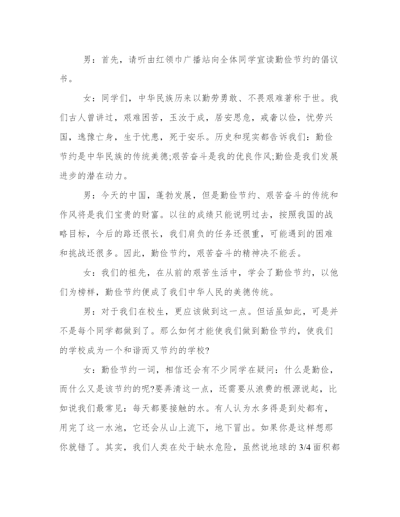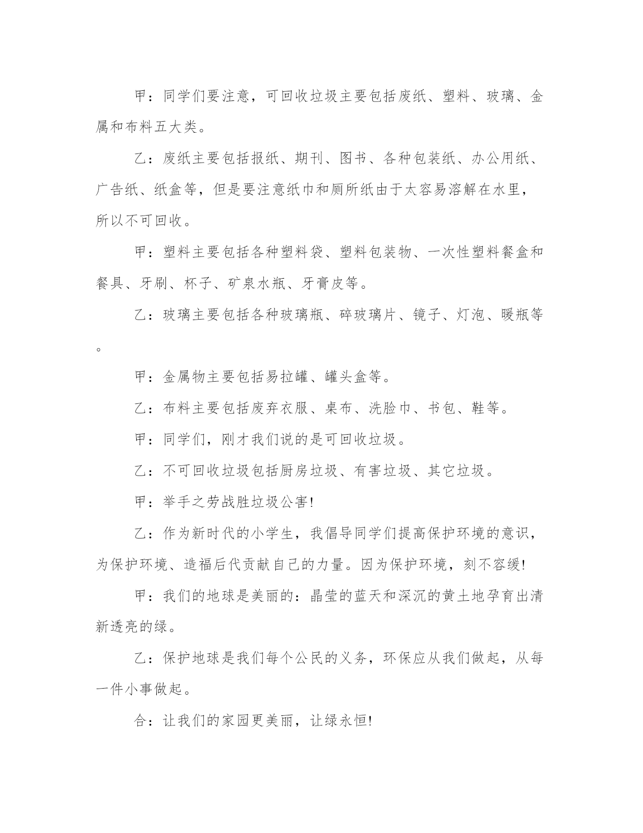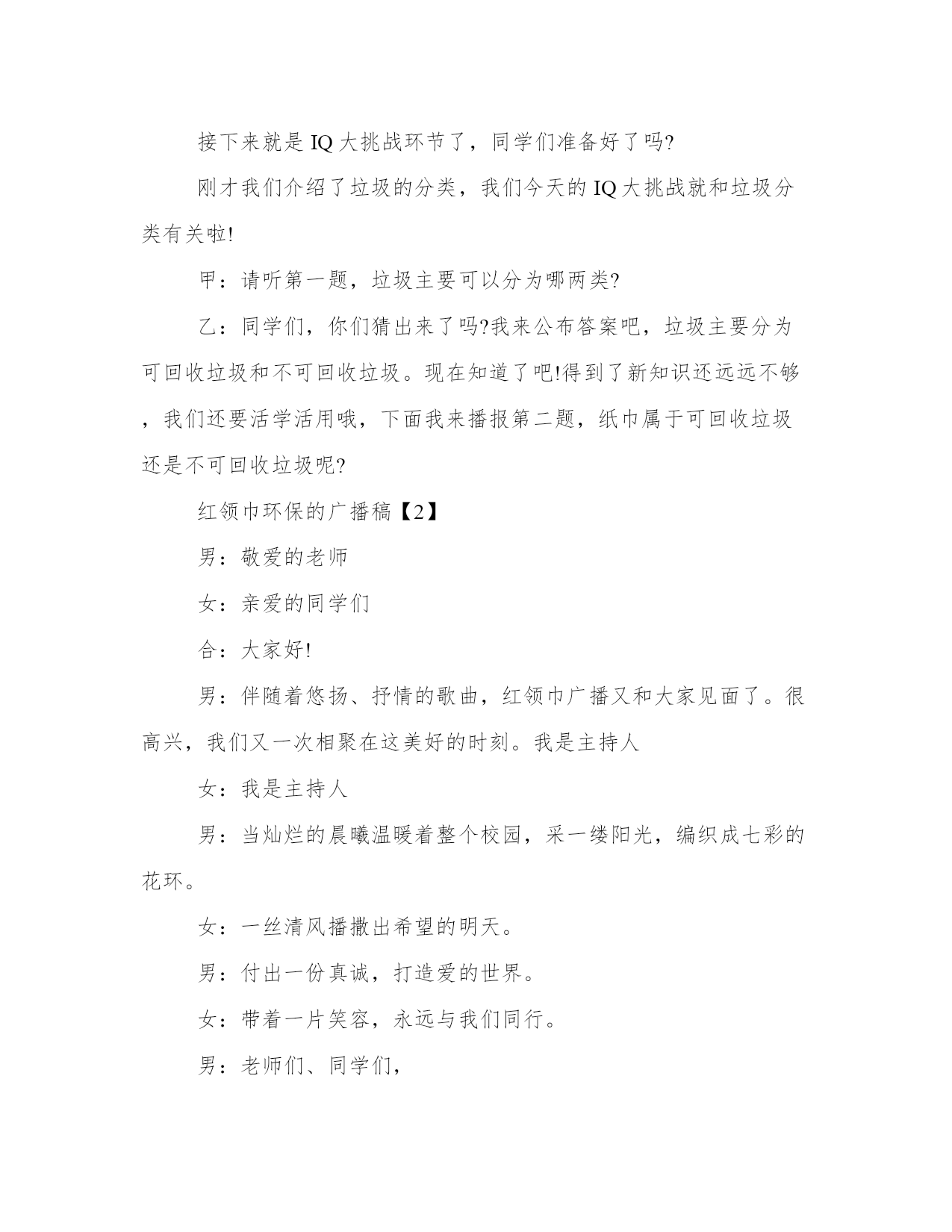 红领巾环保的广播稿甲:你的喝彩就是我们的精彩!乙:非常感谢您的收听,让我们期待下次时间,我们将与您在空中相约。合:亲爱的老师!同学们!大家好!甲:当清晨的阳光洒遍整个学校,乙:当萧萧的秋风吹遍整个校园,甲:当美丽的落叶像蝴蝶一样纷飞,乙:我们感受到天高云淡、秋意渐浓。甲:留住一丝清风,播撒出希望的明天。乙:付出一份真诚,打造爱的世界。甲:带走一片笑容,永远与我们同行。合:红领巾广播又和大家见面了!甲:今天的红领巾广播由我们主持。我是主持人:﹍﹍﹍。乙:我是主持人:﹍﹍﹍。今天的栏目有校园百宝箱、IQ大挑战、佳文共赏、123点歌台。乙:同学们,你们知道怎样才能做好垃圾回收吗?甲:要做好垃圾分类回收,要先弄清垃圾怎么分类。现在我们先来了解一下垃圾是怎么分类的吧。乙:垃圾主要可以分为可回收垃圾和不可回收垃圾。甲:同学们要注意,可回收垃圾主要包括废纸、塑料、玻璃、金属和布料五大类。乙:废纸主要包括报纸、期刊、图书、各种包装纸、办公用纸、广告纸、纸盒等,但是要注意纸巾和厕所纸由于太容易溶解在水里,所以不可回收。甲:塑料主要包括各种塑料袋、塑料包装物、一次性塑料餐盒和餐具、牙刷、杯子、矿泉水瓶、牙膏皮等。乙:玻璃主要包括各种玻璃瓶、碎玻璃片、镜子、灯泡、暖瓶等。甲:金属物主要包括易拉罐、罐头盒等。乙:布料主要包括废弃衣服、桌布、洗脸巾、书包、鞋等。甲:同学们,刚才我们说的是可回收垃圾。乙:不可回收垃圾包括厨房垃圾、有害垃圾、其它垃圾。甲:举手之劳战胜垃圾公害!乙:作为新时代的小学生,我倡导同学们提高保护环境的意识,为保护环境、造福后代贡献自己的力量。因为保护环境,刻不容缓!甲:我们的地球是美丽的:晶莹的蓝天和深沉的黄土地孕育出清新透亮的绿。乙:保护地球是我们每个公民的义务,环保应从我们做起,从每一件小事做起。合:让我们的家园更美丽,让绿永恒!接下来就是IQ大挑战环节了,同学们准备好了吗?刚才我们介绍了垃圾的分类,我们今天的IQ大挑战就和垃圾分类有关啦!甲:请听第一题,垃圾主要可以分为哪两类?乙:同学们,你们猜出来了吗?我来公布答案吧,垃圾主要分为可回收垃圾和不可回收垃圾。现在知道了吧!得到了新知识还远远不够,我们还要活学活用哦,下面我来播报第二题,纸巾属于可回收垃圾还是不可回收垃圾呢?红领巾环保的广播稿【2】男:敬爱的老师女:亲爱的同学们合:大家好!男:伴随着悠扬、抒情的歌曲,红领巾广播又和大家见面了。很高兴,我们又一次相聚在这美好的时刻。我是主持人女:我是主持人男:当灿烂的晨曦温暖着整个校园,采一缕阳光,编织成七彩的花环。女:一丝清风播撒出希望的明天。男:付出一份真诚,打造爱的世界。女:带着一片笑容,永远与我们同行。男:老师们、同学们,男:首先,请听由红领巾广播站向全体同学宣读勤俭节约的倡议书。女:同学们,中华民族历来以勤劳勇敢、不畏艰难著称于世。我们古人曾讲过,艰难困苦,玉汝于成,居安思危,戒奢以俭,忧劳兴国,逸豫亡身,生于忧患,死于安乐。历史和现实都告诉我们:勤俭节约是中华民族的传统美德;艰苦奋斗是我的优良作风;勤俭是我们发展进步的潜在动力。男:今天的中国,蓬勃发展,但是勤俭节约、艰苦奋斗的传统和作风将是我们宝贵的财富。以往的成绩只能说明过去,按照我国的战略目标,今后的路还很长,我们肩负的任务还很重,可能遇到的困难和挑战还很多。因此,勤俭节约,艰苦奋斗的精神决不能丢。女:我们的祖先,在从前的艰苦生活中,学会了勤俭节约,以他们为榜样,勤俭节约便成了我们中华人民的美德传统。男:对于我们在校生,更应该做到这一点。但话虽如此,可是并不是每个同学都做到了。那么如何才能使我们做到勤俭节约,使我们的学校成为一个和谐而又节约的学校?女:勤俭节约一词,相信还会有不少同学在疑问:什么是勤俭,而什么又是该节约的呢?要弄清这一点,还需要从浪费的根源说起,比如说我们最常见:每天都要接触的水。有人认为水多得是到处都有,用完了这一水池,它还会从山上流下,地下冒出。如果你是这样想那你就错了。其实,我们人类在处于缺水危险,虽然说地球的3/4面积都是水,但可供人类食用的淡水是很少的。所以,我们要节约用水,还有我们吃剩的饭菜,有的同学吃不完了就随便乱倒。如果是吃不了那么多,我们可以相应地买少一点,这样我们既省了点钱,又不浪费粮食。粮食的短缺,也是我们国家面临的一个重要问题。大家可以计算,如果每个同学每天需要1斤米,那么我们一个学校有1000个学生一天就要1000斤学生一天就要1000斤大米,一个月就3万斤。可想而知如果更多呢?所以我们要节约粮食,不要过余浪费。男:还有许许多多的,在我们日常生活和学习上需要节约的。只要我们每个同学都有勤俭节约的好习惯,那么我们就能成为一