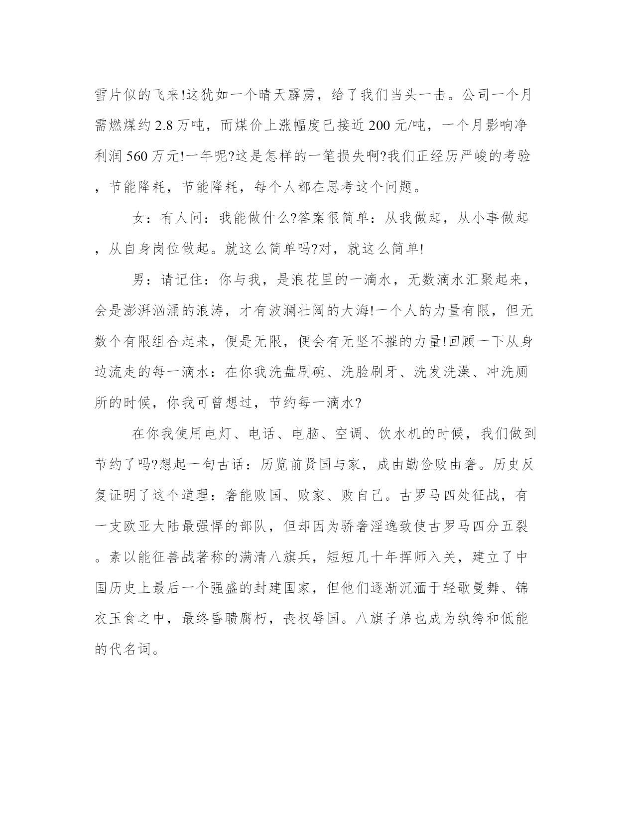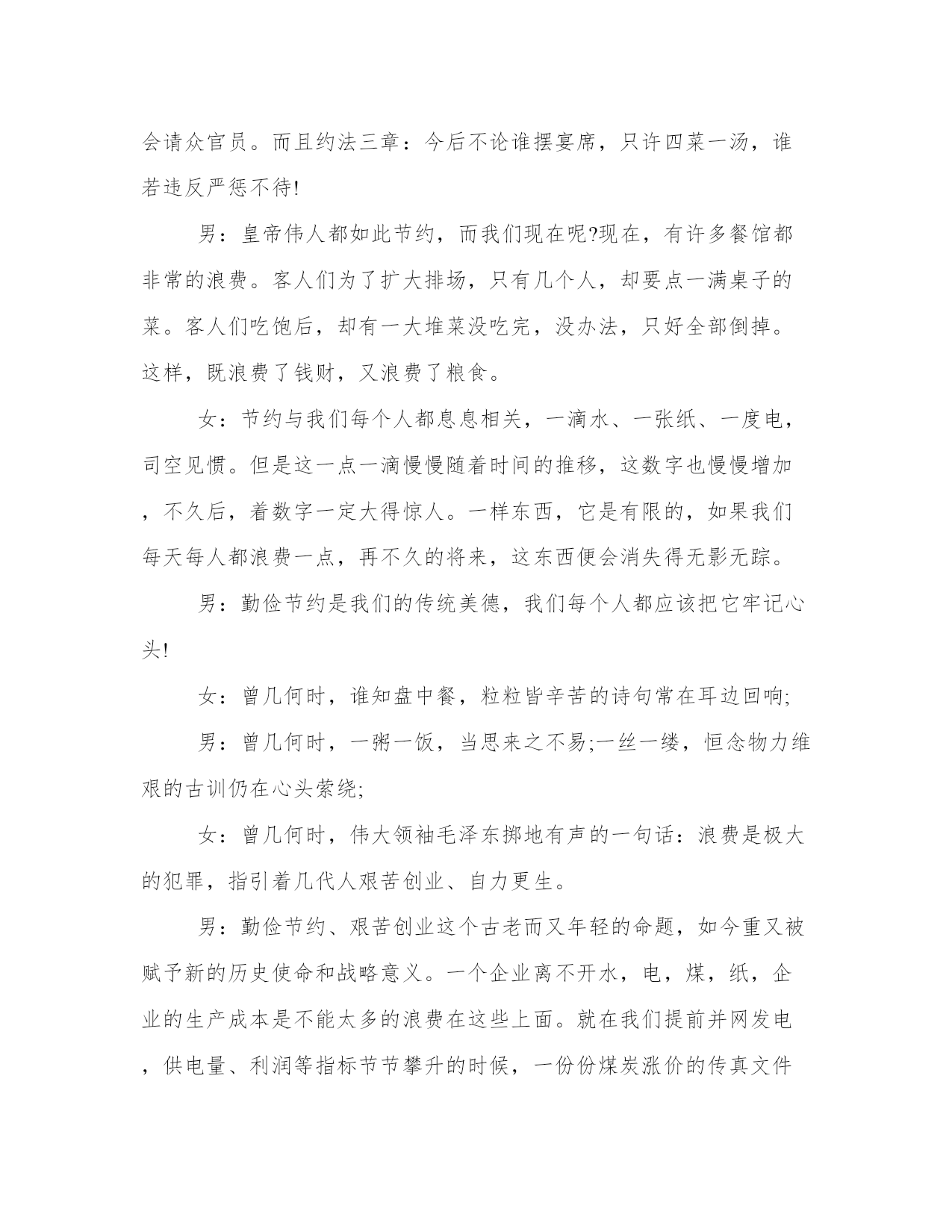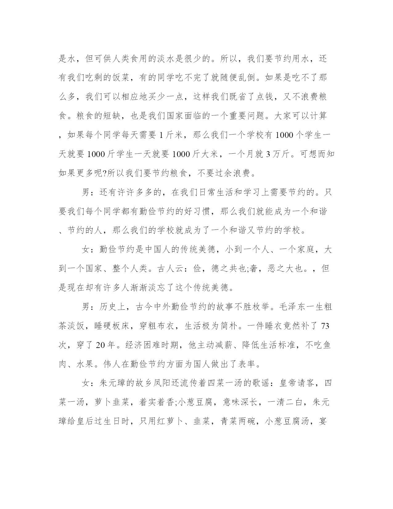 红领巾环保的广播稿甲:你的喝彩就是我们的精彩!乙:非常感谢您的收听,让我们期待下次时间,我们将与您在空中相约。合:亲爱的老师!同学们!大家好!甲:当清晨的阳光洒遍整个学校,乙:当萧萧的秋风吹遍整个校园,甲:当美丽的落叶像蝴蝶一样纷飞,乙:我们感受到天高云淡、秋意渐浓。甲:留住一丝清风,播撒出希望的明天。乙:付出一份真诚,打造爱的世界。甲:带走一片笑容,永远与我们同行。合:红领巾广播又和大家见面了!甲:今天的红领巾广播由我们主持。我是主持人:﹍﹍﹍。乙:我是主持人:﹍﹍﹍。今天的栏目有校园百宝箱、IQ大挑战、佳文共赏、123点歌台。乙:同学们,你们知道怎样才能做好垃圾回收吗?甲:要做好垃圾分类回收,要先弄清垃圾怎么分类。现在我们先来了解一下垃圾是怎么分类的吧。乙:垃圾主要可以分为可回收垃圾和不可回收垃圾。甲:同学们要注意,可回收垃圾主要包括废纸、塑料、玻璃、金属和布料五大类。乙:废纸主要包括报纸、期刊、图书、各种包装纸、办公用纸、广告纸、纸盒等,但是要注意纸巾和厕所纸由于太容易溶解在水里,所以不可回收。甲:塑料主要包括各种塑料袋、塑料包装物、一次性塑料餐盒和餐具、牙刷、杯子、矿泉水瓶、牙膏皮等。乙:玻璃主要包括各种玻璃瓶、碎玻璃片、镜子、灯泡、暖瓶等。甲:金属物主要包括易拉罐、罐头盒等。乙:布料主要包括废弃衣服、桌布、洗脸巾、书包、鞋等。甲:同学们,刚才我们说的是可回收垃圾。乙:不可回收垃圾包括厨房垃圾、有害垃圾、其它垃圾。甲:举手之劳战胜垃圾公害!乙:作为新时代的小学生,我倡导同学们提高保护环境的意识,为保护环境、造福后代贡献自己的力量。因为保护环境,刻不容缓!甲:我们的地球是美丽的:晶莹的蓝天和深沉的黄土地孕育出清新透亮的绿。乙:保护地球是我们每个公民的义务,环保应从我们做起,从每一件小事做起。合:让我们的家园更美丽,让绿永恒!接下来就是IQ大挑战环节了,同学们准备好了吗?刚才我们介绍了垃圾的分类,我们今天的IQ大挑战就和垃圾分类有关啦!甲:请听第一题,垃圾主要可以分为哪两类?乙:同学们,你们猜出来了吗?我来公布答案吧,垃圾主要分为可回收垃圾和不可回收垃圾。现在知道了吧!得到了新知识还远远不够,我们还要活学活用哦,下面我来播报第二题,纸巾属于可回收垃圾还是不可回收垃圾呢?红领巾环保的广播稿【2】男:敬爱的老师女:亲爱的同学们合:大家好!男:伴随着悠扬、抒情的歌曲,红领巾广播又和大家见面了。很高兴,我们又一次相聚在这美好的时刻。我是主持人女:我是主持人男:当灿烂的晨曦温暖着整个校园,采一缕阳光,编织成七彩的花环。女:一丝清风播撒出希望的明天。男:付出一份真诚,打造爱的世界。女:带着一片笑容,永远与我们同行。男:老师们、同学们,男:首先,请听由红领巾广播站向全体同学宣读勤俭节约的倡议书。女:同学们,中华民族历来以勤劳勇敢、不畏艰难著称于世。我们古人曾讲过,艰难困苦,玉汝于成,居安思危,戒奢以俭,忧劳兴国,逸豫亡身,生于忧患,死于安乐。历史和现实都告诉我们:勤俭节约是中华民族的传统美德;艰苦奋斗是我的优良作风;勤俭是我们发展进步的潜在动力。男:今天的中国,蓬勃发展,但是勤俭节约、艰苦奋斗的传统和作风将是我们宝贵的财富。以往的成绩只能说明过去,按照我国的战略目标,今后的路还很长,我们肩负的任务还很重,可能遇到的困难和挑战还很多。因此,勤俭节约,艰苦奋斗的精神决不能丢。女:我们的祖先,在从前的艰苦生活中,学会了勤俭节约,以他们为榜样,勤俭节约便成了我们中华人民的美德传统。男:对于我们在校生,更应该做到这一点。但话虽如此,可是并不是每个同学都做到了。那么如何才能使我们做到勤俭节约,使我们的学校成为一个和谐而又节约的学校?女:勤俭节约一词,相信还会有不少同学在疑问:什么是勤俭,而什么又是该节约的呢?要弄清这一点,还需要从浪费的根源说起,比如说我们最常见:每天都要接触的水。有人认为水多得是到处都有,用完了这一水池,它还会从山上流下,地下冒出。如果你是这样想那你就错了。其实,我们人类在处于缺水危险,虽然说地球的3/4面积都是水,但可供人类食用的淡水是很少的。所以,我们要节约用水,还有我们吃剩的饭菜,有的同学吃不完了就随便乱倒。如果是吃不了那么多,我们可以相应地买少一点,这样我们既省了点钱,又不浪费粮食。粮食的短缺,也是我们国家面临的一个重要问题。大家可以计算,如果每个同学每天需要1斤米,那么我们一个学校有1000个学生一天就要1000斤学生一天就要1000斤大米,一个月就3万斤。可想而知如果更多呢?所以我们要节约粮食,不要过余浪费。男:还有许许多多的,在我们日常生活和学习上需要节约的。只要我们每个同学都有勤俭节约的好习惯,那么我们就能成为一