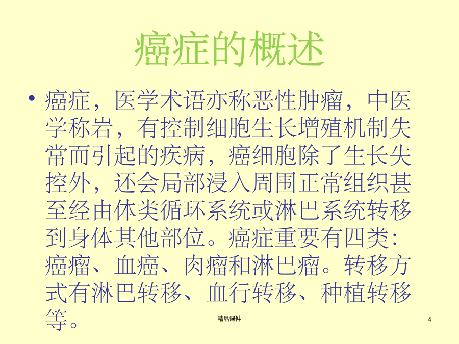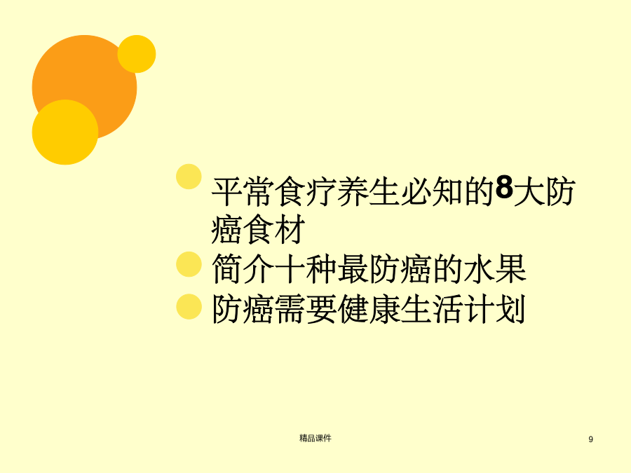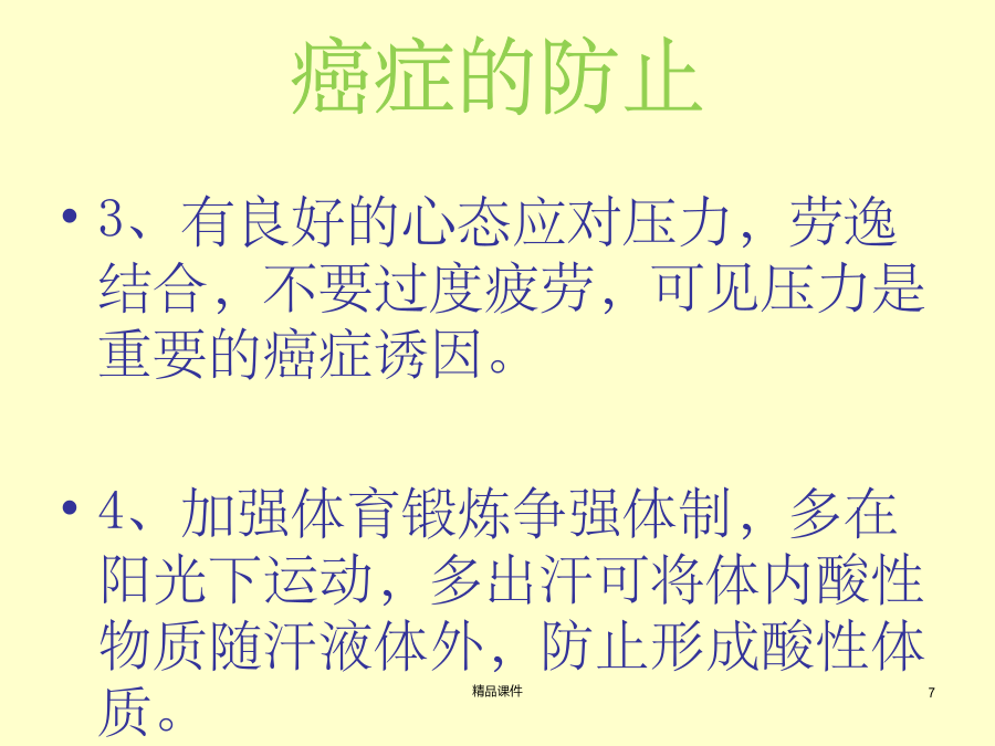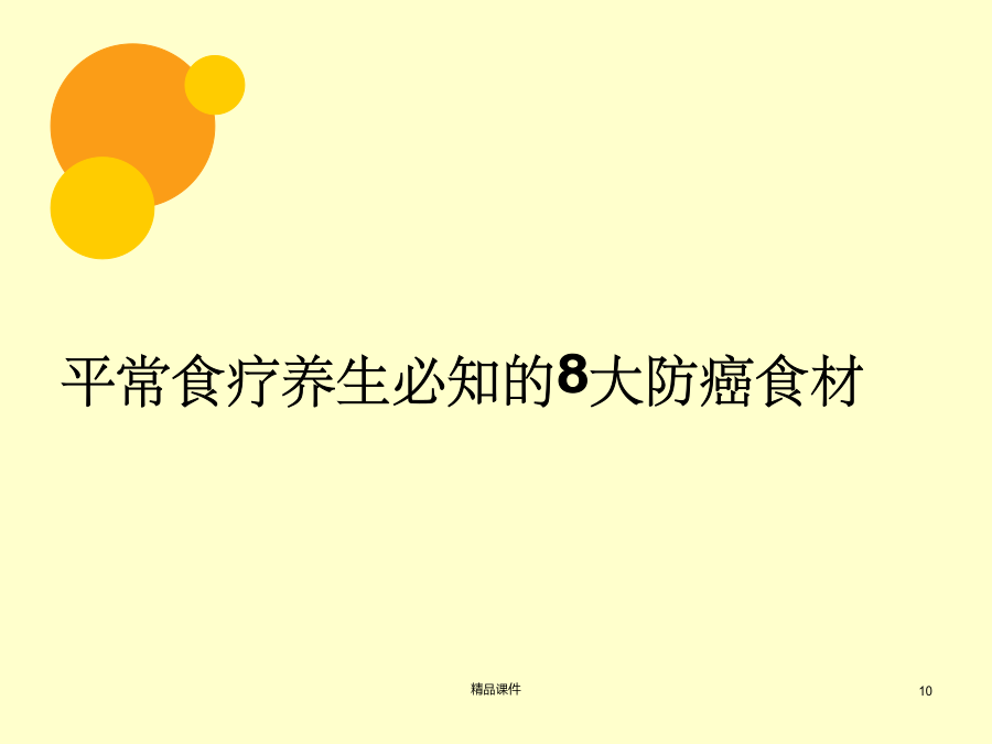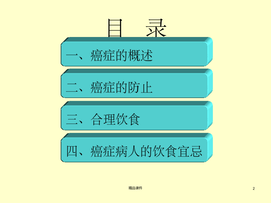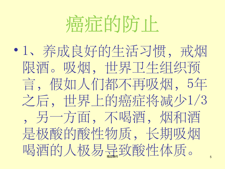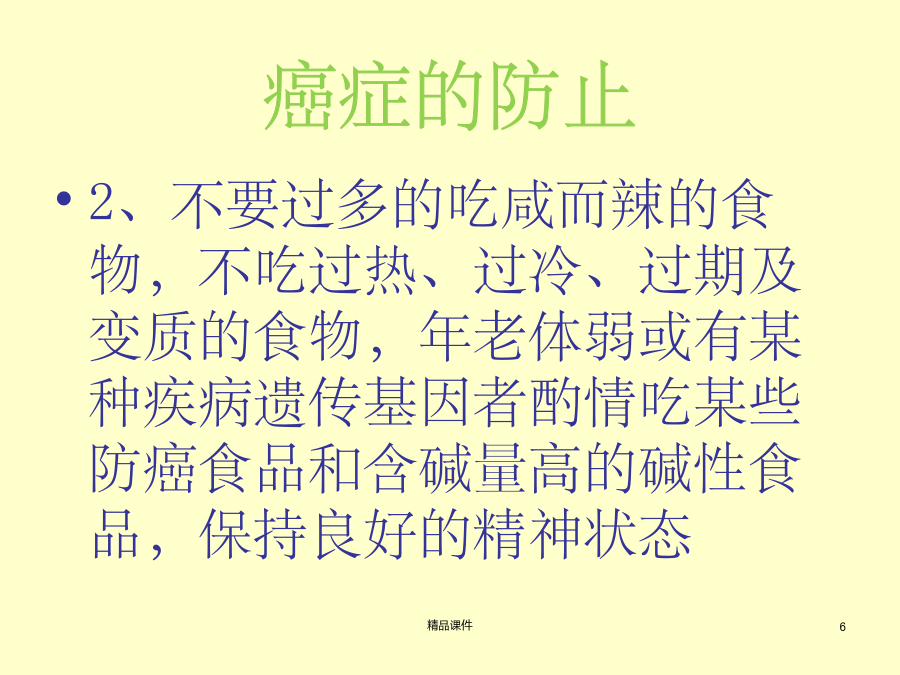 目录癌症的概述癌症的概述癌症的防止癌症的防止癌症的防止癌症的防止平常食疗养生必知的8大防癌食材肠癌抗癌明星:茭白上榜理由:茭白、芹菜类食物富含纤维,食物进入肠道后,可加紧其中食物残渣的排空速度,缩短食物中有毒物质在肠道内滞留的时间,增进胆汁酸的排泄,对防止大肠癌极为有效。此外,常常食用大蒜,也可使患结肠癌的风险减少30%。同步,红薯、卷心菜、麦麸也是极其重要的防止肠癌的食物。宫颈癌抗癌明星:黄豆上榜理由:用黄豆制成的豆腐、豆浆,可以补充植物雌激素,它所具有的异黄酮、木质素都被认为有抗氧化的作用,能克制宫颈癌的生长,减少癌细胞的分裂,同步有效制止肿瘤转移。此外,酸梅、西红柿也是很好的防止宫颈癌的食物。胰腺癌抗癌明星:菜花上榜理由:西兰花等十字花科食物,可以减少患胰腺癌的风险。研究指出,这也许与食物中具有的天然叶酸有关。同步,由于萝卜中具有芥子油,它和萝卜中的酶能互相作用,具有增进胃肠蠕动、增进食欲、协助消化的功能。近年来,研究发现,萝卜因此也有助于抵御胰腺癌。胃癌抗癌明星:大蒜上榜理由:常吃生大蒜的人,胃癌发病率非常低,原因是大蒜能明显减少胃中亚硝酸盐含量,而这是胃癌非常重要的诱因。而常常吃洋葱的人,胃癌发病率比少吃或不吃洋葱的人也要低25%。此外,少吃腌渍食品、熏鱼烤鱼也是防止胃癌的好措施。皮肤癌抗癌明星:芦笋上榜理由:芦笋是近年风行世界餐桌的蔬菜之一,具有丰富的维生素、芦丁、核酸等成分,对淋巴瘤、膀胱癌、皮肤癌有一定疗效。肺癌抗癌明星:菠菜上榜理由:菠菜中具有多种抗氧化物,有助于防止自由基损伤导致的癌症。每天吃1碗菠菜可使患肺癌的几率至少减少二分之一。此外,番茄、胡萝卜、南瓜、梨和苹果也都可以防止肺癌的发生。肝癌抗癌明星:蘑菇上榜理由:有“抗癌第一菜”的美誉,例如菜蘑、口蘑、香菇等,由于具有多糖体类的抗癌活性物质,可以增进抗体形成,使机体对肿瘤产生免疫能力,克制肿瘤细胞生长,可以抵御包括淋巴瘤、肠癌等在内的多种癌症,尤其是对肝癌病人,很有益处。乳腺癌抗癌明星:海带上榜理由:海带不仅具有丰富的维生素E和食物纤维,还具有微量元素碘。而科学家认为,缺碘是乳腺癌的致病原因之一,因而常吃海带有助于防止乳腺癌。日本女性乳腺癌发病率低,也许与常常摄入海带等海藻类食物有关。同步,红薯、番茄、菱角、荸荠、豆类食品也是能防止乳腺癌的美食。简介十种最防癌的水果苹果富含纤维物质,可补充给人体足够的纤维,减少心脏病的发病率,还可以减肥。许多美国人把苹果作为瘦身必备食品,每周节食一天,这一天只吃苹果,号称“苹果日”。杏具有丰富的β胡萝卜素,能协助人体摄取维生素a。香蕉中钾元素的含量很高,这对人的心脏和肌肉功能很有好处。同等重量的黑莓中纤维物质的含量是其他水果的3倍多,毫无疑问它对心脏健康有协助。蓝莓是种尤其的水果,多吃蓝莓可减少尿路感染的几率。甜瓜中维生素a和c的含量都很高,是补充维生素的理想食品。能协助减少尿路感染的几率。能协助减少尿路感染的几率。维生素c的含量很高。其类黄酮等物质为心脏提供三重保护。感谢聆听!