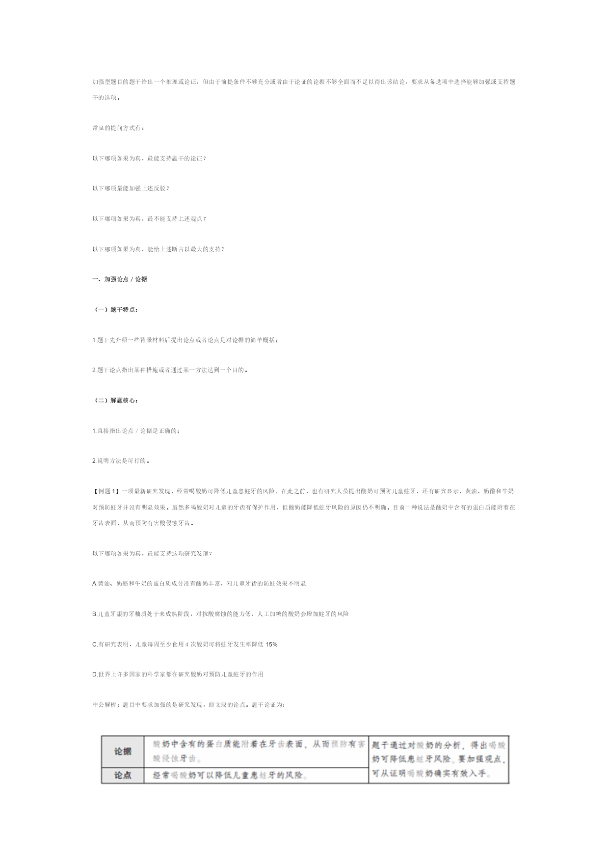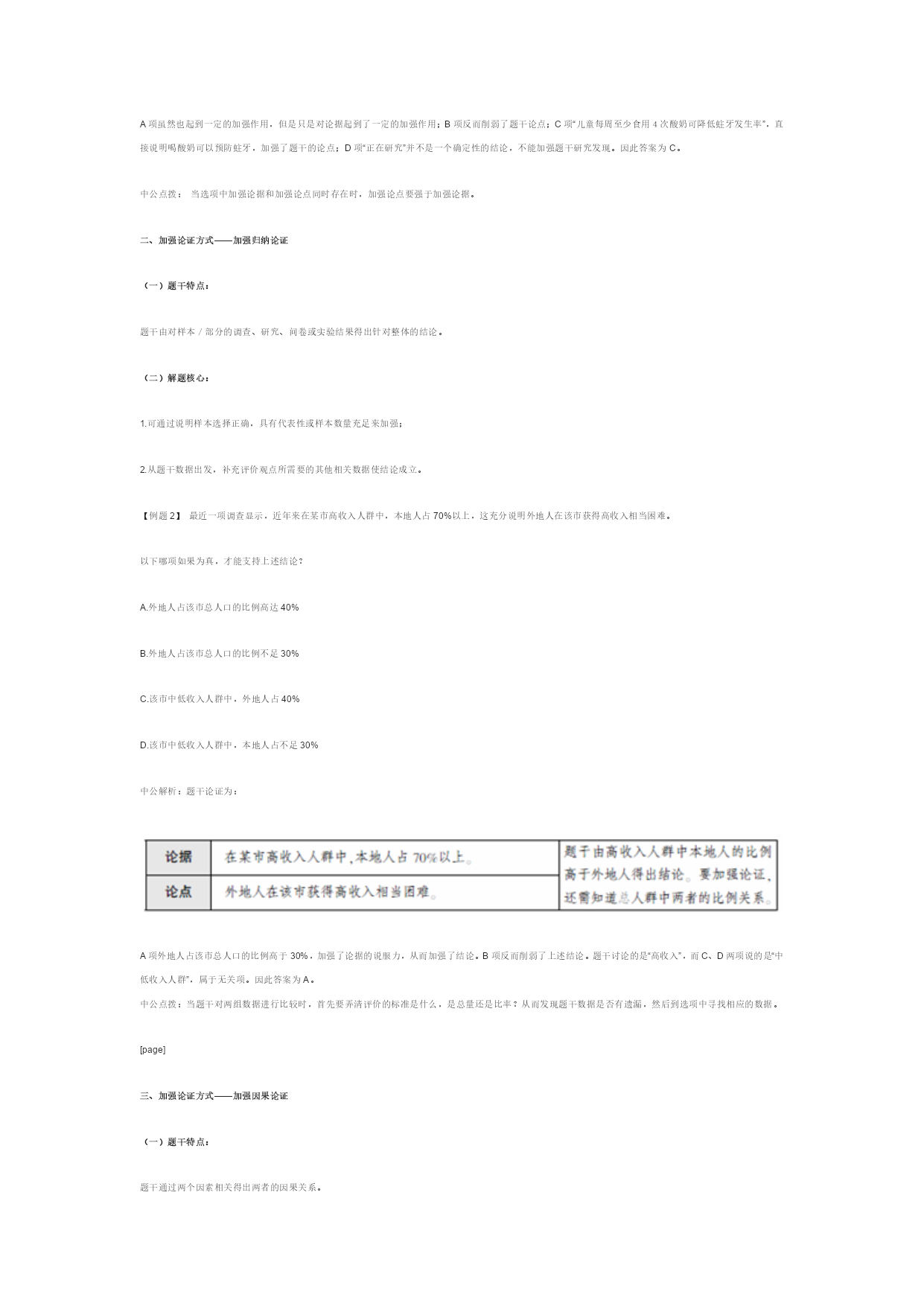 加强型题目的题干给出一个推理或论证,但由于前提条件不够充分或者由于论证的论据不够全面而不足以得出该结论,要求从备选项中选择能够加强或支持题干的选项。常见的提问方式有:以下哪项如果为真,最能支持题干的论证?以下哪项最能加强上述反驳?以下哪项如果为真,最不能支持上述观点?以下哪项如果为真,能给上述断言以最大的支持?一、加强论点/论据(一)题干特点:1.题干先介绍一些背景材料后提出论点或者论点是对论据的简单概括;2.题干论点指出某种措施或者通过某一方法达到一个目的。(二)解题核心:1.直接指出论点/论据是正确的;2.说明方法是可行的。【例题1】一项最新研究发现,经常喝酸奶可降低儿童患蛀牙的风险。在此之前,也有研究人员提出酸奶可预防儿童蛀牙,还有研究显示,黄油、奶酪和牛奶对预防蛀牙并没有明显效果。虽然多喝酸奶对儿童的牙齿有保护作用,但酸奶能降低蛀牙风险的原因仍不明确。目前一种说法是酸奶中含有的蛋白质能附着在牙齿表面,从而预防有害酸侵蚀牙齿。以下哪项如果为真,最能支持这项研究发现?A.黄油、奶酪和牛奶的蛋白质成分没有酸奶丰富,对儿童牙齿的防蛀效果不明显B.儿童牙龈的牙釉质处于未成熟阶段,对抗酸腐蚀的能力低,人工加糖的酸奶会增加蛀牙的风险C.有研究表明,儿童每周至少食用4次酸奶可将蛀牙发生率降低15%D.世界上许多国家的科学家都在研究酸奶对预防儿童蛀牙的作用中公解析:题目中要求加强的是研究发现,即文段的论点。题干论证为:A项虽然也起到一定的加强作用,但是只是对论据起到了一定的加强作用;B项反而削弱了题干论点;C项“儿童每周至少食用4次酸奶可降低蛀牙发生率”,直接说明喝酸奶可以预防蛀牙,加强了题干的论点;D项“正在研究”并不是一个确定性的结论,不能加强题干研究发现。因此答案为C。中公点拨:当选项中加强论据和加强论点同时存在时,加强论点要强于加强论据。二、加强论证方式——加强归纳论证(一)题干特点:题干由对样本/部分的调查、研究、问卷或实验结果得出针对整体的结论。(二)解题核心:1.可通过说明样本选择正确,具有代表性或样本数量充足来加强;2.从题干数据出发,补充评价观点所需要的其他相关数据使结论成立。【例题2】最近一项调查显示,近年来在某市高收入人群中,本地人占70%以上,这充分说明外地人在该市获得高收入相当困难。以下哪项如果为真,才能支持上述结论?A.外地人占该市总人口的比例高达40%B.外地人占该市总人口的比例不足30%C.该市中低收入人群中,外地人占40%D.该市中低收入人群中,本地人占不足30%中公解析:题干论证为:A项外地人占该市总人口的比例高于30%,加强了论据的说服力,从而加强了结论。B项反而削弱了上述结论。题干讨论的是“高收入”,而C、D两项说的是“中低收入人群”,属于无关项。因此答案为A。中公点拨:当题干对两组数据进行比较时,首先要弄清评价的标准是什么,是总量还是比率?从而发现题干数据是否有遗漏,然后到选项中寻找相应的数据。[page]三、加强论证方式——加强因果论证(一)题干特点:题干通过两个因素相关得出两者的因果关系。(二)解题核心:1.从反面场合加强。即指出题干原因条件不存在时,结果也不存在。实际上是通过求异法得出因果联系。2.排除他因。说明除了题干原因之外的其他条件是相同的。【例题3】该清醒地认识到,目前房地产市场最大的矛盾不是供需之间的矛盾,而是百姓囊中羞涩与房价不断上涨之间的矛盾。而这一问题产生的根源就在于房子被当作奇货可居、有利可图的商品,被房产商和手有余钱的业主一而再再而三地热炒。于是我们看到一些房产商宁愿把房子成片闲置也不愿平价或降价出售;某些富有的业主又有两三套,甚至十数套房产,而大量炒房团也应运而生。以下最能加强上述结论的是()。A.经济学家近来十分关注炒房对房价上涨的影响作用B.在一些内陆地区,未发生炒房现象,房价比较平稳C.在一些经济发达的地区,炒房现象虽不突出,但房价仍然居高不下D.一些地区拟对拥有多套房者开征土地使用费,可以有效地抑制虚假的住房需求中公解析:“根源就在于”引出题干的因果关系,因此题干的论证是:A项经济学家的关注不能说明两者之间一定存在联系,不能加强结论;B项从反面说明,没有炒房现象,房价不会上涨,与题干结合构成了求异法的前提,加强了题干结论;C项则直接削弱了题干结论;D项认为房价上涨是由于虚假的住房需求的存在,削弱了题干结论。因此答案为B。四、加强论证方式——加强跳跃论证(一)题干特点:题干论据与论点之间存在明显的跳跃。(二)解题核心:1.建立联系。通过“搭桥”的方法在两者之间建立联系;2.排除他因。即排除其他因素的影响,从而使两者之间存在联系。