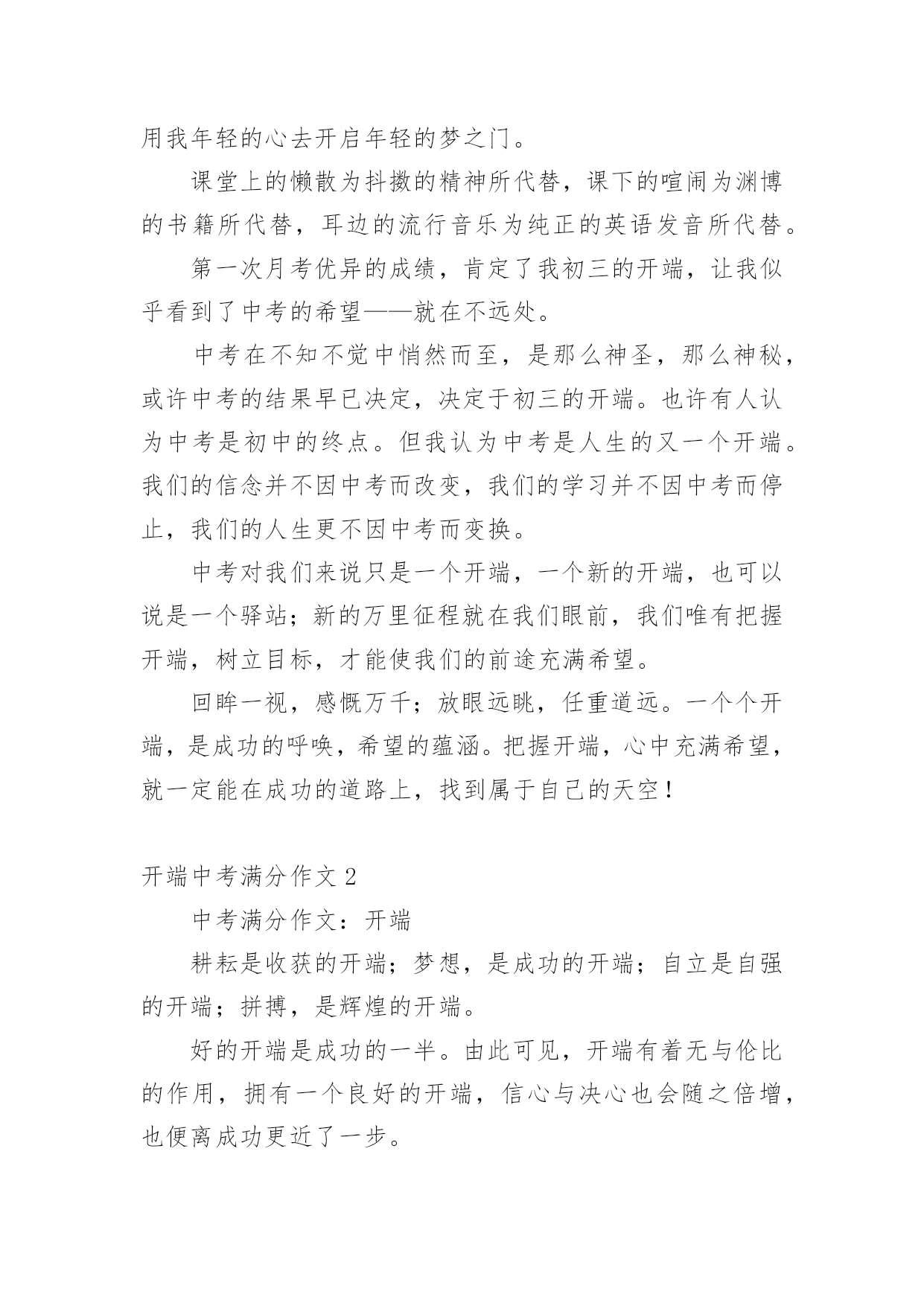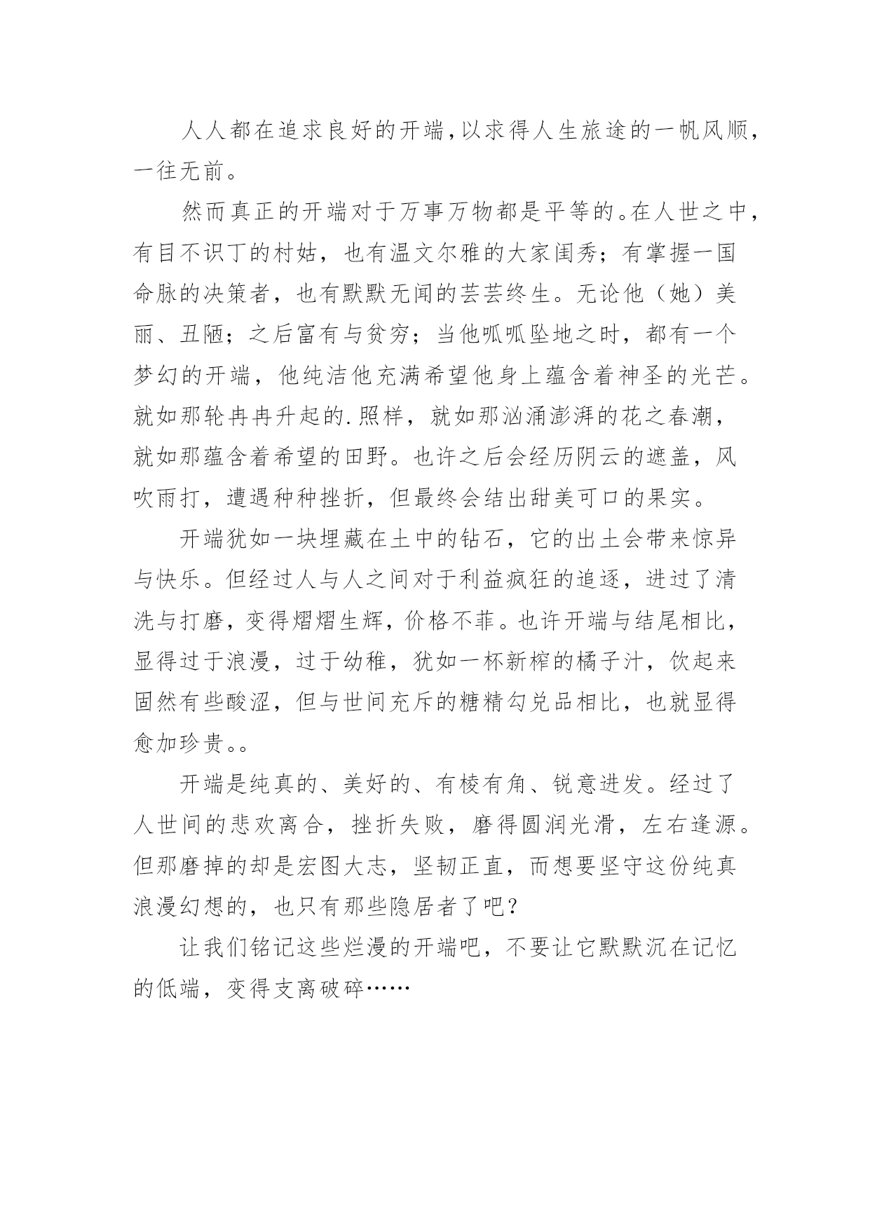开端中考满分作文无论是身处学校还是步入社会,大家都写过作文,肯定对各类作文都很熟悉吧,作文要求篇章结构完整,一定要避免无结尾作文的出现。为了让您在写作文时更加简单方便,以下是小编为大家收集的开端中考满分作文,仅供参考,大家一起来看看吧。开端中考满分作文1“一年之计在于春,一天之计在于晨”、“好的开始是成功的一半”。这些名言警句都告诉了我们开端对于成功的重要性。《相对论,蝴蝶效应》中有这样一句话:“系统初始量微小的变化,便能引起计算结果的巨大误差……南美洲一只蝴蝶翅膀的扇动,便会引起太平洋上的一场风暴。”万事开端的好坏,往往预示着其成功与否。这是一种冥冥之中的安排,更是一种必然。20xx年9月1日,初三的开端,也许有人认为中考还有一年之隔,实际上中考已经在悄无声息中硝烟弥漫……初三的开端,没有了喧嚣与浮躁,没有了不安与打闹;有的只是一份宁静,一份紧张,一份忙碌,一份充实。年轻的心灵在学习中悸动。我放下手中的篮球,拂去课本与心灵中的一缕灰尘,投身于知识的海洋,纵情于学习的`世界,开始了我的寻梦,用我年轻的心去开启年轻的梦之门。课堂上的懒散为抖擞的精神所代替,课下的喧闹为渊博的书籍所代替,耳边的流行音乐为纯正的英语发音所代替。第一次月考优异的成绩,肯定了我初三的开端,让我似乎看到了中考的希望——就在不远处。中考在不知不觉中悄然而至,是那么神圣,那么神秘,或许中考的结果早已决定,决定于初三的开端。也许有人认为中考是初中的终点。但我认为中考是人生的又一个开端。我们的信念并不因中考而改变,我们的学习并不因中考而停止,我们的人生更不因中考而变换。中考对我们来说只是一个开端,一个新的开端,也可以说是一个驿站;新的万里征程就在我们眼前,我们唯有把握开端,树立目标,才能使我们的前途充满希望。回眸一视,感慨万千;放眼远眺,任重道远。一个个开端,是成功的呼唤,希望的蕴涵。把握开端,心中充满希望,就一定能在成功的道路上,找到属于自己的天空!开端中考满分作文2中考满分作文:开端耕耘是收获的开端;梦想,是成功的开端;自立是自强的开端;拼搏,是辉煌的开端。好的开端是成功的一半。由此可见,开端有着无与伦比的作用,拥有一个良好的开端,信心与决心也会随之倍增,也便离成功更近了一步。人人都在追求良好的开端,以求得人生旅途的一帆风顺,一往无前。然而真正的开端对于万事万物都是平等的。在人世之中,有目不识丁的村姑,也有温文尔雅的大家闺秀;有掌握一国命脉的决策者,也有默默无闻的芸芸终生。无论他(她)美丽、丑陋;之后富有与贫穷;当他呱呱坠地之时,都有一个梦幻的开端,他纯洁他充满希望他身上蕴含着神圣的光芒。就如那轮冉冉升起的.照样,就如那汹涌澎湃的花之春潮,就如那蕴含着希望的田野。也许之后会经历阴云的遮盖,风吹雨打,遭遇种种挫折,但最终会结出甜美可口的果实。开端犹如一块埋藏在土中的钻石,它的出土会带来惊异与快乐。但经过人与人之间对于利益疯狂的追逐,进过了清洗与打磨,变得熠熠生辉,价格不菲。也许开端与结尾相比,显得过于浪漫,过于幼稚,犹如一杯新榨的橘子汁,饮起来固然有些酸涩,但与世间充斥的糖精勾兑品相比,也就显得愈加珍贵。。开端是纯真的、美好的、有棱有角、锐意进发。经过了人世间的悲欢离合,挫折失败,磨得圆润光滑,左右逢源。但那磨掉的却是宏图大志,坚韧正直,而想要坚守这份纯真浪漫幻想的,也只有那些隐居者了吧?让我们铭记这些烂漫的开端吧,不要让它默默沉在记忆的低端,变得支离破碎……