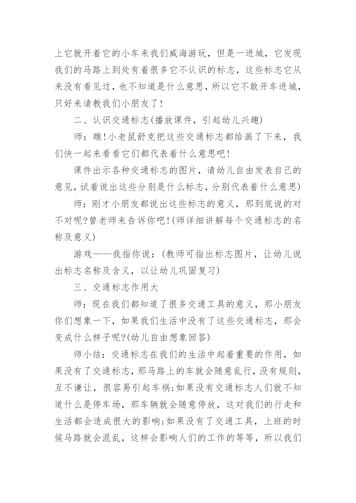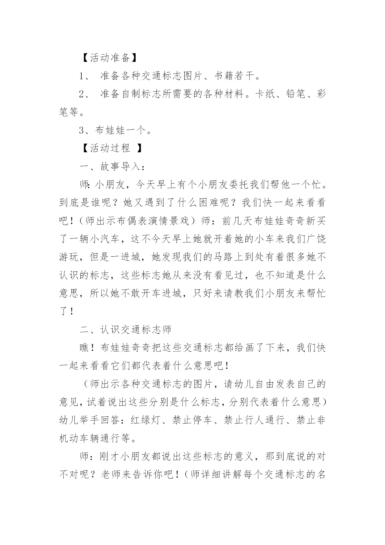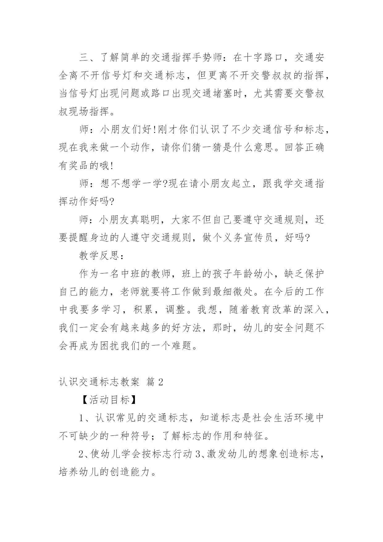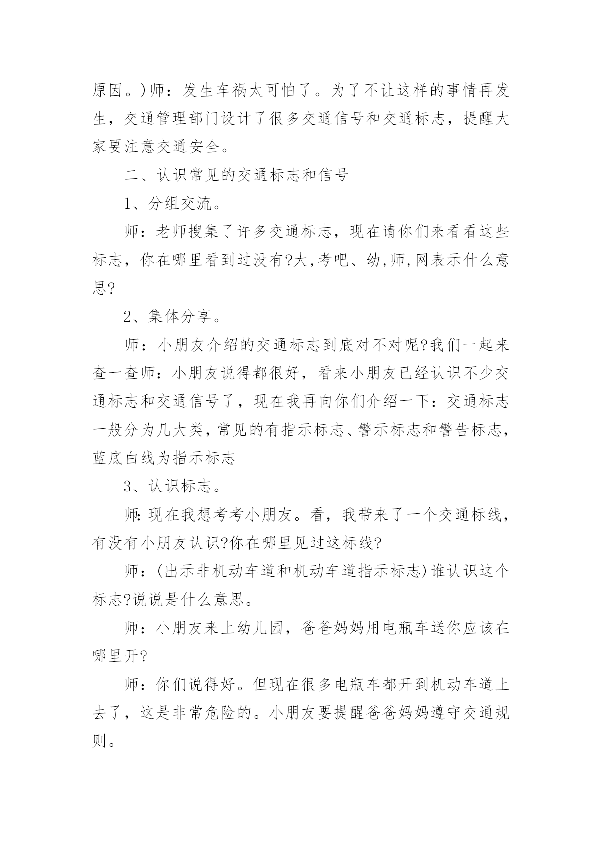 认识交通标志教案认识交通标志教案集锦五篇作为一名辛苦耕耘的教育工作者,常常要根据教学需要编写教案,教案是教学活动的依据,有着重要的地位。那么优秀的教案是什么样的呢?下面是小编精心整理的认识交通标志教案6篇,仅供参考,欢迎大家阅读。认识交通标志教案篇1活动目标:1、认识并了解一些常见的交通信号、交通标志和交通标线的作用。2、知道出行要按交通标志行走,要服从交警指挥,有初步的交通安全意识。3、学习收集整理材料的方法,通过交流分享主动获取新知识。4、培养幼儿勇敢、活泼的个性。5、鼓励幼儿大胆说话和积极应答。活动准备:课件(各种交通标志)活动过程:一、讲述交通事故案例,导入教师讲述交通事故:问你觉得为什么会发生车祸的呢?(幼儿交流讨论可能发生车祸的.原因。)师:发生车祸太可怕了。为了不让这样的事情再发生,交通管理部门设计了很多交通信号和交通标志,提醒大家要注意交通安全。二、认识常见的交通标志和信号1、分组交流。师:老师搜集了许多交通标志,现在请你们来看看这些标志,你在哪里看到过没有?大,考吧、幼,师,网表示什么意思?2、集体分享。师:小朋友介绍的交通标志到底对不对呢?我们一起来查一查师:小朋友说得都很好,看来小朋友已经认识不少交通标志和交通信号了,现在我再向你们介绍一下:交通标志一般分为几大类,常见的有指示标志、警示标志和警告标志,蓝底白线为指示标志3、认识标志。师:现在我想考考小朋友。看,我带来了一个交通标线,有没有小朋友认识?你在哪里见过这标线?师:(出示非机动车道和机动车道指示标志)谁认识这个标志?说说是什么意思。师:小朋友来上幼儿园,爸爸妈妈用电瓶车送你应该在哪里开?师:你们说得好。但现在很多电瓶车都开到机动车道上去了,这是非常危险的。小朋友要提醒爸爸妈妈遵守交通规则。三、了解简单的交通指挥手势师:在十字路口,交通安全离不开信号灯和交通标志,但更离不开交警叔叔的指挥,当信号灯出现问题或路口出现交通堵塞时,尤其需要交警叔叔现场指挥。师:小朋友们好!刚才你们认识了不少交通信号和标志,现在我来做一个动作,请你们猜一猜是什么意思。回答正确有奖品的哦!师:想不想学一学?现在请小朋友起立,跟我学交通指挥动作好吗?师:小朋友真聪明,大家不但自己要遵守交通规则,还要提醒身边的人遵守交通规则,做个义务宣传员,好吗?教学反思:作为一名中班的教师,班上的孩子年龄幼小,缺乏保护自己的能力,老师就要将工作做到最细微处。在今后的工作中我要多学习,积累,调整。我想,随着教育改革的深入,我们一定会有越来越多的好方法,那时,幼儿的安全问题不会再成为困扰我们的一个难题。认识交通标志教案篇2【活动目标】1、认识常见的交通标志,知道标志是社会生活环境中不可缺少的一种符号;了解标志的作用和特征。2、使幼儿学会按标志行动3、激发幼儿的想象创造标志,培养幼儿的创造能力。【活动准备】1、准备各种交通标志图片、书籍若干。2、准备自制标志所需要的各种材料。卡纸、铅笔、彩笔等。3、布娃娃一个。【活动过程】一、故事导入:师:小朋友,今天早上有个小朋友委托我们帮他一个忙。到底是谁呢?她又遇到了什么困难呢?我们快一起来看看吧!(师出示布偶表演情景戏)师:前几天布娃娃奇奇新买了一辆小汽车,这不今天早上她就开着她的小车来我们广饶游玩,但是一进城,她发现我们的马路上到处有着很多她不认识的标志,这些标志她从来没有看见过,也不知道是什么意思,所以她不敢开车进城,只好来请教我们小朋友来帮忙了!二、认识交通标志师瞧!布娃娃奇奇把这些交通标志都给画了下来,我们快一起来看看它们都代表着什么意思吧!(师出示各种交通标志的图片,请幼儿自由发表自己的意见,试着说出这些分别是什么标志,分别代表着什么意思)幼儿举手回答:红绿灯、禁止停车、禁止行人通行、禁止非机动车辆通行等。师:刚才小朋友都说出这些标志的意义,那到底说的对不对呢?老师来告诉你吧!(师详细讲解每个交通标志的名称及意义)列举。游戏——我指你说:(教师可指出标志图片,让幼儿说出标志名称及含义,以让幼儿巩固复习)教师带领幼儿说标志的称及含义。师:请小朋友说说自己还见过哪些交通标志?它能告诉我们什么?鼓励大胆回答的幼儿。三、交通标志作用大师现在我们都知道了很多交通工具的意义,那小朋友你们想象一下,如果我们生活中没有了这些交通标志,那会变成什么样子呢?(幼儿自由想象回答,幼儿纷纷回答。)师小结:交通标志在我们的生活中起着重要的作用,如果没有了交通标志,那马路上的车就会随意乱行,没有规则,互不谦让,很容易引起车祸;如果没有交通标志人们就不知道什么是停车场,那车辆就会随意停放,这对我们的行走和生活都会造成很大的影响;如果没有了交通标志,上班的时候马路就会混乱,这样会影响人们的工作的等等,所以我们可以看出交通标志是社会生活环境中不可缺少的一种符号;是缺一不可的,