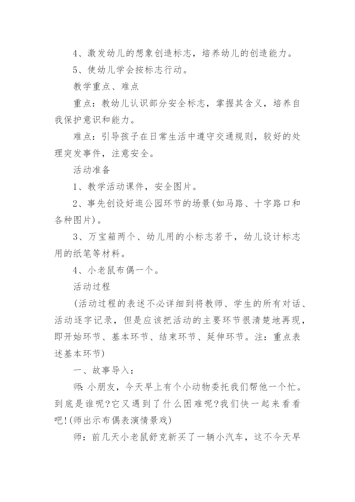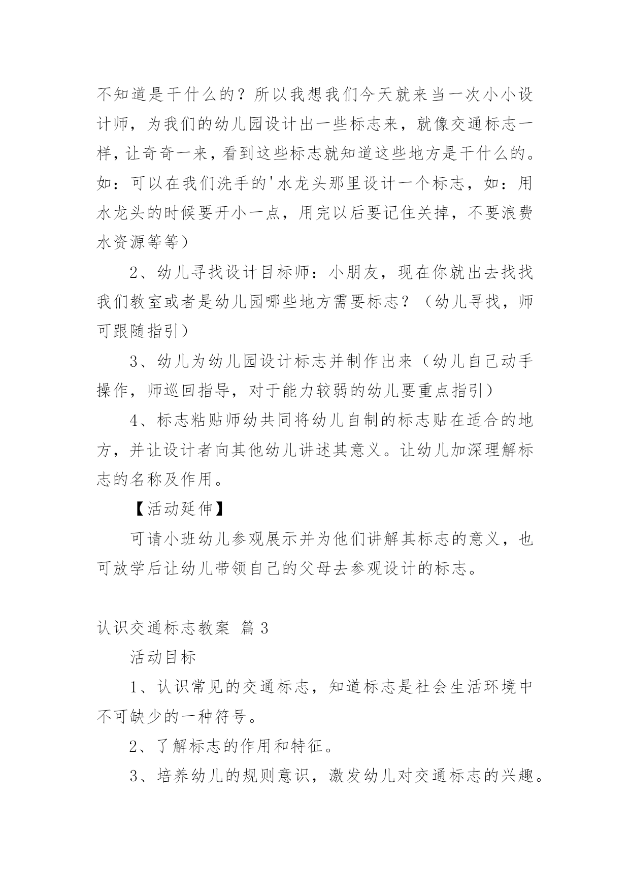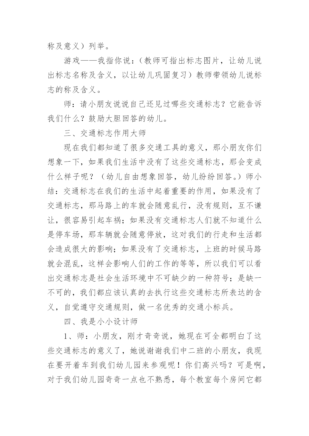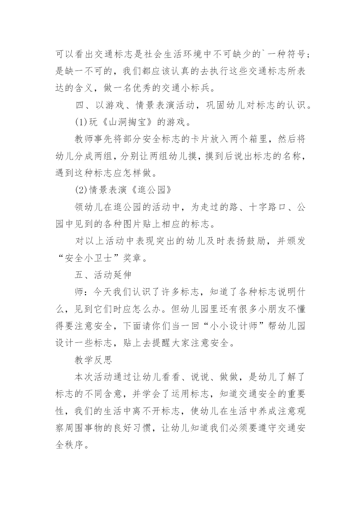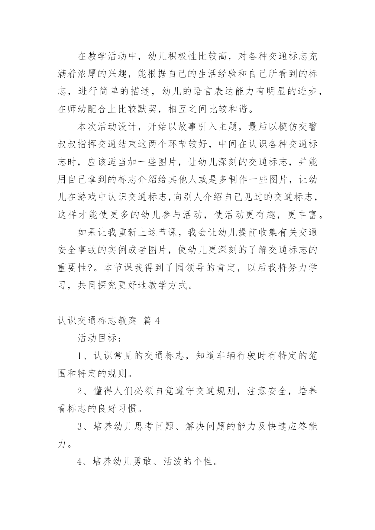 认识交通标志教案认识交通标志教案集锦五篇作为一名辛苦耕耘的教育工作者,常常要根据教学需要编写教案,教案是教学活动的依据,有着重要的地位。那么优秀的教案是什么样的呢?下面是小编精心整理的认识交通标志教案6篇,仅供参考,欢迎大家阅读。认识交通标志教案篇1活动目标:1、认识并了解一些常见的交通信号、交通标志和交通标线的作用。2、知道出行要按交通标志行走,要服从交警指挥,有初步的交通安全意识。3、学习收集整理材料的方法,通过交流分享主动获取新知识。4、培养幼儿勇敢、活泼的个性。5、鼓励幼儿大胆说话和积极应答。活动准备:课件(各种交通标志)活动过程:一、讲述交通事故案例,导入教师讲述交通事故:问你觉得为什么会发生车祸的呢?(幼儿交流讨论可能发生车祸的.原因。)师:发生车祸太可怕了。为了不让这样的事情再发生,交通管理部门设计了很多交通信号和交通标志,提醒大家要注意交通安全。二、认识常见的交通标志和信号1、分组交流。师:老师搜集了许多交通标志,现在请你们来看看这些标志,你在哪里看到过没有?大,考吧、幼,师,网表示什么意思?2、集体分享。师:小朋友介绍的交通标志到底对不对呢?我们一起来查一查师:小朋友说得都很好,看来小朋友已经认识不少交通标志和交通信号了,现在我再向你们介绍一下:交通标志一般分为几大类,常见的有指示标志、警示标志和警告标志,蓝底白线为指示标志3、认识标志。师:现在我想考考小朋友。看,我带来了一个交通标线,有没有小朋友认识?你在哪里见过这标线?师:(出示非机动车道和机动车道指示标志)谁认识这个标志?说说是什么意思。师:小朋友来上幼儿园,爸爸妈妈用电瓶车送你应该在哪里开?师:你们说得好。但现在很多电瓶车都开到机动车道上去了,这是非常危险的。小朋友要提醒爸爸妈妈遵守交通规则。三、了解简单的交通指挥手势师:在十字路口,交通安全离不开信号灯和交通标志,但更离不开交警叔叔的指挥,当信号灯出现问题或路口出现交通堵塞时,尤其需要交警叔叔现场指挥。师:小朋友们好!刚才你们认识了不少交通信号和标志,现在我来做一个动作,请你们猜一猜是什么意思。回答正确有奖品的哦!师:想不想学一学?现在请小朋友起立,跟我学交通指挥动作好吗?师:小朋友真聪明,大家不但自己要遵守交通规则,还要提醒身边的人遵守交通规则,做个义务宣传员,好吗?教学反思:作为一名中班的教师,班上的孩子年龄幼小,缺乏保护自己的能力,老师就要将工作做到最细微处。在今后的工作中我要多学习,积累,调整。我想,随着教育改革的深入,我们一定会有越来越多的好方法,那时,幼儿的安全问题不会再成为困扰我们的一个难题。认识交通标志教案篇2【活动目标】1、认识常见的交通标志,知道标志是社会生活环境中不可缺少的一种符号;了解标志的作用和特征。2、使幼儿学会按标志行动3、激发幼儿的想象创造标志,培养幼儿的创造能力。【活动准备】1、准备各种交通标志图片、书籍若干。2、准备自制标志所需要的各种材料。卡纸、铅笔、彩笔等。3、布娃娃一个。【活动过程】一、故事导入:师:小朋友,今天早上有个小朋友委托我们帮他一个忙。到底是谁呢?她又遇到了什么困难呢?我们快一起来看看吧!(师出示布偶表演情景戏)师:前几天布娃娃奇奇新买了一辆小汽车,这不今天早上她就开着她的小车来我们广饶游玩,但是一进城,她发现我们的马路上到处有着很多她不认识的标志,这些标志她从来没有看见过,也不知道是什么意思,所以她不敢开车进城,只好来请教我们小朋友来帮忙了!二、认识交通标志师瞧!布娃娃奇奇把这些交通标志都给画了下来,我们快一起来看看它们都代表着什么意思吧!(师出示各种交通标志的图片,请幼儿自由发表自己的意见,试着说出这些分别是什么标志,分别代表着什么意思)幼儿举手回答:红绿灯、禁止停车、禁止行人通行、禁止非机动车辆通行等。师:刚才小朋友都说出这些标志的意义,那到底说的对不对呢?老师来告诉你吧!(师详细讲解每个交通标志的名称及意义)列举。游戏——我指你说:(教师可指出标志图片,让幼儿说出标志名称及含义,以让幼儿巩固复习)教师带领幼儿说标志的称及含义。师:请小朋友说说自己还见过哪些交通标志?它能告诉我们什么?鼓励大胆回答的幼儿。三、交通标志作用大师现在我们都知道了很多交通工具的意义,那小朋友你们想象一下,如果我们生活中没有了这些交通标志,那会变成什么样子呢?(幼儿自由想象回答,幼儿纷纷回答。)师小结:交通标志在我们的生活中起着重要的作用,如果没有了交通标志,那马路上的车就会随意乱行,没有规则,互不谦让,很容易引起车祸;如果没有交通标志人们就不知道什么是停车场,那车辆就会随意停放,这对我们的行走和生活都会造成很大的影响;如果没有了交通标志,上班的时候马路就会混乱,这样会影响人们的工作的等等,所以我们可以看出交通标志是社会生活环境中不可缺少的一种符号;是缺一不可的,