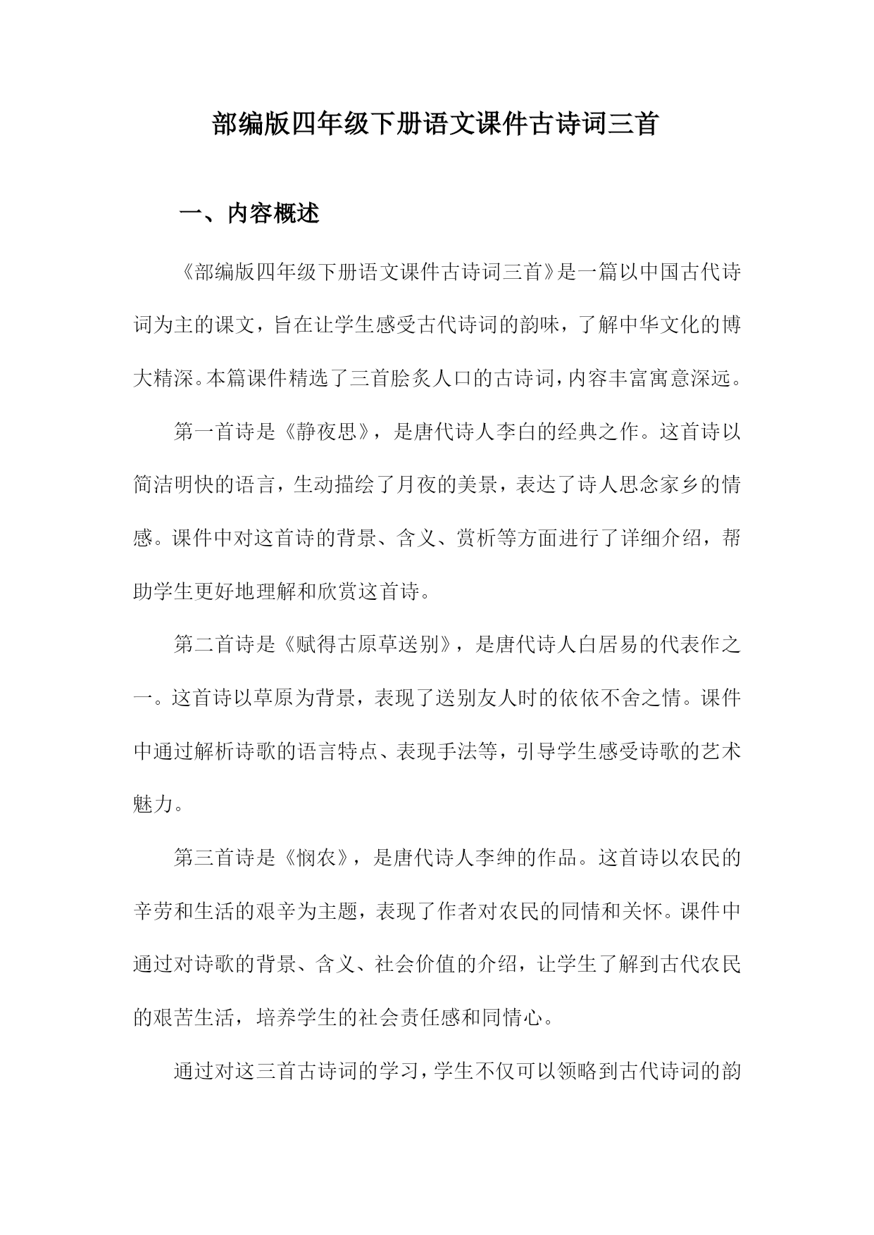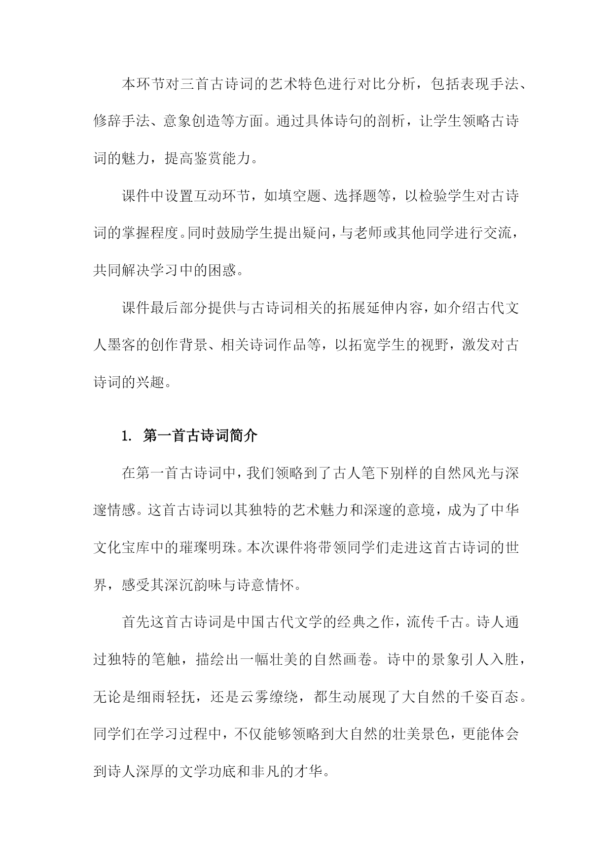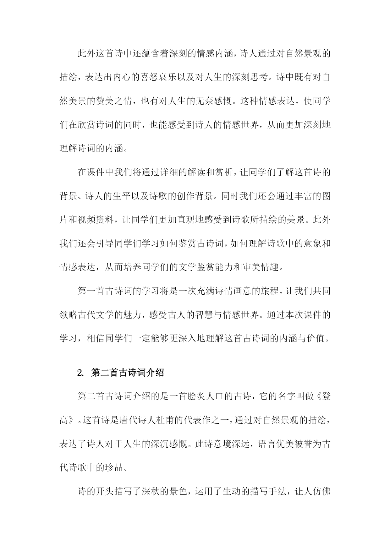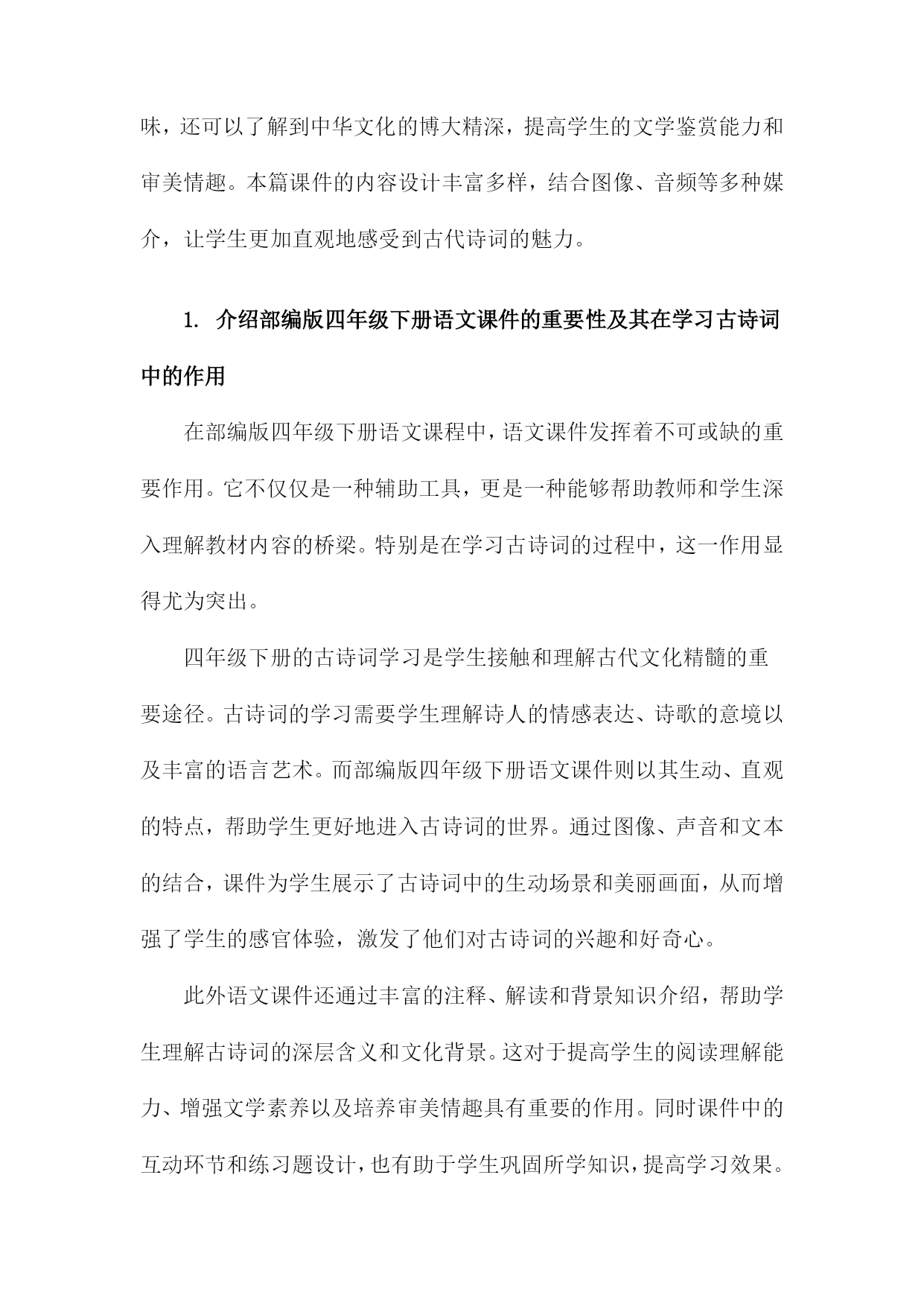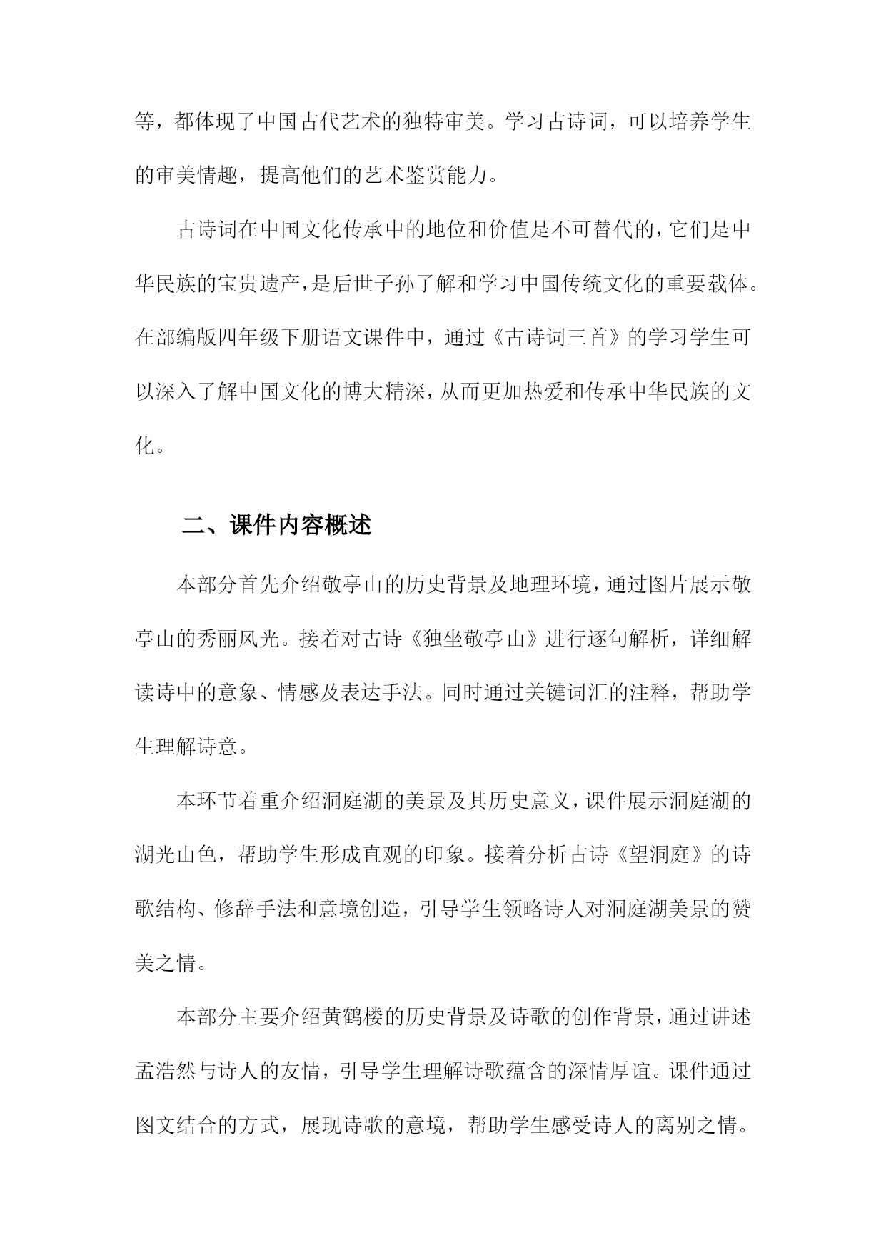部编版四年级下册语文课件古诗词三首一、内容概述《部编版四年级下册语文课件古诗词三首》是一篇以中国古代诗词为主的课文,旨在让学生感受古代诗词的韵味,了解中华文化的博大精深。本篇课件精选了三首脍炙人口的古诗词,内容丰富寓意深远。第一首诗是《静夜思》,是唐代诗人李白的经典之作。这首诗以简洁明快的语言,生动描绘了月夜的美景,表达了诗人思念家乡的情感。课件中对这首诗的背景、含义、赏析等方面进行了详细介绍,帮助学生更好地理解和欣赏这首诗。第二首诗是《赋得古原草送别》,是唐代诗人白居易的代表作之一。这首诗以草原为背景,表现了送别友人时的依依不舍之情。课件中通过解析诗歌的语言特点、表现手法等,引导学生感受诗歌的艺术魅力。第三首诗是《悯农》,是唐代诗人李绅的作品。这首诗以农民的辛劳和生活的艰辛为主题,表现了作者对农民的同情和关怀。课件中通过对诗歌的背景、含义、社会价值的介绍,让学生了解到古代农民的艰苦生活,培养学生的社会责任感和同情心。通过对这三首古诗词的学习,学生不仅可以领略到古代诗词的韵味,还可以了解到中华文化的博大精深,提高学生的文学鉴赏能力和审美情趣。本篇课件的内容设计丰富多样,结合图像、音频等多种媒介,让学生更加直观地感受到古代诗词的魅力。1.介绍部编版四年级下册语文课件的重要性及其在学习古诗词中的作用在部编版四年级下册语文课程中,语文课件发挥着不可或缺的重要作用。它不仅仅是一种辅助工具,更是一种能够帮助教师和学生深入理解教材内容的桥梁。特别是在学习古诗词的过程中,这一作用显得尤为突出。四年级下册的古诗词学习是学生接触和理解古代文化精髓的重要途径。古诗词的学习需要学生理解诗人的情感表达、诗歌的意境以及丰富的语言艺术。而部编版四年级下册语文课件则以其生动、直观的特点,帮助学生更好地进入古诗词的世界。通过图像、声音和文本的结合,课件为学生展示了古诗词中的生动场景和美丽画面,从而增强了学生的感官体验,激发了他们对古诗词的兴趣和好奇心。此外语文课件还通过丰富的注释、解读和背景知识介绍,帮助学生理解古诗词的深层含义和文化背景。这对于提高学生的阅读理解能力、增强文学素养以及培养审美情趣具有重要的作用。同时课件中的互动环节和练习题设计,也有助于学生巩固所学知识,提高学习效果。部编版四年级下册语文课件在学生学习古诗词的过程中起到了关键作用。它不仅增强了学生的学习兴趣和体验,还帮助他们深入理解古诗词的内涵和文化背景,从而提高了他们的文学素养和审美情趣。因此充分利用好这一课件资源,对于四年级学生的语文学习具有非常重要的意义。2.阐述古诗词在中国文化传承中的地位和价值在中国五千年文明史的长河中,古诗词无疑是一颗璀璨的明珠,其在中国文化传承中的地位和价值是不可估量的。首先古诗词是中国语言文字的精华,是汉语表达艺术的典范。它们凝聚了历代文人墨客的才情与智慧,展现了中国文化的深厚底蕴。在部编版四年级下册语文课件《古诗词三首》中,每一首古诗词都是古代文学的经典之作,体现了中国文化的独特魅力。古诗词的价值不仅在于其艺术成就,更在于其蕴含的思想内涵和文化精神。古诗词中蕴含的爱国情感、人生哲理、道德观念、自然观念等,都是中华民族传统文化的核心组成部分。这些精神财富,通过古诗词的传承,得以在后世子孙中延续。对于四年级的学生来说,学习古诗词,不仅可以提高文学素养,更能了解和继承中华民族的文化传统。此外古诗词还具有极高的审美价值,古诗词的音韵、意境、意象等,都体现了中国古代艺术的独特审美。学习古诗词,可以培养学生的审美情趣,提高他们的艺术鉴赏能力。古诗词在中国文化传承中的地位和价值是不可替代的,它们是中华民族的宝贵遗产,是后世子孙了解和学习中国传统文化的重要载体。在部编版四年级下册语文课件中,通过《古诗词三首》的学习学生可以深入了解中国文化的博大精深,从而更加热爱和传承中华民族的文化。二、课件内容概述本部分首先介绍敬亭山的历史背景及地理环境,通过图片展示敬亭山的秀丽风光。接着对古诗《独坐敬亭山》进行逐句解析,详细解读诗中的意象、情感及表达手法。同时通过关键词汇的注释,帮助学生理解诗意。本环节着重介绍洞庭湖的美景及其历史意义,课件展示洞庭湖的湖光山色,帮助学生形成直观的印象。接着分析古诗《望洞庭》的诗歌结构、修辞手法和意境创造,引导学生领略诗人对洞庭湖美景的赞美之情。本部分主要介绍黄鹤楼的历史背景及诗歌的创作背景,通过讲述孟浩然与诗人的友情,引导学生理解诗歌蕴含的深情厚谊。课件通过图文结合的方式,展现诗歌的意境,帮助学生感受诗人的离别之情。本环节对三首古诗词的艺术特色进行对比分析,包括表现手法、修辞手法、意象创造等方面。通过具体诗句的剖析,让学生领略古诗词的魅力,提高鉴赏能力。课件中设置互动环节,如填空题、选择题等,以检验学生对古诗词