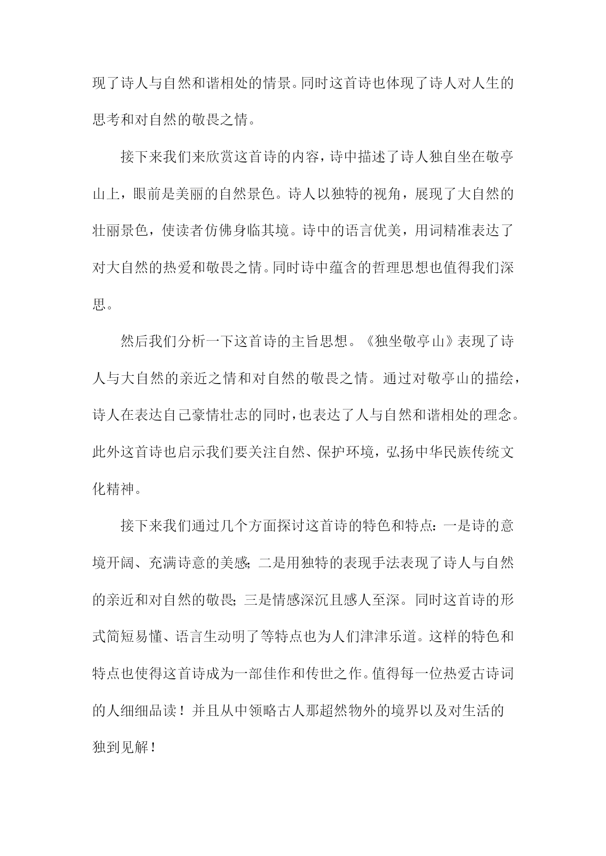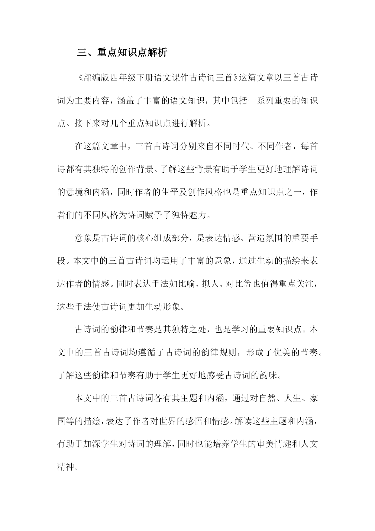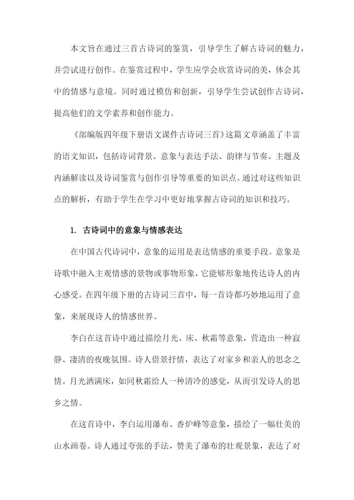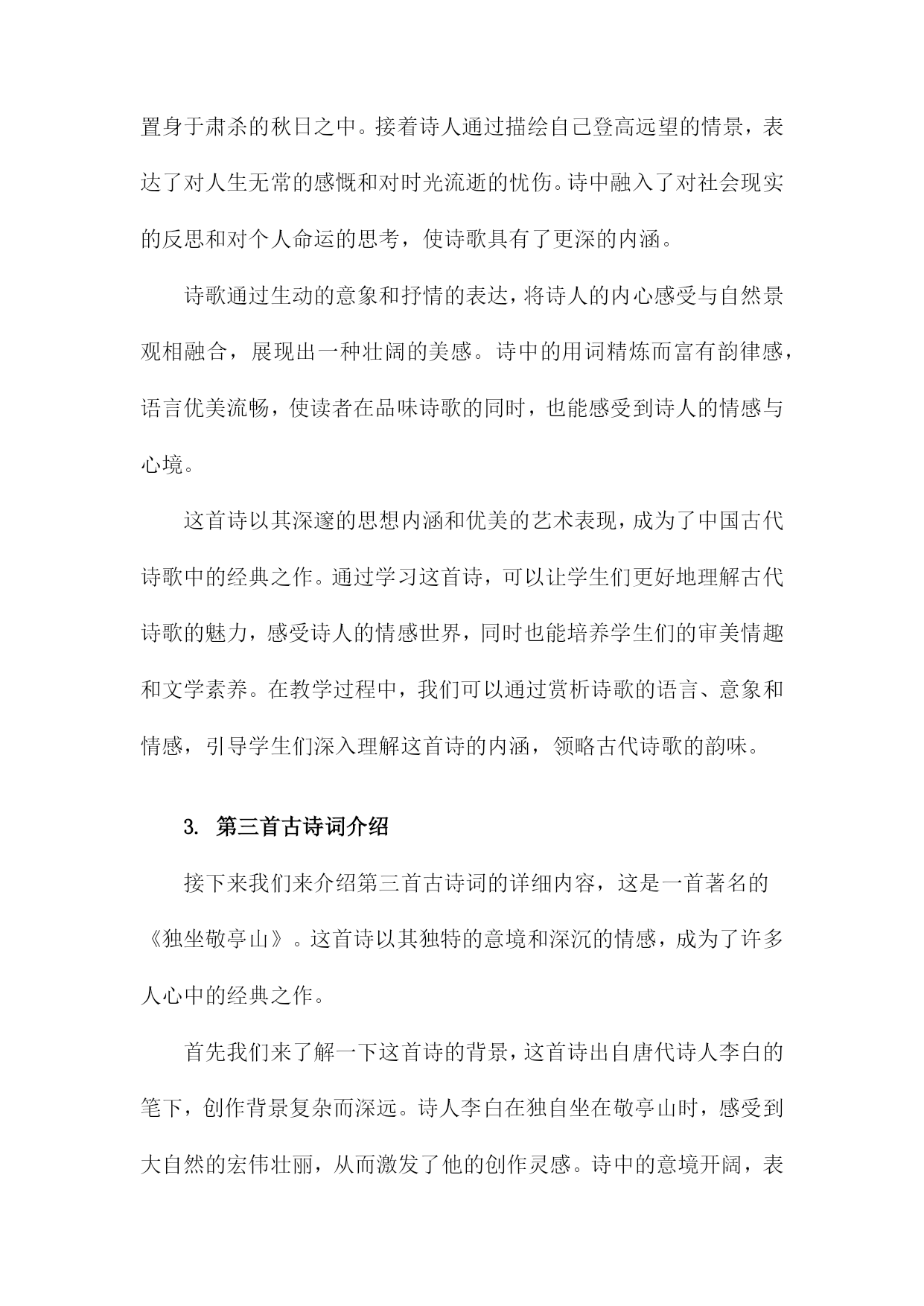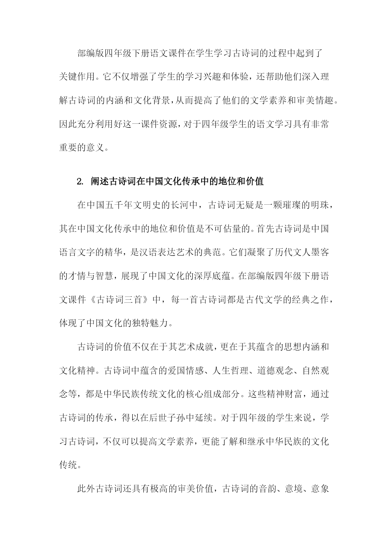 部编版四年级下册语文课件古诗词三首一、内容概述《部编版四年级下册语文课件古诗词三首》是一篇以中国古代诗词为主的课文,旨在让学生感受古代诗词的韵味,了解中华文化的博大精深。本篇课件精选了三首脍炙人口的古诗词,内容丰富寓意深远。第一首诗是《静夜思》,是唐代诗人李白的经典之作。这首诗以简洁明快的语言,生动描绘了月夜的美景,表达了诗人思念家乡的情感。课件中对这首诗的背景、含义、赏析等方面进行了详细介绍,帮助学生更好地理解和欣赏这首诗。第二首诗是《赋得古原草送别》,是唐代诗人白居易的代表作之一。这首诗以草原为背景,表现了送别友人时的依依不舍之情。课件中通过解析诗歌的语言特点、表现手法等,引导学生感受诗歌的艺术魅力。第三首诗是《悯农》,是唐代诗人李绅的作品。这首诗以农民的辛劳和生活的艰辛为主题,表现了作者对农民的同情和关怀。课件中通过对诗歌的背景、含义、社会价值的介绍,让学生了解到古代农民的艰苦生活,培养学生的社会责任感和同情心。通过对这三首古诗词的学习,学生不仅可以领略到古代诗词的韵味,还可以了解到中华文化的博大精深,提高学生的文学鉴赏能力和审美情趣。本篇课件的内容设计丰富多样,结合图像、音频等多种媒介,让学生更加直观地感受到古代诗词的魅力。1.介绍部编版四年级下册语文课件的重要性及其在学习古诗词中的作用在部编版四年级下册语文课程中,语文课件发挥着不可或缺的重要作用。它不仅仅是一种辅助工具,更是一种能够帮助教师和学生深入理解教材内容的桥梁。特别是在学习古诗词的过程中,这一作用显得尤为突出。四年级下册的古诗词学习是学生接触和理解古代文化精髓的重要途径。古诗词的学习需要学生理解诗人的情感表达、诗歌的意境以及丰富的语言艺术。而部编版四年级下册语文课件则以其生动、直观的特点,帮助学生更好地进入古诗词的世界。通过图像、声音和文本的结合,课件为学生展示了古诗词中的生动场景和美丽画面,从而增强了学生的感官体验,激发了他们对古诗词的兴趣和好奇心。此外语文课件还通过丰富的注释、解读和背景知识介绍,帮助学生理解古诗词的深层含义和文化背景。这对于提高学生的阅读理解能力、增强文学素养以及培养审美情趣具有重要的作用。同时课件中的互动环节和练习题设计,也有助于学生巩固所学知识,提高学习效果。部编版四年级下册语文课件在学生学习古诗词的过程中起到了关键作用。它不仅增强了学生的学习兴趣和体验,还帮助他们深入理解古诗词的内涵和文化背景,从而提高了他们的文学素养和审美情趣。因此充分利用好这一课件资源,对于四年级学生的语文学习具有非常重要的意义。2.阐述古诗词在中国文化传承中的地位和价值在中国五千年文明史的长河中,古诗词无疑是一颗璀璨的明珠,其在中国文化传承中的地位和价值是不可估量的。首先古诗词是中国语言文字的精华,是汉语表达艺术的典范。它们凝聚了历代文人墨客的才情与智慧,展现了中国文化的深厚底蕴。在部编版四年级下册语文课件《古诗词三首》中,每一首古诗词都是古代文学的经典之作,体现了中国文化的独特魅力。古诗词的价值不仅在于其艺术成就,更在于其蕴含的思想内涵和文化精神。古诗词中蕴含的爱国情感、人生哲理、道德观念、自然观念等,都是中华民族传统文化的核心组成部分。这些精神财富,通过古诗词的传承,得以在后世子孙中延续。对于四年级的学生来说,学习古诗词,不仅可以提高文学素养,更能了解和继承中华民族的文化传统。此外古诗词还具有极高的审美价值,古诗词的音韵、意境、意象等,都体现了中国古代艺术的独特审美。学习古诗词,可以培养学生的审美情趣,提高他们的艺术鉴赏能力。古诗词在中国文化传承中的地位和价值是不可替代的,它们是中华民族的宝贵遗产,是后世子孙了解和学习中国传统文化的重要载体。在部编版四年级下册语文课件中,通过《古诗词三首》的学习学生可以深入了解中国文化的博大精深,从而更加热爱和传承中华民族的文化。二、课件内容概述本部分首先介绍敬亭山的历史背景及地理环境,通过图片展示敬亭山的秀丽风光。接着对古诗《独坐敬亭山》进行逐句解析,详细解读诗中的意象、情感及表达手法。同时通过关键词汇的注释,帮助学生理解诗意。本环节着重介绍洞庭湖的美景及其历史意义,课件展示洞庭湖的湖光山色,帮助学生形成直观的印象。接着分析古诗《望洞庭》的诗歌结构、修辞手法和意境创造,引导学生领略诗人对洞庭湖美景的赞美之情。本部分主要介绍黄鹤楼的历史背景及诗歌的创作背景,通过讲述孟浩然与诗人的友情,引导学生理解诗歌蕴含的深情厚谊。课件通过图文结合的方式,展现诗歌的意境,帮助学生感受诗人的离别之情。本环节对三首古诗词的艺术特色进行对比分析,包括表现手法、修辞手法、意象创造等方面。通过具体诗句的剖析,让学生领略古诗词的魅力,提高鉴赏能力。课件中设置互动环节,如填空题、选择题等,以检验学生对古诗词