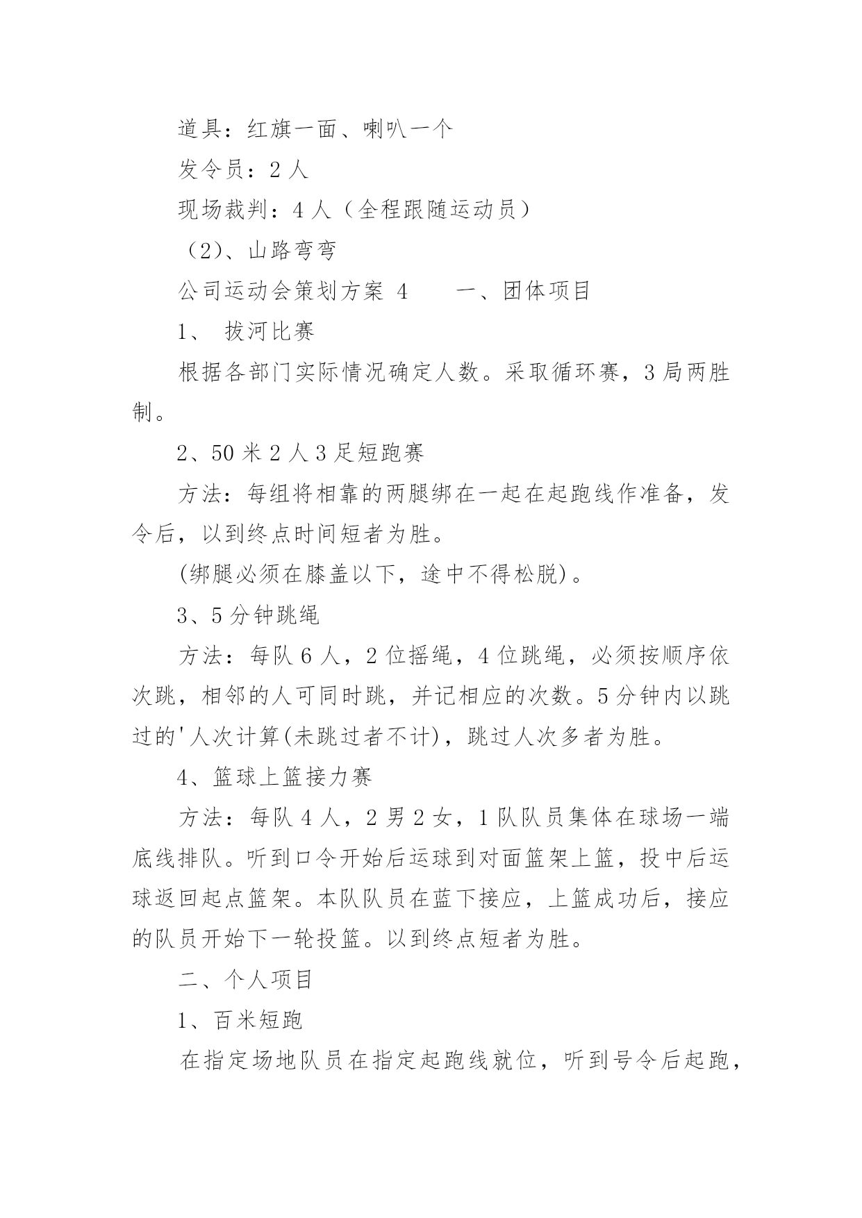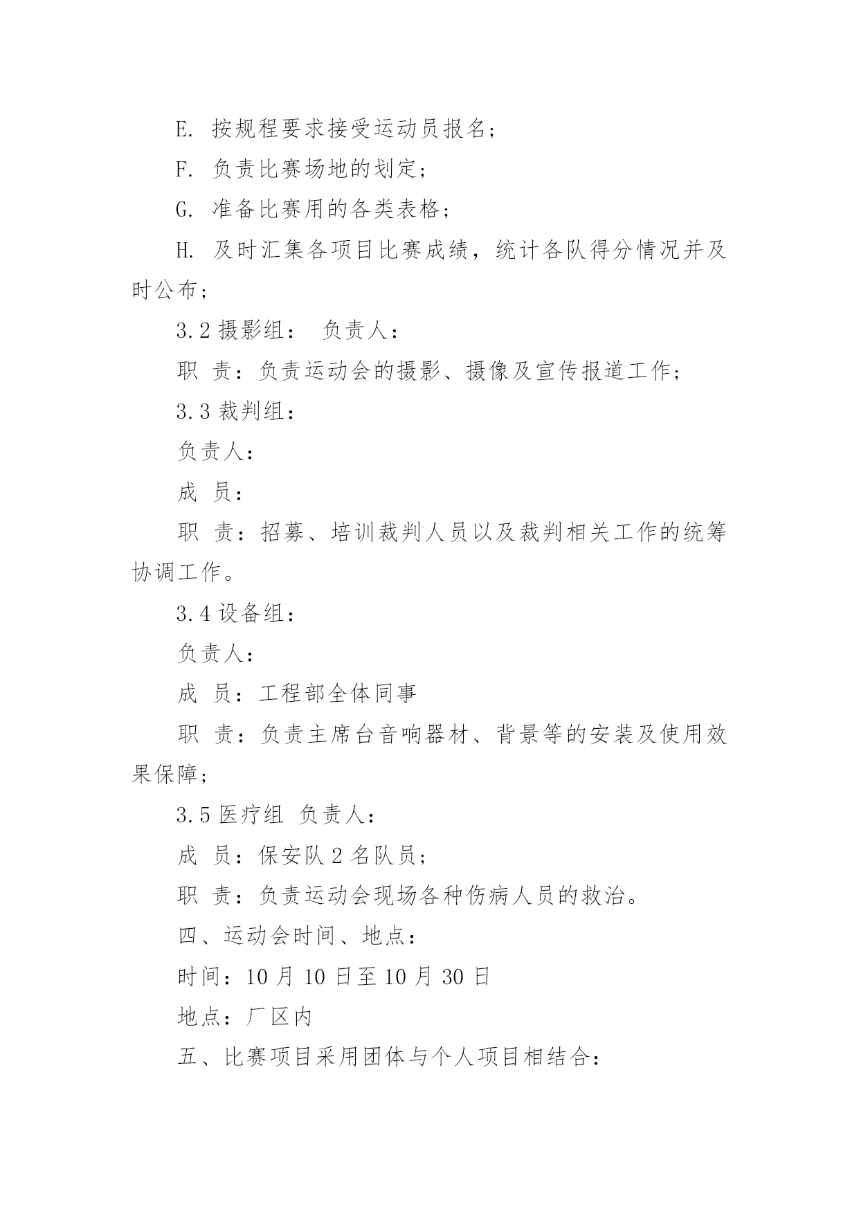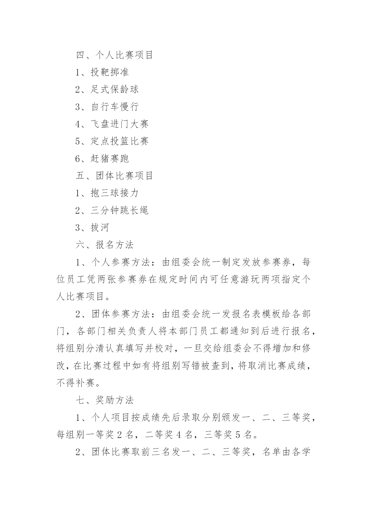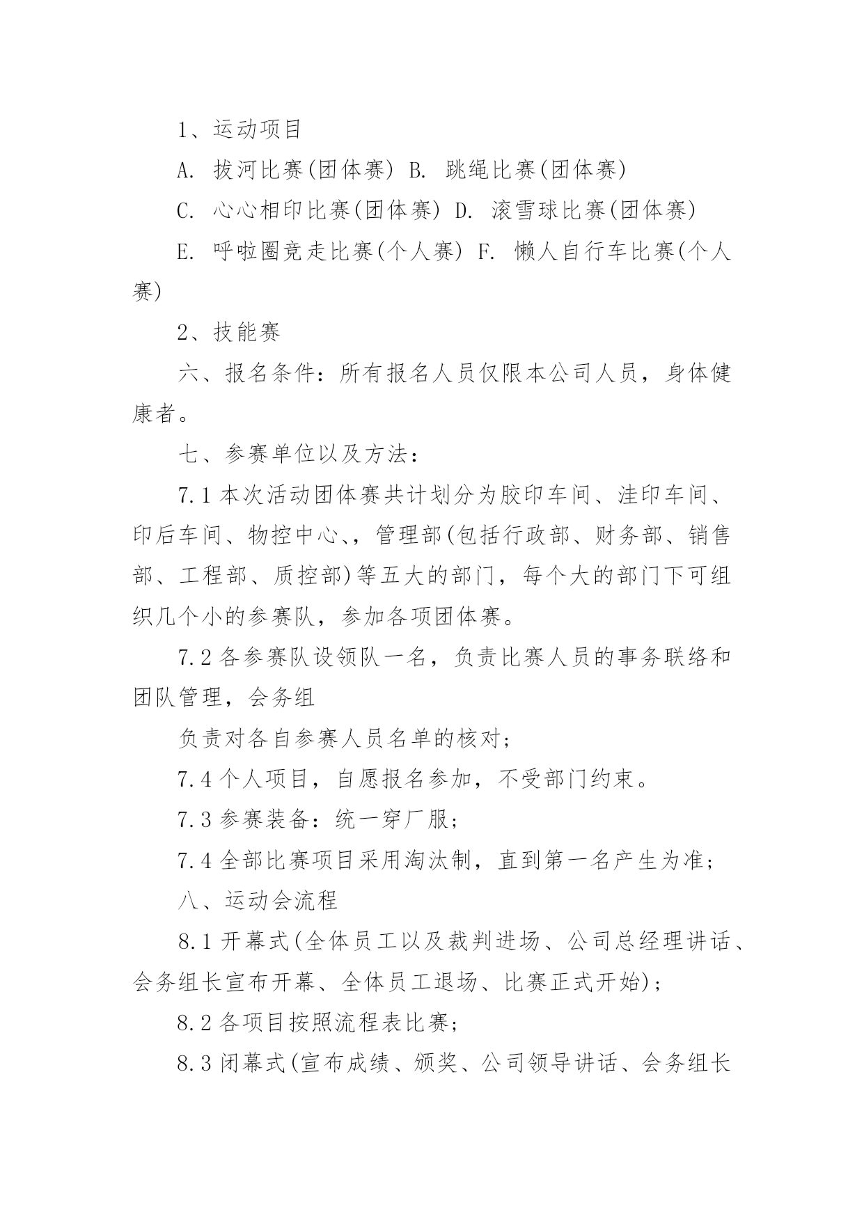 公司运动会策划方案公司运动会策划方案(精选16篇)为有力保证事情或工作开展的水平质量,通常需要提前准备好一份方案,方案指的是为某一次行动所制定的计划类文书。那么我们该怎么去写方案呢?下面是小编为大家整理的公司运动会策划方案,仅供参考,大家一起来看看吧。公司运动会策划方案1一、运动会宗旨:为了加强企业文化建设,丰富员工体育文化生活,提高公司全体员工的凝聚力,向心力,团队协作力,倡导“友谊第一、比赛第二”的体育运动精神。二、运动会主题:我运动、我快乐、我成长。三、组织机构3.组委会机构及成员名单3.1事务组:负责人:成员:职责:A.制定运动会各项工作流程;B.编制经费预算;C.做好各类物资的准备工作(按计划购置体育运动用品器材、奖品、纪念品等);D.负责协调各部门的`工作;E.按规程要求接受运动员报名;F.负责比赛场地的划定;G.准备比赛用的各类表格;H.及时汇集各项目比赛成绩,统计各队得分情况并及时公布;3.2摄影组:负责人:职责:负责运动会的摄影、摄像及宣传报道工作;3.3裁判组:负责人:成员:职责:招募、培训裁判人员以及裁判相关工作的统筹协调工作。3.4设备组:负责人:成员:工程部全体同事职责:负责主席台音响器材、背景等的安装及使用效果保障;3.5医疗组负责人:成员:保安队2名队员;职责:负责运动会现场各种伤病人员的救治。四、运动会时间、地点:时间:10月10日至10月30日地点:厂区内五、比赛项目采用团体与个人项目相结合:1、运动项目A.拔河比赛(团体赛)B.跳绳比赛(团体赛)C.心心相印比赛(团体赛)D.滚雪球比赛(团体赛)E.呼啦圈竞走比赛(个人赛)F.懒人自行车比赛(个人赛)2、技能赛六、报名条件:所有报名人员仅限本公司人员,身体健康者。七、参赛单位以及方法:7.1本次活动团体赛共计划分为胶印车间、洼印车间、印后车间、物控中心、,管理部(包括行政部、财务部、销售部、工程部、质控部)等五大的部门,每个大的部门下可组织几个小的参赛队,参加各项团体赛。7.2各参赛队设领队一名,负责比赛人员的事务联络和团队管理,会务组负责对各自参赛人员名单的核对;7.4个人项目,自愿报名参加,不受部门约束。7.3参赛装备:统一穿厂服;7.4全部比赛项目采用淘汰制,直到第一名产生为准;八、运动会流程8.1开幕式(全体员工以及裁判进场、公司总经理讲话、会务组长宣布开幕、全体员工退场、比赛正式开始);8.2各项目按照流程表比赛;8.3闭幕式(宣布成绩、颁奖、公司领导讲话、会务组长宣布运动会结束)。九、奖项设置9.1运动员奖项:各项运动奖励前三名,颁发奖杯以及奖品或奖金;9.2非运动员奖项:设最具激情参与奖、最佳组织奖各一名,颁发锦旗或奖品。十、比赛规则:比赛规则另见通知;公司运动会策划方案2为了迎接xx会,丰富我公司员职工业余文化生活,树立“健康第一”理念,经公司研究并报领导批准,决定召开第x届教员工趣味运动会,本届运动会以趣味性为主,提倡全员参与。现将方案公布如下:一、比赛时间20xx年xx月xx号(星期三)下午13:30——17:20单项比赛时间:13:30——15:50;团体比赛16:00开始二、比赛地点xx区中学田径场三、组别分布如下1、个人项目分组(分男女组计分):男:中青年组(50岁以下含50岁)女:中青年组(50岁以下含50岁)老年组(50岁以上)老年组(50岁以上)2、团体项目分组:人事组,会计组,行政组四、个人比赛项目1、投靶掷准2、足式保龄球3、自行车慢行4、飞盘进门大赛5、定点投篮比赛6、赶猪赛跑五、团体比赛项目1、抱三球接力2、三分钟跳长绳3、拔河六、报名方法1、个人参赛方法:由组委会统一制定发放参赛券,每位员工凭两张参赛券在规定时间内可任意游玩两项指定个人比赛项目。2、团体参赛方法:由组委会统一发报名表模板给各部门,各部门相关负责人将本部门员工都通知到后进行报名,将组别分清认真填写并校对,一旦交给组委会不得增加和修改,在比赛过程中如有将组别写错被查到,将取消比赛成绩,不得补赛。七、奖励方法1、个人项目按成绩先后录取分别颁发一、二、三等奖,每组别一等奖2名,二等奖4名,三等奖5名。2、团体比赛取前三名发一、二、三等奖,名单由各学部负责人提供。3、凡报名参赛者获等级奖的,可重复领取;未获等级奖的,均发纪念奖一份。八、备注1、所有员工必须在指定时间和地点比赛,迟到作弃权处理。2、参赛券转让给他人或代赛者取消个人成绩,只发纪念奖。3、所有的.裁判员由组委会统一安排执行,裁判员要本着公平、公正、公开的态度去工作,让教职工在愉悦、和谐的氛围中参与比赛。4、本竞赛规程最终解释权归大会组委会。公司运动会策划方案3策划者:第五小组目录一、活动背景二、活动意义三、活动名称四、活动主题五、活动简介(一)、活动时间(二)、活动地点(三)、参