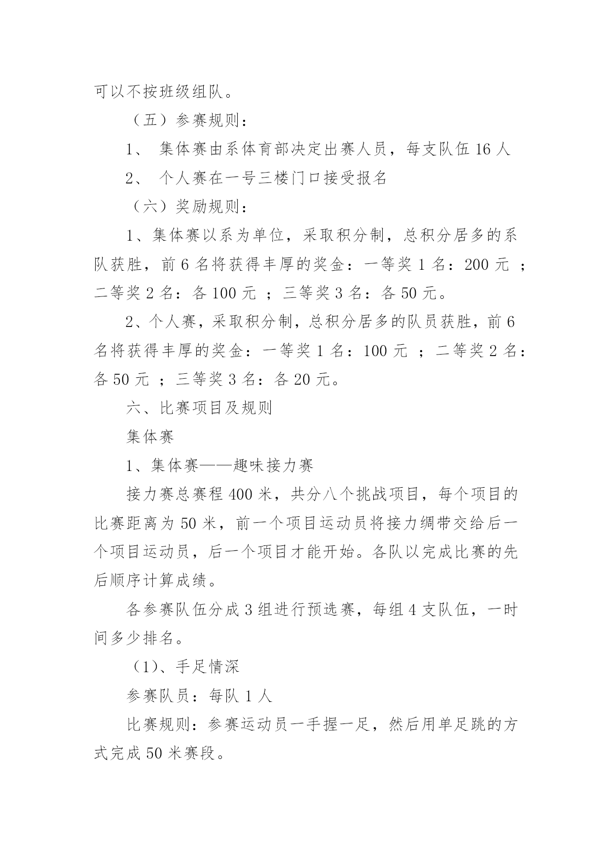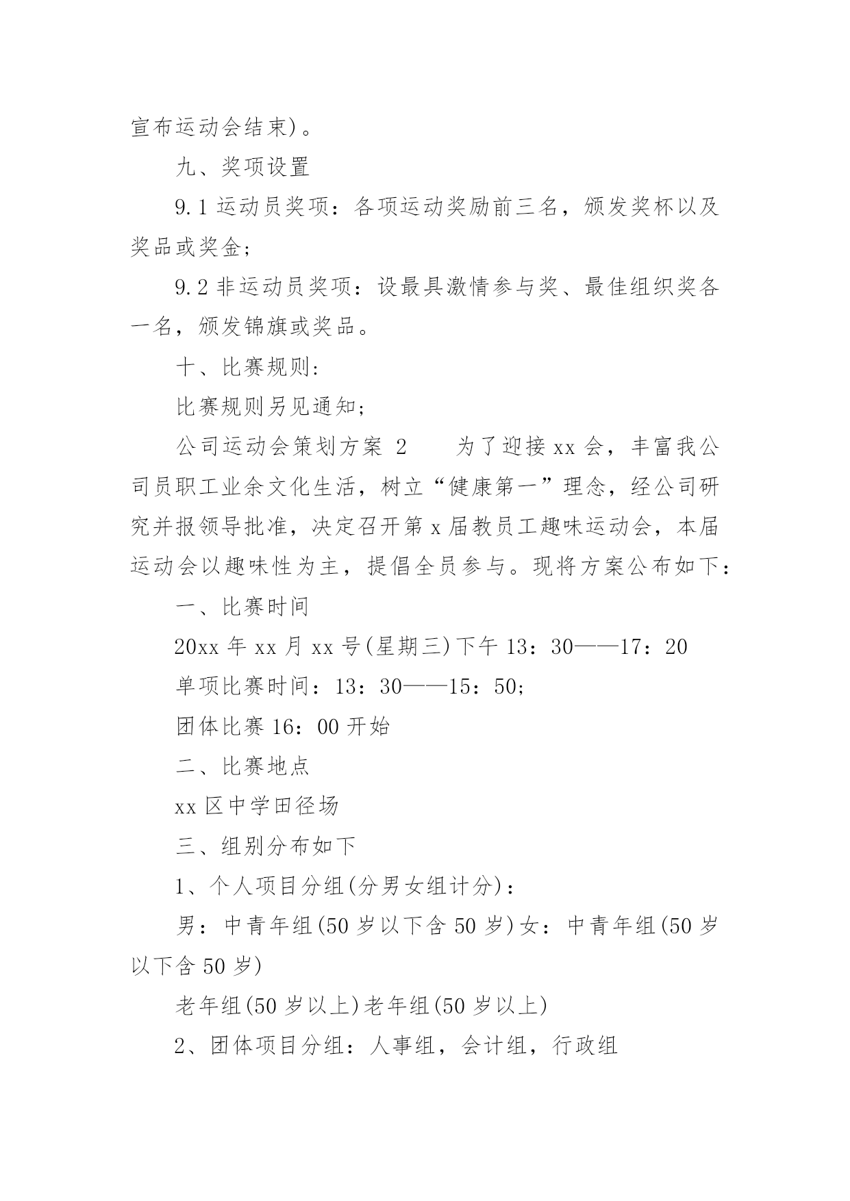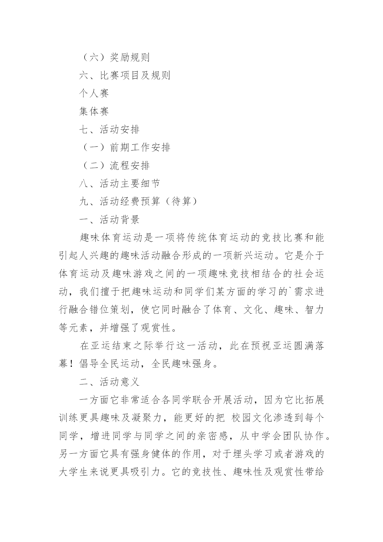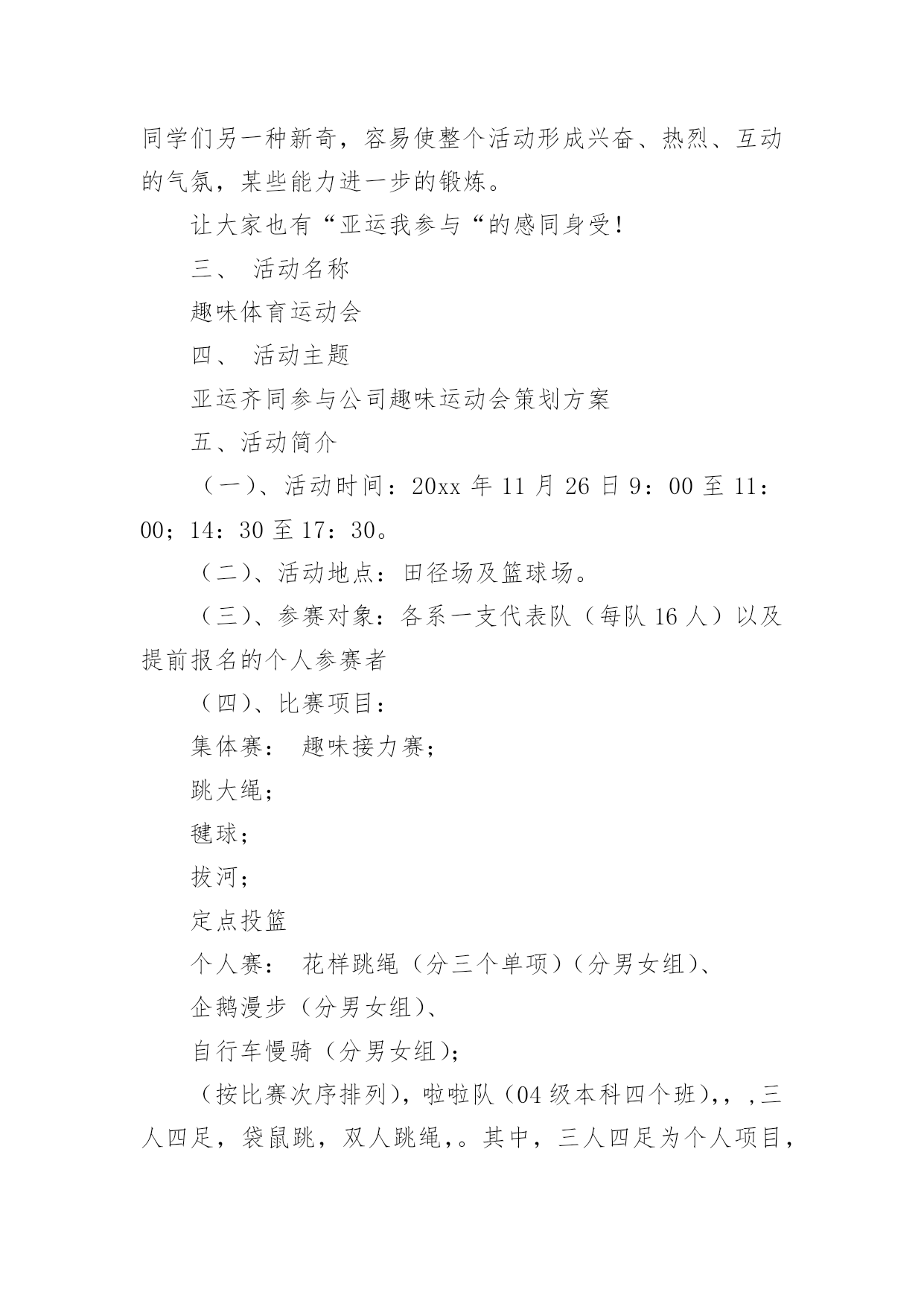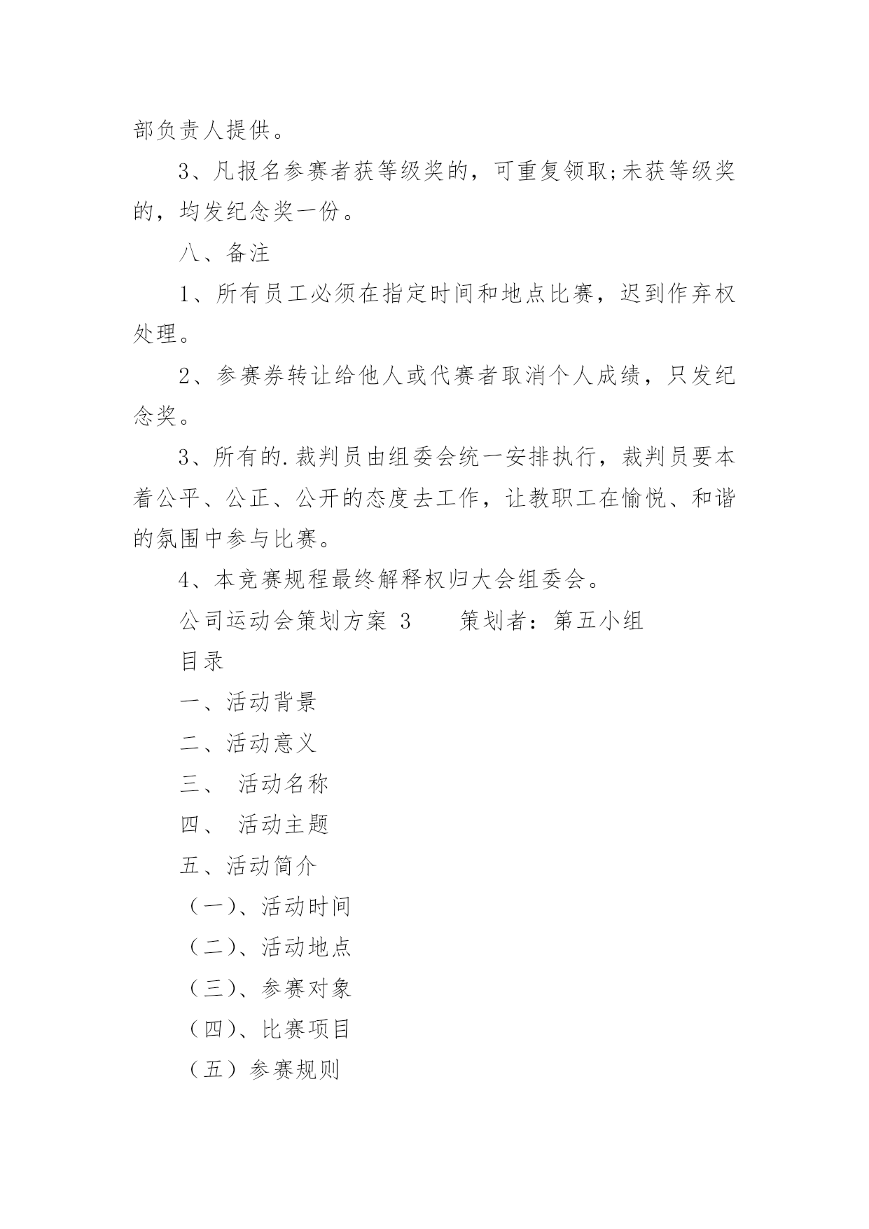 公司运动会策划方案公司运动会策划方案(精选16篇)为有力保证事情或工作开展的水平质量,通常需要提前准备好一份方案,方案指的是为某一次行动所制定的计划类文书。那么我们该怎么去写方案呢?下面是小编为大家整理的公司运动会策划方案,仅供参考,大家一起来看看吧。公司运动会策划方案1一、运动会宗旨:为了加强企业文化建设,丰富员工体育文化生活,提高公司全体员工的凝聚力,向心力,团队协作力,倡导“友谊第一、比赛第二”的体育运动精神。二、运动会主题:我运动、我快乐、我成长。三、组织机构3.组委会机构及成员名单3.1事务组:负责人:成员:职责:A.制定运动会各项工作流程;B.编制经费预算;C.做好各类物资的准备工作(按计划购置体育运动用品器材、奖品、纪念品等);D.负责协调各部门的`工作;E.按规程要求接受运动员报名;F.负责比赛场地的划定;G.准备比赛用的各类表格;H.及时汇集各项目比赛成绩,统计各队得分情况并及时公布;3.2摄影组:负责人:职责:负责运动会的摄影、摄像及宣传报道工作;3.3裁判组:负责人:成员:职责:招募、培训裁判人员以及裁判相关工作的统筹协调工作。3.4设备组:负责人:成员:工程部全体同事职责:负责主席台音响器材、背景等的安装及使用效果保障;3.5医疗组负责人:成员:保安队2名队员;职责:负责运动会现场各种伤病人员的救治。四、运动会时间、地点:时间:10月10日至10月30日地点:厂区内五、比赛项目采用团体与个人项目相结合:1、运动项目A.拔河比赛(团体赛)B.跳绳比赛(团体赛)C.心心相印比赛(团体赛)D.滚雪球比赛(团体赛)E.呼啦圈竞走比赛(个人赛)F.懒人自行车比赛(个人赛)2、技能赛六、报名条件:所有报名人员仅限本公司人员,身体健康者。七、参赛单位以及方法:7.1本次活动团体赛共计划分为胶印车间、洼印车间、印后车间、物控中心、,管理部(包括行政部、财务部、销售部、工程部、质控部)等五大的部门,每个大的部门下可组织几个小的参赛队,参加各项团体赛。7.2各参赛队设领队一名,负责比赛人员的事务联络和团队管理,会务组负责对各自参赛人员名单的核对;7.4个人项目,自愿报名参加,不受部门约束。7.3参赛装备:统一穿厂服;7.4全部比赛项目采用淘汰制,直到第一名产生为准;八、运动会流程8.1开幕式(全体员工以及裁判进场、公司总经理讲话、会务组长宣布开幕、全体员工退场、比赛正式开始);8.2各项目按照流程表比赛;8.3闭幕式(宣布成绩、颁奖、公司领导讲话、会务组长宣布运动会结束)。九、奖项设置9.1运动员奖项:各项运动奖励前三名,颁发奖杯以及奖品或奖金;9.2非运动员奖项:设最具激情参与奖、最佳组织奖各一名,颁发锦旗或奖品。十、比赛规则:比赛规则另见通知;公司运动会策划方案2为了迎接xx会,丰富我公司员职工业余文化生活,树立“健康第一”理念,经公司研究并报领导批准,决定召开第x届教员工趣味运动会,本届运动会以趣味性为主,提倡全员参与。现将方案公布如下:一、比赛时间20xx年xx月xx号(星期三)下午13:30——17:20单项比赛时间:13:30——15:50;团体比赛16:00开始二、比赛地点xx区中学田径场三、组别分布如下1、个人项目分组(分男女组计分):男:中青年组(50岁以下含50岁)女:中青年组(50岁以下含50岁)老年组(50岁以上)老年组(50岁以上)2、团体项目分组:人事组,会计组,行政组四、个人比赛项目1、投靶掷准2、足式保龄球3、自行车慢行4、飞盘进门大赛5、定点投篮比赛6、赶猪赛跑五、团体比赛项目1、抱三球接力2、三分钟跳长绳3、拔河六、报名方法1、个人参赛方法:由组委会统一制定发放参赛券,每位员工凭两张参赛券在规定时间内可任意游玩两项指定个人比赛项目。2、团体参赛方法:由组委会统一发报名表模板给各部门,各部门相关负责人将本部门员工都通知到后进行报名,将组别分清认真填写并校对,一旦交给组委会不得增加和修改,在比赛过程中如有将组别写错被查到,将取消比赛成绩,不得补赛。七、奖励方法1、个人项目按成绩先后录取分别颁发一、二、三等奖,每组别一等奖2名,二等奖4名,三等奖5名。2、团体比赛取前三名发一、二、三等奖,名单由各学部负责人提供。3、凡报名参赛者获等级奖的,可重复领取;未获等级奖的,均发纪念奖一份。八、备注1、所有员工必须在指定时间和地点比赛,迟到作弃权处理。2、参赛券转让给他人或代赛者取消个人成绩,只发纪念奖。3、所有的.裁判员由组委会统一安排执行,裁判员要本着公平、公正、公开的态度去工作,让教职工在愉悦、和谐的氛围中参与比赛。4、本竞赛规程最终解释权归大会组委会。公司运动会策划方案3策划者:第五小组目录一、活动背景二、活动意义三、活动名称四、活动主题五、活动简介(一)、活动时间(二)、活动地点(三)、参