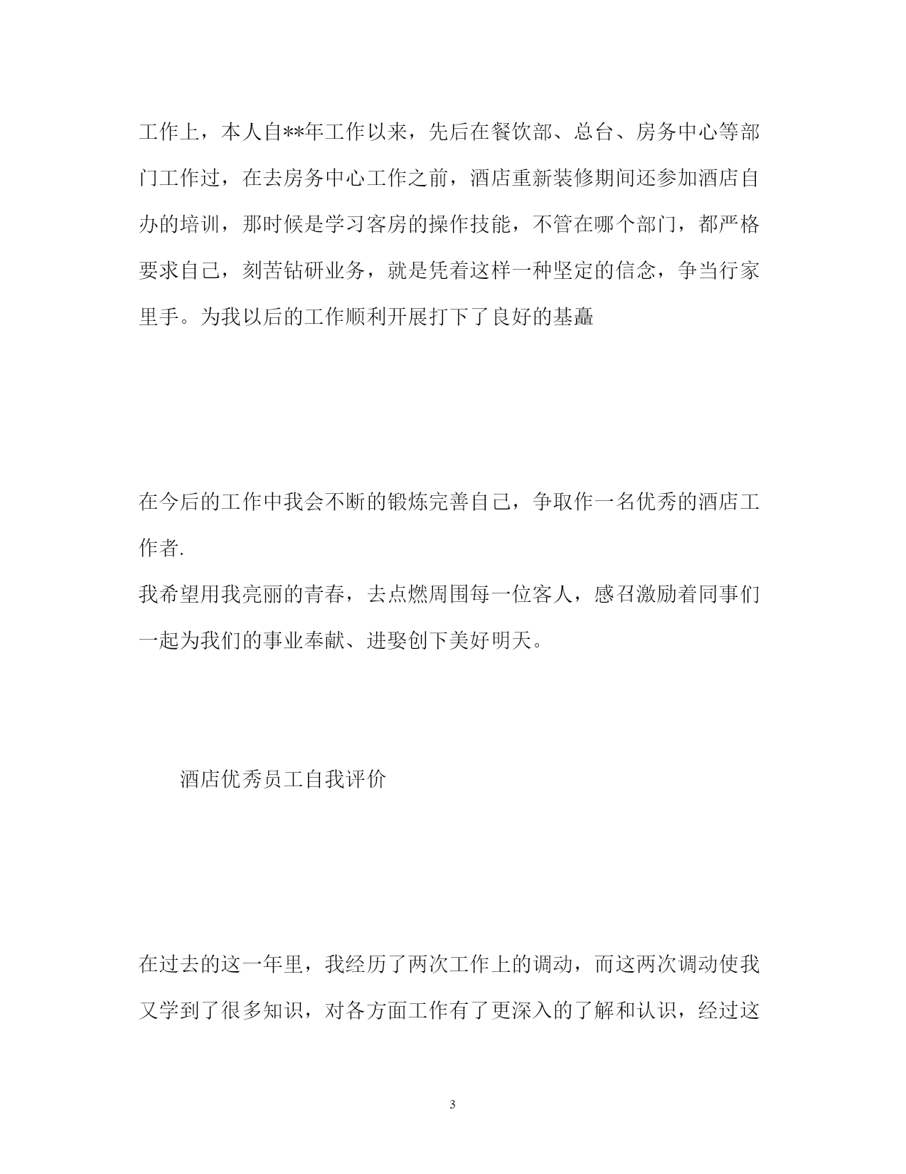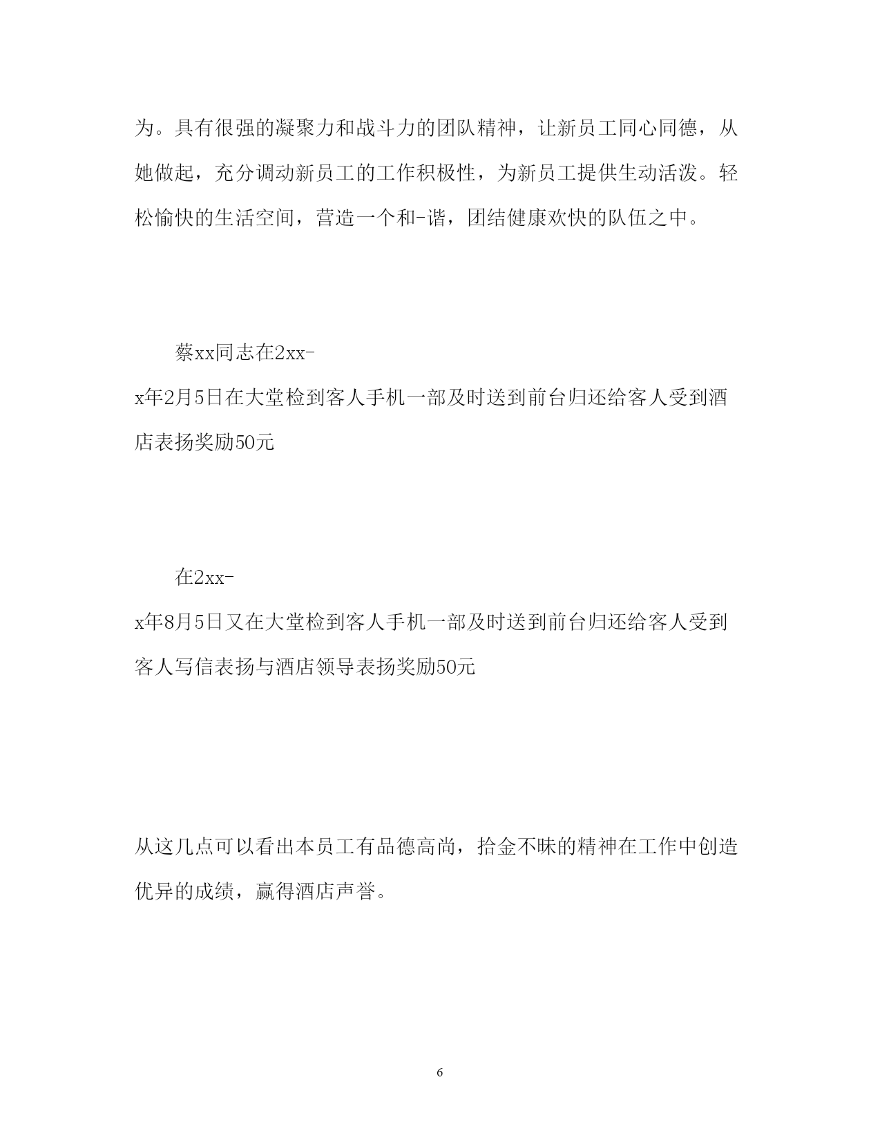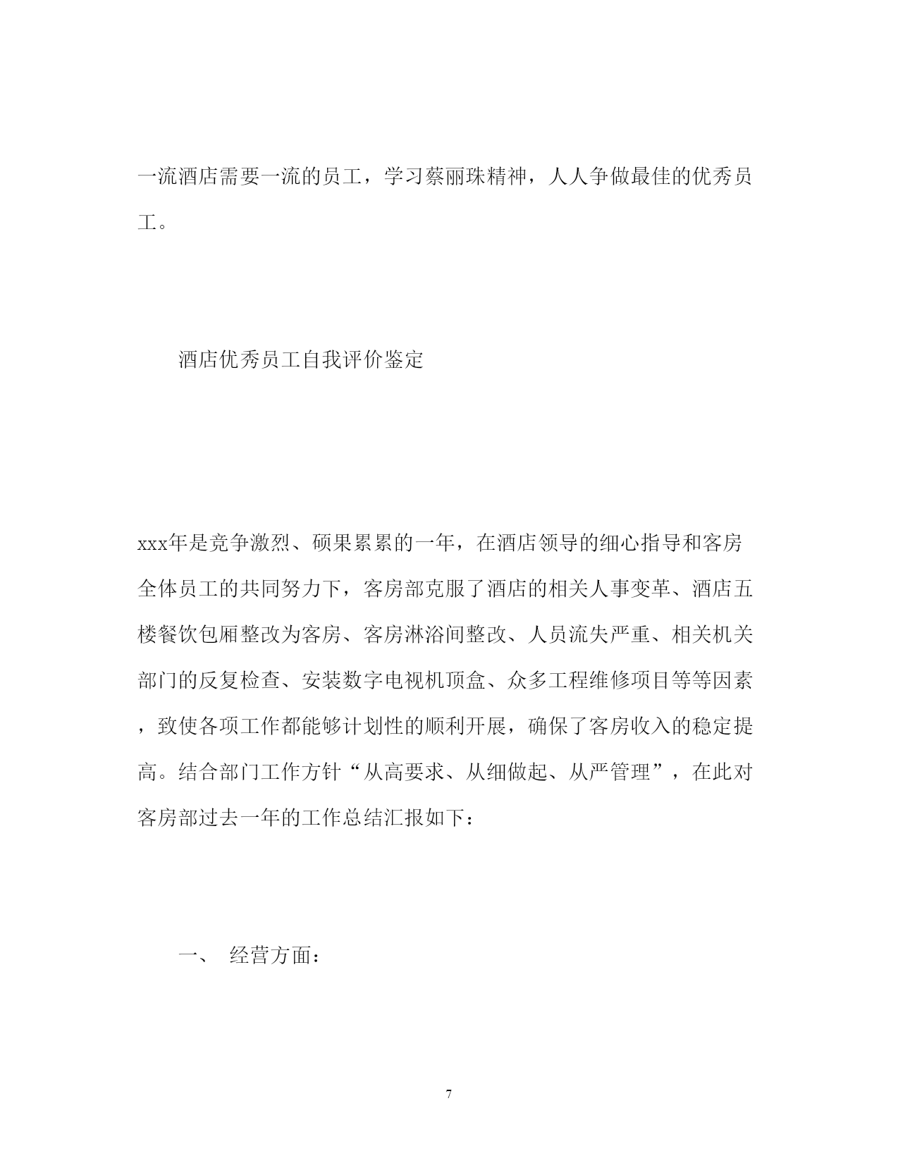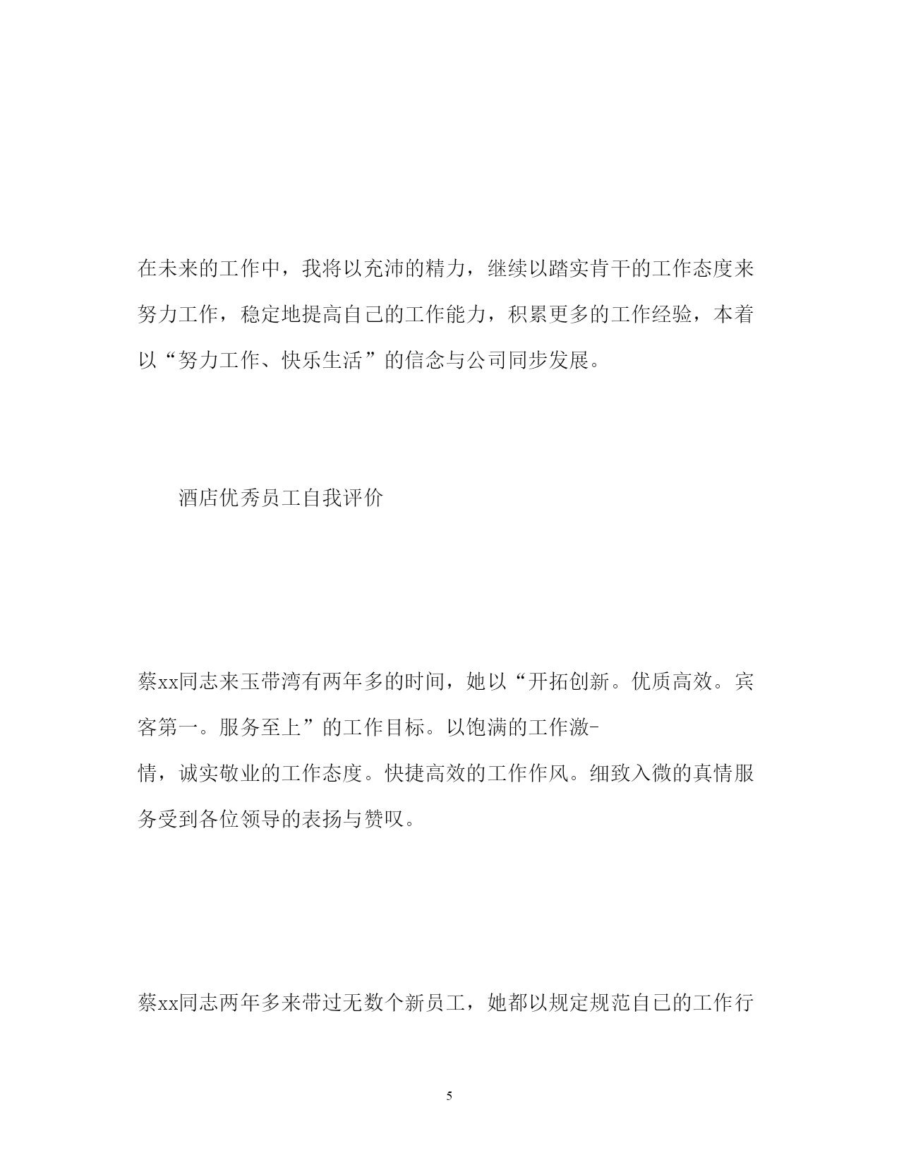 此资料由网络收集而来,如有侵权请告知上传者立即删除。资料共分享,我们负责传递知识。PAGEPAGE24酒店优秀员工自我评价精选酒店优秀员工自我评价对于评选优秀员工来说,我们员工自己也是需要对自己自身做一份自我评价的。以下是小编搜集整理的精选酒店优秀员工自我评价,欢迎阅读,供大家参考和借鉴!更多资讯尽在自我评价栏目!酒店优秀员工自我评价光阴似箭,转眼间三年的酒店生活就快过去了,工作以来,在单位领导的精心培育和教导下,通过自身的不断努力,无论是思想上、学习上还是工作上,都取得了长足的发展和巨大的收获思想上,自觉遵守酒店的的规章制度,坚持参加酒店的每次的培训。要求积极上进,爱护酒店的一砖一瓦,一直严谨的态度和积极的热情投身于学习和工作中,虽然有成功的泪水,也有失败的辛酸,然而日益激烈的社会竟争也使我充分地认识到成为一名德智体全面发展的优秀工作者的重要性。在学习上,严格要求自己,凭着对专业知识和技能的强烈追求,端正工作态度,作到了理论联理实际;除了专业知识的学习外,还注意各方面知识的扩展,广泛的涉猎其他部门、学科的知识,从而提高了自身的一专多能的长处及思想文化素质,包括生活中也学到了养成良好的生活习惯,生活充实而有条理,有严谨的生活态度和良好的生活作风,为人热情大方,诚实守信,乐于助人,拥有自己的良好做事原则,能与同事们和睦相处。工作上,本人自**年工作以来,先后在餐饮部、总台、房务中心等部门工作过,在去房务中心工作之前,酒店重新装修期间还参加酒店自办的培训,那时候是学习客房的操作技能,不管在哪个部门,都严格要求自己,刻苦钻研业务,就是凭着这样一种坚定的信念,争当行家里手。为我以后的工作顺利开展打下了良好的基矗在今后的工作中我会不断的锻炼完善自己,争取作一名优秀的酒店工作者.我希望用我亮丽的青春,去点燃周围每一位客人,感召激励着同事们一起为我们的事业奉献、进娶创下美好明天。酒店优秀员工自我评价在过去的这一年里,我经历了两次工作上的调动,而这两次调动使我又学到了很多知识,对各方面工作有了更深入的了解和认识,经过这一年来的不断学习和积累使我在各方面都有了很大的提高。在工作上,对待工作认真负责,积极主动,一直尽职尽责地做好本职工作,并能够服从、协调、配合领导及同事完成各项工作。在思想上,我追求上进,思想觉悟有了很大的提高。在我从事的跟单文员工作过程中,感觉到了跟单文员这一职位在公司业务运转过程中起着衔接与协调的重要作用。作为一名跟单文员,我本着以踏实肯干的工作态度为理念和吃苦耐劳的精神为公司服务。当然,在这一年里,也存在很多不足之处,工作上也出现过一些失误,对此我深感愧疚,被评为优秀员工这一荣誉对此感到很惭愧,如果它真的属于我,我将它视为一种鼓励、一种动力,以此掩盖来心中的自责。在未来的工作中,我将以充沛的精力,继续以踏实肯干的工作态度来努力工作,稳定地提高自己的工作能力,积累更多的工作经验,本着以“努力工作、快乐生活”的信念与公司同步发展。酒店优秀员工自我评价蔡xx同志来玉带湾有两年多的时间,她以“开拓创新。优质高效。宾客第一。服务至上”的工作目标。以饱满的工作激-情,诚实敬业的工作态度。快捷高效的工作作风。细致入微的真情服务受到各位领导的表扬与赞叹。蔡xx同志两年多来带过无数个新员工,她都以规定规范自已的工作行为。具有很强的凝聚力和战斗力的团队精神,让新员工同心同德,从她做起,充分调动新员工的工作积极性,为新员工提供生动活泼。轻松愉快的生活空间,营造一个和-谐,团结健康欢快的队伍之中。蔡xx同志在2xx-x年2月5日在大堂检到客人手机一部及时送到前台归还给客人受到酒店表扬奖励50元在2xx-x年8月5日又在大堂检到客人手机一部及时送到前台归还给客人受到客人写信表扬与酒店领导表扬奖励50元从这几点可以看出本员工有品德高尚,拾金不昧的精神在工作中创造优异的成绩,赢得酒店声誉。一流酒店需要一流的员工,学习蔡丽珠精神,人人争做最佳的优秀员工。酒店优秀员工自我评价鉴定xxx年是竞争激烈、硕果累累的一年,在酒店领导的细心指导和客房全体员工的共同努力下,客房部克服了酒店的相关人事变革、酒店五楼餐饮包厢整改为客房、客房淋浴间整改、人员流失严重、相关机关部门的反复检查、安装数字电视机顶盒、众多工程维修项目等等因素,致使各项工作都能够计划性的顺利开展,确保了客房收入的稳定提高。结合部门工作方针“从高要求、从细做起、从严管理”,在此对客房部过去一年的工作总结汇报如下:一、经营方面:二零零五年客房完成的营业总额为14200717.19元(其中住房总收入为14017074.00元、客房杂项金额