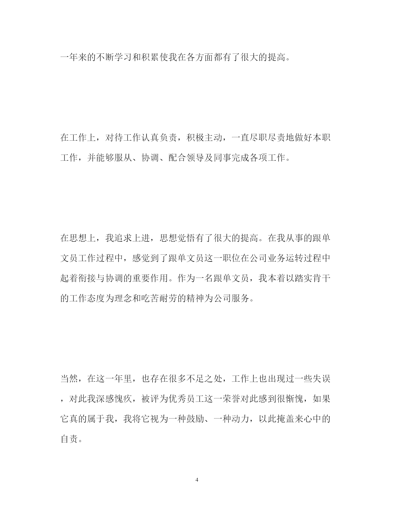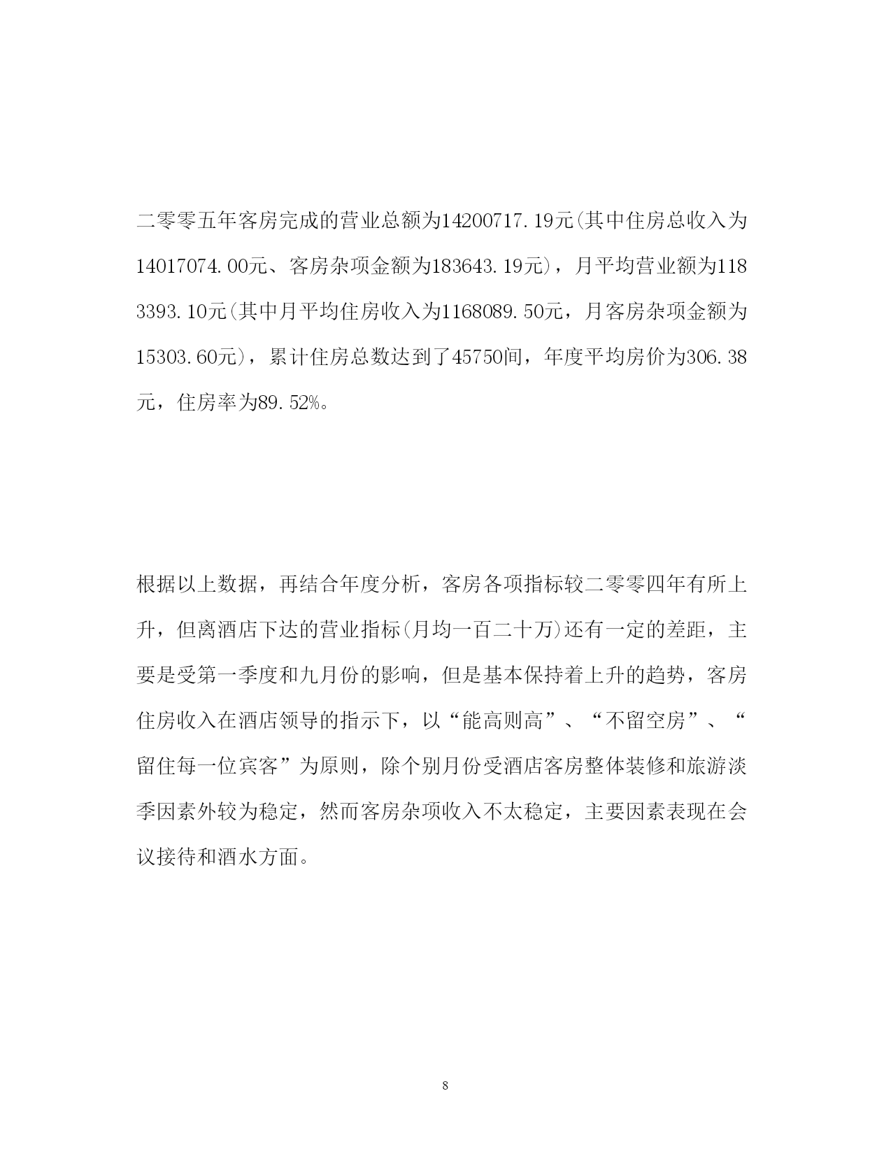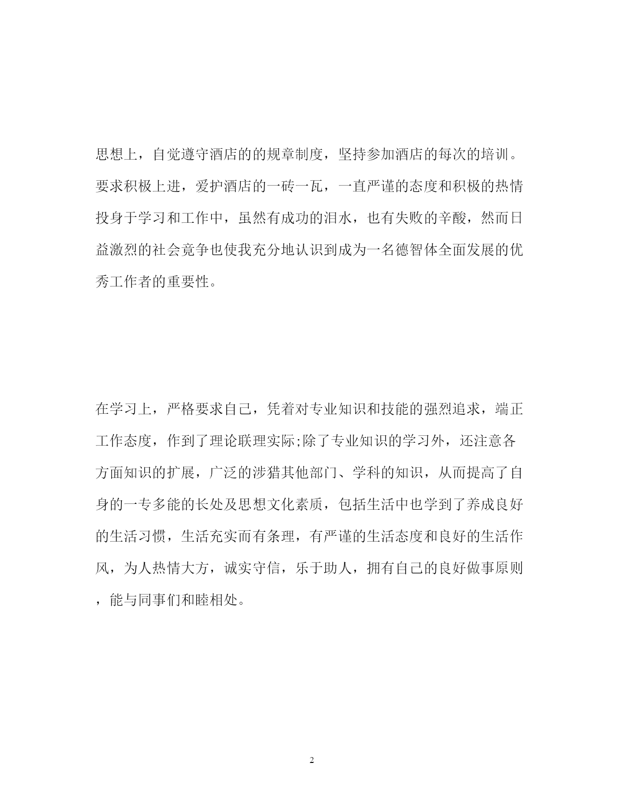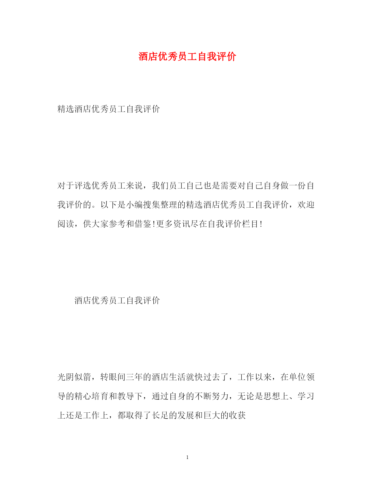此资料由网络收集而来,如有侵权请告知上传者立即删除。资料共分享,我们负责传递知识。PAGEPAGE24酒店优秀员工自我评价精选酒店优秀员工自我评价对于评选优秀员工来说,我们员工自己也是需要对自己自身做一份自我评价的。以下是小编搜集整理的精选酒店优秀员工自我评价,欢迎阅读,供大家参考和借鉴!更多资讯尽在自我评价栏目!酒店优秀员工自我评价光阴似箭,转眼间三年的酒店生活就快过去了,工作以来,在单位领导的精心培育和教导下,通过自身的不断努力,无论是思想上、学习上还是工作上,都取得了长足的发展和巨大的收获思想上,自觉遵守酒店的的规章制度,坚持参加酒店的每次的培训。要求积极上进,爱护酒店的一砖一瓦,一直严谨的态度和积极的热情投身于学习和工作中,虽然有成功的泪水,也有失败的辛酸,然而日益激烈的社会竟争也使我充分地认识到成为一名德智体全面发展的优秀工作者的重要性。在学习上,严格要求自己,凭着对专业知识和技能的强烈追求,端正工作态度,作到了理论联理实际;除了专业知识的学习外,还注意各方面知识的扩展,广泛的涉猎其他部门、学科的知识,从而提高了自身的一专多能的长处及思想文化素质,包括生活中也学到了养成良好的生活习惯,生活充实而有条理,有严谨的生活态度和良好的生活作风,为人热情大方,诚实守信,乐于助人,拥有自己的良好做事原则,能与同事们和睦相处。工作上,本人自**年工作以来,先后在餐饮部、总台、房务中心等部门工作过,在去房务中心工作之前,酒店重新装修期间还参加酒店自办的培训,那时候是学习客房的操作技能,不管在哪个部门,都严格要求自己,刻苦钻研业务,就是凭着这样一种坚定的信念,争当行家里手。为我以后的工作顺利开展打下了良好的基矗在今后的工作中我会不断的锻炼完善自己,争取作一名优秀的酒店工作者.我希望用我亮丽的青春,去点燃周围每一位客人,感召激励着同事们一起为我们的事业奉献、进娶创下美好明天。酒店优秀员工自我评价在过去的这一年里,我经历了两次工作上的调动,而这两次调动使我又学到了很多知识,对各方面工作有了更深入的了解和认识,经过这一年来的不断学习和积累使我在各方面都有了很大的提高。在工作上,对待工作认真负责,积极主动,一直尽职尽责地做好本职工作,并能够服从、协调、配合领导及同事完成各项工作。在思想上,我追求上进,思想觉悟有了很大的提高。在我从事的跟单文员工作过程中,感觉到了跟单文员这一职位在公司业务运转过程中起着衔接与协调的重要作用。作为一名跟单文员,我本着以踏实肯干的工作态度为理念和吃苦耐劳的精神为公司服务。当然,在这一年里,也存在很多不足之处,工作上也出现过一些失误,对此我深感愧疚,被评为优秀员工这一荣誉对此感到很惭愧,如果它真的属于我,我将它视为一种鼓励、一种动力,以此掩盖来心中的自责。在未来的工作中,我将以充沛的精力,继续以踏实肯干的工作态度来努力工作,稳定地提高自己的工作能力,积累更多的工作经验,本着以“努力工作、快乐生活”的信念与公司同步发展。酒店优秀员工自我评价蔡xx同志来玉带湾有两年多的时间,她以“开拓创新。优质高效。宾客第一。服务至上”的工作目标。以饱满的工作激-情,诚实敬业的工作态度。快捷高效的工作作风。细致入微的真情服务受到各位领导的表扬与赞叹。蔡xx同志两年多来带过无数个新员工,她都以规定规范自已的工作行为。具有很强的凝聚力和战斗力的团队精神,让新员工同心同德,从她做起,充分调动新员工的工作积极性,为新员工提供生动活泼。轻松愉快的生活空间,营造一个和-谐,团结健康欢快的队伍之中。蔡xx同志在2xx-x年2月5日在大堂检到客人手机一部及时送到前台归还给客人受到酒店表扬奖励50元在2xx-x年8月5日又在大堂检到客人手机一部及时送到前台归还给客人受到客人写信表扬与酒店领导表扬奖励50元从这几点可以看出本员工有品德高尚,拾金不昧的精神在工作中创造优异的成绩,赢得酒店声誉。一流酒店需要一流的员工,学习蔡丽珠精神,人人争做最佳的优秀员工。酒店优秀员工自我评价鉴定xxx年是竞争激烈、硕果累累的一年,在酒店领导的细心指导和客房全体员工的共同努力下,客房部克服了酒店的相关人事变革、酒店五楼餐饮包厢整改为客房、客房淋浴间整改、人员流失严重、相关机关部门的反复检查、安装数字电视机顶盒、众多工程维修项目等等因素,致使各项工作都能够计划性的顺利开展,确保了客房收入的稳定提高。结合部门工作方针“从高要求、从细做起、从严管理”,在此对客房部过去一年的工作总结汇报如下:一、经营方面:二零零五年客房完成的营业总额为14200717.19元(其中住房总收入为14017074.00元、客房杂项金额