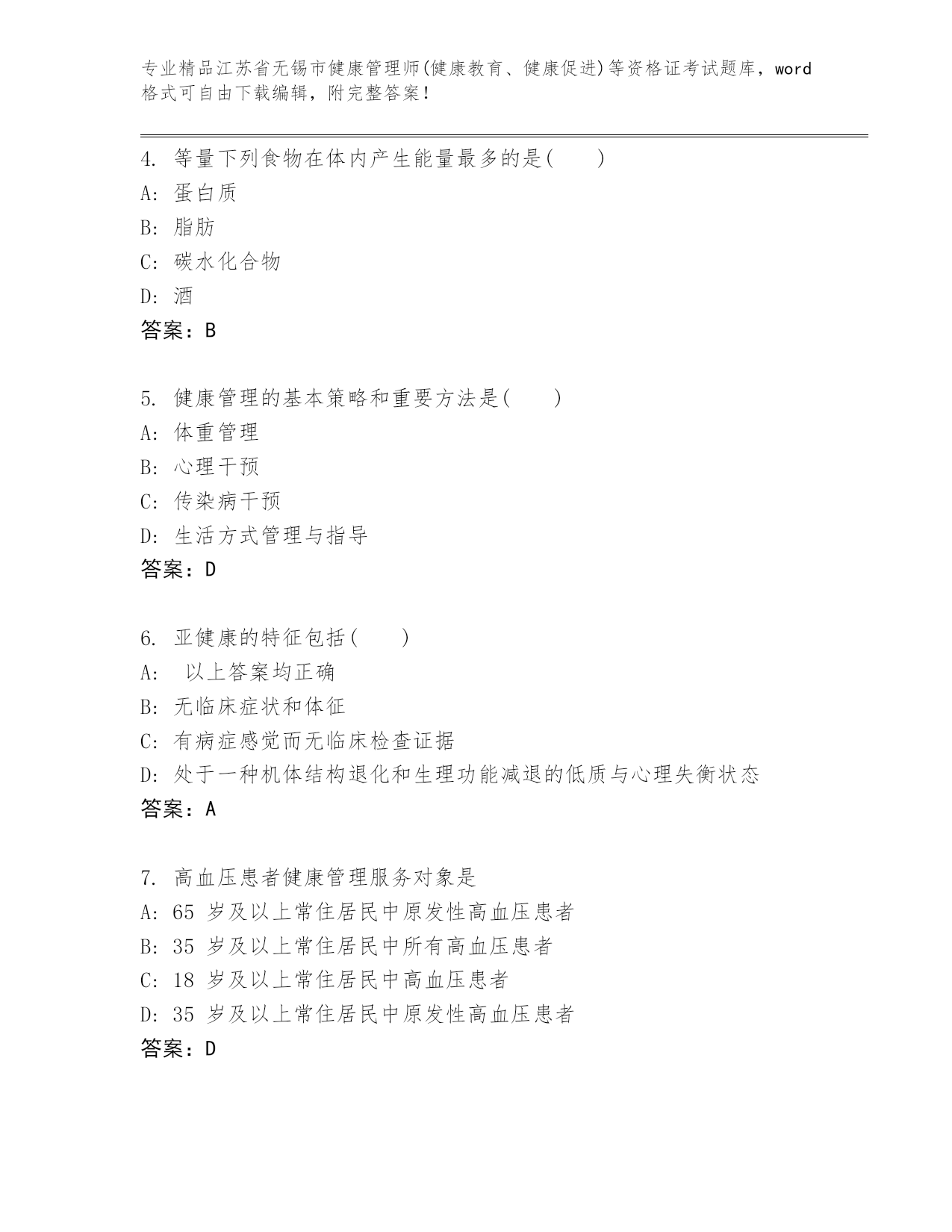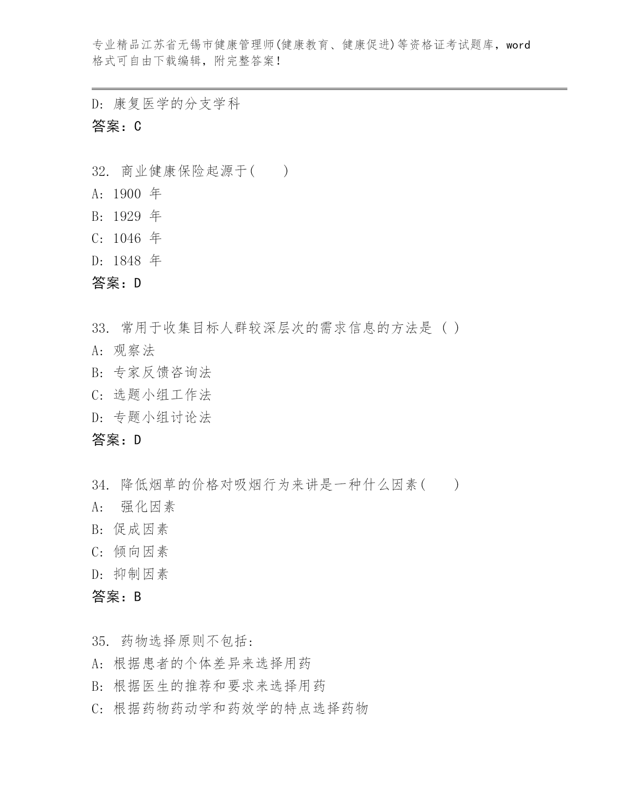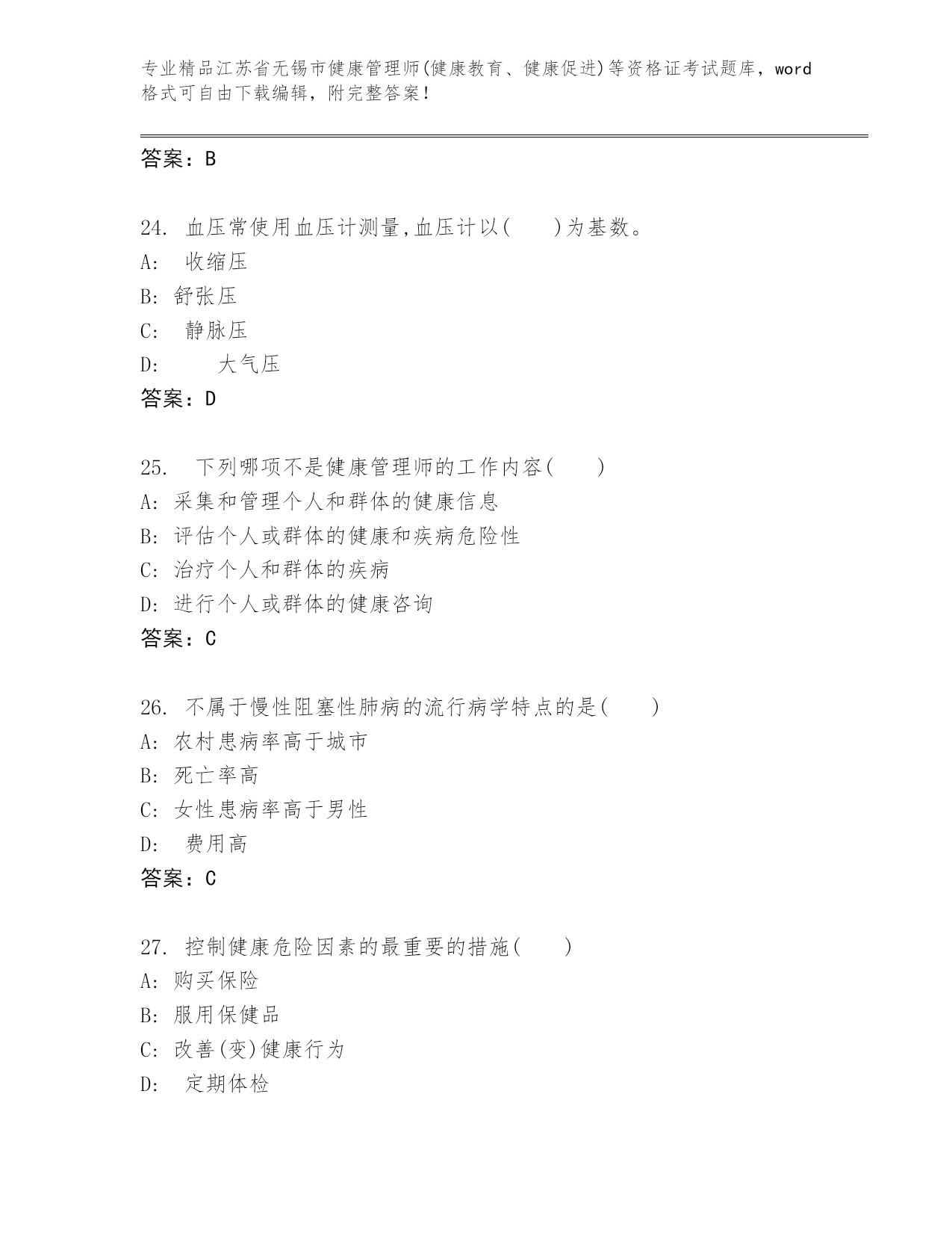 江苏省无锡市健康管理师(健康教育、健康促进)等资格证考试完整题库(A卷).docx