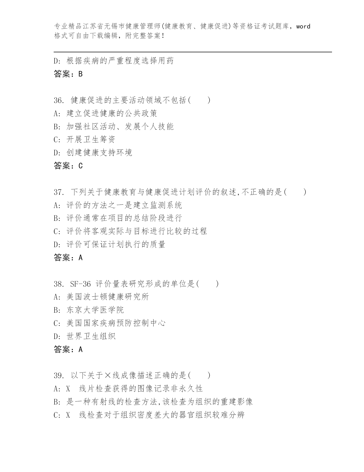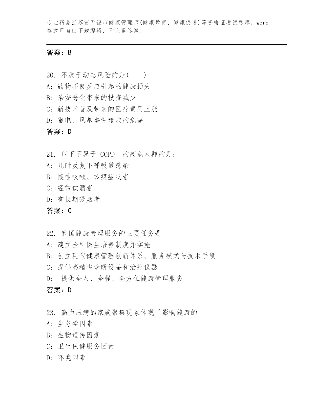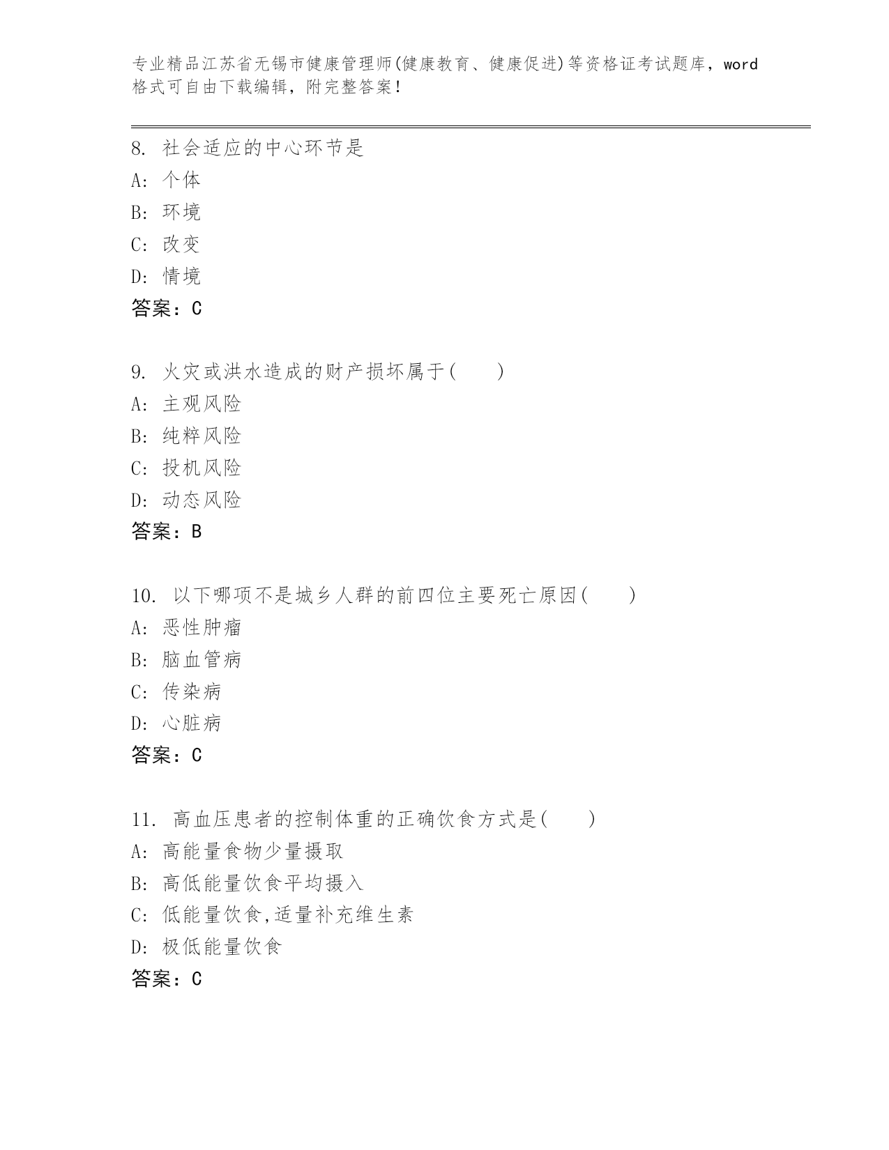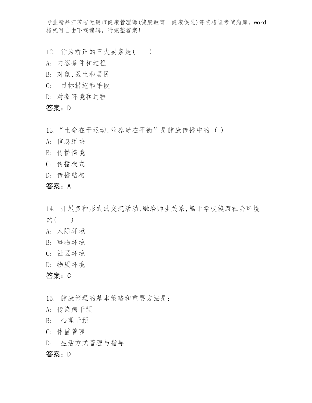 江苏省无锡市健康管理师(健康教育、健康促进)等资格证考试完整题库(A卷).docx
