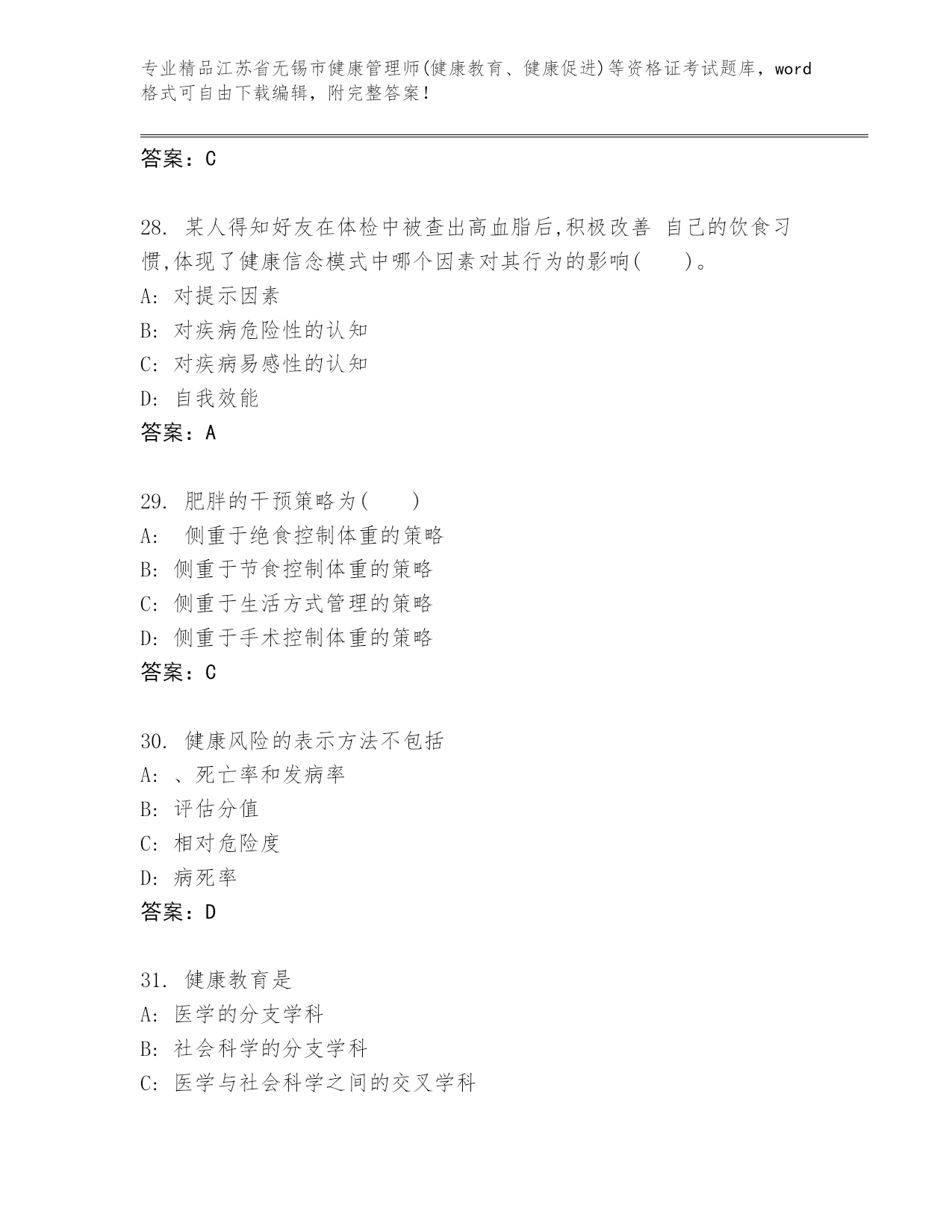 江苏省无锡市健康管理师(健康教育、健康促进)等资格证考试完整题库(A卷)