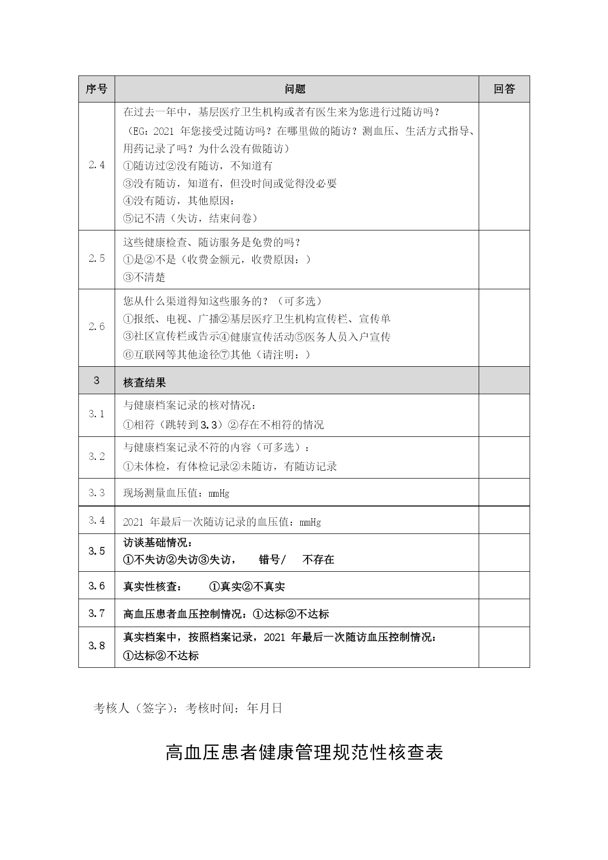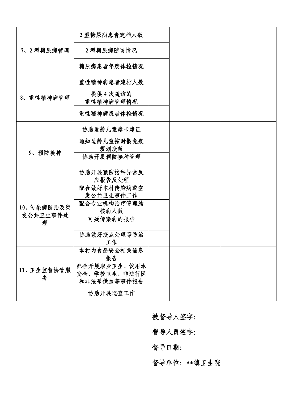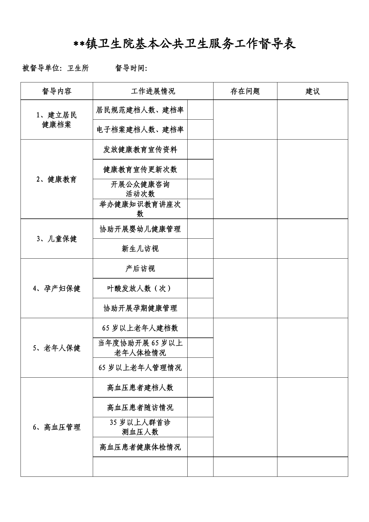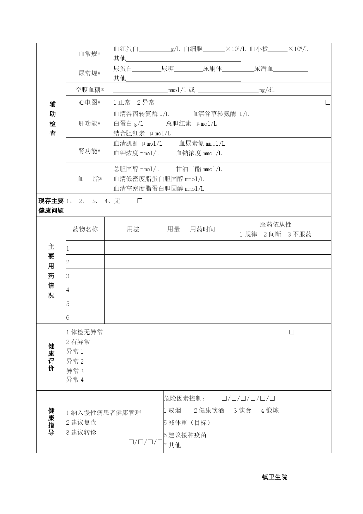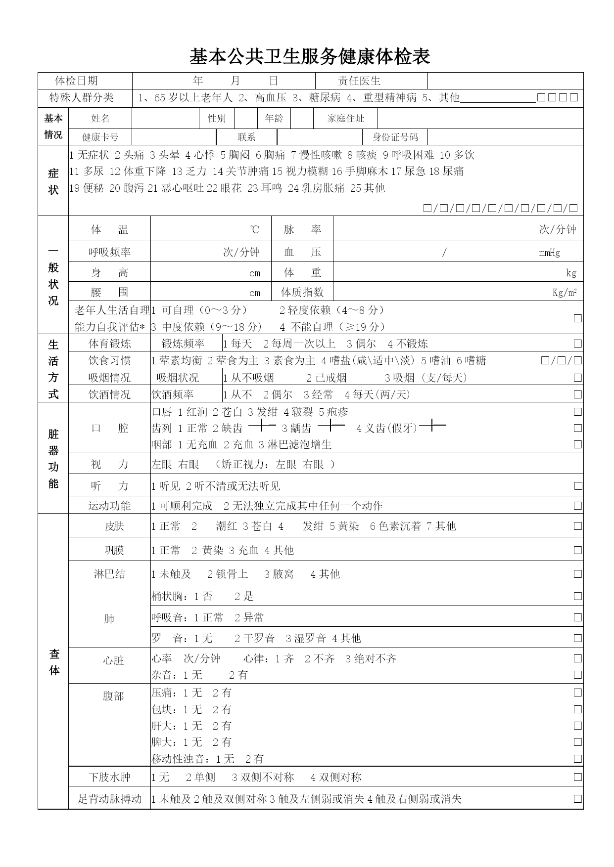 基本公共卫生服务健康体检表优质资料(可以直接使用,可编辑优质资料,欢迎下载)基本公共卫生服务健康体检表体检日期年月日责任医生特殊人群分类1、65岁以上老年人2、高血压3、糖尿病4、重型精神病5、其他______________□□□□基本情况姓名性别年龄家庭住址健康卡号联系身份证号码症状1无症状2头痛3头晕4心悸5胸闷6胸痛7慢性咳嗽8咳痰9呼吸困难10多饮11多尿12体重下降13乏力14关节肿痛15视力模糊16手脚麻木17尿急18尿痛19便秘20腹泻21恶心呕吐22眼花23耳鸣24乳房胀痛25其他□/□/□/□/□/□/□/□/□/□一般状况体温℃脉率次/分钟呼吸频率次/分钟血压/mmHg身高cm体重kg腰围cm体质指数Kg/m2老年人生活自理能力自我评估*1可自理(0~3分)2轻度依赖(4~8分)3中度依赖(9~18分)4不能自理(≥19分)□生活方式体育锻炼锻炼频率1每天2每周一次以上3偶尔4不锻炼□饮食习惯1荤素均衡2荤食为主3素食为主4嗜盐(咸\适中\淡)5嗜油6嗜糖□/□/□吸烟情况吸烟状况1从不吸烟2已戒烟3吸烟(支/每天)□饮酒情况饮酒频率1从不2偶尔3经常4每天(两/天)□脏器功能口腔口唇1红润2苍白3发绀4皲裂5疱疹齿列1正常2缺齿3龋齿4义齿(假牙)咽部1无充血2充血3淋巴滤泡增生□□□视力左眼右眼(矫正视力:左眼右眼)听力1听见2听不清或无法听见□运动功能1可顺利完成2无法独立完成其中任何一个动作□查体皮肤1正常2潮红3苍白4发绀5黄染6色素沉着7其他□巩膜1正常2黄染3充血4其他□淋巴结1未触及2锁骨上3腋窝4其他□肺桶状胸:1否2是□呼吸音:1正常2异常□罗音:1无2干罗音3湿罗音4其他□心脏心率次/分钟心律:1齐2不齐3绝对不齐杂音:1无2有□□腹部压痛:1无2有包块:1无2有肝大:1无2有脾大:1无2有移动性浊音:1无2有□□□□□下肢水肿1无2单侧3双侧不对称4双侧对称□足背动脉搏动1未触及2触及双侧对称3触及左侧弱或消失4触及右侧弱或消失□辅助检查血常规*血红蛋白__________g/L白细胞_______×109/L血小板______×109/L其他____________________________________尿常规*尿蛋白_________尿糖_________尿酮体__________尿潜血___________其他____________________________________空腹血糖*_________________mmol/L或___________________mg/dL心电图*1正常2异常□肝功能*血清谷丙转氨酶U/L血清谷草转氨酶U/L白蛋白g/L总胆红素μmol/L结合胆红素μmol/L肾功能*血清肌酐μmol/L血尿素氮mmol/L血钾浓度mmol/L血钠浓度mmol/L血脂*总胆固醇mmol/L甘油三酯mmol/L血清低密度脂蛋白胆固醇mmol/L血清高密度脂蛋白胆固醇mmol/L现存主要健康问题1、2、3、4、无□主要用药情况药物名称用法用量用药时间服药依从性1规律2间断3不服药123456健康评价1体检无异常□2有异常异常1异常2异常3异常4健康指导1纳入慢性病患者健康管理2建议复查3建议转诊□/□/□/□危险因素控制:□/□/□/□/□/□1戒烟2健康饮酒3饮食4锻炼5减体重(目标)6建议接种疫苗7其他镇卫生院体检结果粘贴单**镇卫生院基本公共卫生服务工作督导表被督导单位:卫生所督导时间:督导内容工作进展情况存在问题建议1、建立居民健康档案居民规范建档人数、建档率电子档案建档人数、建档率2、健康教育发放健康教育宣传资料健康教育宣传更新次数开展公众健康咨询活动次数举办健康知识教育讲座次数3、儿童保健协助开展婴幼儿健康管理新生儿访视4、孕产妇保健产后访视叶酸发放人数(次)协助开展孕期健康管理5、老年人保健65岁以上老年人建档数当年度协助开展65岁以上老年人体检情况65岁以上老年人管理情况6、高血压管理高血压患者建档人数高血压患者随访情况35岁以上人群首诊测血压人数高血压患者健康体检情况7、2型糖尿病管理2型糖尿病患者建档人数2型糖尿病随访情况糖尿病患者年度体检情况8、重性精神病管理重性精神病患者建档人数提供4次随访的重性精神病管理情况重性精神病患者体检情况9、预防接种协助适龄儿童建卡建证通知适龄儿童按时搁免疫规划疫苗协助开展预防接种管理协助开展预防接种异常反应报告及处理10、传染病防治及突发公共卫生事件处理配合做好本村传染病或空发公共卫生事件工作配合专业机构治疗管理