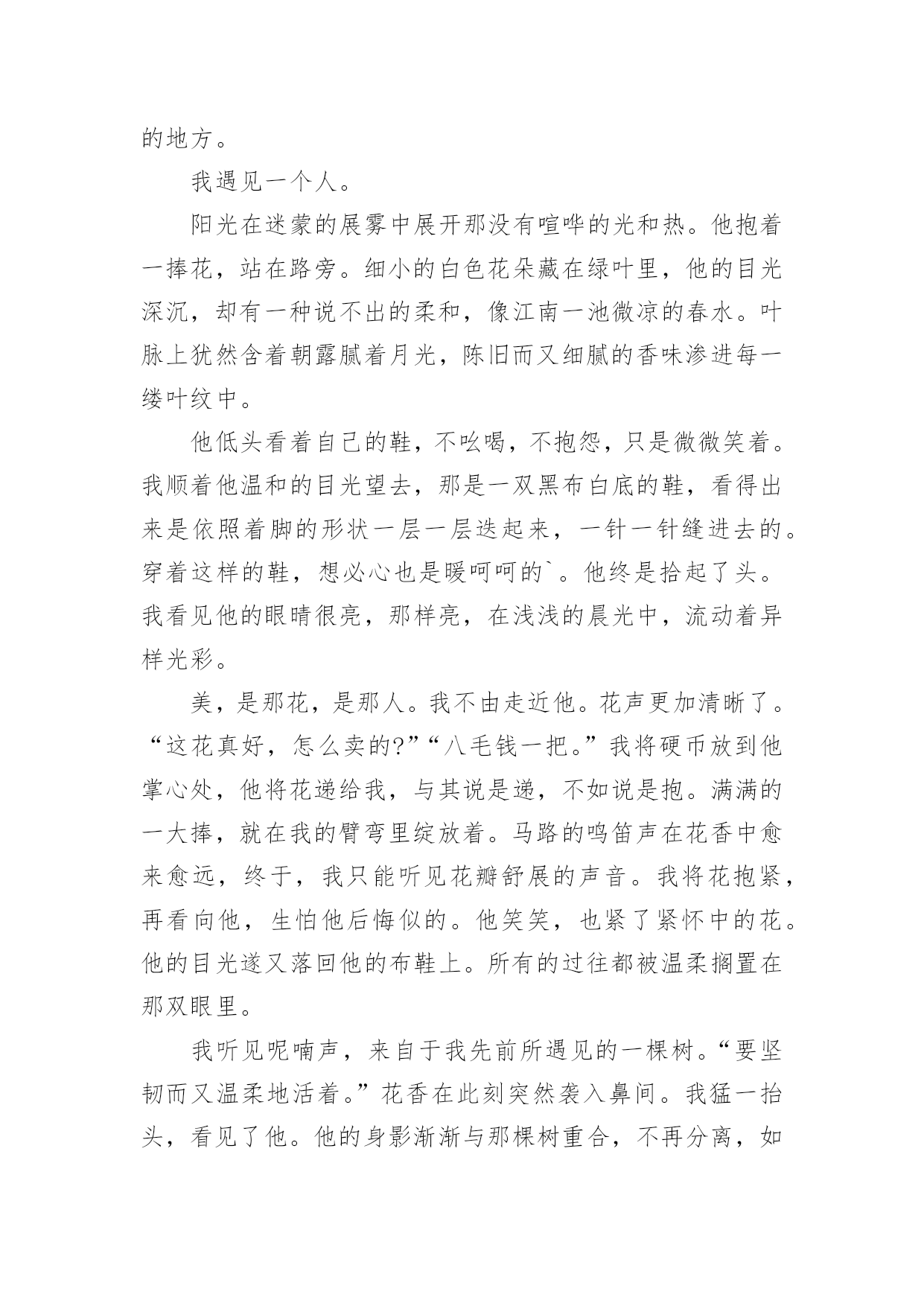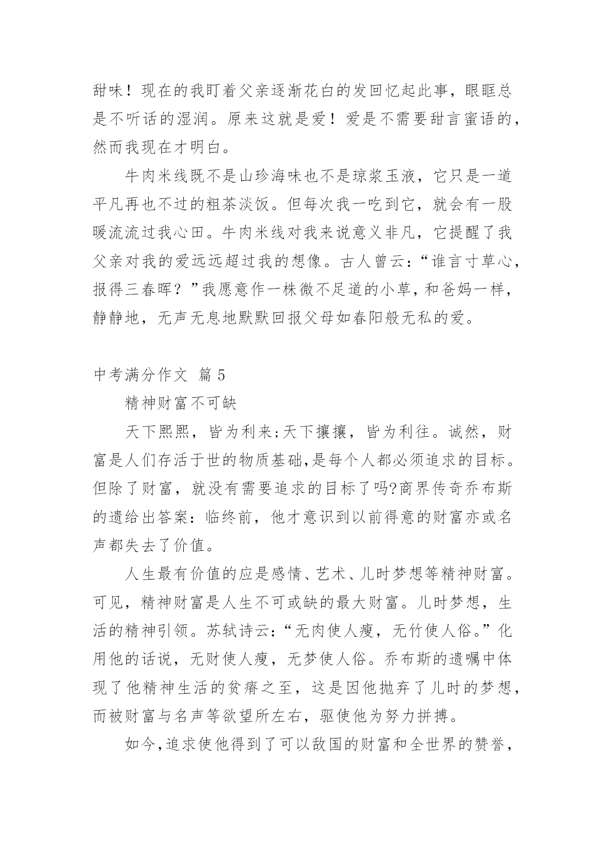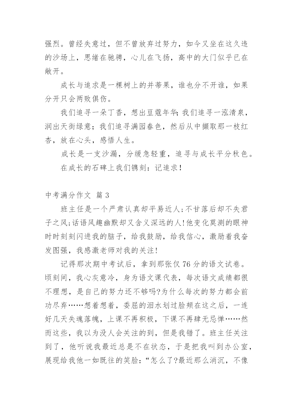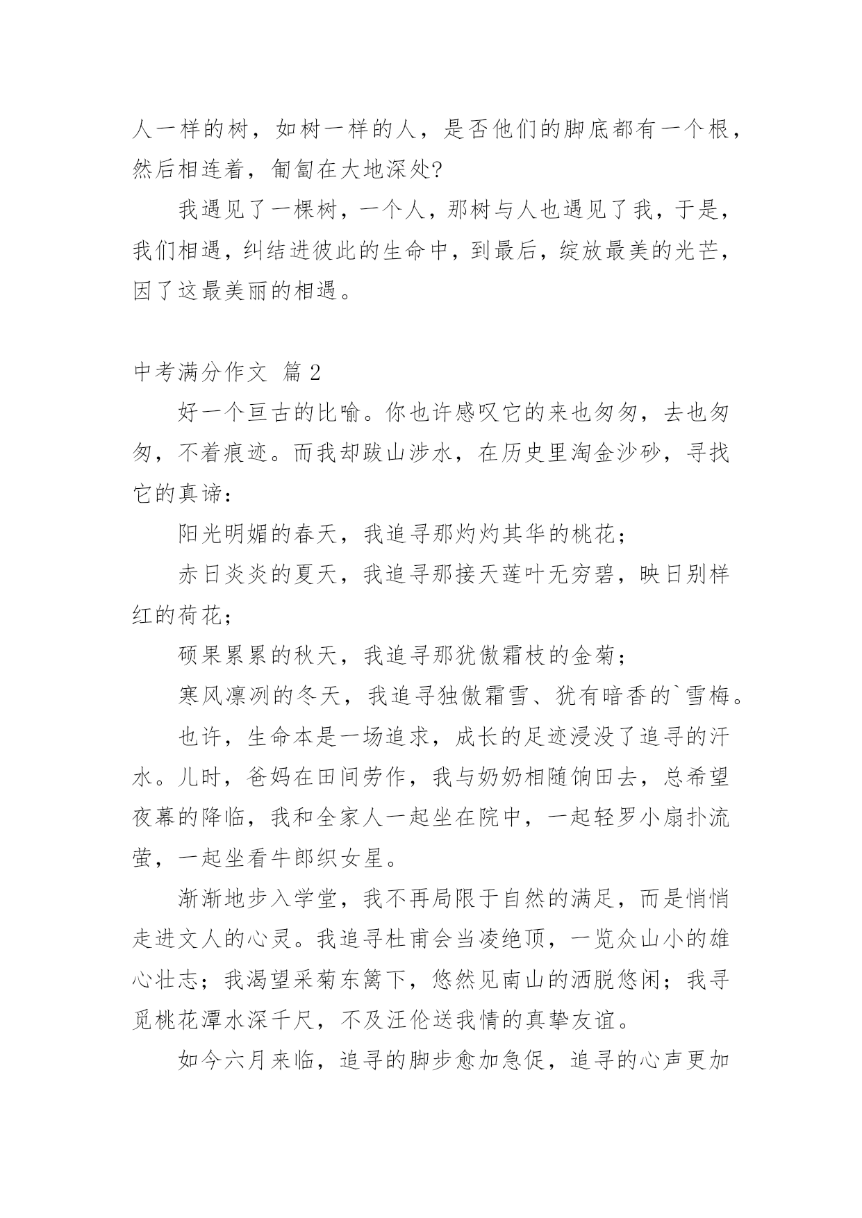 中考满分作文精选中考满分作文汇总7篇在平平淡淡的日常中,大家都跟作文打过交道吧,通过作文可以把我们那些零零散散的思想,聚集在一块。你写作文时总是无从下笔?下面是小编帮大家整理的中考满分作文9篇,仅供参考,欢迎大家阅读。中考满分作文篇1我遇见一棵树。那是一株槐树。树皮粗犷,纹路深凿,树身暴筋虬结。秋阳照在那一片粗糙的木纹上,竟像炒栗子似的,爆出一片干燥郁烈的芬芳。在青青的石砖上只站立着这一棵树。但旁边不知哪里来的几股细细的钢丝却硬生生地扎进树身中,戳进心脏的最隐秘之处,呈现一种血的颜色。皮肤上的汗毛不由地张开,风细细微微地从远处吹来,我闭上眼努力地去触摸风的脉搏。无数的绿色在风里晃荡,翻折,刷刷作响。翅膀的振动,蚯蚓的腹部爬过草叶的窣窣声在一瞬间都被风扯远。我满耳只听见的并不是那种鼓噪的蝉声,而是那绿叶说与云听的呢喃声一一尽管遭遇不幸,却依然坚强地站立在大地上,以风雨为伴,从容而美丽地生存着。那饱满而丰实的生命仿佛一条河流,细细地流淌到更远的地方。我遇见一个人。阳光在迷蒙的展雾中展开那没有喧哗的光和热。他抱着一捧花,站在路旁。细小的白色花朵藏在绿叶里,他的目光深沉,却有一种说不出的柔和,像江南一池微凉的春水。叶脉上犹然含着朝露腻着月光,陈旧而又细腻的香味渗进每一缕叶纹中。他低头看着自己的鞋,不吆喝,不抱怨,只是微微笑着。我顺着他温和的目光望去,那是一双黑布白底的鞋,看得出来是依照着脚的形状一层一层迭起来,一针一针缝进去的。穿着这样的鞋,想必心也是暖呵呵的`。他终是拾起了头。我看见他的眼晴很亮,那样亮,在浅浅的晨光中,流动着异样光彩。美,是那花,是那人。我不由走近他。花声更加清晰了。“这花真好,怎么卖的?”“八毛钱一把。”我将硬币放到他掌心处,他将花递给我,与其说是递,不如说是抱。满满的一大捧,就在我的臂弯里绽放着。马路的鸣笛声在花香中愈来愈远,终于,我只能听见花瓣舒展的声音。我将花抱紧,再看向他,生怕他后悔似的。他笑笑,也紧了紧怀中的花。他的目光遂又落回他的布鞋上。所有的过往都被温柔搁置在那双眼里。我听见呢喃声,来自于我先前所遇见的一棵树。“要坚韧而又温柔地活着。”花香在此刻突然袭入鼻间。我猛一抬头,看见了他。他的身影渐渐与那棵树重合,不再分离,如人一样的树,如树一样的人,是否他们的脚底都有一个根,然后相连着,匍匐在大地深处?我遇见了一棵树,一个人,那树与人也遇见了我,于是,我们相遇,纠结进彼此的生命中,到最后,绽放最美的光芒,因了这最美丽的相遇。中考满分作文篇2好一个亘古的比喻。你也许感叹它的来也匆匆,去也匆匆,不着痕迹。而我却跋山涉水,在历史里淘金沙砂,寻找它的真谛:阳光明媚的春天,我追寻那灼灼其华的桃花;赤日炎炎的夏天,我追寻那接天莲叶无穷碧,映日别样红的荷花;硕果累累的秋天,我追寻那犹傲霜枝的金菊;寒风凛冽的冬天,我追寻独傲霜雪、犹有暗香的`雪梅。也许,生命本是一场追求,成长的足迹浸没了追寻的汗水。儿时,爸妈在田间劳作,我与奶奶相随饷田去,总希望夜幕的降临,我和全家人一起坐在院中,一起轻罗小扇扑流萤,一起坐看牛郎织女星。渐渐地步入学堂,我不再局限于自然的满足,而是悄悄走进文人的心灵。我追寻杜甫会当凌绝顶,一览众山小的雄心壮志;我渴望采菊东篱下,悠然见南山的洒脱悠闲;我寻觅桃花潭水深千尺,不及汪伦送我情的真挚友谊。如今六月来临,追寻的脚步愈加急促,追寻的心声更加强烈。曾经失意过,但不曾放弃过努力,如今又坐在这久违的沙场上,思绪在驰骋,心儿在飞扬,高中的大门似乎已在敞开。成长与追求是一棵树上的并蒂果,谁也分不开谁,如果分开只会两败俱伤。我们追寻一朵丁香,想出豆蔻年华;我们追寻一泓清泉,润出天街绿意;我们追寻满园春色,然后从中撷取那一枝红杏,放在心头,感悟人生。成长是一支沙漏,分缓急轻重,追寻与成长平分秋色。在成长的石碑上我们镌刻:记追求!中考满分作文篇3班主任是一个严肃认真却平易近人;不甘落后却不失君子之风;话语风趣幽默却又含义深远的人!他变化莫测的眼神时时刻刻闪进我的脑子,给我鼓励,给我信心,激励着我奋发图强,我感激老师对我的关注!记得那次期中考试后,拿到那张仅76分的语文试卷。顷刻间,我心灰意冷,身为语文课代表,每次语文成绩都很不理想,是自己的努力还不够吗?为什么每次的努力都会前功尽弃……想着想着,委屈的泪水划过脸颊在这之后,一连好几天失魂落魄,上课不再积极,下课不再肆无忌惮……然而这些,我以为没人会关注的到,但是我错了。班主任关注到了,他听说我最近总是不在状态,于是把我叫到办公室,展现给我他一如既往的笑脸:“怎么了?最近那么消沉,不像你的风格啊?不是挺乐观的吗?”热情洋溢的话语,敲打在我的心上一下勾起了我的心事,像打开闸门的水把憋了很久早就想对老师说的话倾泻出来:“老师,对不起,又给班里拉分了,为什么每次就算我平时