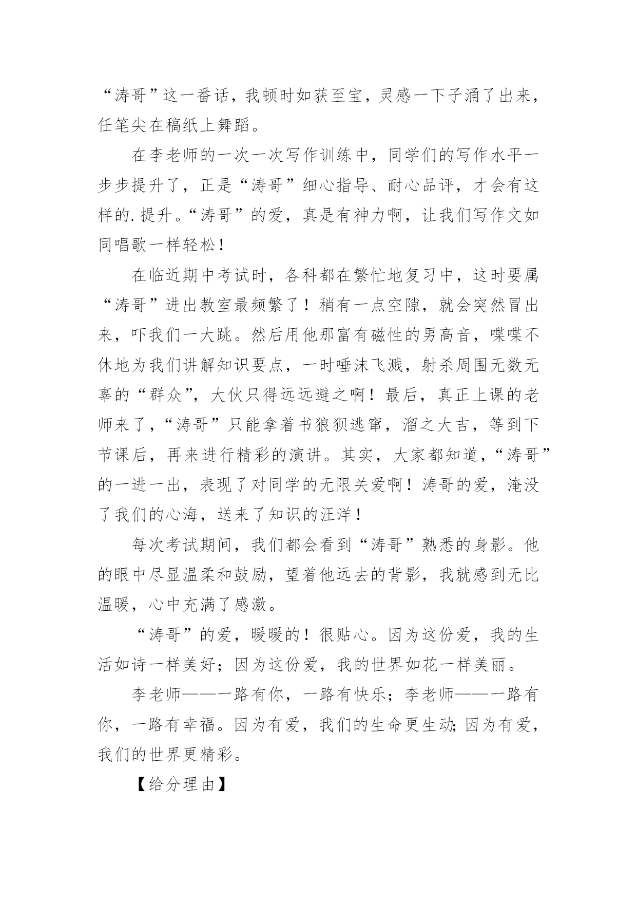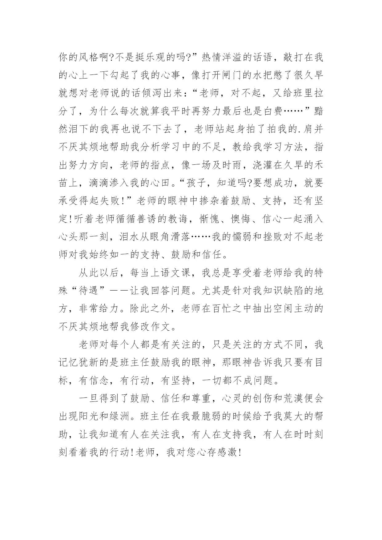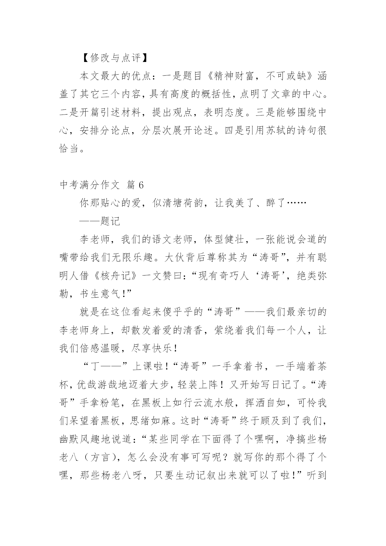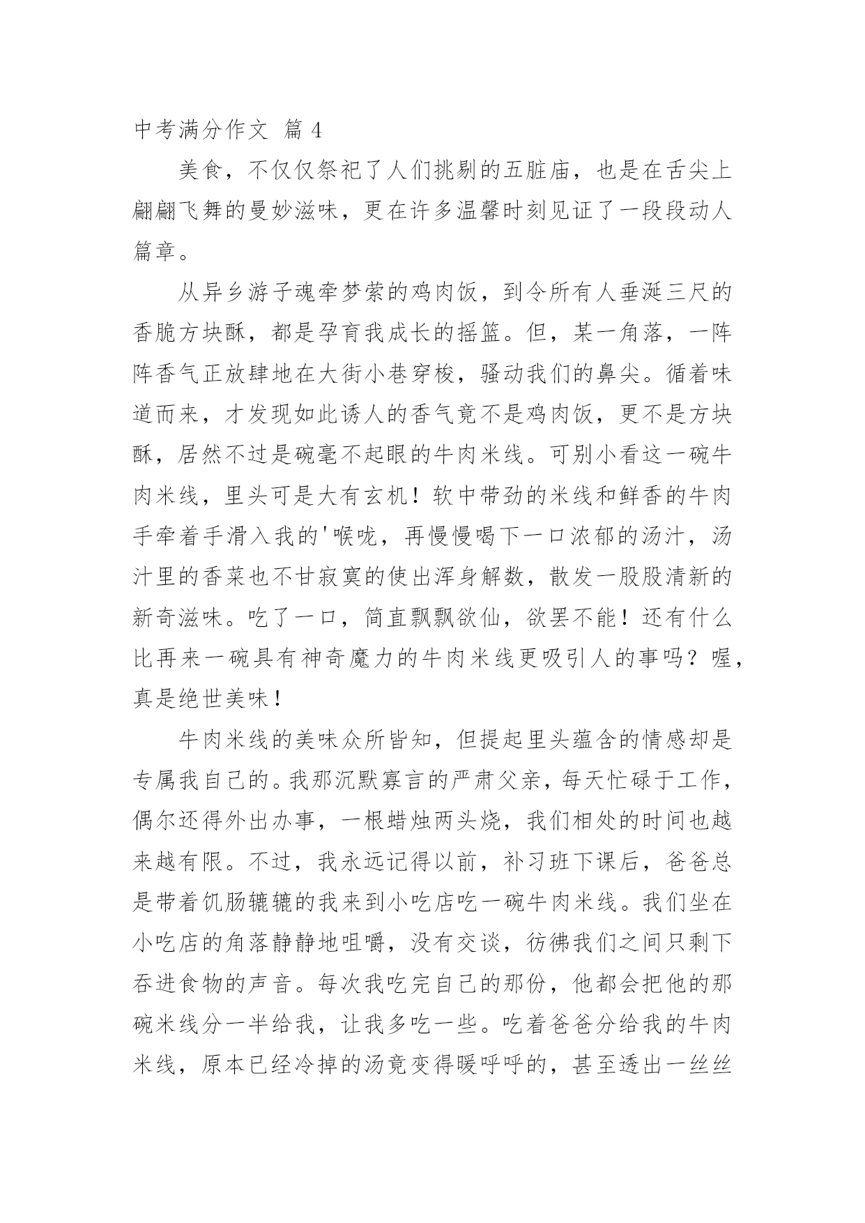 中考满分作文精选中考满分作文汇总7篇在平平淡淡的日常中,大家都跟作文打过交道吧,通过作文可以把我们那些零零散散的思想,聚集在一块。你写作文时总是无从下笔?下面是小编帮大家整理的中考满分作文9篇,仅供参考,欢迎大家阅读。中考满分作文篇1我遇见一棵树。那是一株槐树。树皮粗犷,纹路深凿,树身暴筋虬结。秋阳照在那一片粗糙的木纹上,竟像炒栗子似的,爆出一片干燥郁烈的芬芳。在青青的石砖上只站立着这一棵树。但旁边不知哪里来的几股细细的钢丝却硬生生地扎进树身中,戳进心脏的最隐秘之处,呈现一种血的颜色。皮肤上的汗毛不由地张开,风细细微微地从远处吹来,我闭上眼努力地去触摸风的脉搏。无数的绿色在风里晃荡,翻折,刷刷作响。翅膀的振动,蚯蚓的腹部爬过草叶的窣窣声在一瞬间都被风扯远。我满耳只听见的并不是那种鼓噪的蝉声,而是那绿叶说与云听的呢喃声一一尽管遭遇不幸,却依然坚强地站立在大地上,以风雨为伴,从容而美丽地生存着。那饱满而丰实的生命仿佛一条河流,细细地流淌到更远的地方。我遇见一个人。阳光在迷蒙的展雾中展开那没有喧哗的光和热。他抱着一捧花,站在路旁。细小的白色花朵藏在绿叶里,他的目光深沉,却有一种说不出的柔和,像江南一池微凉的春水。叶脉上犹然含着朝露腻着月光,陈旧而又细腻的香味渗进每一缕叶纹中。他低头看着自己的鞋,不吆喝,不抱怨,只是微微笑着。我顺着他温和的目光望去,那是一双黑布白底的鞋,看得出来是依照着脚的形状一层一层迭起来,一针一针缝进去的。穿着这样的鞋,想必心也是暖呵呵的`。他终是拾起了头。我看见他的眼晴很亮,那样亮,在浅浅的晨光中,流动着异样光彩。美,是那花,是那人。我不由走近他。花声更加清晰了。“这花真好,怎么卖的?”“八毛钱一把。”我将硬币放到他掌心处,他将花递给我,与其说是递,不如说是抱。满满的一大捧,就在我的臂弯里绽放着。马路的鸣笛声在花香中愈来愈远,终于,我只能听见花瓣舒展的声音。我将花抱紧,再看向他,生怕他后悔似的。他笑笑,也紧了紧怀中的花。他的目光遂又落回他的布鞋上。所有的过往都被温柔搁置在那双眼里。我听见呢喃声,来自于我先前所遇见的一棵树。“要坚韧而又温柔地活着。”花香在此刻突然袭入鼻间。我猛一抬头,看见了他。他的身影渐渐与那棵树重合,不再分离,如人一样的树,如树一样的人,是否他们的脚底都有一个根,然后相连着,匍匐在大地深处?我遇见了一棵树,一个人,那树与人也遇见了我,于是,我们相遇,纠结进彼此的生命中,到最后,绽放最美的光芒,因了这最美丽的相遇。中考满分作文篇2好一个亘古的比喻。你也许感叹它的来也匆匆,去也匆匆,不着痕迹。而我却跋山涉水,在历史里淘金沙砂,寻找它的真谛:阳光明媚的春天,我追寻那灼灼其华的桃花;赤日炎炎的夏天,我追寻那接天莲叶无穷碧,映日别样红的荷花;硕果累累的秋天,我追寻那犹傲霜枝的金菊;寒风凛冽的冬天,我追寻独傲霜雪、犹有暗香的`雪梅。也许,生命本是一场追求,成长的足迹浸没了追寻的汗水。儿时,爸妈在田间劳作,我与奶奶相随饷田去,总希望夜幕的降临,我和全家人一起坐在院中,一起轻罗小扇扑流萤,一起坐看牛郎织女星。渐渐地步入学堂,我不再局限于自然的满足,而是悄悄走进文人的心灵。我追寻杜甫会当凌绝顶,一览众山小的雄心壮志;我渴望采菊东篱下,悠然见南山的洒脱悠闲;我寻觅桃花潭水深千尺,不及汪伦送我情的真挚友谊。如今六月来临,追寻的脚步愈加急促,追寻的心声更加强烈。曾经失意过,但不曾放弃过努力,如今又坐在这久违的沙场上,思绪在驰骋,心儿在飞扬,高中的大门似乎已在敞开。成长与追求是一棵树上的并蒂果,谁也分不开谁,如果分开只会两败俱伤。我们追寻一朵丁香,想出豆蔻年华;我们追寻一泓清泉,润出天街绿意;我们追寻满园春色,然后从中撷取那一枝红杏,放在心头,感悟人生。成长是一支沙漏,分缓急轻重,追寻与成长平分秋色。在成长的石碑上我们镌刻:记追求!中考满分作文篇3班主任是一个严肃认真却平易近人;不甘落后却不失君子之风;话语风趣幽默却又含义深远的人!他变化莫测的眼神时时刻刻闪进我的脑子,给我鼓励,给我信心,激励着我奋发图强,我感激老师对我的关注!记得那次期中考试后,拿到那张仅76分的语文试卷。顷刻间,我心灰意冷,身为语文课代表,每次语文成绩都很不理想,是自己的努力还不够吗?为什么每次的努力都会前功尽弃……想着想着,委屈的泪水划过脸颊在这之后,一连好几天失魂落魄,上课不再积极,下课不再肆无忌惮……然而这些,我以为没人会关注的到,但是我错了。班主任关注到了,他听说我最近总是不在状态,于是把我叫到办公室,展现给我他一如既往的笑脸:“怎么了?最近那么消沉,不像你的风格啊?不是挺乐观的吗?”热情洋溢的话语,敲打在我的心上一下勾起了我的心事,像打开闸门的水把憋了很久早就想对老师说的话倾泻出来:“老师,对不起,又给班里拉分了,为什么每次就算我平时