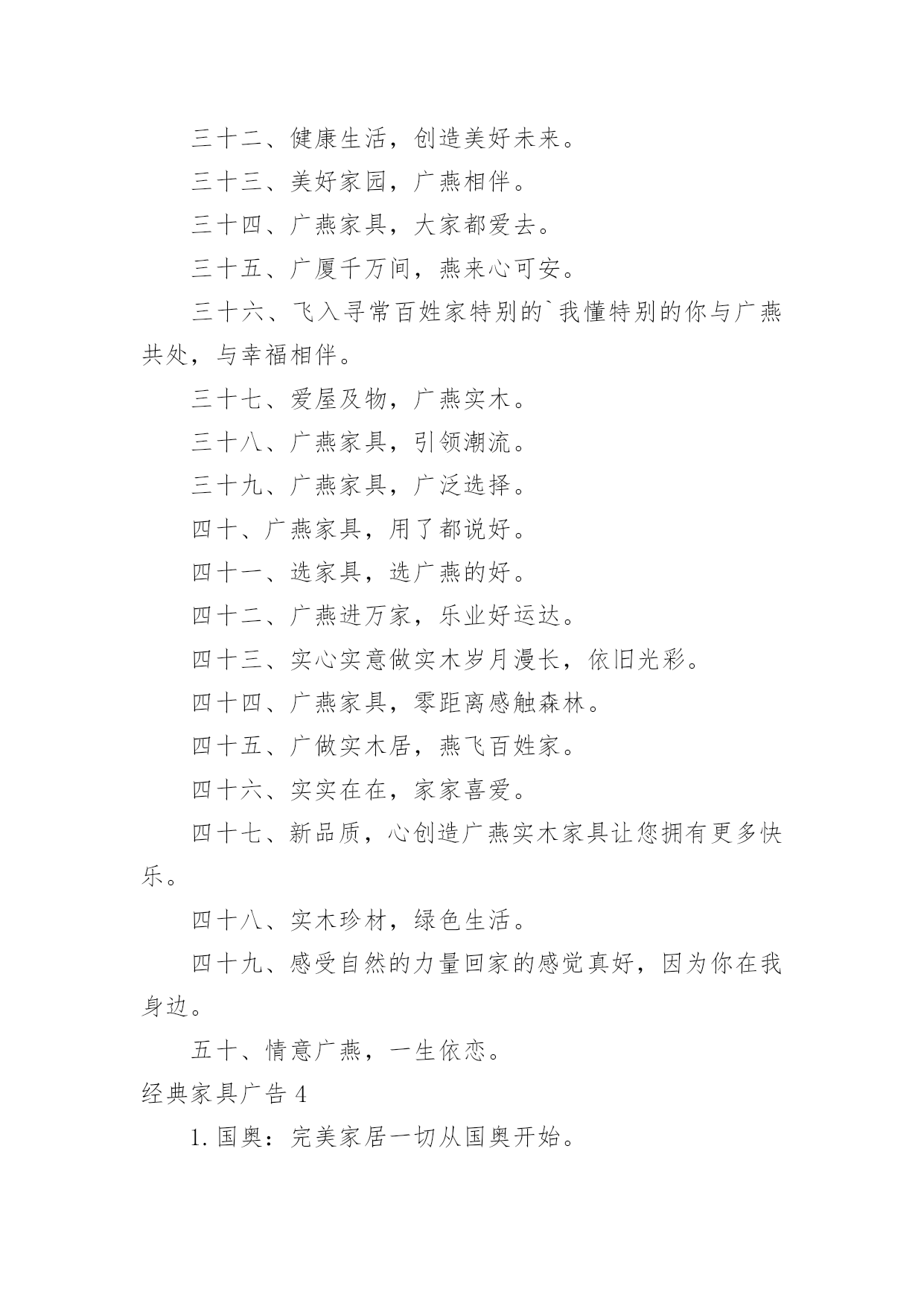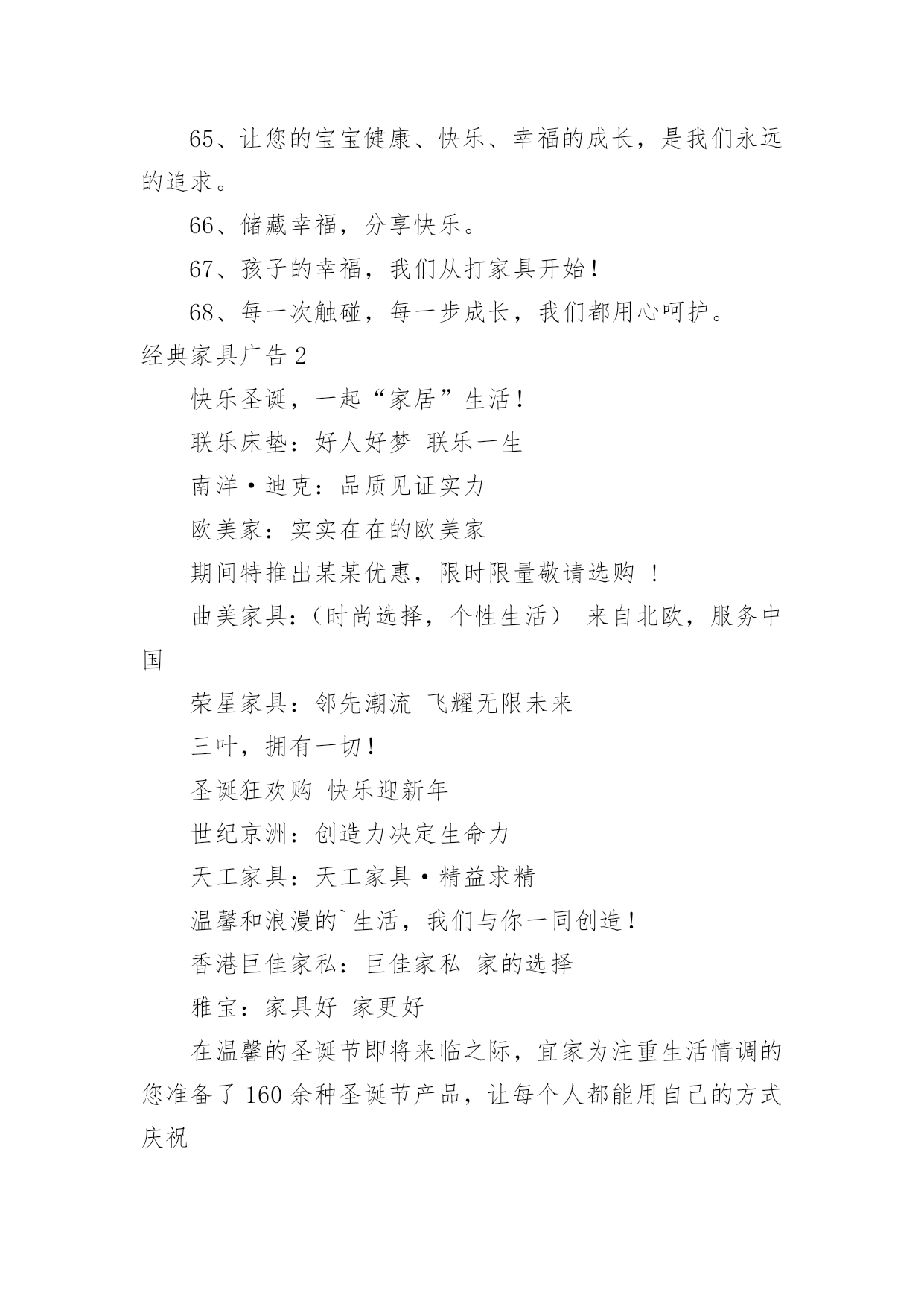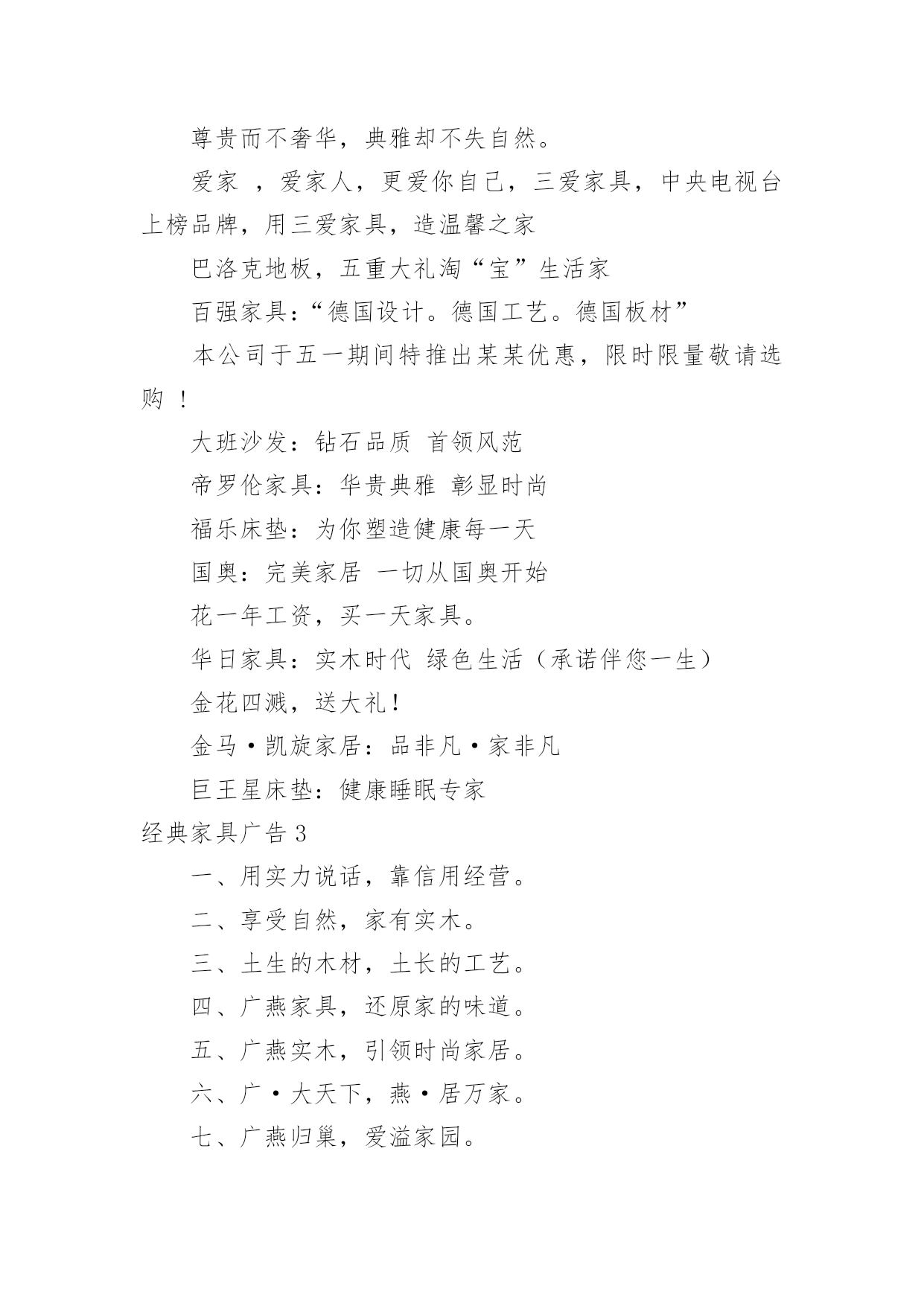 经典家具广告经典家具广告经典家具广告11、童梦想,童健康,童快乐,童成长。2、希望你的幸福有我相伴。3、给宝贝欢乐和幸福的空间。4、美家美户,童行童享,精彩快乐,健康成长。5、漫天幸福雨,读得天下爱。6、孩子的幸福,你我的追求。7、给孩子一个幸福的家——儿童家具!8、价格有限,关爱无限。9、为了孩子幸福,我们和您一直在努力。10、快乐、幸福、自立从儿童家具开始。11、童一样天空下的不同色彩。12、材质放心,设计贴心,幸福快乐最关心。13、你的幸福,就是我的幸福。14、儿童家具,让绿色健康、幸福快乐走进千家万户。15、儿童家具让孩子充满乐趣。16、小小的桌椅,大大的爱,幸福伴成长。17、全心全意,伴你成长。18、爱的.精华,温暖一生。19、成长的秘密,只让孩子自己知道。20、小小的,因为他们在成长。21、用一颗天使的心,呵护儿童成长情。22、快乐儿童,幸福家。23、与您一起呵护宝贝成长——儿童家具。24、儿童乐天派,快乐要实在。25、多一点关怀,多一点爱。26、为了孩子幸福,只做健康家具。27、打造幸福家居,只为让你快乐成长。28、孩子睡得好、玩得好,优质儿童家具少不了。29、只为儿童打造健康优质家具。30、我的宝宝正在用的家具。31、让儿童健康、幸福地成长,让大人快乐而又放心的选择。32、筑巢七彩童梦,成就瞩目人生。33、娃娃的一切就从娃娃开始。34、给孩子更多空间。35、让孩子幸福成长,是我们和家长永远的追求。36、因唯有你,家才幸福。37、七彩童梦,靓丽人生。38、满心的爱,暖暖的情。39、返璞归真,贴近自然,还有更健康?40、倾听家的温馨,感受爱的非凡,儿童家具快乐的源泉。41、健康最重要——儿童家具。42、见证爱的呵护,伴儿童健康成长。43、承担关爱儿童责任,达成人人幸福愿景!44、让天下的孩子都幸福。45、好童伴,童成长,更健康。46、孩子童年的笑脸——儿童家具!47、让家居给还孩子成长多一点呵护。48、专心为爱,细致入微——给宝贝最好的爱。49、健康快乐,伴你成长。50、表里如一的精彩,安全放心的选择。51、希望你的幸福从此简单。52、微笑小贴心,至真新感觉。53、爱不只是承诺——儿童家具。54、为了孩子幸福,我们一直在努力。55、只是因为在人群中多看了你一眼,缘来饰你——儿童家具。56、创意唯宝宝喜欢的家具。57、快乐生活,从儿童家具开始。58、健康好童伴,舒心童梦想,快乐童成长。59、孩子有欢乐,我们才放心。60、宝贝开心,爸妈放心——儿童家具。61、陪伴,健康成长。62、爱,看得见,摸得着——儿童家具。63、爱在一桌一椅,成长无拘无束。64、温馨励志家具,创宝贝未来明星。65、让您的宝宝健康、快乐、幸福的成长,是我们永远的追求。66、储藏幸福,分享快乐。67、孩子的幸福,我们从打家具开始!68、每一次触碰,每一步成长,我们都用心呵护。经典家具广告2快乐圣诞,一起“家居”生活!联乐床垫:好人好梦联乐一生南洋·迪克:品质见证实力欧美家:实实在在的欧美家期间特推出某某优惠,限时限量敬请选购!曲美家具:(时尚选择,个性生活)来自北欧,服务中国荣星家具:邻先潮流飞耀无限未来三叶,拥有一切!圣诞狂欢购快乐迎新年世纪京洲:创造力决定生命力天工家具:天工家具·精益求精温馨和浪漫的`生活,我们与你一同创造!香港巨佳家私:巨佳家私家的选择雅宝:家具好家更好在温馨的圣诞节即将来临之际,宜家为注重生活情调的您准备了160余种圣诞节产品,让每个人都能用自己的方式庆祝尊贵而不奢华,典雅却不失自然。爱家,爱家人,更爱你自己,三爱家具,中央电视台上榜品牌,用三爱家具,造温馨之家巴洛克地板,五重大礼淘“宝”生活家百强家具:“德国设计。德国工艺。德国板材”本公司于五一期间特推出某某优惠,限时限量敬请选购!大班沙发:钻石品质首领风范帝罗伦家具:华贵典雅彰显时尚福乐床垫:为你塑造健康每一天国奥:完美家居一切从国奥开始花一年工资,买一天家具。华日家具:实木时代绿色生活(承诺伴您一生)金花四溅,送大礼!金马·凯旋家居:品非凡·家非凡巨王星床垫:健康睡眠专家经典家具广告3一、用实力说话,靠信用经营。二、享受自然,家有实木。三、土生的木材,土长的工艺。四、广燕家具,还原家的味道。五、广燕实木,引领时尚家居。六、广·大天下,燕·居万家。七、广燕归巢,爱溢家园。八、广燕实木家具,艺术创造生活。九、广燕家私,一往无前。十、广燕家具真材实艺,广燕家具。十一、品质广燕,品位生活。十二、诚信铸就品质,广燕创造健康。十三、广传千家万户,燕飞四面八方。十四、广德馨,燕归来享受品质,铸就经典。十五、春风徐徐晖,贴心燕轻飞。十六、东源油钻,探遍河山。十七、家具领导之峰,品质求实保障。十八、实木品质行天下真才实料,创新环保。十九、呵护家人的温暖广选天下材,燕报幸福来。二十、