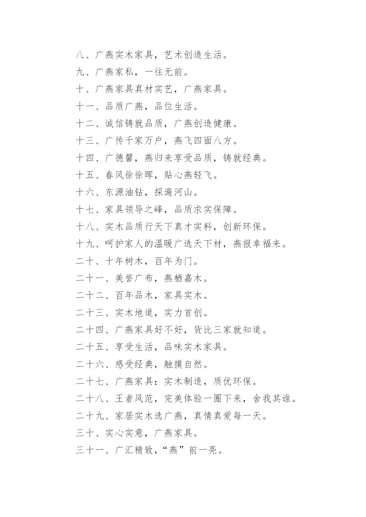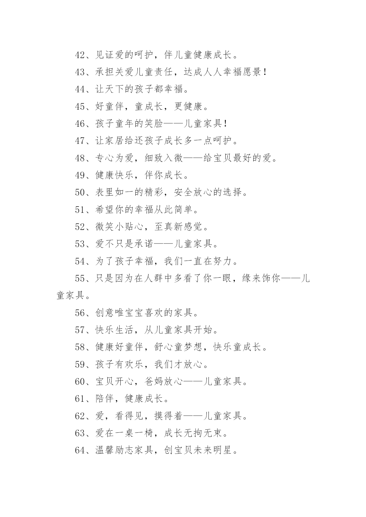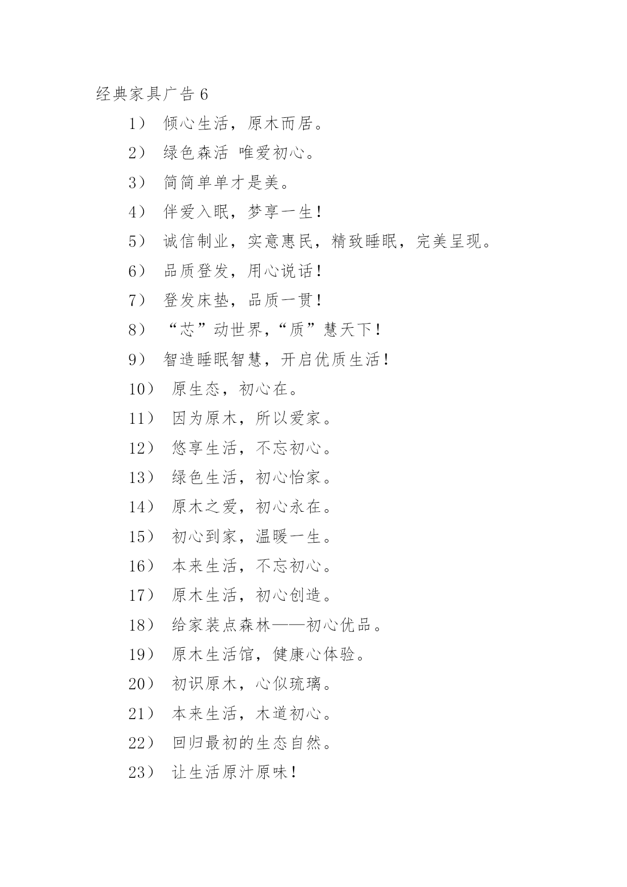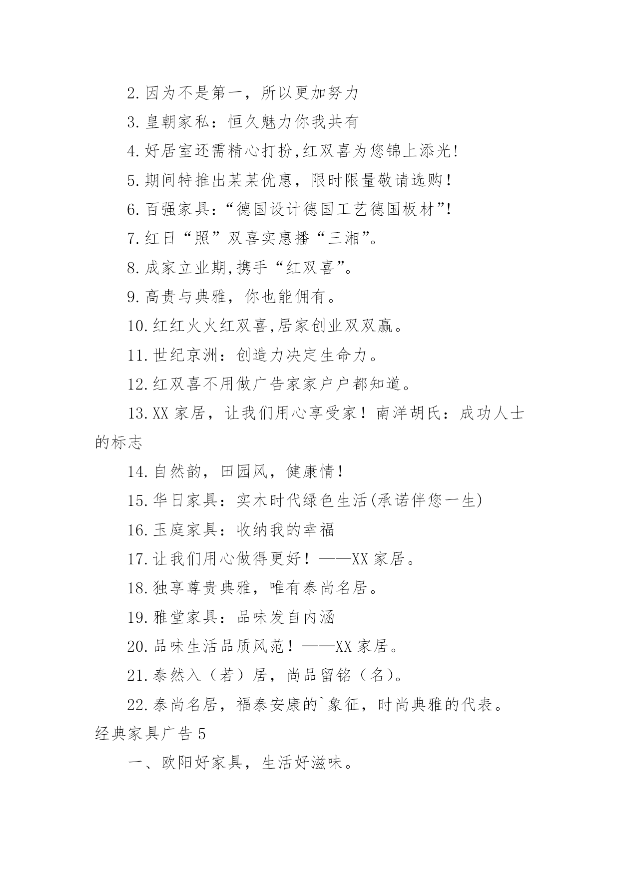 经典家具广告经典家具广告经典家具广告11、童梦想,童健康,童快乐,童成长。2、希望你的幸福有我相伴。3、给宝贝欢乐和幸福的空间。4、美家美户,童行童享,精彩快乐,健康成长。5、漫天幸福雨,读得天下爱。6、孩子的幸福,你我的追求。7、给孩子一个幸福的家——儿童家具!8、价格有限,关爱无限。9、为了孩子幸福,我们和您一直在努力。10、快乐、幸福、自立从儿童家具开始。11、童一样天空下的不同色彩。12、材质放心,设计贴心,幸福快乐最关心。13、你的幸福,就是我的幸福。14、儿童家具,让绿色健康、幸福快乐走进千家万户。15、儿童家具让孩子充满乐趣。16、小小的桌椅,大大的爱,幸福伴成长。17、全心全意,伴你成长。18、爱的.精华,温暖一生。19、成长的秘密,只让孩子自己知道。20、小小的,因为他们在成长。21、用一颗天使的心,呵护儿童成长情。22、快乐儿童,幸福家。23、与您一起呵护宝贝成长——儿童家具。24、儿童乐天派,快乐要实在。25、多一点关怀,多一点爱。26、为了孩子幸福,只做健康家具。27、打造幸福家居,只为让你快乐成长。28、孩子睡得好、玩得好,优质儿童家具少不了。29、只为儿童打造健康优质家具。30、我的宝宝正在用的家具。31、让儿童健康、幸福地成长,让大人快乐而又放心的选择。32、筑巢七彩童梦,成就瞩目人生。33、娃娃的一切就从娃娃开始。34、给孩子更多空间。35、让孩子幸福成长,是我们和家长永远的追求。36、因唯有你,家才幸福。37、七彩童梦,靓丽人生。38、满心的爱,暖暖的情。39、返璞归真,贴近自然,还有更健康?40、倾听家的温馨,感受爱的非凡,儿童家具快乐的源泉。41、健康最重要——儿童家具。42、见证爱的呵护,伴儿童健康成长。43、承担关爱儿童责任,达成人人幸福愿景!44、让天下的孩子都幸福。45、好童伴,童成长,更健康。46、孩子童年的笑脸——儿童家具!47、让家居给还孩子成长多一点呵护。48、专心为爱,细致入微——给宝贝最好的爱。49、健康快乐,伴你成长。50、表里如一的精彩,安全放心的选择。51、希望你的幸福从此简单。52、微笑小贴心,至真新感觉。53、爱不只是承诺——儿童家具。54、为了孩子幸福,我们一直在努力。55、只是因为在人群中多看了你一眼,缘来饰你——儿童家具。56、创意唯宝宝喜欢的家具。57、快乐生活,从儿童家具开始。58、健康好童伴,舒心童梦想,快乐童成长。59、孩子有欢乐,我们才放心。60、宝贝开心,爸妈放心——儿童家具。61、陪伴,健康成长。62、爱,看得见,摸得着——儿童家具。63、爱在一桌一椅,成长无拘无束。64、温馨励志家具,创宝贝未来明星。65、让您的宝宝健康、快乐、幸福的成长,是我们永远的追求。66、储藏幸福,分享快乐。67、孩子的幸福,我们从打家具开始!68、每一次触碰,每一步成长,我们都用心呵护。经典家具广告2快乐圣诞,一起“家居”生活!联乐床垫:好人好梦联乐一生南洋·迪克:品质见证实力欧美家:实实在在的欧美家期间特推出某某优惠,限时限量敬请选购!曲美家具:(时尚选择,个性生活)来自北欧,服务中国荣星家具:邻先潮流飞耀无限未来三叶,拥有一切!圣诞狂欢购快乐迎新年世纪京洲:创造力决定生命力天工家具:天工家具·精益求精温馨和浪漫的`生活,我们与你一同创造!香港巨佳家私:巨佳家私家的选择雅宝:家具好家更好在温馨的圣诞节即将来临之际,宜家为注重生活情调的您准备了160余种圣诞节产品,让每个人都能用自己的方式庆祝尊贵而不奢华,典雅却不失自然。爱家,爱家人,更爱你自己,三爱家具,中央电视台上榜品牌,用三爱家具,造温馨之家巴洛克地板,五重大礼淘“宝”生活家百强家具:“德国设计。德国工艺。德国板材”本公司于五一期间特推出某某优惠,限时限量敬请选购!大班沙发:钻石品质首领风范帝罗伦家具:华贵典雅彰显时尚福乐床垫:为你塑造健康每一天国奥:完美家居一切从国奥开始花一年工资,买一天家具。华日家具:实木时代绿色生活(承诺伴您一生)金花四溅,送大礼!金马·凯旋家居:品非凡·家非凡巨王星床垫:健康睡眠专家经典家具广告3一、用实力说话,靠信用经营。二、享受自然,家有实木。三、土生的木材,土长的工艺。四、广燕家具,还原家的味道。五、广燕实木,引领时尚家居。六、广·大天下,燕·居万家。七、广燕归巢,爱溢家园。八、广燕实木家具,艺术创造生活。九、广燕家私,一往无前。十、广燕家具真材实艺,广燕家具。十一、品质广燕,品位生活。十二、诚信铸就品质,广燕创造健康。十三、广传千家万户,燕飞四面八方。十四、广德馨,燕归来享受品质,铸就经典。十五、春风徐徐晖,贴心燕轻飞。十六、东源油钻,探遍河山。十七、家具领导之峰,品质求实保障。十八、实木品质行天下真才实料,创新环保。十九、呵护家人的温暖广选天下材,燕报幸福来。二十、