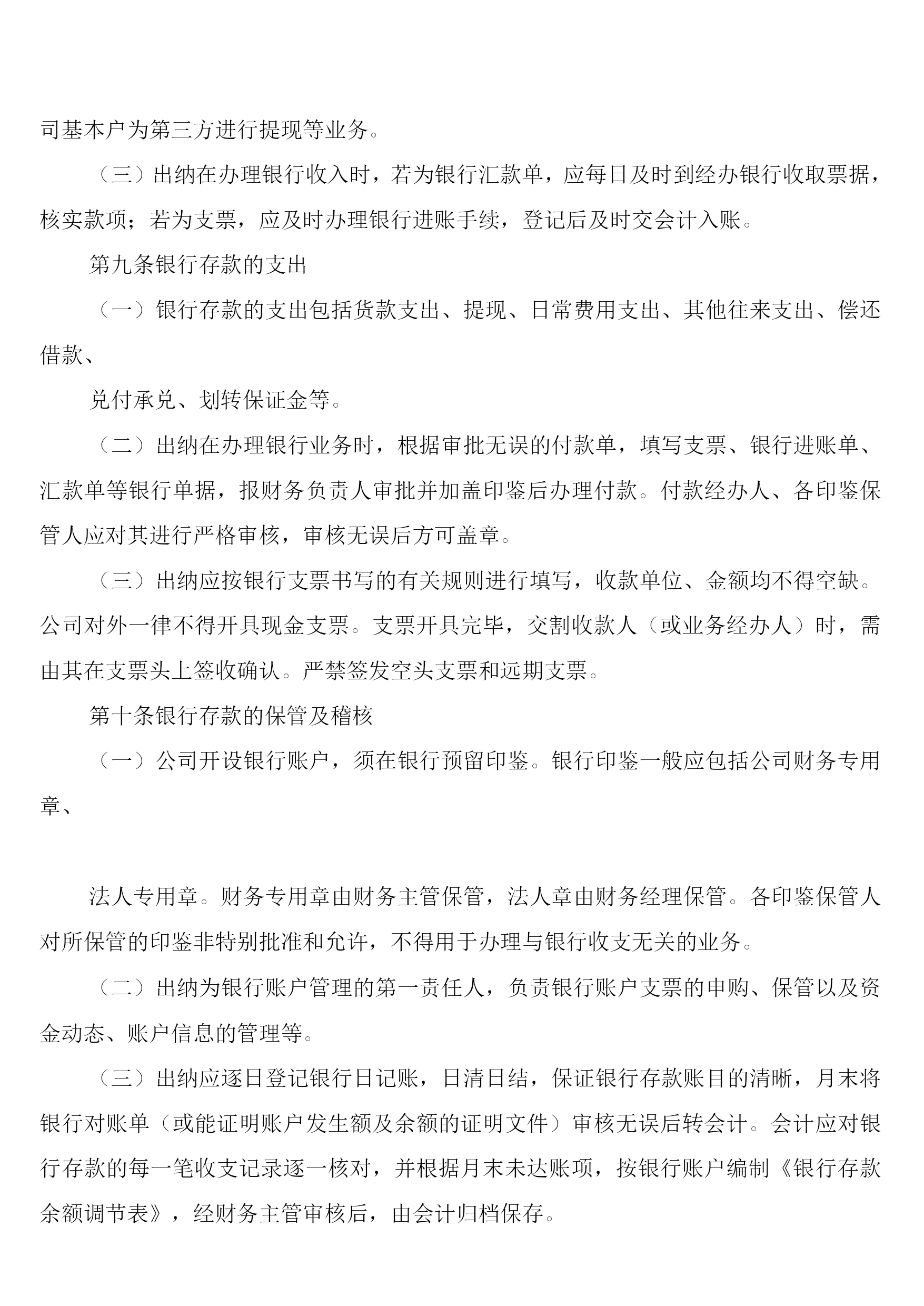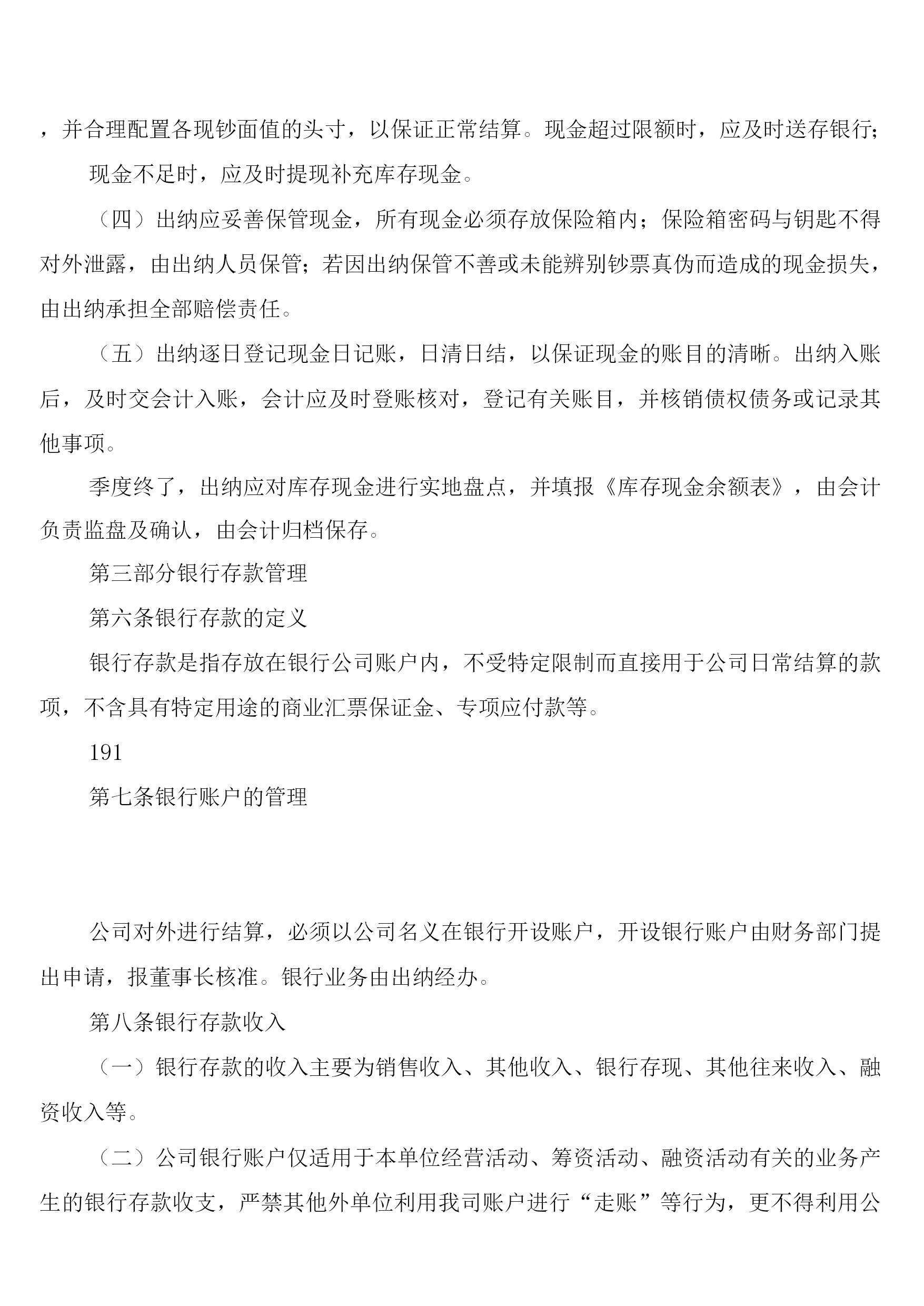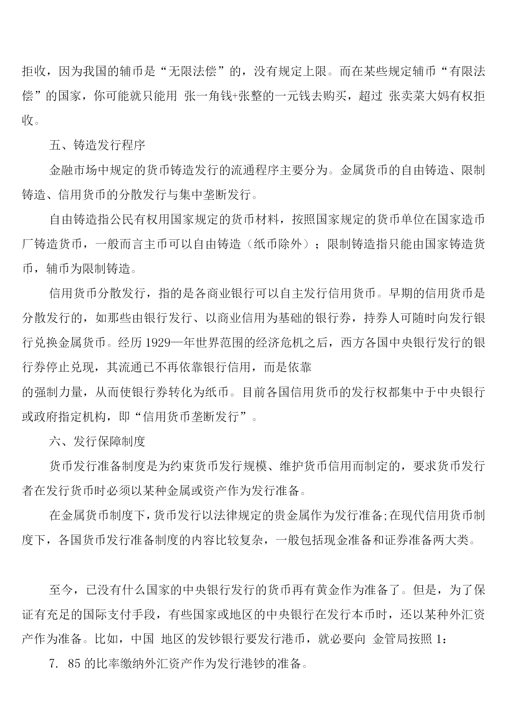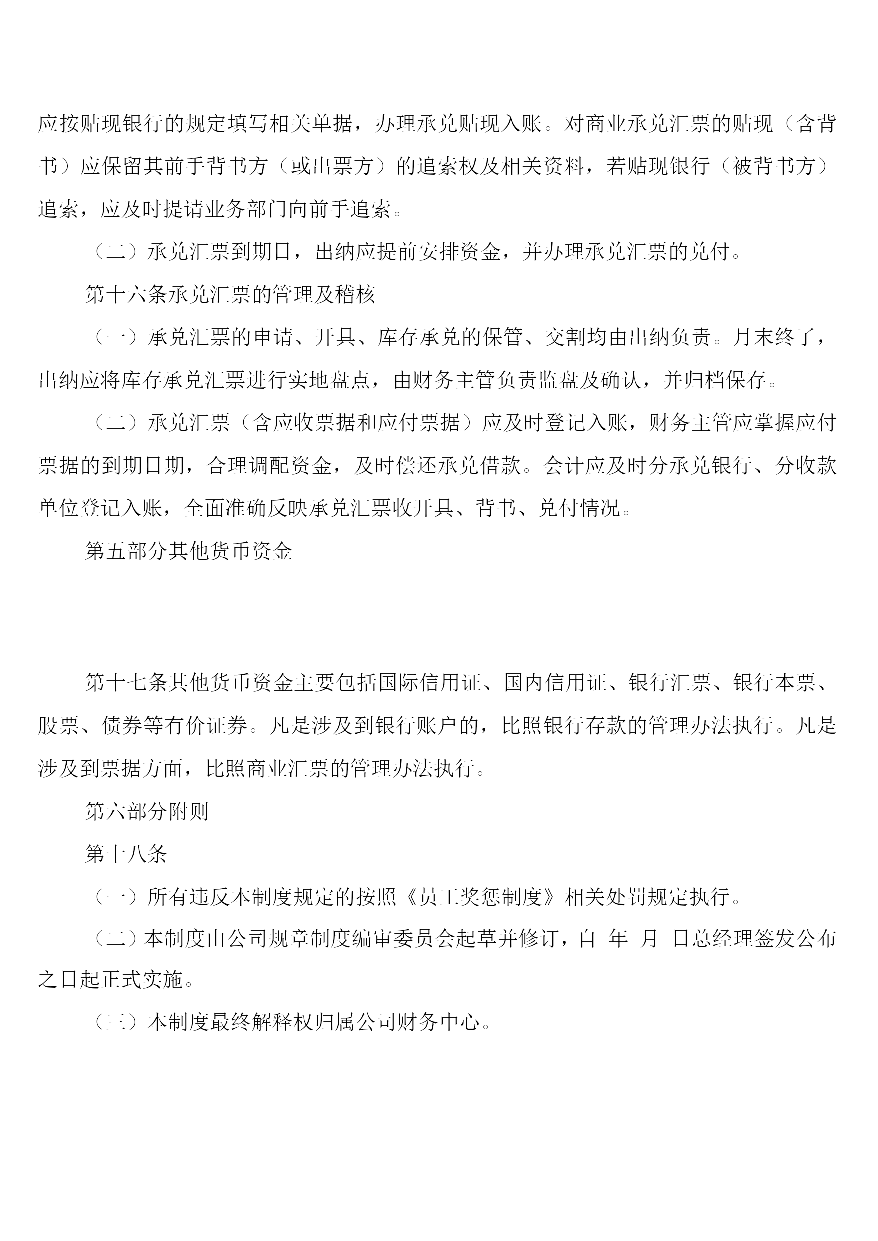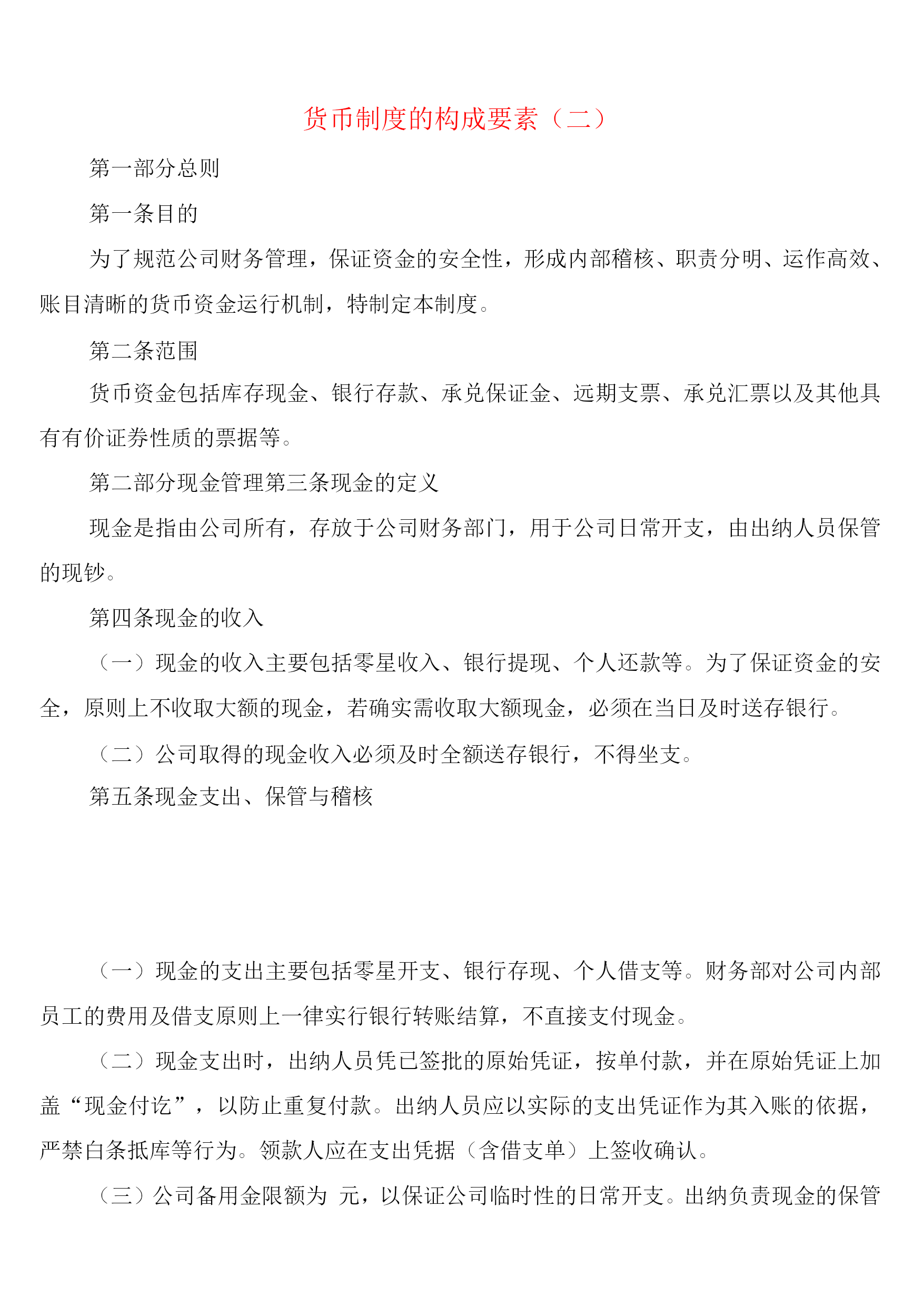 货币制度的构成要素一、货币材料货币材料即铸造货币所用的选材。一般而言,成为货币材料需满足这四个条件:价值较高、易于分割、易于保存、便于携带。世界上许多的国家曾经长期以金属作为货币材料,如铜、白银、黄金或其他。具体选择什么样的币材,取决于一个国家的资源禀赋及其经济发展水平。欲知中国历史上出现了哪些材料的货币,可《认识货币:中国货币简史》。二、货币单位货币单位是国家规定货币的名称。货币单位变现为国家规定的货币名称。在金属货币的条件下,需要确定货币单位名称和每一货币单位所包含的金属量。一旦规定了货币单位及其等分,就有了统一的价格标准,货币能更准确地发挥计价流通的作用。如秦朝的半两钱,24铢为1两,半两重12铢。三、通货种类进入流通领域的货币被称为“通货”,通货可区分为本位币和辅币。本位币是一国货币制度中的基本通货,它是国家法定的计价、结算货币单位,也称主币。如唯一法定货币为人民币,所以这时我们也把人民币称为本币。辅币,即辅助货币,是本位币单位以下的小额货币,主要用来辅助大面额货币的流通,供日常零星交易或找零之用。辅币一般多为金属铸造的硬币,也有些纸制的纸币。四、法偿能力本位币作为流通手段和支付手段,具有无限法偿能力,不管支付的金额有多大,债权人或者卖家都不能拒绝接受。而作为小额通货的辅币,在流通和支付过程中,超过了一定数量,债券人可以拒绝接受,因此辅币也称为“有限法偿”。但是有些国家也会通过立法决定辅币和本币一样具有无限法偿能力,比如中国。举个栗子。你去菜市场买菜,可以用张一角钱(相当于—元)去买,卖菜大妈不能拒收,因为我国的辅币是“无限法偿”的,没有规定上限。而在某些规定辅币“有限法偿”的国家,你可能就只能用张一角钱+张整的一元钱去购买,超过张卖菜大妈有权拒收。五、铸造发行程序金融市场中规定的货币铸造发行的流通程序主要分为。金属货币的自由铸造、限制铸造、信用货币的分散发行与集中垄断发行。自由铸造指公民有权用国家规定的货币材料,按照国家规定的货币单位在国家造币厂铸造货币,一般而言主币可以自由铸造(纸币除外);限制铸造指只能由国家铸造货币,辅币为限制铸造。信用货币分散发行,指的是各商业银行可以自主发行信用货币。早期的信用货币是分散发行的,如那些由银行发行、以商业信用为基础的银行券,持券人可随时向发行银行兑换金属货币。经历1929—年世界范围的经济危机之后,西方各国中央银行发行的银行券停止兑现,其流通已不再依靠银行信用,而是依靠的强制力量,从而使银行券转化为纸币。目前各国信用货币的发行权都集中于中央银行或政府指定机构,即“信用货币垄断发行”。六、发行保障制度货币发行准备制度是为约束货币发行规模、维护货币信用而制定的,要求货币发行者在发行货币时必须以某种金属或资产作为发行准备。在金属货币制度下,货币发行以法律规定的贵金属作为发行准备;在现代信用货币制度下,各国货币发行准备制度的内容比较复杂,一般包括现金准备和证券准备两大类。至今,已没有什么国家的中央银行发行的货币再有黄金作为准备了。但是,为了保证有充足的国际支付手段,有些国家或地区的中央银行在发行本币时,还以某种外汇资产作为准备。比如,中国地区的发钞银行要发行港币,就必要向金管局按照1:7.85的比率缴纳外汇资产作为发行港钞的准备。货币制度的构成要素(二)第一部分总则第一条目的为了规范公司财务管理,保证资金的安全性,形成内部稽核、职责分明、运作高效、账目清晰的货币资金运行机制,特制定本制度。第二条范围货币资金包括库存现金、银行存款、承兑保证金、远期支票、承兑汇票以及其他具有有价证券性质的票据等。第二部分现金管理第三条现金的定义现金是指由公司所有,存放于公司财务部门,用于公司日常开支,由出纳人员保管的现钞。第四条现金的收入(一)现金的收入主要包括零星收入、银行提现、个人还款等。为了保证资金的安全,原则上不收取大额的现金,若确实需收取大额现金,必须在当日及时送存银行。(二)公司取得的现金收入必须及时全额送存银行,不得坐支。第五条现金支出、保管与稽核(一)现金的支出主要包括零星开支、银行存现、个人借支等。财务部对公司内部员工的费用及借支原则上一律实行银行转账结算,不直接支付现金。(二)现金支出时,出纳人员凭已签批的原始凭证,按单付款,并在原始凭证上加盖“现金付讫”,以防止重复付款。出纳人员应以实际的支出凭证作为其入账的依据,严禁白条抵库等行为。领款人应在支出凭据(含借支单)上签收确认。(三)公司备用金限额为元,以保证公司临时性的日常开支。出纳负责现金的保管,并合理配置各现钞面值的头寸,以保证正常结算。现金超过限额时,应及时送存银行;现金不足时,应及时提现补充库存现金。(四)出纳应妥善保管现金,所有现金必须存放保险箱