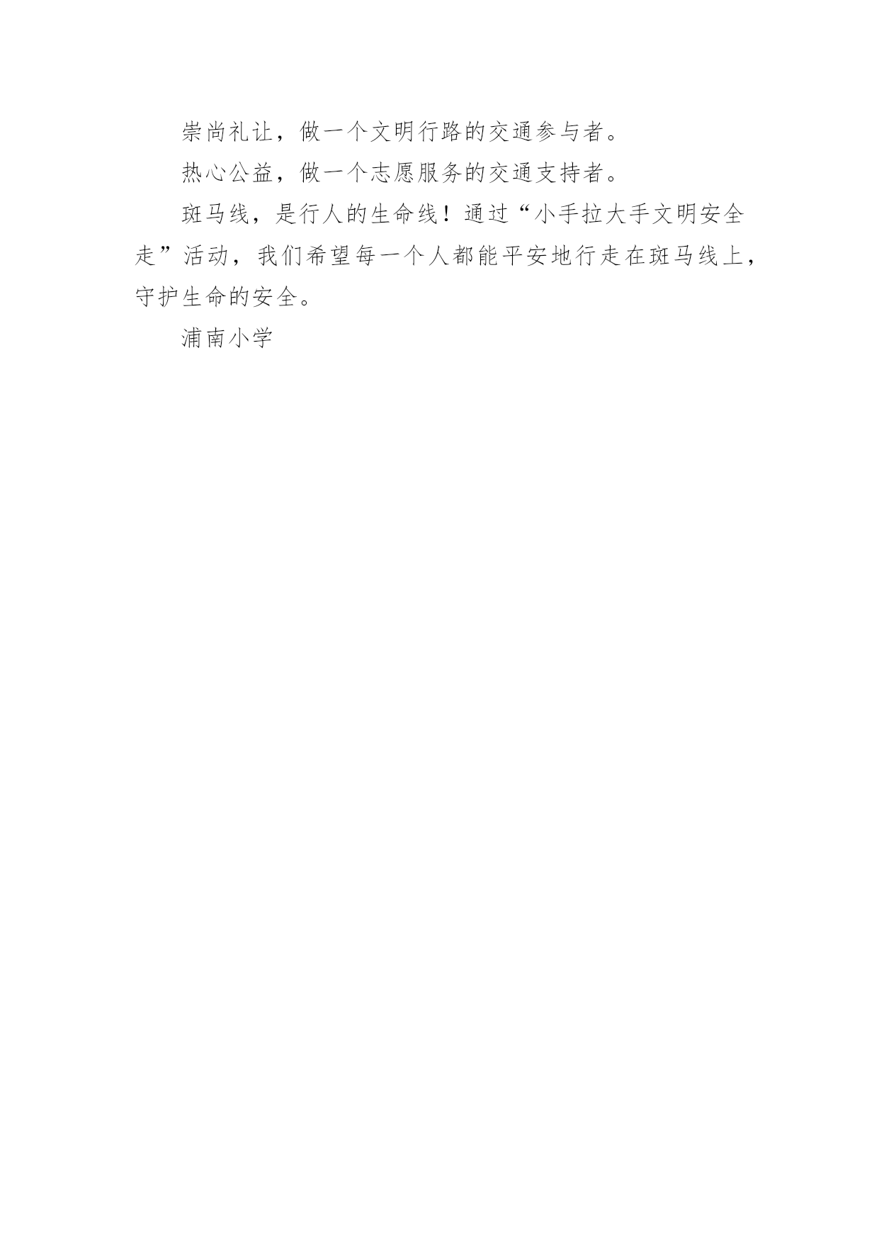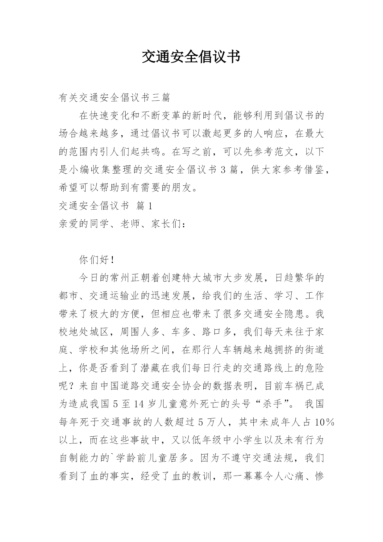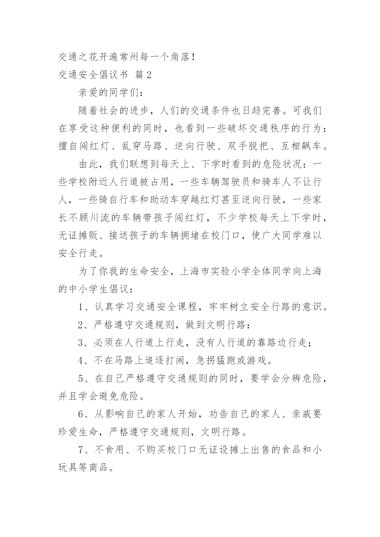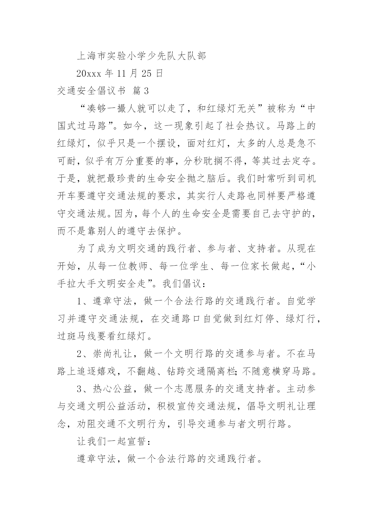 交通安全倡议书有关交通安全倡议书三篇在快速变化和不断变革的新时代,能够利用到倡议书的场合越来越多,通过倡议书可以激起更多的人响应,在最大的范围内引人们起共鸣。在写之前,可以先参考范文,以下是小编收集整理的交通安全倡议书3篇,供大家参考借鉴,希望可以帮助到有需要的朋友。交通安全倡议书篇1亲爱的同学、老师、家长们:你们好!今日的常州正朝着创建特大城市大步发展,日趋繁华的都市、交通运输业的迅速发展,给我们的生活、学习、工作带来了极大的方便,但相应也带来了很多交通安全隐患。我校地处城区,周围人多、车多、路口多,我们每天来往于家庭、学校和其他场所之间,在那行人车辆越来越拥挤的街道上,你是否看到了潜藏在我们每日行走的交通路线上的危险呢?来自中国道路交通安全协会的数据表明,目前车祸已成为造成我国5至14岁儿童意外死亡的头号“杀手”。我国每年死于交通事故的人数超过5万人,其中未成年人占10%以上,而在这些事故中,又以低年级中小学生以及未有行为自制能力的`学龄前儿童居多。因为不遵守交通法规,我们看到了血的事实,经受了血的教训,那一幕幕令人心痛、惨不忍睹的画面,那一个个因抢救无效而离我们远去的生命,最后留给我们的都是心灵上的创伤和对离去者无尽的痛惜,社会文明的乐章中也因此夹杂了许多不和谐的音符。我们在痛惜他们的同时,更加清醒地认识到:遵守交通法规,就是珍爱生命!市交通部门开展了整治交通陋习的活动,我们西横街小学是一所有着“交通小卫士”传统的学校,每一位西横街小学的学生更应成为文明交通的使者,让我们学习蒲公英那种蓬勃向上的精神,从文明行车、文明走路做起,从遵守交通法规做起,将文明交通的种子播撒到校园内外,播撒到常州每一个市民的心中,让我们都能携起手来呵护好这文明之花。为此,我们西横街小学“文明交通小卫士”向全校同学、老师和家长发出以下倡议:1、主动学习《中华人民共和国交通安全法》,知法守法。2、过马路时,应严格遵守交通规则,走人行横道或人行天桥,切勿闯红灯;3、请不要在人行道上骑自行车,以免撞上行人;请不要与机动车辆抢行,骑车时不要急转猛拐,低头疾驶;转弯时,应放慢车速,向后张望,伸手示意行驶方向,不要在机动车临近时突然转弯。4、同学们应克服麻痹和侥幸心理,时刻牢记交通法规,确保自己与他人的交通安全,行安全路,做文明人。我们坚信,只要携起手来,共同努力,就能营造出一个安全、文明、畅通的交通环境。大家都行动起来吧,让文明交通之花开遍常州每一个角落!交通安全倡议书篇2亲爱的同学们:随着社会的进步,人们的交通条件也日趋完善。可我们在享受这种便利的同时,也看到一些破坏交通秩序的行为:擅自闯红灯、乱穿马路、逆向行驶、双手脱把、互相飙车。由此,我们联想到每天上、下学时看到的危险状况:一些学校附近人行道被占用,一些车辆驾驶员和骑车人不让行人,一些骑自行车和助动车穿越红灯甚至逆向行驶,一些家长不顾川流的车辆带孩子闯红灯,不少学校每天上下学时,无证摊贩、接送孩子的车辆拥堵在校门口,使广大同学难以安全行走。为了你我的生命安全,上海市实验小学全体同学向上海的中小学生倡议:1、认真学习交通安全课程,牢牢树立安全行路的意识。2、严格遵守交通规则,做到文明行路:3、必须在人行道上行走,没有人行道的靠路边行走;4、不在马路上追逐打闹,急拐猛跑或游戏。5、在自己严格遵守交通规则的同时,要学会分辨危险,并且学会避免危险。6、从影响自己的家人开始,劝告自己的家人、亲戚要珍爱生命,严格遵守交通规则,文明行路。7、不食用、不购买校门口无证设摊上出售的食品和小玩具等商品。上海市实验小学少先队大队部20xxx年11月25日交通安全倡议书篇3“凑够一撮人就可以走了,和红绿灯无关”被称为“中国式过马路”。如今,这一现象引起了社会热议。马路上的红绿灯,似乎只是一个摆设,面对红灯,太多的人总是急不可耐,似乎有万分重要的事,分秒耽搁不得,等其过去定夺。于是,就把最珍贵的生命安全抛之脑后。我们时常听到司机开车要遵守交通法规的要求,其实行人走路也同样要严格遵守交通法规。因为,每个人的生命安全是需要自己去守护的,而不是靠别人的遵守去保护。为了成为文明交通的践行者、参与者、支持者。从现在开始,从每一位教师、每一位学生、每一位家长做起,“小手拉大手文明安全走”。我们倡议:1、遵章守法,做一个合法行路的交通践行者。自觉学习并遵守交通法规,在交通路口自觉做到红灯停、绿灯行,过斑马线要看红绿灯。2、崇尚礼让,做一个文明行路的交通参与者。不在马路上追逐嬉戏,不翻越、钻跨交通隔离栏;不随意横穿马路。3、热心公益,做一个志愿服务的交通支持者。主动参与交通文明公益活动,积极宣传交通法规,倡导文明礼让理念,劝阻交通不文明行为,引导交通参与者文明行路。让我们一起宣誓:遵章守法,做一个合法行路的交通践行者。崇尚礼让,做一个文明