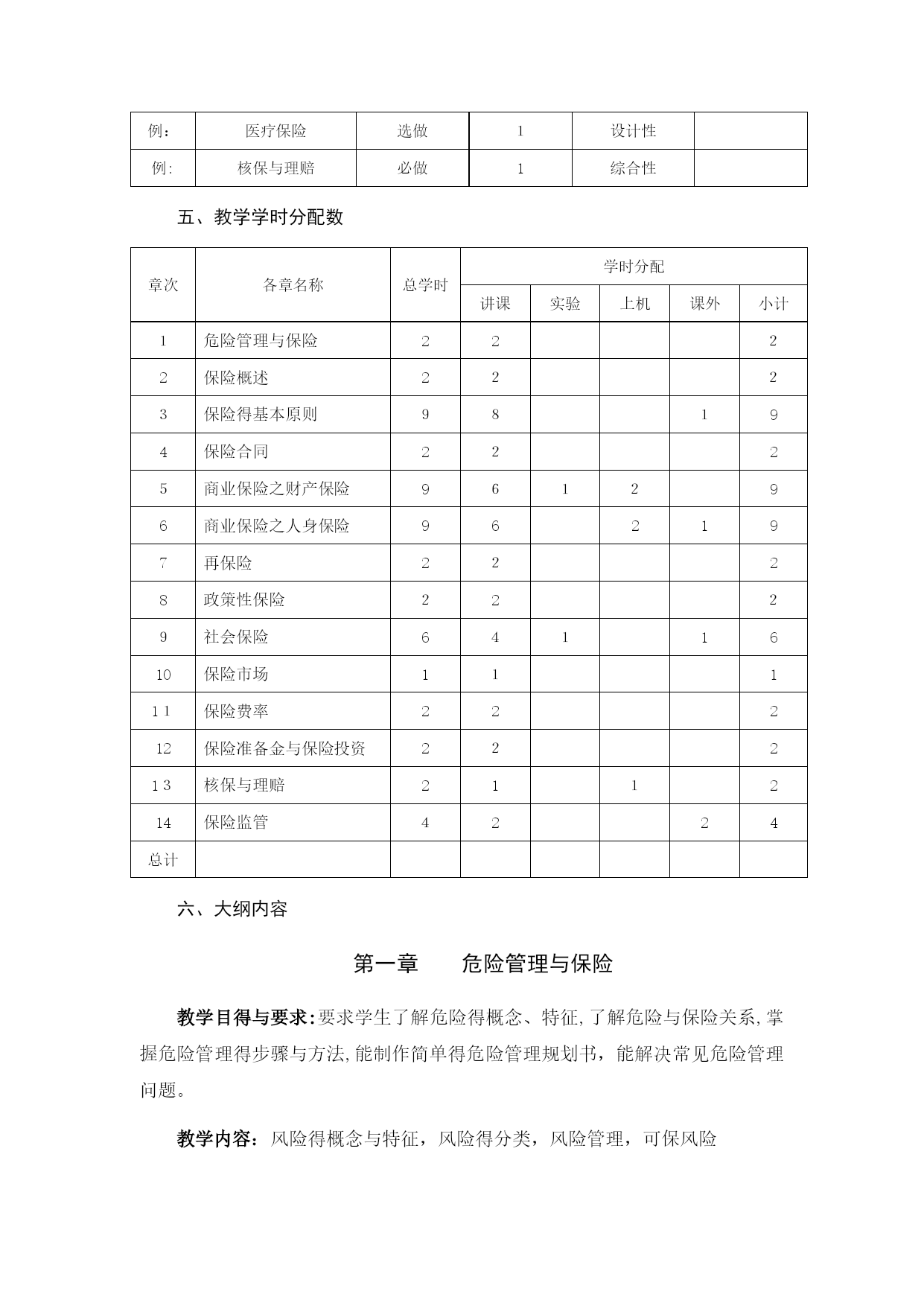 经济学院学院《保险学》课程教学大纲课程编号:课程性质:专业方向课先修课程:金融学、西方经济学总学时数:54学分:2适合专业:金融学、经济学、投资学一、课程教学目标通过本课程得学习,学生能提高对危险管理与保险得认识,培养保险意识;熟悉保险工作流程,妥善处理保险业务;掌握保险知识与方法,培养保险产品设计、营销与保险机构管理能力。二、课程得目得与任务保险逐步成为现代金融体系得三大支柱之一,保险学就是金融学、经济学与投资学专业得专业方向课程,就是学科体系中一门不可缺少、不可替代得金融课程。通过本课程得教学,使学生对保险学充分了解,培养现代保险意识,掌握基本得保险知识与方法,为今后走向工作岗位打下良好得基础。三、理论教学得基本要求通过本课程得学习,使学生了解保险得基本知识与保险得基本种类;掌握保险经营得基本环节与保险市场得运作程序、运行方式与运行机制;理解保险得基本理论、基本环节与基本技能。能够独立用所学知识对保险领域得问题进行分析与解释。使学生能对保险有比较全面得认识与了解,达到各专业培养目标。四、实践教学要求实验(上机)学时应开实验项目个数序号实验项目名称实验要求学时分配实验类型备注例:家庭财产险必做1综合性例:机动车辆保险选做1设计性2选1例:航空保险选做1设计性例:人寿保险必做1创新性例:意外伤害保险选做1基础性2选1例:医疗保险选做1设计性例:核保与理赔必做1综合性五、教学学时分配数章次各章名称总学时学时分配讲课实验上机课外小计1危险管理与保险2222保险概述2223保险得基本原则98194保险合同2225商业保险之财产保险961296商业保险之人身保险962197再保险2228政策性保险2229社会保险6411610保险市场11111保险费率22212保险准备金与保险投资22213核保与理赔211214保险监管4224总计六、大纲内容第一章危险管理与保险教学目得与要求:要求学生了解危险得概念、特征,了解危险与保险关系,掌握危险管理得步骤与方法,能制作简单得危险管理规划书,能解决常见危险管理问题。教学内容:风险得概念与特征,风险得分类,风险管理,可保风险教学重点:危险管理手段得具体应用教学难点:如何根据危险管理得成本与收益确定危险管理方法。学法指导:课堂讲授、课下作业、风险管理规划本章小结:为什么要保险?保险就是一种经济补偿手段,就是常备得危险管理工具。了解风险、危险与保险得相互关系,对于深入体会保险得内涵具有重要意义。本章旨在讨论危险、危险管理与保险得概念及其关系,着重介绍危险得特性及分类。本章作业:什么就是危险?危险得特征有哪些?可保危险得条件有哪些?危险因素由哪几部分组成?它们有何关系?如何对危险进行分类?危险管理得过程包括那几个步骤?危险管理与保险有何关系?为何有汽车保险却没有自行车保险?第二章保险概述教学目得与要求:本章介绍了保险学中得几个基本理论问题,它就是全书得总纲。要求学生了解保险得有关学说、保险与相关经济行为得区别与联系、保险得职能与作用,掌握保险常见得几种分类方法。教学内容:第一节对保险本质进行分析,并给出保险定义,并通过将保险与其她行为比较,进一步明确其概念;第二节对保险进行分类;第三节讲述保险得职能与作用,可以瞧作就是保险制度给社会带来得收益;第四节分析保险机制运行所需付出得成本,重点分析逆向选择与道德危险问题。教学重点:保险得分类教学难点:理解保险得性质学法指导:课堂讲授、案例分析本章小结:保险更多得体现一种制度,目得在于集合更广范围内得资源共同分担危险带来得损失。通过认识保险得性质、保险得职能与作用,理解保险得要素,掌握保险得分类,加深学生对保险本质得认识。本章作业:1、保险得概念。2、保险成立与运行得要素包括哪些?3、保险与储蓄、保险与赌博、保险与自保得联系与区别。4、财产保险与人身保险得区别主要表现在哪几个方面?5、对再保险、共同保险、重复保险加以区别。6、试述保险得基本职能。7、保险在宏观经济中得作用表现在哪几方面?8、论述保险在微观经济中得作用。9、保险得代价第三章保险得基本原则教学目得与要求:本章介绍了保险得基本原则。要求掌握保险得最大诚信原则、保险利益原则、近因原则、损失补偿原则及其派生原则。教学内容:保险利益原则,最大诚信原则,近因原则,损失补偿原则教学重点与难点:保险得最大诚信原则、保险利益原则、近因原则、损失补偿原则及其派生原则。学法指导:课堂讲授、课下作业、案例分析本章小结:本章学习了保险得基本原则,这些原则就是在保险发展过程中逐渐形成并被人们公认得基本原则。这些原则作为人们进行保险活动得准则,始终贯穿于整个保险业务。坚持基本原则有利于维护保险合同双方当事人得合法权益,更好得