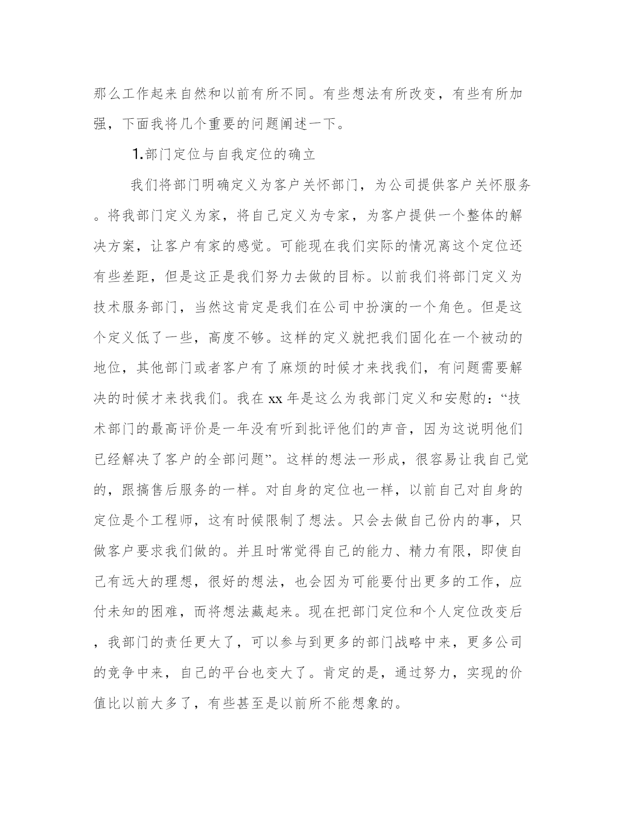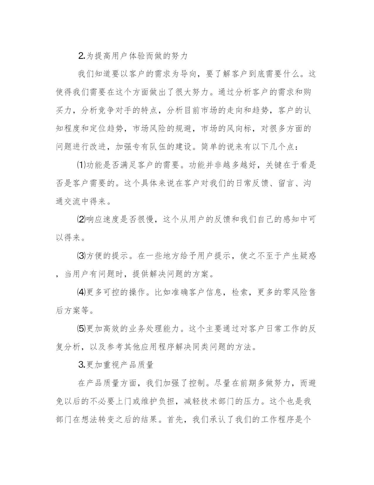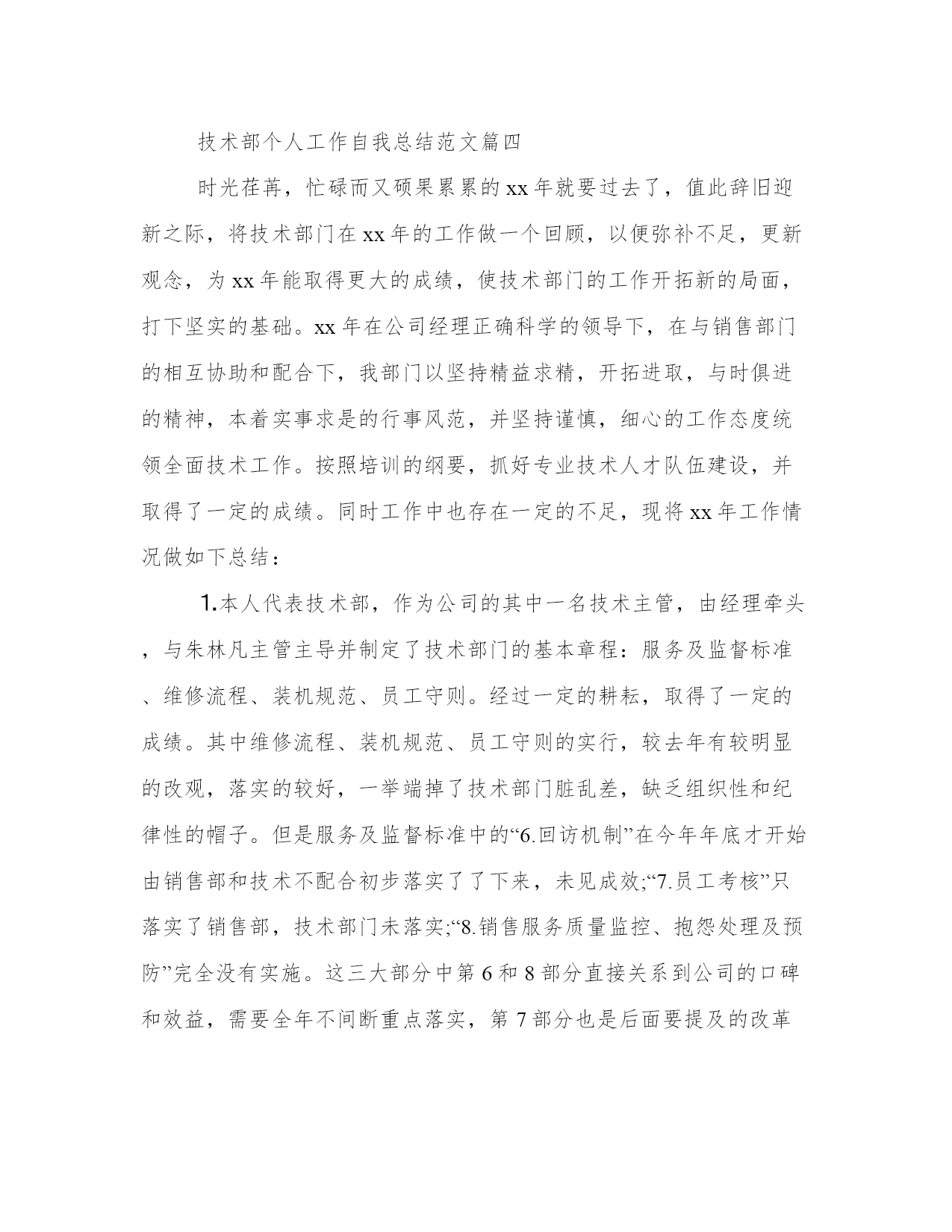技术部个人工作自我总结范文(14篇)总结是对过去一定时期的工作、学习或思想情况进行回顾、分析,并做出客观评价的书面材料,它可使零星的、肤浅的、表面的感性认知上升到全面的、系统的、本质的理性认识上来,让我们一起认真地写一份总结吧。那关于总结格式是怎样的呢?而个人总结又该怎么写呢?以下我给大家整理了一些优质的总结范文,希望对大家能够有所帮助。技术部个人工作自我总结范文篇一一、今年的主要工作:作为安装处的技术员、预算员,我按照公司及安装处的各项规章制度,按时按质地完成施工处的各项经营管理工作。1.技术管理:在过去的一年中,共参加6幢新建工程的图纸会审工作,并及时将会审内容通知施工人员。图纸会审后及时编制施工组织设计及技术交底,并下发至施工人员手中。在施工过程中,多幢新建工程及在建工程又多次按甲方要求对水电暖工程进行了协商变更,由于设计图纸对于满足使用功能上的欠缺,在施工过程中经常发生甲方临时的变更,对于能够在施工前签证的变更,都做到了及时准确,而部分不能在施工前签证的,在施工完成后,立即进行了签证。2.资料管理:对于在建、新建工程均按照工程的形象进度,及时、准确的收集材料合格证、进行材料试验、隐蔽工程验收、检验批质量验收、分部分项工程质量验收,并且及时找甲方驻土地工程师、监理工程师签字盖章,从而做到了施工资料各检验批、分项分部、隐蔽验收、材料试验的日期能够与实际施工日期相吻合,满足资料编制的要求。②.部分工程的监理盖章滞后,个别工程进场材料未做到及时向监理方报验。③.由于工程多、工作任务重使得个别工程资料不能与工程同步。④.个别工程出于防盗方面的考虑,暖气片、开关插座等均在门窗安装完成后施工,导致迟迟不能进行工程变更签证,从而影响了决算的编制工作。以上问题,虽不能影响工程质量及工程验收,但把“查找不足赶先进,立足根本争先进”作为工作方针的自己,总觉得没有尽到一个技术员、预算员的职责,在今后工作中自己将努力做到更好。二、今后的工作打算通过总结一年来的工作,找出工作中的不足,以便在以后的工作中加以克服,同时还需要多看书,认真学习好规范规程及有关文件资料,掌握好专业知识,提高自己的工作能力,加强工作责任感,及时做好个人的各项工作。总之,在今后的工作中,我将不断的总结与反省,不断地鞭策自己并充实能量,提高自身素质与业务水平,以适应时代和企业的发展,与公司共同进步、共同成长。技术部个人工作自我总结范文篇二转眼间,辞旧迎新、平凡而又不太忙碌的一年已到尽头,不知不觉时间过的真快,悄然无息、xx年的日历即将翻过去。伴随着时代前进的步伐、回首自己一年来经历的风雨路程、对自己工作中的不足、我做出如下工作总结:1、务实工作、自我加压、认真工作、有得有失。前半年、值得一庆,(威海文平和谐家园高层c5#楼)自己着手参加的第一个住宅工程已经竣工,我们主抓质量、进度使规定期间内竣工。同时也让我学会了一些施工工序、包括图纸的一些细部构造、及公司规定的一些细部做法、及技术资料的整理等。包括为人处事都有很大的改进,也为自己积累了一定的经验。主体施工完毕后、主要参与砌体的放线、拉结筋的植设、及最后砌体的验收等。后期主要和甲方人员及监理人员做分户验收、及室外污水管道的标高抄测。泛泛的工作岗位维护的是一团氛围。做为一名新手、同样也出现了很多的错误、(楼层外飘窗的砌筑)造成返工、但我会汲取教训、认真熟读图纸、问题考虑全面。坚决不会在让同样的问题出现。后半年、新的工程开工、位于威海市高技区、楼座为三栋小高层a1#a2#a3#、三栋多层a4#a5#a6#及一个大车库总面积由于58000m2由于开始技术人员人手紧张、相当忙碌、虽说忙碌、但很快乐、对自己有很大的信心。因为这是我第一个从基础来挖到最后封顶的工程、所以我很期待。2、工作要有责任心,合理安排工作。在这里更让巩固加深了上半年所学到的知识。更明白了:趁年轻多学习的道理。业余时间我会拿出一定的时间多去看规范、图集。唯一不足就是:工作没有计划性。所谓有失必有得,总结一年的工作后,我认识到工作计划的重要性,合理的安排工作可以大力的提高工作效率,使工作更好的顺利进行。数据的统计要从实际出发,以计算量为参考,经多方讨论确认后,再进行数据上报,以确保数据的准确性。做事要有责任心,发扬三勤管理精神,多看、多问、多查,只有这样才可以更好的发现工程中的问题并及时采取方法解决问题。在今后的施工过程中不能一味的按照图纸进行施工还要考虑到现场实际情况,有什么问题及时向领导汇报,只有这样才可以减少施工问题及返工现象的发生。最后,不管做什么事都应该有正确积极的态度,所谓态度决定一切。吸取xx年的失败、为了我能够在xx年取得更好的成绩、减少返工及维修使自己自我完善。我做出如下建议:1、xx年开春将会进行