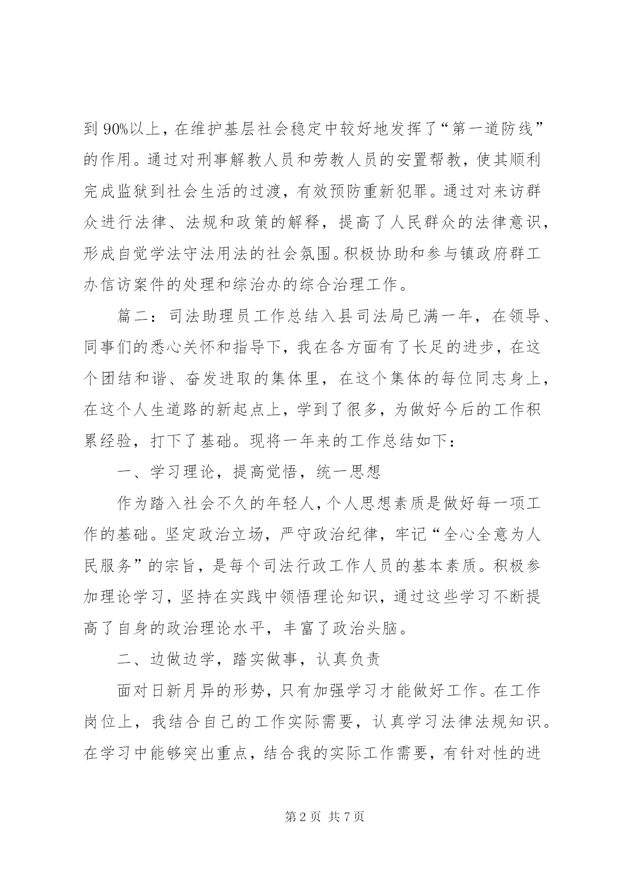 第PAGE\*Arabic\*MERGEFORMAT7页共NUMPAGES\*MERGEFORMAT7页司法助理员年终总结篇一:司法助理员工作总结20**年,在领导的关怀下,组织的帮助下,同事们的团结下,我不断加强学习、努力工作,积极适应角色转变,思想素质、工作能力都有了一定的提高,现就本年度工作总结如下:一、不断加强学习,努力提高自己的政治素质和业务水平。一是不断加强理论学习。积极参加局党组组织的政治理论学习,通过学习和参加党内的一系列活动,使我进一步加深了对“三个代表”重要思想的认识和理解,深入学习实践科学发展观。二是不断加强业务知识学习。我学的并非法律专业,基层司法工作对于我是一个很大的挑战,司法局领导和同事们都有着丰富的基层工作经验,我虚心向他们学习工作中的经验和有效的工作方法,不断加强法律知识的学习,努力使自己尽快转变“门外汉”的角色,以胜任自己的工作。在领导和同事们的帮助下,自己的业务知识得到不断充实,工作能力也有了长足进步。二、踏踏实实工作,努力完成上级和领导交给的各项任务。在工作中,我严格要求自己,以务实的作风做好自己的本职工作,把每一项工作都落到实处,决不落空。不断加强对人民调解、安置帮教、社区矫正、法律服务等司法所日常业务和法律条文及常用公文写作等方面的学习。在所长的指导下参与到矛盾纠纷的调解中,去年通过全所人员的努力,××镇矛盾纠纷调解成功率达到90%以上,在维护基层社会稳定中较好地发挥了“第一道防线”的作用。通过对刑事解教人员和劳教人员的安置帮教,使其顺利完成监狱到社会生活的过渡,有效预防重新犯罪。通过对来访群众进行法律、法规和政策的解释,提高了人民群众的法律意识,形成自觉学法守法用法的社会氛围。积极协助和参与镇政府群工办信访案件的处理和综治办的综合治理工作。篇二:司法助理员工作总结入县司法局已满一年,在领导、同事们的悉心关怀和指导下,我在各方面有了长足的进步,在这个团结和谐、奋发进取的集体里,在这个集体的每位同志身上,在这个人生道路的新起点上,学到了很多,为做好今后的工作积累经验,打下了基础。现将一年来的工作总结如下:一、学习理论,提高觉悟,统一思想作为踏入社会不久的年轻人,个人思想素质是做好每一项工作的基础。坚定政治立场,严守政治纪律,牢记“全心全意为人民服务”的宗旨,是每个司法行政工作人员的基本素质。积极参加理论学习,坚持在实践中领悟理论知识,通过这些学习不断提高了自身的政治理论水平,丰富了政治头脑。二、边做边学,踏实做事,认真负责面对日新月异的形势,只有加强学习才能做好工作。在工作岗位上,我结合自己的工作实际需要,认真学习法律法规知识。在学习中能够突出重点,结合我的实际工作需要,有针对性的进行学习。用法律规范自己的一言一行,严格依法办事,通过自己的工作展现基层司法行政工作人员的形象。通过各种途径来提高自己的学习热情,变被动学习为主动学习。学习中我坚持理论与实践相结合的方法,做到相互促进,互有提高。我经常向单位业务强、经验丰富的同志学习,不懂就问,不断总结工作中的成败得失。三、严于律己,尊规守约,团结友爱平时坚持按点上下班,严格执行请销假制度,坚决不做任何违规违纪的事情。能够服从领导、尊重同志、顾全大局。工作中能够服从各级领导的安排,不讲客观条件、不消极怠工,有问题能与领导及时勾通。我本着老老实实做人、踏踏实实做事的原则,工作中,不计较个人得失,尊重同志,乐于助人,努力营造和谐的工作环境。一切工作能够以大局为重、以全局利益为重,坚决贯彻个人利益服从于集体利益的原则,以高度的责任感高标准地完成好自己的本职工作。四、认真做好各项司法行政工作做好1、全面开展人民调解工作人民调解工作是化解基层纠纷和矛盾的“第一道防线”在基层工作中发挥着重要作用。在20**年里,我,本着“群众利益无小事”的信念,共参与了20多起的矛盾调处,其中达成书面协议的有10起。2、扎实推进普法教育工作20**年是“六五”普法的开局之年,打好开局之年的基础对未来几年的普法工作至关重要。全年,我共参与了普法宣传6次,单独参与了法律进学校、进社区的活动,发放普法宣传材料300余份。3、努力抓好社区矫正和安置帮教工作社区矫正和安置帮教工作是基层司法行政工作当中的两项重点。在20**年里,我开始全面接受这两项工作,我根据上级文件的精神和指示,积极做好这两项工作,做到了“一人一档”档案齐全,确保社区矫正对象不、重不脱不漏,所有监管对象没有没有重新犯罪。4、提供优质法律服务工作法律援助是司法行政部门组织实施的“希望工程”是,切实维护社会弱势群体合法权益的一种保障制度。20**年,我完成施官司法所全年法援咨询接待当中的70%,并且参与了施官司法所承办的3起法援案件。一年来,我在学习和工作中逐步成长、成熟,取得了一些的成绩,