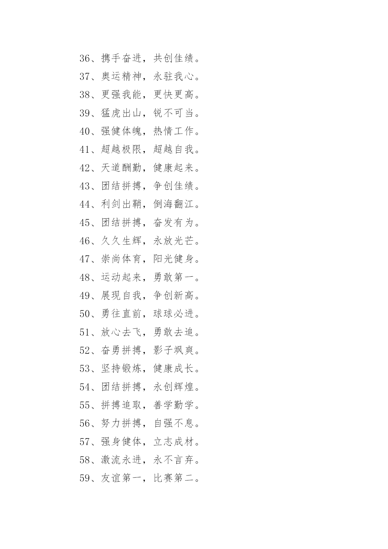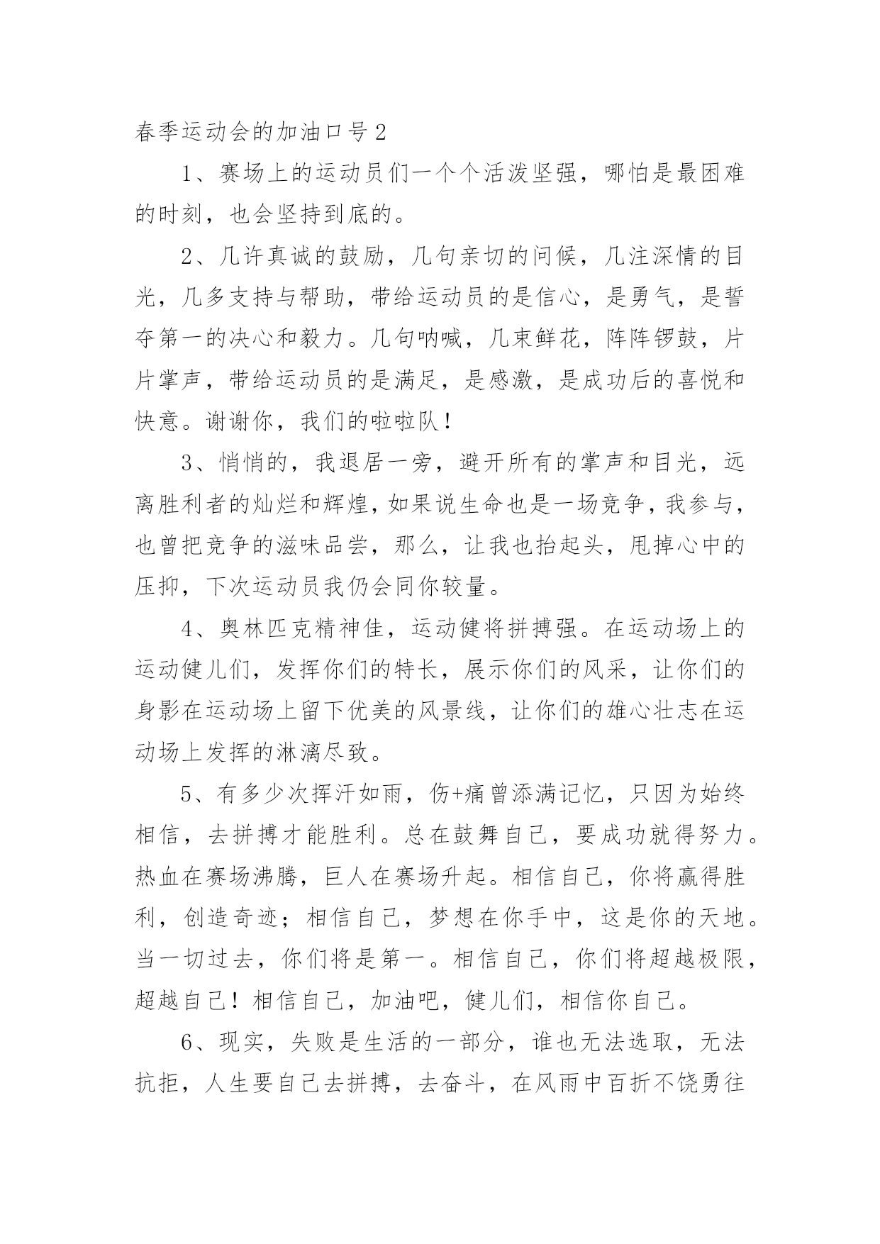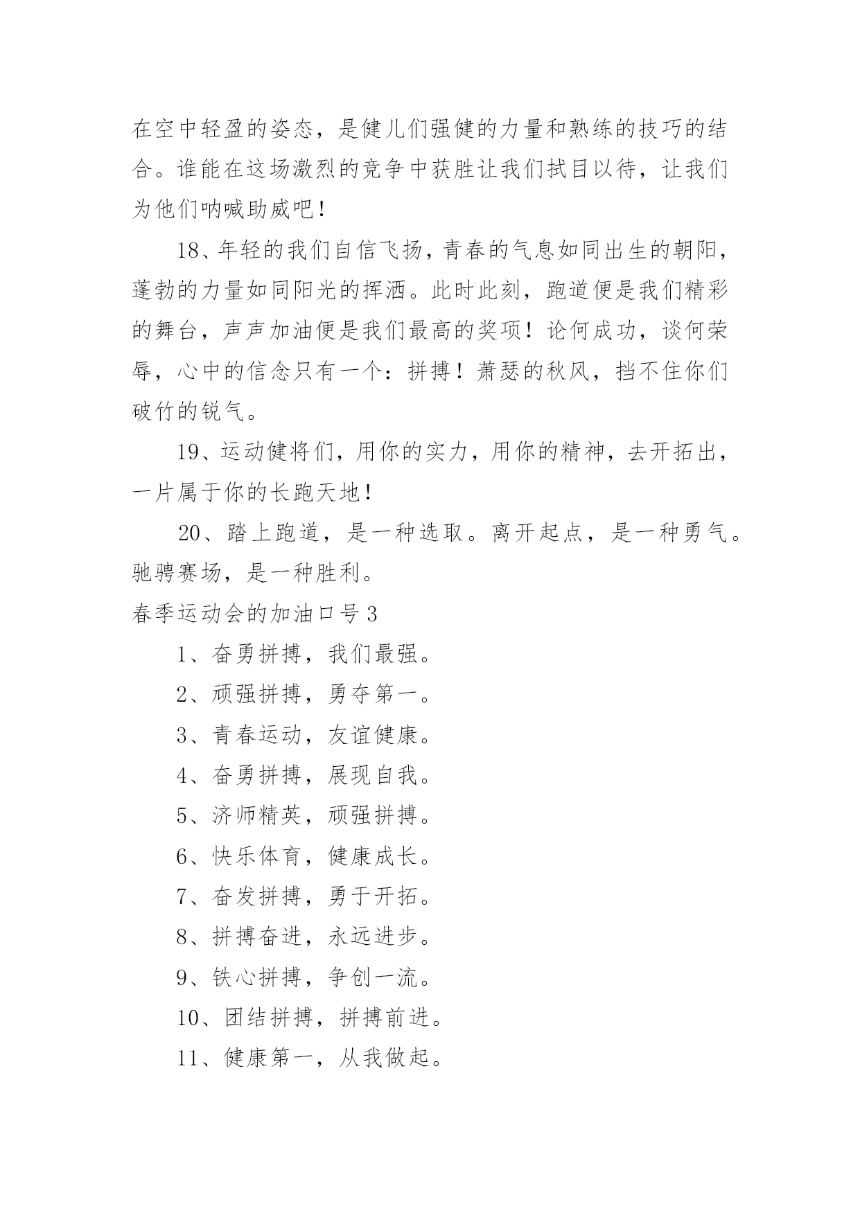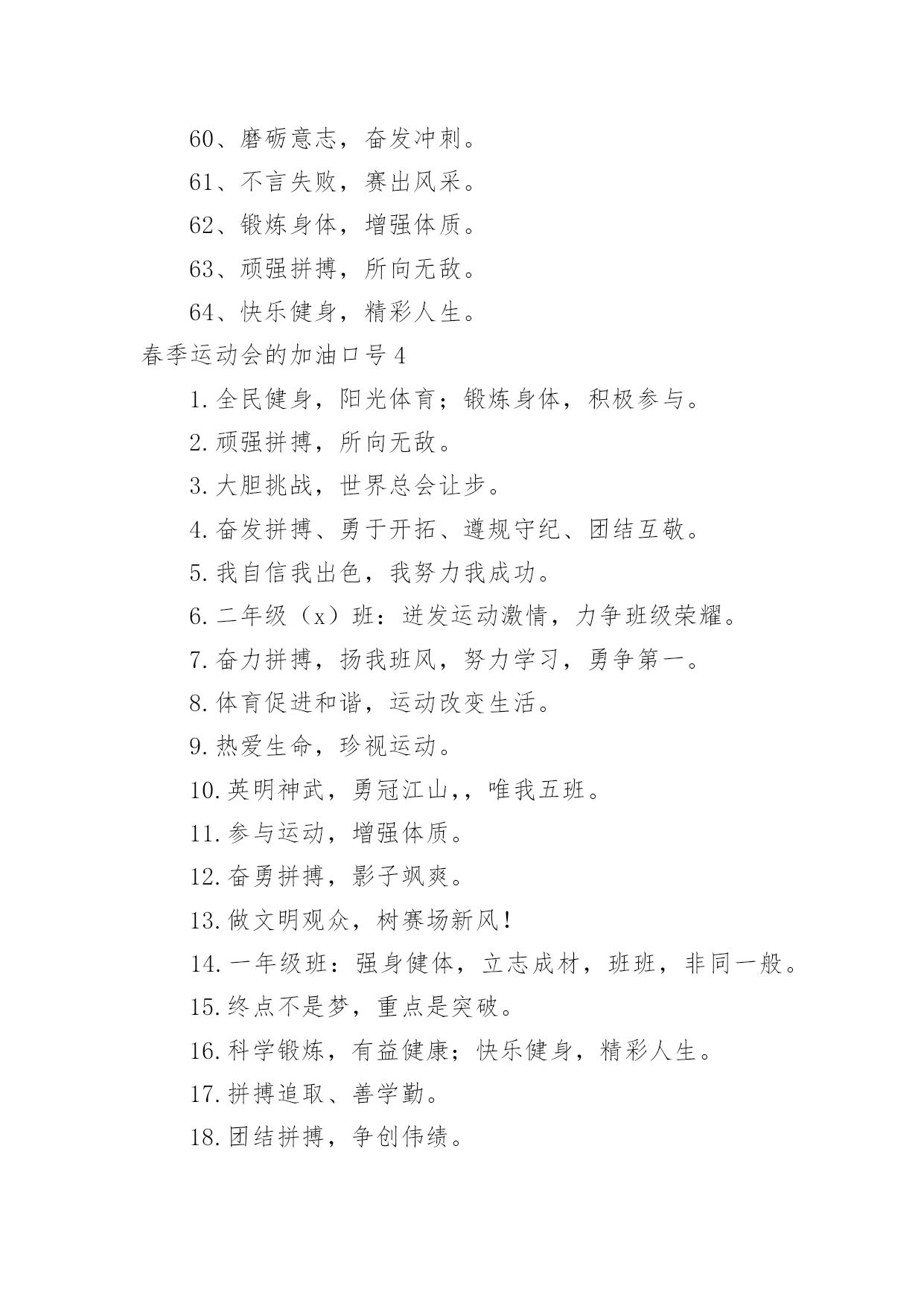 春季运动会的加油口号春季运动会的加油口号无论是身处学校还是步入社会,大家对口号都再熟悉不过了吧,口号是供口头呼喊的有纲领性和鼓动作用的简短句子。那些被广泛运用的口号都是什么样子的呢?下面是小编为大家整理的春季运动会的加油口号,仅供参考,大家一起来看看吧。春季运动会的加油口号11、泥泞的路走过无数,累了,告诉自己:快了,再坚持一会儿。身上的伤流出血来,疼了,告诉自己:别哭,会好的。摔到了,告诉自己:快爬起来,世上很少有坦途。2、今日的你们英姿飒爽,今日的你们朝气蓬勃,今日的你们一马当先。相信自己,你是最棒的!不要放弃,不要气馁。成功永远属于你们。米运动员啊!加油啊!3、在枪声响起的一刹那你如箭在弦飞刺而出,在跑道的尽头你奋力的一掷中你让铅球落在最远点是你们——让我们知道了什么是拼搏,是们是激情是们是荣耀加油吧,让所有的人目击你们胜出的.那刹那瞬间,让所有的人为你们而骄傲。4、那里是跳高/跳远比赛,我们的运动员们,他们灵活的就好像羚羊一般,强劲的弹跳力就好像我们祖国强劲的经济发展一样,令我们赞叹不已,让我们为他们鼓掌和喝彩。5、超越对手,超越自我,是我们的目标,是我们的信念,在清凉的初冬,在喧嚣的田径场上,。你们点燃了似火的热情,,无论成败,我们都为你们感到自豪,你们永远是我们的骄傲!6、天空中有道彩虹,它在雨后的天空中美丽夺目,生命中也有一道彩虹,那就是运动,他让生命丰富多彩。充满了生机青春的我们,青春的生命,青春的运动,使我们的心放飞年轻,没有失败,无论成败,运动的我们就是生活的彩虹。7、昨日的辉煌与失败已成为过去,今日又是一个崭新的看似是,高二班的同学们,你们个个朝气蓬勃,英姿煞爽,加油!让我们一齐偶写出关于青春青春的赞歌,展示青春的活力和风采!许一个完美的心愿,祝你快乐连连没送一份美妙的感觉祝万事圆圆,写一句股东的话语,祝你胜利!8、广阔的绿茵场,是为你们搭建的舞台。张扬吧,年轻的心,我们将为你永远喝彩!9、今天的你们英姿飒爽,今天的你们一马当先。不要放弃,不要气馁。相信自己,你是最棒的!你永远都是我们心中的体育健儿!加油!10、望着远方红色的终点线,那是汗水铺成的路,泪水堆成的山,平时的努力与奋战,不就为这一瞬间,于是你们用尽全身力气,冲向那决定命运的红线,你胜利了,耳旁飘来了同学们的欢呼与赞叹。春季运动会的加油口号21、赛场上的运动员们一个个活泼坚强,哪怕是最困难的时刻,也会坚持到底的。2、几许真诚的鼓励,几句亲切的问候,几注深情的目光,几多支持与帮助,带给运动员的是信心,是勇气,是誓夺第一的决心和毅力。几句呐喊,几束鲜花,阵阵锣鼓,片片掌声,带给运动员的是满足,是感激,是成功后的喜悦和快意。谢谢你,我们的啦啦队!3、悄悄的,我退居一旁,避开所有的掌声和目光,远离胜利者的灿烂和辉煌,如果说生命也是一场竞争,我参与,也曾把竞争的滋味品尝,那么,让我也抬起头,甩掉心中的压抑,下次运动员我仍会同你较量。4、奥林匹克精神佳,运动健将拼搏强。在运动场上的运动健儿们,发挥你们的特长,展示你们的风采,让你们的身影在运动场上留下优美的风景线,让你们的雄心壮志在运动场上发挥的淋漓尽致。5、有多少次挥汗如雨,伤+痛曾添满记忆,只因为始终相信,去拼搏才能胜利。总在鼓舞自己,要成功就得努力。热血在赛场沸腾,巨人在赛场升起。相信自己,你将赢得胜利,创造奇迹;相信自己,梦想在你手中,这是你的天地。当一切过去,你们将是第一。相信自己,你们将超越极限,超越自己!相信自己,加油吧,健儿们,相信你自己。6、现实,失败是生活的一部分,谁也无法选取,无法抗拒,人生要自己去拼搏,去奋斗,在风雨中百折不饶勇往直前。流泪不是失落,徘徊不是迷惑,成功属于那些战胜失败,坚持不懈,勇于追求梦想的人。7、超越对手,超越自我,是我们的目标,是我们的信念,在清凉的初冬,在喧嚣的田径场上,。你们点燃了似火的热情,,无论成败,我们都为你们感到自豪,你们永远是我们的骄傲!8、青春是不老的誓言,飞扬是年轻的梦想,金色的十月,让我们在这长长的跑道上青春飞扬,现出飒爽的风姿,亮出真我的风采,带上同学们的热情,载着同伴们的希望,背负老师的嘱托,在这活力四射的校园里,放飞你的青春活力和运动激情。9、加油吧,运动健儿们!阵阵有力的步伐,声声有劲的呐喊,运动场上洒下我们青春的点点滴滴。旗摇摇,鼓声声,那里挡不助的是青春活力;枪声响起,“预备起跑”,挡不助的是健儿们如火般的气势。10、人生的路,有坦途,也有坎坷,做过的岁月,有欢笑,也有苦涩,泪水告诉我一个跌倒的故事,汗水使我多了一份沉重,几多成熟。理想毕竟不一样。11、在同一片晴空下,我们相聚一起,或欢乐、或失落、或兴奋、或悲伤,尽数写在我们的脸旁。我们曾一起悲伤,在那个败北的沙坑上;我们也一起击掌,在这红色的跑道上。在同一片晴空下,我们拼搏