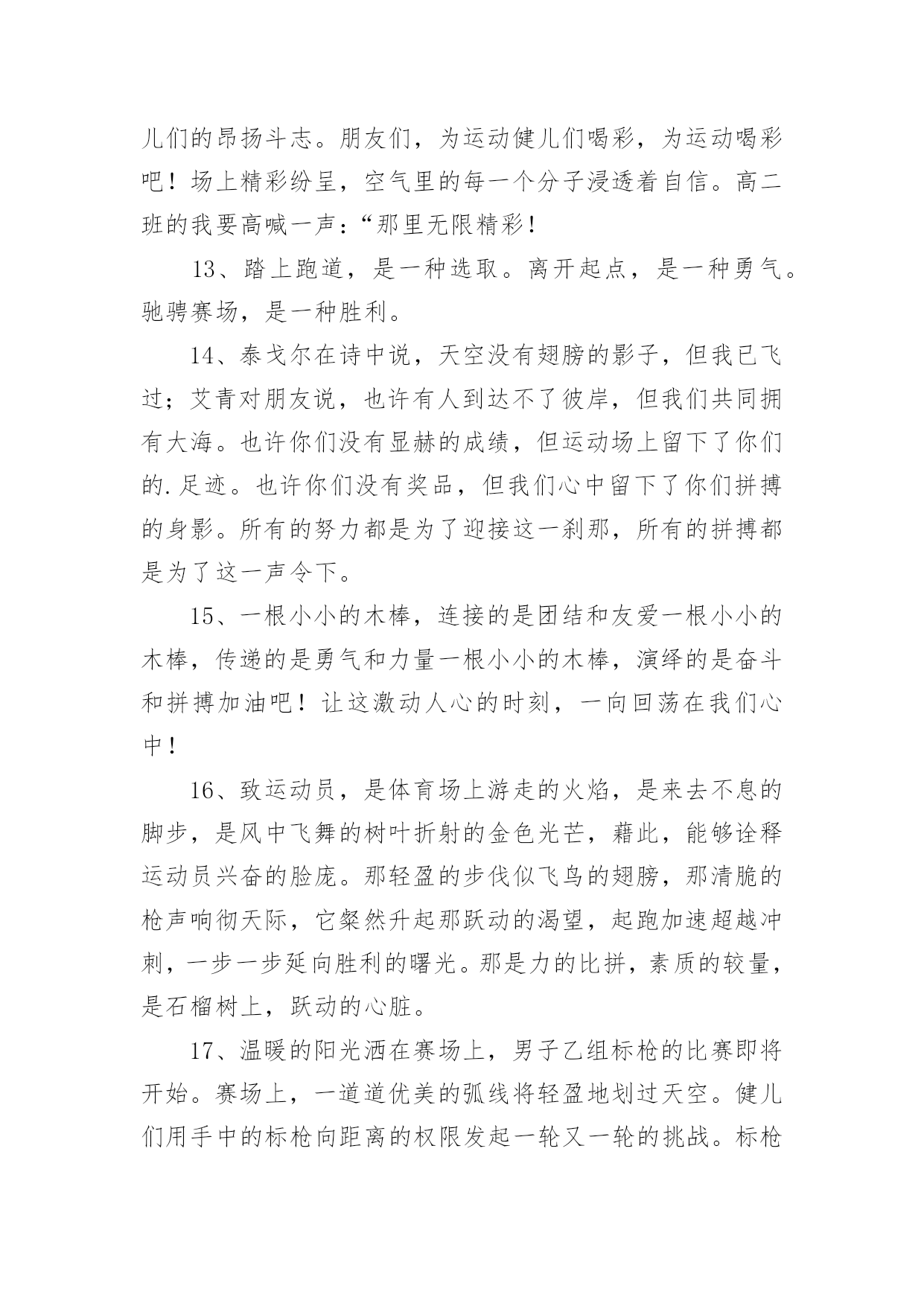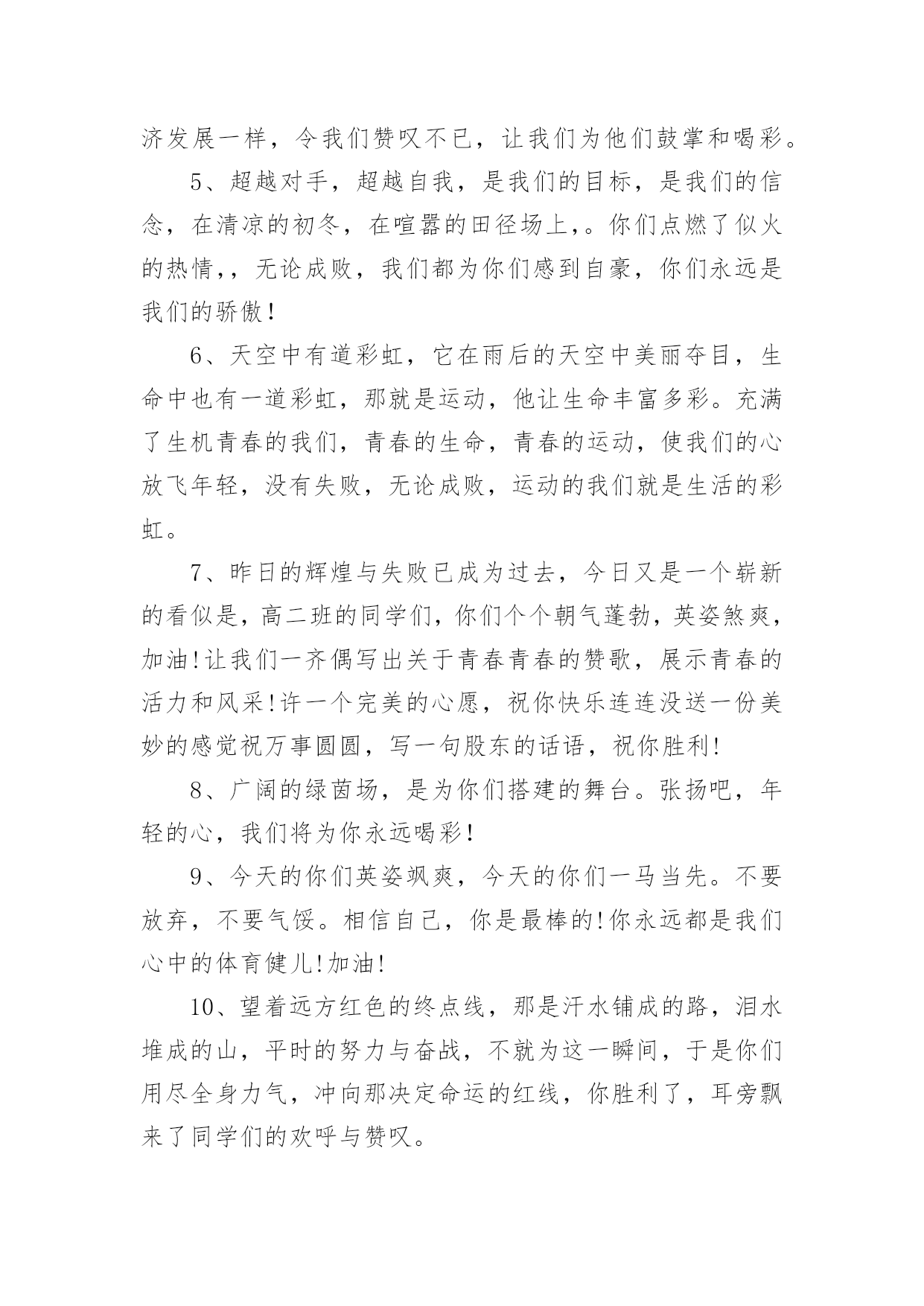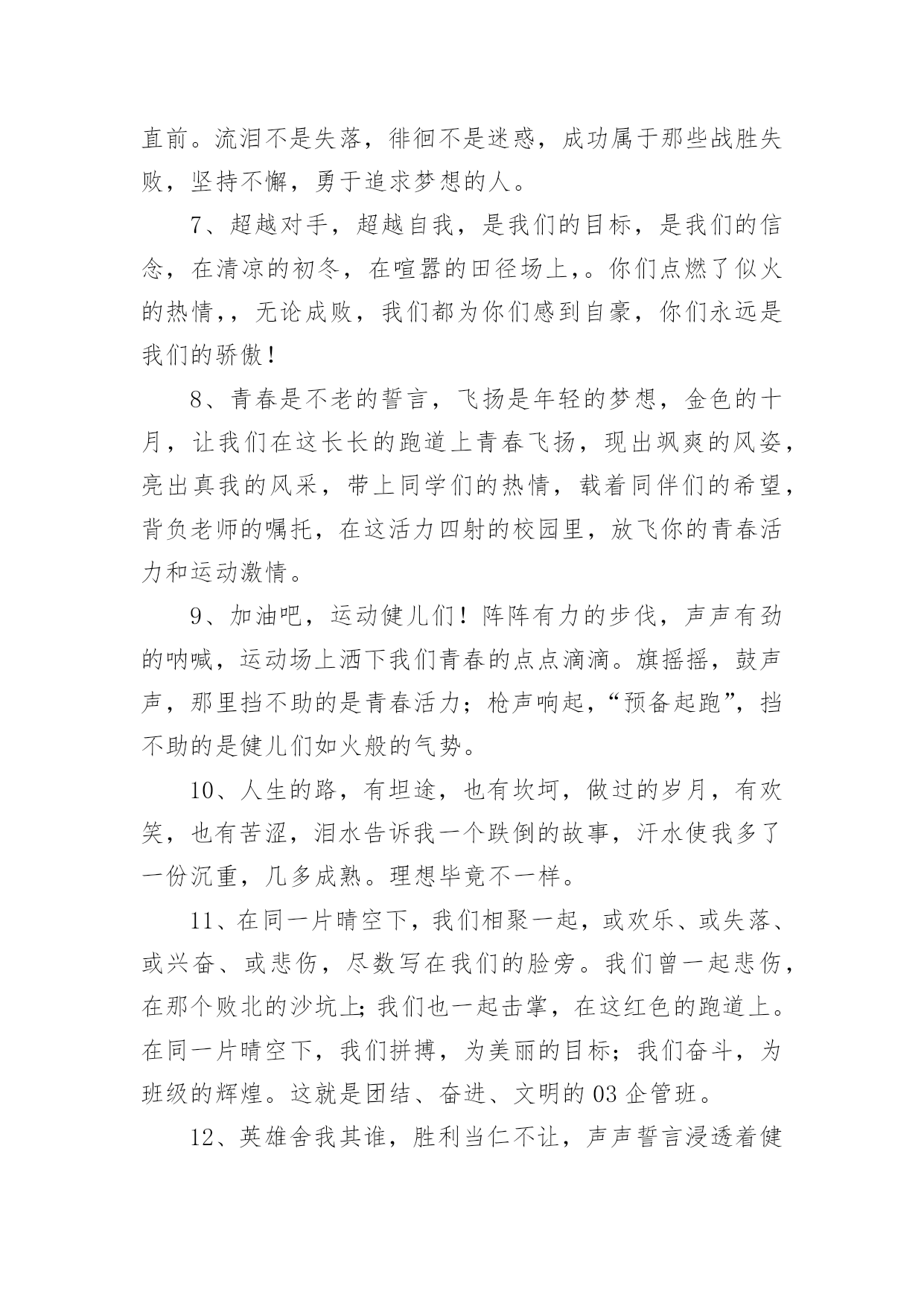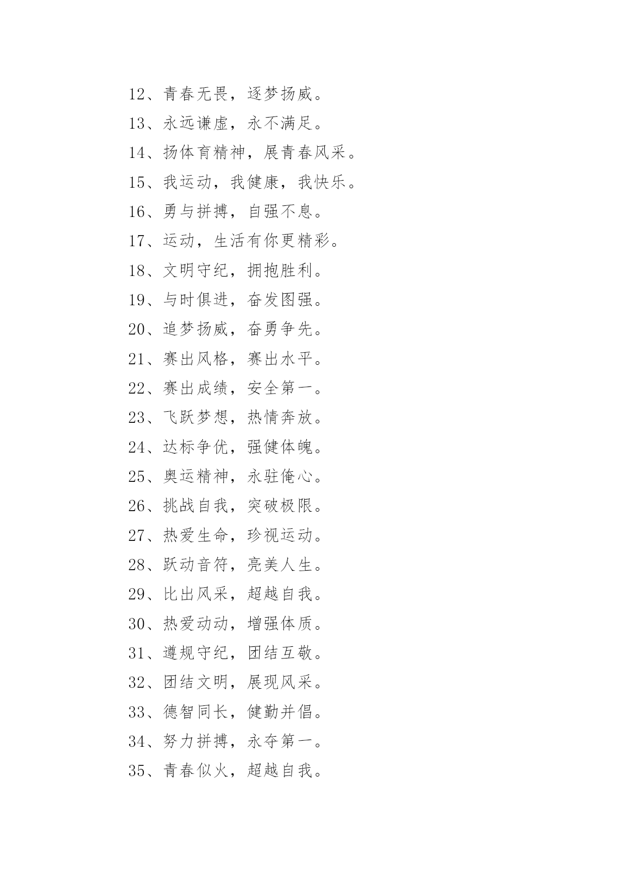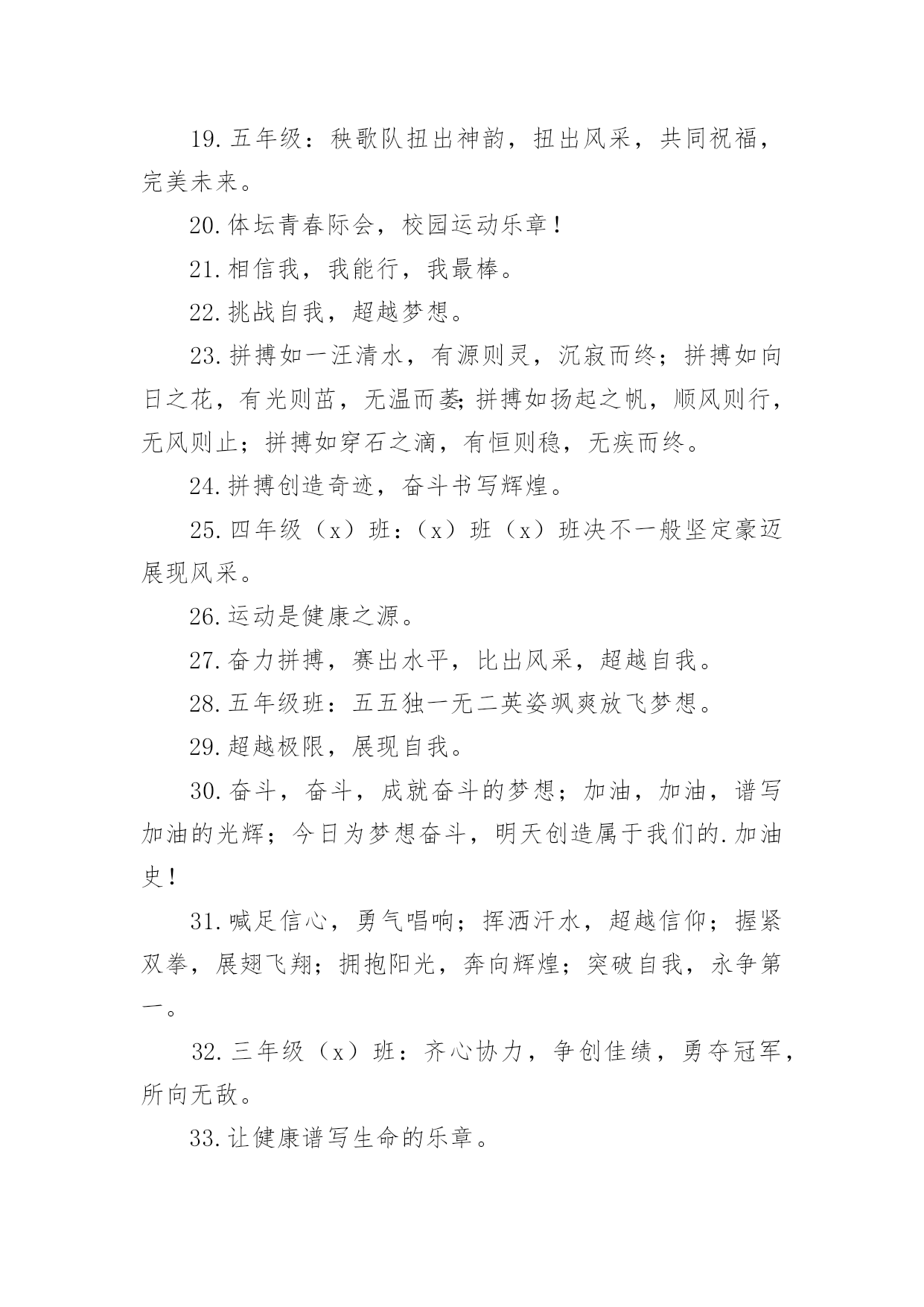 春季运动会的加油口号春季运动会的加油口号无论是身处学校还是步入社会,大家对口号都再熟悉不过了吧,口号是供口头呼喊的有纲领性和鼓动作用的简短句子。那些被广泛运用的口号都是什么样子的呢?下面是小编为大家整理的春季运动会的加油口号,仅供参考,大家一起来看看吧。春季运动会的加油口号11、泥泞的路走过无数,累了,告诉自己:快了,再坚持一会儿。身上的伤流出血来,疼了,告诉自己:别哭,会好的。摔到了,告诉自己:快爬起来,世上很少有坦途。2、今日的你们英姿飒爽,今日的你们朝气蓬勃,今日的你们一马当先。相信自己,你是最棒的!不要放弃,不要气馁。成功永远属于你们。米运动员啊!加油啊!3、在枪声响起的一刹那你如箭在弦飞刺而出,在跑道的尽头你奋力的一掷中你让铅球落在最远点是你们——让我们知道了什么是拼搏,是们是激情是们是荣耀加油吧,让所有的人目击你们胜出的.那刹那瞬间,让所有的人为你们而骄傲。4、那里是跳高/跳远比赛,我们的运动员们,他们灵活的就好像羚羊一般,强劲的弹跳力就好像我们祖国强劲的经济发展一样,令我们赞叹不已,让我们为他们鼓掌和喝彩。5、超越对手,超越自我,是我们的目标,是我们的信念,在清凉的初冬,在喧嚣的田径场上,。你们点燃了似火的热情,,无论成败,我们都为你们感到自豪,你们永远是我们的骄傲!6、天空中有道彩虹,它在雨后的天空中美丽夺目,生命中也有一道彩虹,那就是运动,他让生命丰富多彩。充满了生机青春的我们,青春的生命,青春的运动,使我们的心放飞年轻,没有失败,无论成败,运动的我们就是生活的彩虹。7、昨日的辉煌与失败已成为过去,今日又是一个崭新的看似是,高二班的同学们,你们个个朝气蓬勃,英姿煞爽,加油!让我们一齐偶写出关于青春青春的赞歌,展示青春的活力和风采!许一个完美的心愿,祝你快乐连连没送一份美妙的感觉祝万事圆圆,写一句股东的话语,祝你胜利!8、广阔的绿茵场,是为你们搭建的舞台。张扬吧,年轻的心,我们将为你永远喝彩!9、今天的你们英姿飒爽,今天的你们一马当先。不要放弃,不要气馁。相信自己,你是最棒的!你永远都是我们心中的体育健儿!加油!10、望着远方红色的终点线,那是汗水铺成的路,泪水堆成的山,平时的努力与奋战,不就为这一瞬间,于是你们用尽全身力气,冲向那决定命运的红线,你胜利了,耳旁飘来了同学们的欢呼与赞叹。春季运动会的加油口号21、赛场上的运动员们一个个活泼坚强,哪怕是最困难的时刻,也会坚持到底的。2、几许真诚的鼓励,几句亲切的问候,几注深情的目光,几多支持与帮助,带给运动员的是信心,是勇气,是誓夺第一的决心和毅力。几句呐喊,几束鲜花,阵阵锣鼓,片片掌声,带给运动员的是满足,是感激,是成功后的喜悦和快意。谢谢你,我们的啦啦队!3、悄悄的,我退居一旁,避开所有的掌声和目光,远离胜利者的灿烂和辉煌,如果说生命也是一场竞争,我参与,也曾把竞争的滋味品尝,那么,让我也抬起头,甩掉心中的压抑,下次运动员我仍会同你较量。4、奥林匹克精神佳,运动健将拼搏强。在运动场上的运动健儿们,发挥你们的特长,展示你们的风采,让你们的身影在运动场上留下优美的风景线,让你们的雄心壮志在运动场上发挥的淋漓尽致。5、有多少次挥汗如雨,伤+痛曾添满记忆,只因为始终相信,去拼搏才能胜利。总在鼓舞自己,要成功就得努力。热血在赛场沸腾,巨人在赛场升起。相信自己,你将赢得胜利,创造奇迹;相信自己,梦想在你手中,这是你的天地。当一切过去,你们将是第一。相信自己,你们将超越极限,超越自己!相信自己,加油吧,健儿们,相信你自己。6、现实,失败是生活的一部分,谁也无法选取,无法抗拒,人生要自己去拼搏,去奋斗,在风雨中百折不饶勇往直前。流泪不是失落,徘徊不是迷惑,成功属于那些战胜失败,坚持不懈,勇于追求梦想的人。7、超越对手,超越自我,是我们的目标,是我们的信念,在清凉的初冬,在喧嚣的田径场上,。你们点燃了似火的热情,,无论成败,我们都为你们感到自豪,你们永远是我们的骄傲!8、青春是不老的誓言,飞扬是年轻的梦想,金色的十月,让我们在这长长的跑道上青春飞扬,现出飒爽的风姿,亮出真我的风采,带上同学们的热情,载着同伴们的希望,背负老师的嘱托,在这活力四射的校园里,放飞你的青春活力和运动激情。9、加油吧,运动健儿们!阵阵有力的步伐,声声有劲的呐喊,运动场上洒下我们青春的点点滴滴。旗摇摇,鼓声声,那里挡不助的是青春活力;枪声响起,“预备起跑”,挡不助的是健儿们如火般的气势。10、人生的路,有坦途,也有坎坷,做过的岁月,有欢笑,也有苦涩,泪水告诉我一个跌倒的故事,汗水使我多了一份沉重,几多成熟。理想毕竟不一样。11、在同一片晴空下,我们相聚一起,或欢乐、或失落、或兴奋、或悲伤,尽数写在我们的脸旁。我们曾一起悲伤,在那个败北的沙坑上;我们也一起击掌,在这红色的跑道上。在同一片晴空下,我们拼搏