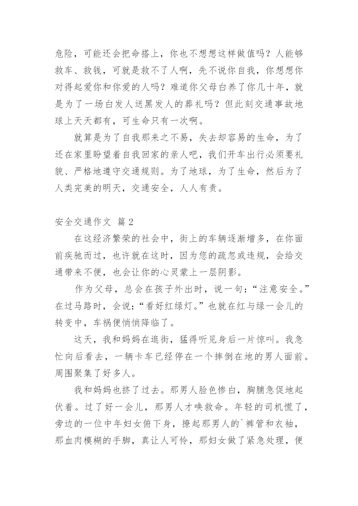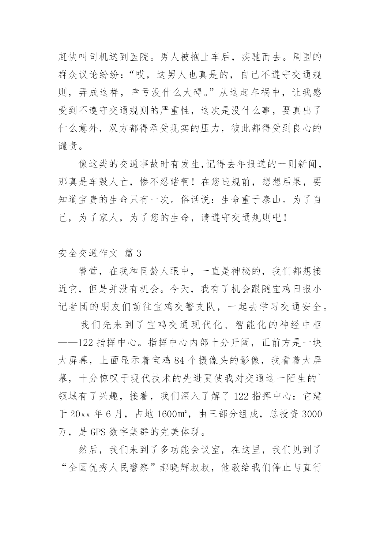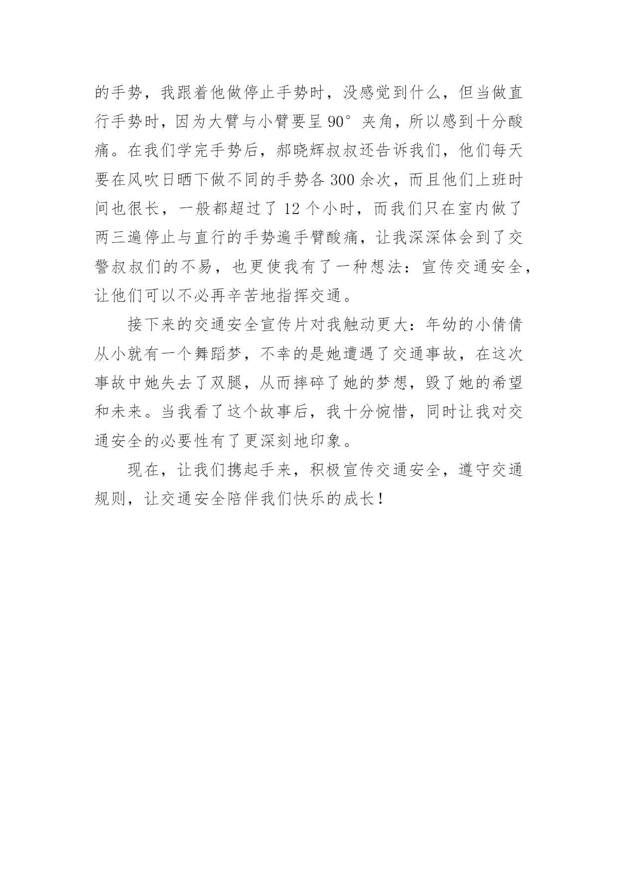 安全交通作文在平凡的学习、工作、生活中,大家都不可避免地会接触到作文吧,根据写作命题的特点,作文可以分为命题作文和非命题作文。你所见过的作文是什么样的呢?以下是小编为大家收集的安全交通作文3篇,欢迎大家借鉴与参考,希望对大家有所帮助。安全交通作文篇1这个词,相信你有我这么大都就应听说过的了,这个词,从改革开放以来就被电视台新闻播音员说过千百遍了,可我这天还是要说。交通不安全意味着什么吗?意味着人们将会像第二次世界大战中的老百姓一样悲惨地失去生命。生命,你明白个词有多重要吗?然后这是用金子也买不来的,你担当得起吗?此刻世界真是发展得越来越快了,人类还早在几百年前发明了能使世界各地变“小”的机械交通工具,像飞机此刻都超音速了呢。先不说大的,在我们生活的'城市,到处都飞驰着一辆辆帅气的小汽车,为主人们服务。聪明的人们明白科技是一把“双刃剑”,然后为了让小汽车们懂得互相谦让,还同时发明了交通规则。但是有的小汽车为贪一时的痛快而去冒险,去违反保护自我生命的交通规则,我还是宁愿没有汽车、飞机还好呢。如果是对交通规则有推荐,能够提出,而不要用行动来把警察吸引过来教育你,这样做不仅仅危险,可能还会把命搭上,你也不想想这样做值吗?人能够救车、救钱,可就是救不了人啊,先不说你自我,你想想你对得起爱你和你爱的人吗?难道你父母白养了你几十年,就是为了一场白发人送黑发人的葬礼吗?但此刻交通事故地球上天天都有,可生命只有一次啊。就算是为了自我那来之不易,失去却容易的生命,为了还在家里盼望着自我回家的亲人吧,我们开车出行必须要礼貌、严格地遵守交通规则。为了地球,为了生命,然后为了人类完美的明天,交通安全,人人有责。安全交通作文篇2在这经济繁荣的社会中,街上的车辆逐渐增多,在你面前疾驰而过,也许就在这时,因为您的疏忽或违规,会给交通带来不便,也会让你的心灵蒙上一层阴影。作为父母,总会在孩子外出时,说一句:“注意安全。”在过马路时,会说:“看好红绿灯。”也就在红与绿一会儿的转变中,车祸便悄悄降临了。这天,我和妈妈在逛街,猛得听见身后一片惊叫。我急忙向后看去,一辆卡车已经停在一个摔倒在地的男人面前。周围聚集了好多人。我和妈妈也挤了过去。那男人脸色惨白,胸脯急促地起伏着。过了好一会儿,那男人才唤救命。年轻的司机慌了,旁边的一位中年妇女俯下身,撩起那男人的`裤管和衣袖,那血肉模糊的手脚,真让人可怜,那妇女做了紧急处理,便赶快叫司机送到医院。男人被抱上车后,疾驰而去。周围的群众议论纷纷:“哎,这男人也真是的,自己不遵守交通规则,弄成这样,幸亏没什么大碍。”从这起车祸中,让我感受到不遵守交通规则的严重性,这次是没什么事,要真出了什么意外,双方都得承受现实的压力,彼此都得受到良心的谴责。像这类的交通事故时有发生,记得去年报道的一则新闻,那真是车毁人亡,惨不忍睹啊!在您违规前,想想后果,要知道宝贵的生命只有一次。俗话说:生命重于泰山。为了自己,为了家人,为了您的生命,请遵守交通规则吧!安全交通作文篇3警营,在我和同龄人眼中,一直是神秘的,我们都想接近它,但是并没有机会。今天,我有了机会跟随宝鸡日报小记者团的朋友们前往宝鸡交警支队,一起去学习交通安全。我们先来到了宝鸡交通现代化、智能化的神经中枢——122指挥中心。指挥中心内部十分开阔,正前方是一块大屏幕,上面显示着宝鸡84个摄像头的影像,我看着大屏幕,十分惊叹于现代技术的先进更使我对交通这一陌生的`领域有了兴趣,接着,我们深入了解了122指挥中心:它建于20xx年6月,占地1600㎡,由三部分组成,总投资3000万,是GPS数字集群的完美体现。然后,我们来到了多功能会议室,在这里,我们见到了“全国优秀人民警察”郝晓辉叔叔,他教给我们停止与直行的手势,我跟着他做停止手势时,没感觉到什么,但当做直行手势时,因为大臂与小臂要呈90°夹角,所以感到十分酸痛。在我们学完手势后,郝晓辉叔叔还告诉我们,他们每天要在风吹日晒下做不同的手势各300余次,而且他们上班时间也很长,一般都超过了12个小时,而我们只在室内做了两三遍停止与直行的手势遍手臂酸痛,让我深深体会到了交警叔叔们的不易,也更使我有了一种想法:宣传交通安全,让他们可以不必再辛苦地指挥交通。接下来的交通安全宣传片对我触动更大:年幼的小倩倩从小就有一个舞蹈梦,不幸的是她遭遇了交通事故,在这次事故中她失去了双腿,从而摔碎了她的梦想,毁了她的希望和未来。当我看了这个故事后,我十分惋惜,同时让我对交通安全的必要性有了更深刻地印象。现在,让我们携起手来,积极宣传交通安全,遵守交通规则,让交通安全陪伴我们快乐的成长!