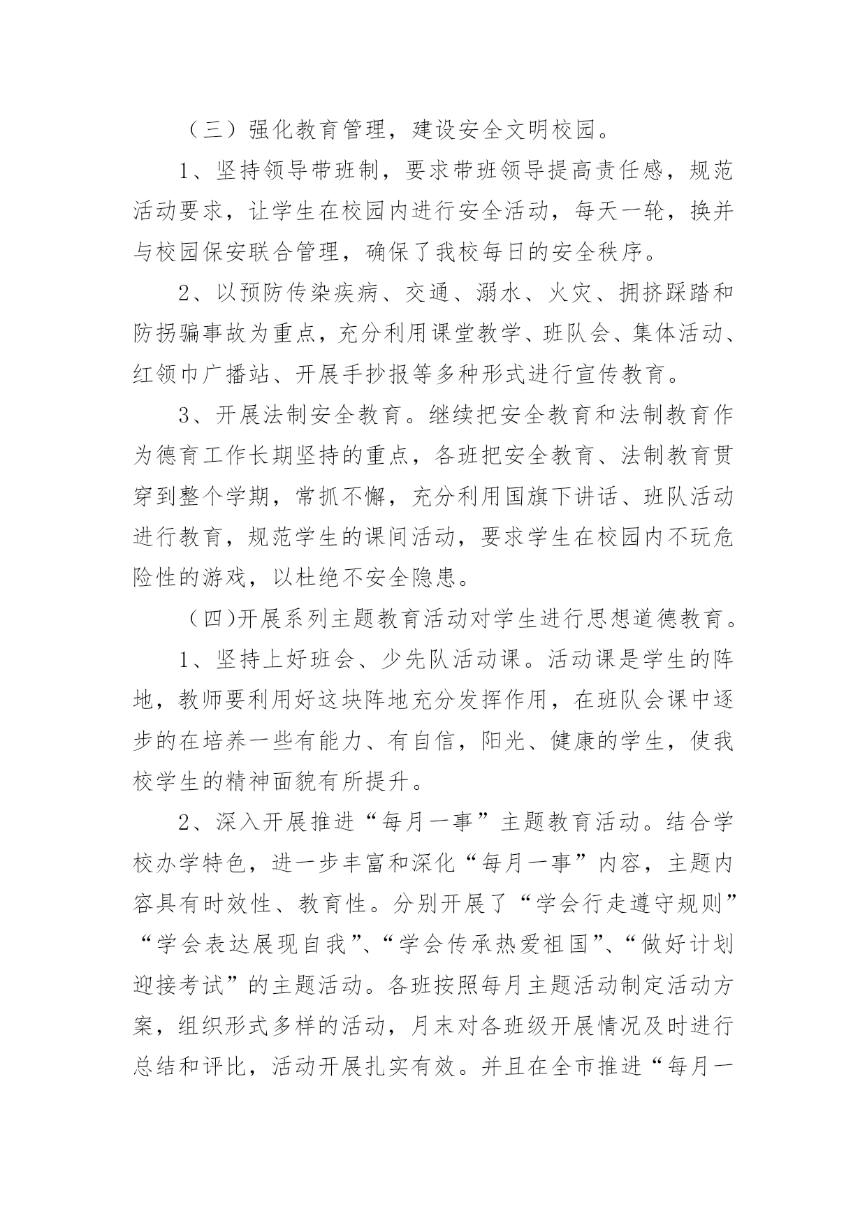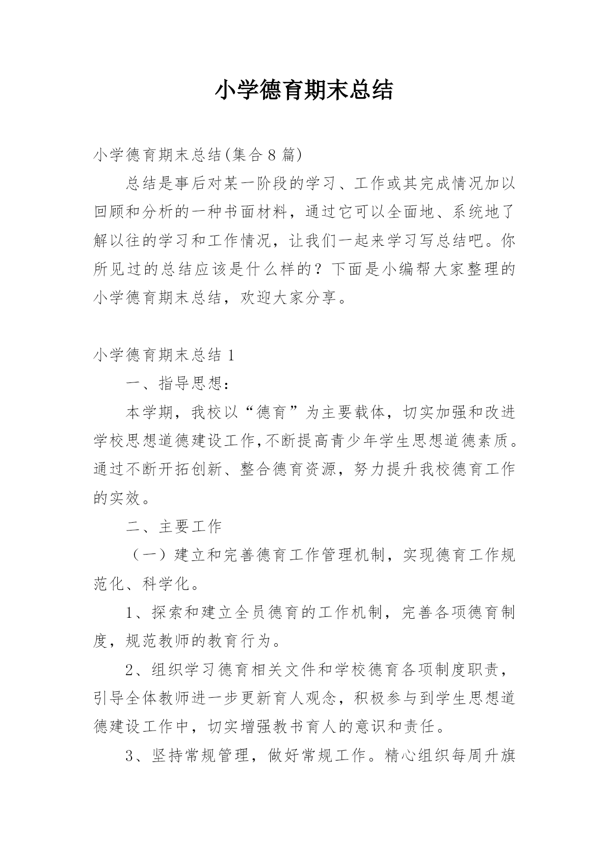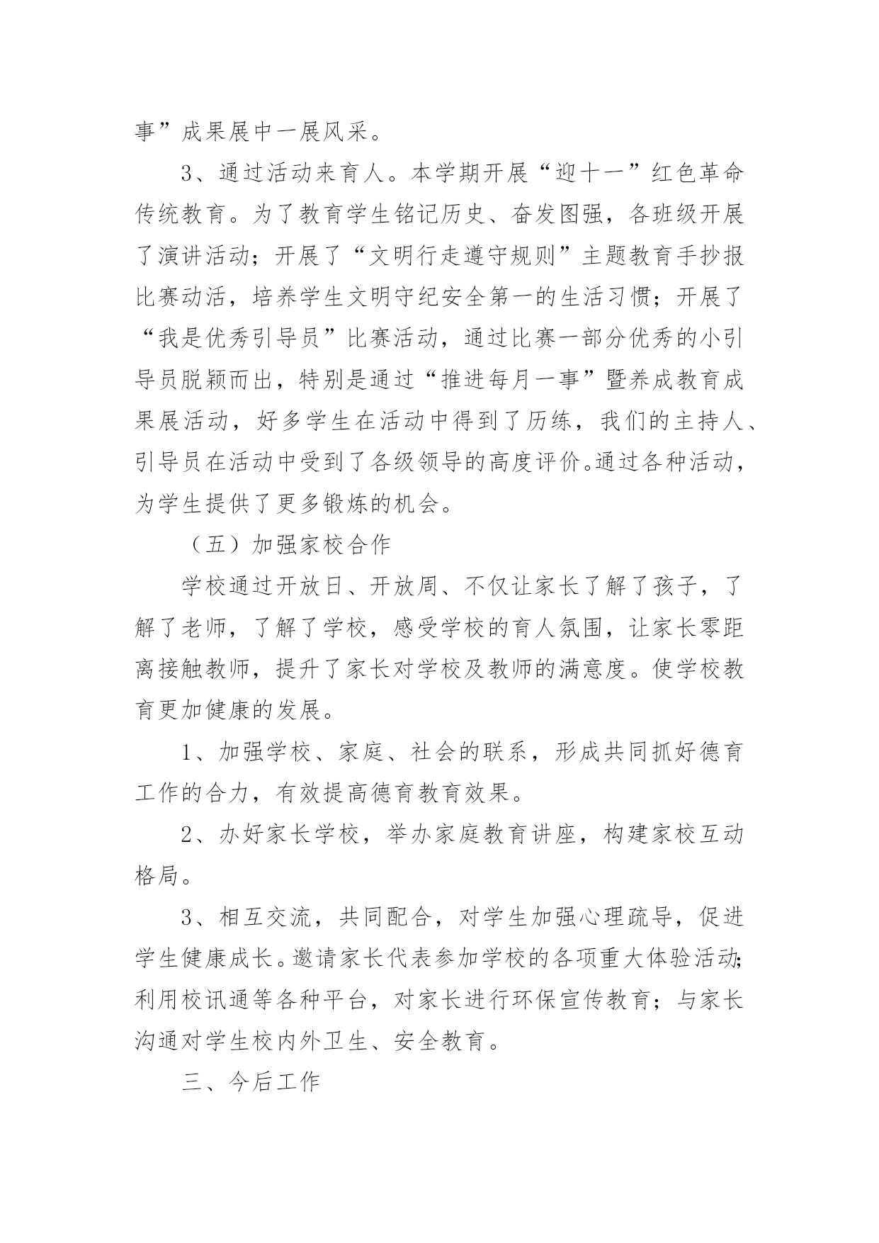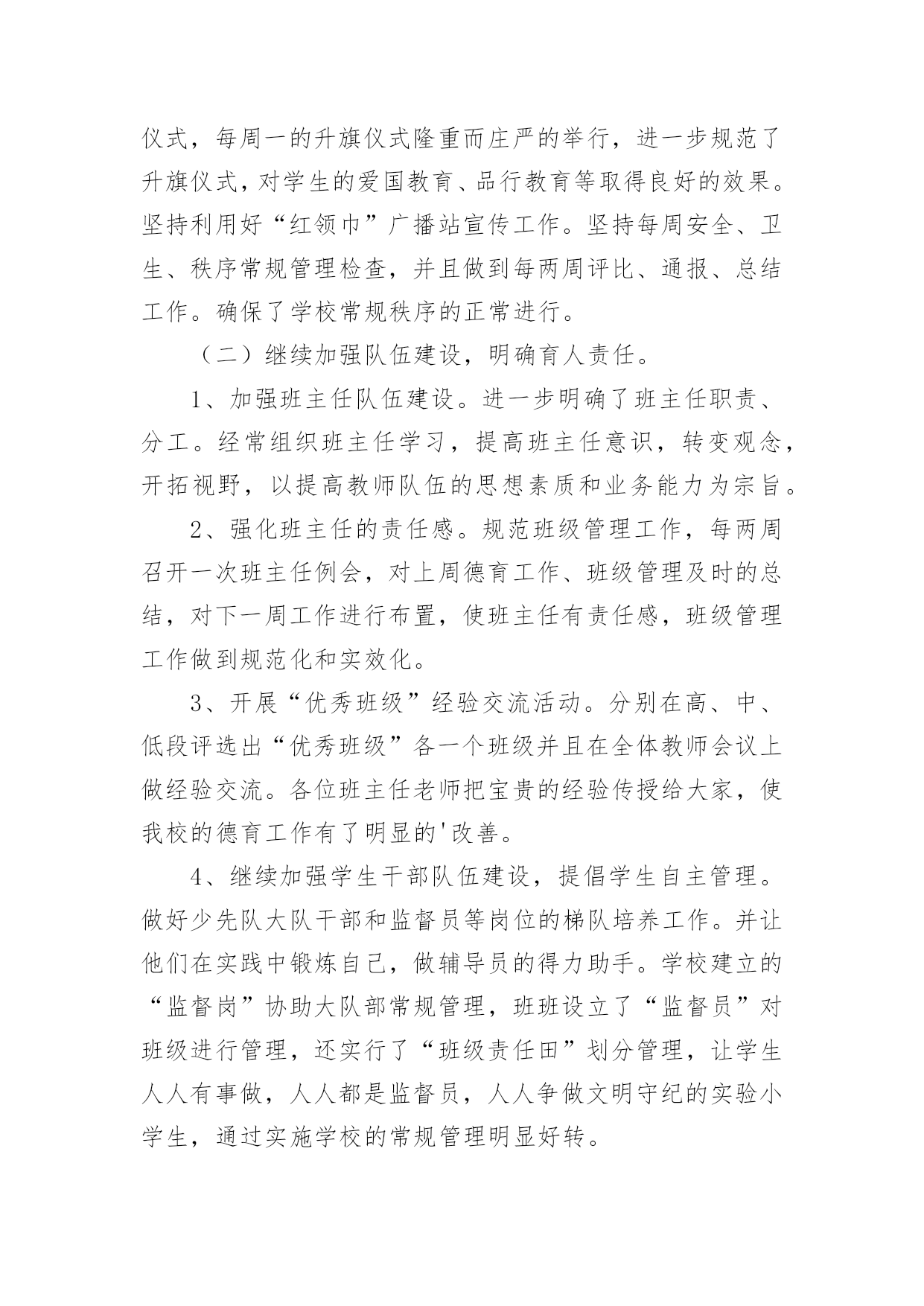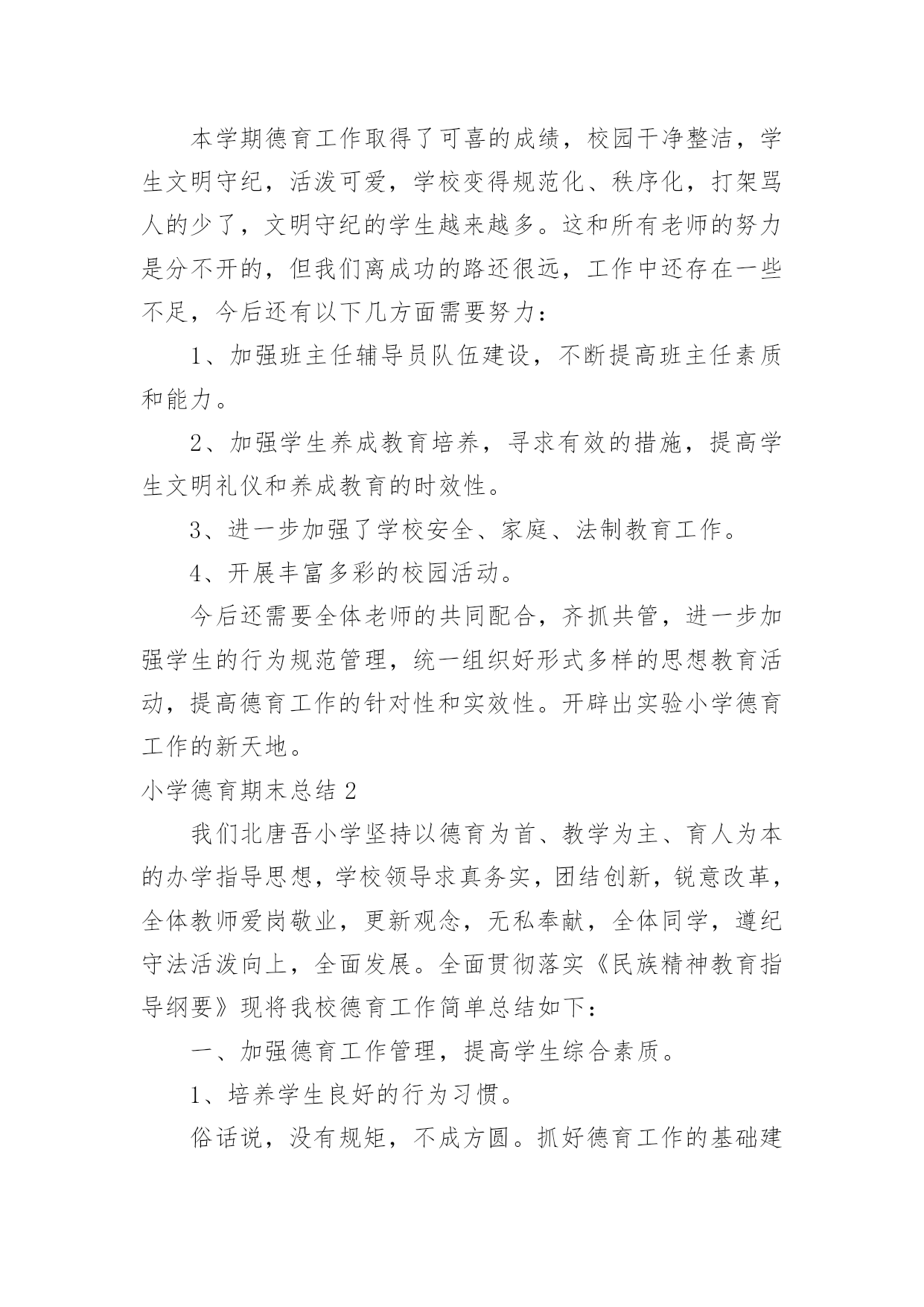 小学德育期末总结小学德育期末总结(集合8篇)总结是事后对某一阶段的学习、工作或其完成情况加以回顾和分析的一种书面材料,通过它可以全面地、系统地了解以往的学习和工作情况,让我们一起来学习写总结吧。你所见过的总结应该是什么样的?下面是小编帮大家整理的小学德育期末总结,欢迎大家分享。小学德育期末总结1一、指导思想:本学期,我校以“德育”为主要载体,切实加强和改进学校思想道德建设工作,不断提高青少年学生思想道德素质。通过不断开拓创新、整合德育资源,努力提升我校德育工作的实效。二、主要工作(一)建立和完善德育工作管理机制,实现德育工作规范化、科学化。1、探索和建立全员德育的工作机制,完善各项德育制度,规范教师的教育行为。2、组织学习德育相关文件和学校德育各项制度职责,引导全体教师进一步更新育人观念,积极参与到学生思想道德建设工作中,切实增强教书育人的意识和责任。3、坚持常规管理,做好常规工作。精心组织每周升旗仪式,每周一的升旗仪式隆重而庄严的举行,进一步规范了升旗仪式,对学生的爱国教育、品行教育等取得良好的效果。坚持利用好“红领巾”广播站宣传工作。坚持每周安全、卫生、秩序常规管理检查,并且做到每两周评比、通报、总结工作。确保了学校常规秩序的正常进行。(二)继续加强队伍建设,明确育人责任。1、加强班主任队伍建设。进一步明确了班主任职责、分工。经常组织班主任学习,提高班主任意识,转变观念,开拓视野,以提高教师队伍的思想素质和业务能力为宗旨。2、强化班主任的责任感。规范班级管理工作,每两周召开一次班主任例会,对上周德育工作、班级管理及时的总结,对下一周工作进行布置,使班主任有责任感,班级管理工作做到规范化和实效化。3、开展“优秀班级”经验交流活动。分别在高、中、低段评选出“优秀班级”各一个班级并且在全体教师会议上做经验交流。各位班主任老师把宝贵的经验传授给大家,使我校的德育工作有了明显的'改善。4、继续加强学生干部队伍建设,提倡学生自主管理。做好少先队大队干部和监督员等岗位的梯队培养工作。并让他们在实践中锻炼自己,做辅导员的得力助手。学校建立的“监督岗”协助大队部常规管理,班班设立了“监督员”对班级进行管理,还实行了“班级责任田”划分管理,让学生人人有事做,人人都是监督员,人人争做文明守纪的实验小学生,通过实施学校的常规管理明显好转。(三)强化教育管理,建设安全文明校园。1、坚持领导带班制,要求带班领导提高责任感,规范活动要求,让学生在校园内进行安全活动,每天一轮,换并与校园保安联合管理,确保了我校每日的安全秩序。2、以预防传染疾病、交通、溺水、火灾、拥挤踩踏和防拐骗事故为重点,充分利用课堂教学、班队会、集体活动、红领巾广播站、开展手抄报等多种形式进行宣传教育。3、开展法制安全教育。继续把安全教育和法制教育作为德育工作长期坚持的重点,各班把安全教育、法制教育贯穿到整个学期,常抓不懈,充分利用国旗下讲话、班队活动进行教育,规范学生的课间活动,要求学生在校园内不玩危险性的游戏,以杜绝不安全隐患。(四)开展系列主题教育活动对学生进行思想道德教育。1、坚持上好班会、少先队活动课。活动课是学生的阵地,教师要利用好这块阵地充分发挥作用,在班队会课中逐步的在培养一些有能力、有自信,阳光、健康的学生,使我校学生的精神面貌有所提升。2、深入开展推进“每月一事”主题教育活动。结合学校办学特色,进一步丰富和深化“每月一事”内容,主题内容具有时效性、教育性。分别开展了“学会行走遵守规则”“学会表达展现自我”、“学会传承热爱祖国”、“做好计划迎接考试”的主题活动。各班按照每月主题活动制定活动方案,组织形式多样的活动,月末对各班级开展情况及时进行总结和评比,活动开展扎实有效。并且在全市推进“每月一事”成果展中一展风采。3、通过活动来育人。本学期开展“迎十一”红色革命传统教育。为了教育学生铭记历史、奋发图强,各班级开展了演讲活动;开展了“文明行走遵守规则”主题教育手抄报比赛动活,培养学生文明守纪安全第一的生活习惯;开展了“我是优秀引导员”比赛活动,通过比赛一部分优秀的小引导员脱颖而出,特别是通过“推进每月一事”暨养成教育成果展活动,好多学生在活动中得到了历练,我们的主持人、引导员在活动中受到了各级领导的高度评价。通过各种活动,为学生提供了更多锻炼的机会。(五)加强家校合作学校通过开放日、开放周、不仅让家长了解了孩子,了解了老师,了解了学校,感受学校的育人氛围,让家长零距离接触教师,提升了家长对学校及教师的满意度。使学校教育更加健康的发展。1、加强学校、家庭、社会的联系,形成共同抓好德育工作的合力,有效提高德育教育效果。2、办好家长学校,举办家庭教育讲座,构建家校互动格局。3、相互交流,共同配合,对学生加强心理疏导,促进学生健康成长。邀请家长代表参加学校的各项重大体验活