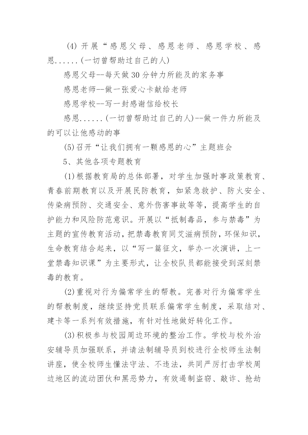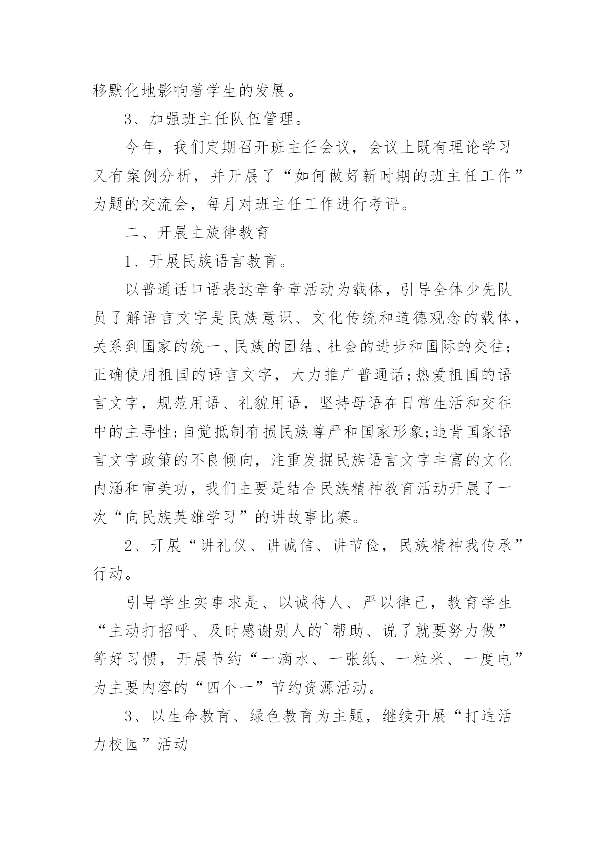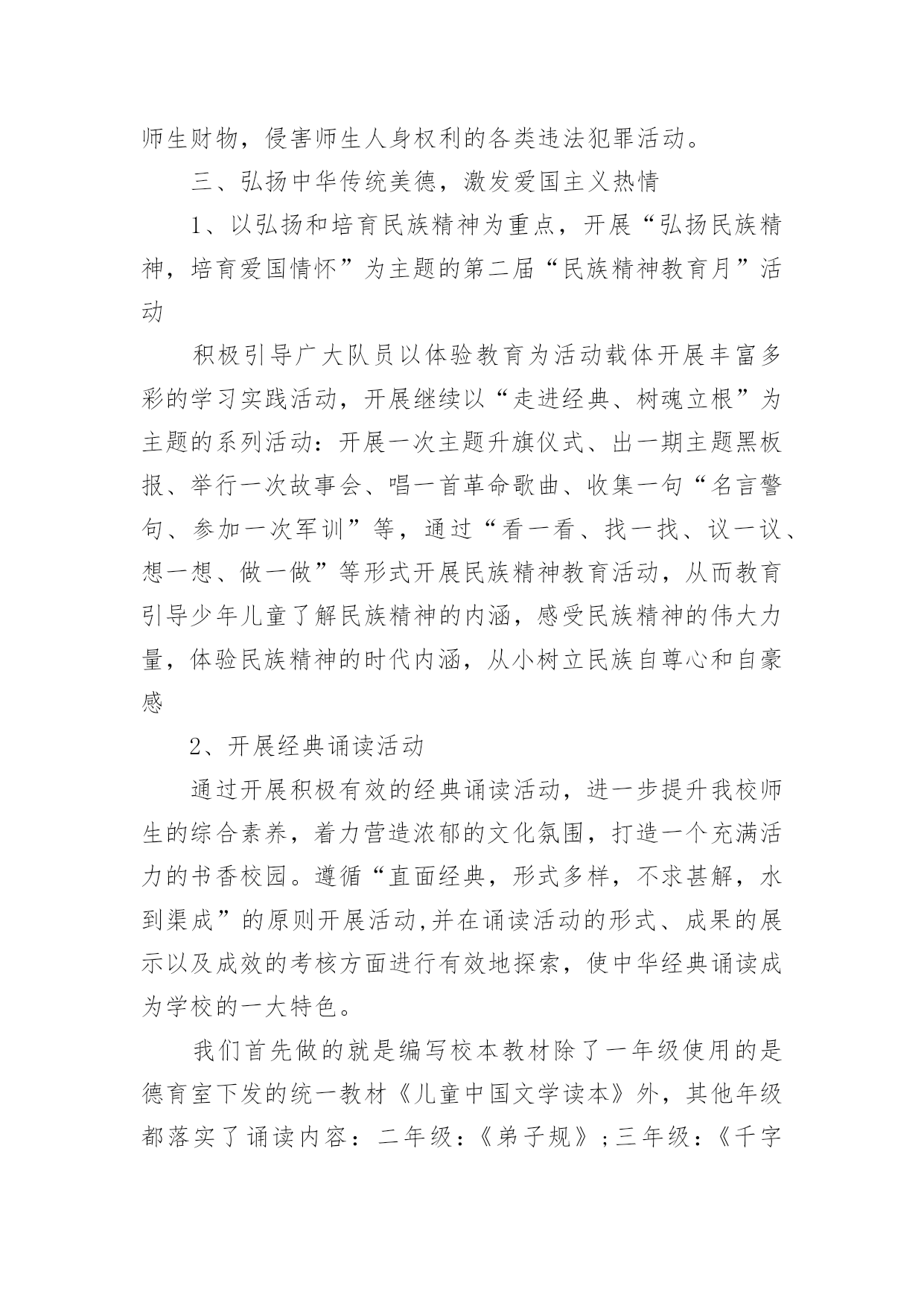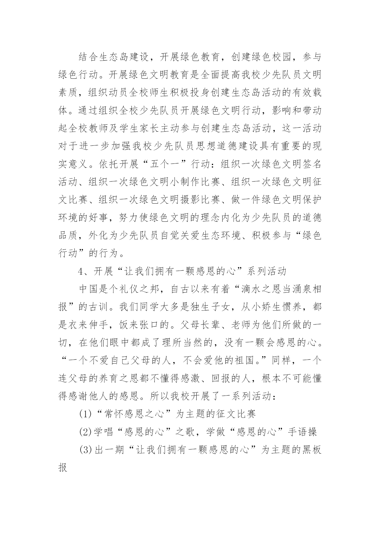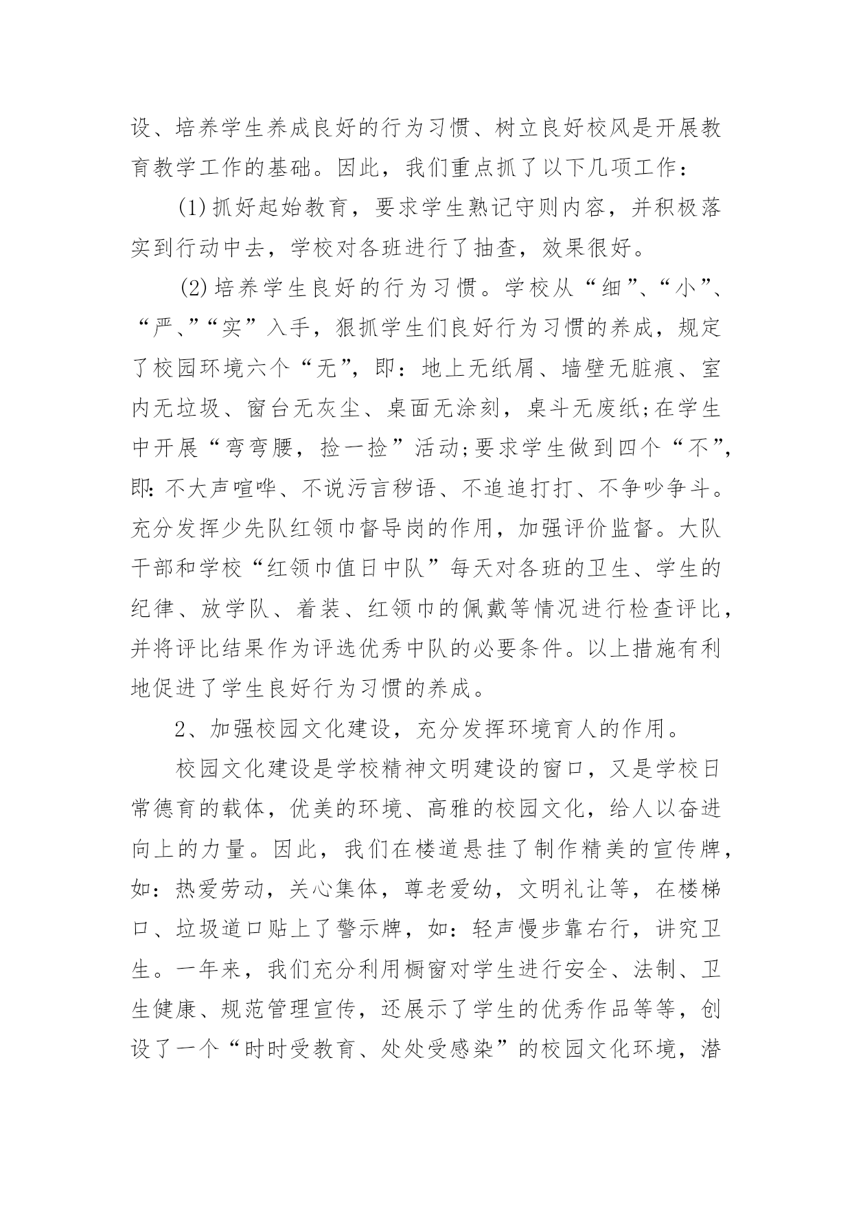 小学德育期末总结小学德育期末总结(集合8篇)总结是事后对某一阶段的学习、工作或其完成情况加以回顾和分析的一种书面材料,通过它可以全面地、系统地了解以往的学习和工作情况,让我们一起来学习写总结吧。你所见过的总结应该是什么样的?下面是小编帮大家整理的小学德育期末总结,欢迎大家分享。小学德育期末总结1一、指导思想:本学期,我校以“德育”为主要载体,切实加强和改进学校思想道德建设工作,不断提高青少年学生思想道德素质。通过不断开拓创新、整合德育资源,努力提升我校德育工作的实效。二、主要工作(一)建立和完善德育工作管理机制,实现德育工作规范化、科学化。1、探索和建立全员德育的工作机制,完善各项德育制度,规范教师的教育行为。2、组织学习德育相关文件和学校德育各项制度职责,引导全体教师进一步更新育人观念,积极参与到学生思想道德建设工作中,切实增强教书育人的意识和责任。3、坚持常规管理,做好常规工作。精心组织每周升旗仪式,每周一的升旗仪式隆重而庄严的举行,进一步规范了升旗仪式,对学生的爱国教育、品行教育等取得良好的效果。坚持利用好“红领巾”广播站宣传工作。坚持每周安全、卫生、秩序常规管理检查,并且做到每两周评比、通报、总结工作。确保了学校常规秩序的正常进行。(二)继续加强队伍建设,明确育人责任。1、加强班主任队伍建设。进一步明确了班主任职责、分工。经常组织班主任学习,提高班主任意识,转变观念,开拓视野,以提高教师队伍的思想素质和业务能力为宗旨。2、强化班主任的责任感。规范班级管理工作,每两周召开一次班主任例会,对上周德育工作、班级管理及时的总结,对下一周工作进行布置,使班主任有责任感,班级管理工作做到规范化和实效化。3、开展“优秀班级”经验交流活动。分别在高、中、低段评选出“优秀班级”各一个班级并且在全体教师会议上做经验交流。各位班主任老师把宝贵的经验传授给大家,使我校的德育工作有了明显的'改善。4、继续加强学生干部队伍建设,提倡学生自主管理。做好少先队大队干部和监督员等岗位的梯队培养工作。并让他们在实践中锻炼自己,做辅导员的得力助手。学校建立的“监督岗”协助大队部常规管理,班班设立了“监督员”对班级进行管理,还实行了“班级责任田”划分管理,让学生人人有事做,人人都是监督员,人人争做文明守纪的实验小学生,通过实施学校的常规管理明显好转。(三)强化教育管理,建设安全文明校园。1、坚持领导带班制,要求带班领导提高责任感,规范活动要求,让学生在校园内进行安全活动,每天一轮,换并与校园保安联合管理,确保了我校每日的安全秩序。2、以预防传染疾病、交通、溺水、火灾、拥挤踩踏和防拐骗事故为重点,充分利用课堂教学、班队会、集体活动、红领巾广播站、开展手抄报等多种形式进行宣传教育。3、开展法制安全教育。继续把安全教育和法制教育作为德育工作长期坚持的重点,各班把安全教育、法制教育贯穿到整个学期,常抓不懈,充分利用国旗下讲话、班队活动进行教育,规范学生的课间活动,要求学生在校园内不玩危险性的游戏,以杜绝不安全隐患。(四)开展系列主题教育活动对学生进行思想道德教育。1、坚持上好班会、少先队活动课。活动课是学生的阵地,教师要利用好这块阵地充分发挥作用,在班队会课中逐步的在培养一些有能力、有自信,阳光、健康的学生,使我校学生的精神面貌有所提升。2、深入开展推进“每月一事”主题教育活动。结合学校办学特色,进一步丰富和深化“每月一事”内容,主题内容具有时效性、教育性。分别开展了“学会行走遵守规则”“学会表达展现自我”、“学会传承热爱祖国”、“做好计划迎接考试”的主题活动。各班按照每月主题活动制定活动方案,组织形式多样的活动,月末对各班级开展情况及时进行总结和评比,活动开展扎实有效。并且在全市推进“每月一事”成果展中一展风采。3、通过活动来育人。本学期开展“迎十一”红色革命传统教育。为了教育学生铭记历史、奋发图强,各班级开展了演讲活动;开展了“文明行走遵守规则”主题教育手抄报比赛动活,培养学生文明守纪安全第一的生活习惯;开展了“我是优秀引导员”比赛活动,通过比赛一部分优秀的小引导员脱颖而出,特别是通过“推进每月一事”暨养成教育成果展活动,好多学生在活动中得到了历练,我们的主持人、引导员在活动中受到了各级领导的高度评价。通过各种活动,为学生提供了更多锻炼的机会。(五)加强家校合作学校通过开放日、开放周、不仅让家长了解了孩子,了解了老师,了解了学校,感受学校的育人氛围,让家长零距离接触教师,提升了家长对学校及教师的满意度。使学校教育更加健康的发展。1、加强学校、家庭、社会的联系,形成共同抓好德育工作的合力,有效提高德育教育效果。2、办好家长学校,举办家庭教育讲座,构建家校互动格局。3、相互交流,共同配合,对学生加强心理疏导,促进学生健康成长。邀请家长代表参加学校的各项重大体验活