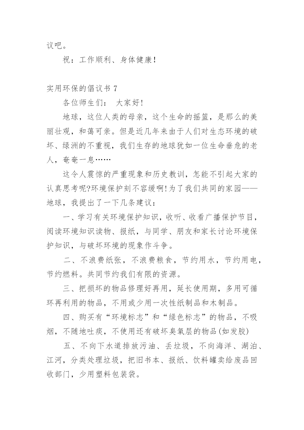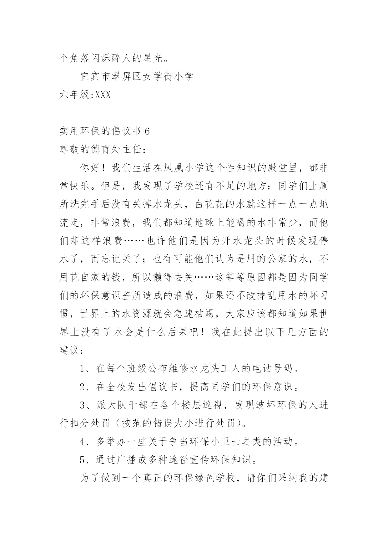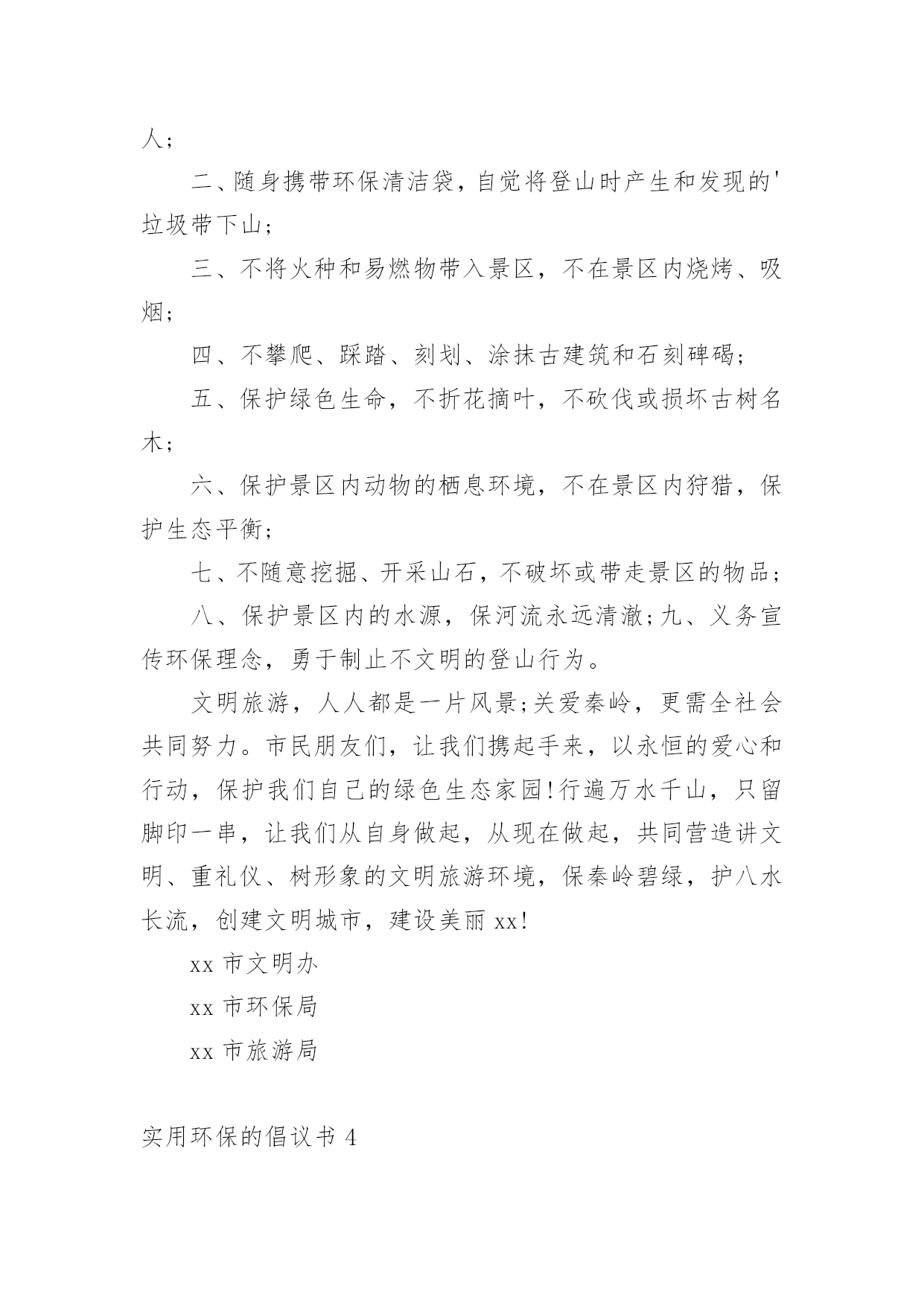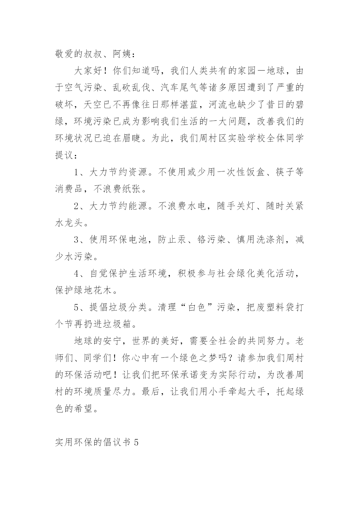 环保的倡议书实用环保的倡议书在现实社会中,倡议书对我们的作用越来越大,倡议书具有响应者不确定性的特征。倡议书的注意事项有许多,你确定会写吗?以下是小编精心整理的实用环保的倡议书,仅供参考,欢迎大家阅读。实用环保的倡议书1相信每个人都想在良好的生活环境里度过岁月吧!由于世界环保卫生过差,这些都表现在生活垃圾的处理上,它会给人类带来环境污染的影响,所以,我真诚的大家提出以下几点倡议:1.不要乱扔垃圾,不随地吐痰。2.节约用纸:打印过的纸用来做草稿纸;用打印过的纸的背面再打印。3.为环保作出贡献:多种花草树木。4.爱护好自己身边的环境。5.用完水或电就及时关紧。我知道,这几点小小的倡议还不足以代表我的爱国之心,所以我决定再为祖国写更多的倡议书,希望你们能接受我提出的意见,我也希望能有更多人爱国。从现在起,从我做起,不乱丢垃圾,不随地吐痰,做好小主人的榜样。从现在起,从我做起,不管去到那,不乱丢垃圾,都不随地吐痰,做好一个小客人,不让人取笑。实用环保的倡议书2敬爱的环保局:地球是人类的母亲,是生命的摇篮。我们本应该保护地球母亲的,而我们却在破坏地球母亲,破坏地球母亲那光滑的皮肤。正如《只有一个地球》这篇文章所说的,我们不能再指望破坏了地球后再移居到别的星球上去。所以我们亡羊补牢,为时不晚,保护我们的地球,爱护环境,我给大家提一些建议:1、大力节约资源,不使用或少用一次性饭盒、筷子等消费品,不浪费纸张。2、大力节约能源,不浪费水电,随手关灯、随时关紧水龙头。3、使用环保电池,防止汞、铬污染、慎用洗涤剂,减少水污染。4、自觉保护生活环境,积极参与社会绿化美化活动,保护绿地、花木。5、建议垃圾分类,清理“白色”污染,把废塑料袋打个节再扔进垃圾箱。6、建议文明行为,从我做起,不随地吐痰,不乱扔废弃物,保护绿色环境。7、尽量使用公共交通工具、自行车或步行,减少空气污染;使用无铅汽油,购买小排气量的轿车。地球只有一个,她的生命是脆弱的,不能因为我们为着眼前的发展和获得微小的利益,以肆虐的行为,无“度”的获取,使本已脆弱的躯体更加脆弱!保护地球,就是保护我们自已。地球的安宁,世界的美好,需要全社会的共同努力。倡议人:年月日实用环保的倡议书3广大游客和市民朋友们:去年以来,我市大力开展“感恩秦岭——让秦岭常绿,让八水长流”山川河流行动,通过组织开展环保宣传、植绿护绿、污染防治等系列活动,努力培育关爱自然、节约资源、保护环境的意识,引导市民群众积极参与秦岭生态环境保护,共同建设美丽家园。“保秦岭碧绿,护八水长流”,是xx人民的共同期盼和美好愿望,共同建设天蓝、地绿、水净的美好家园,也是每名公民的应尽义务和责任。为了更好地保护秦岭的生态环境,维护好沿山旅游环境,大力倡导文明登山,文明旅游,xx市文明办、xx市环保局、xx市旅游局、xx市秦岭办、xx市总工会、共青团xx市委、xx市妇联特向广大市民朋友发出如下倡议:一、遵守秦岭各峪口景区管理制度,做文明有礼的xx人;二、随身携带环保清洁袋,自觉将登山时产生和发现的'垃圾带下山;三、不将火种和易燃物带入景区,不在景区内烧烤、吸烟;四、不攀爬、踩踏、刻划、涂抹古建筑和石刻碑碣;五、保护绿色生命,不折花摘叶,不砍伐或损坏古树名木;六、保护景区内动物的栖息环境,不在景区内狩猎,保护生态平衡;七、不随意挖掘、开采山石,不破坏或带走景区的物品;八、保护景区内的水源,保河流永远清澈;九、义务宣传环保理念,勇于制止不文明的登山行为。文明旅游,人人都是一片风景;关爱秦岭,更需全社会共同努力。市民朋友们,让我们携起手来,以永恒的爱心和行动,保护我们自己的绿色生态家园!行遍万水千山,只留脚印一串,让我们从自身做起,从现在做起,共同营造讲文明、重礼仪、树形象的文明旅游环境,保秦岭碧绿,护八水长流,创建文明城市,建设美丽xx!xx市文明办xx市环保局xx市旅游局实用环保的倡议书4敬爱的叔叔、阿姨:大家好!你们知道吗,我们人类共有的家园-地球,由于空气污染、乱砍乱伐、汽车尾气等诸多原因遭到了严重的破坏,天空已不再像往日那样湛蓝,河流也缺少了昔日的碧绿,环境污染已成为影响我们生活的一大问题,改善我们的环境状况已迫在眉睫。为此,我们周村区实验学校全体同学提议:1、大力节约资源。不使用或少用一次性饭盒、筷子等消费品,不浪费纸张。2、大力节约能源。不浪费水电,随手关灯、随时关紧水龙头。3、使用环保电池,防止汞、铬污染、慎用洗涤剂,减少水污染。4、自觉保护生活环境,积极参与社会绿化美化活动,保护绿地花木。5、提倡垃圾分类。清理“白色”污染,把废塑料袋打个节再扔进垃圾箱。地球的安宁,世界的美好,需要全社会的共同努力。老师们、同学们!你心中有一个绿色之梦吗?请参加我们周村的环保活动吧!让我们把环保承诺变为实际行动,为改善周村的环境质量尽力。最后