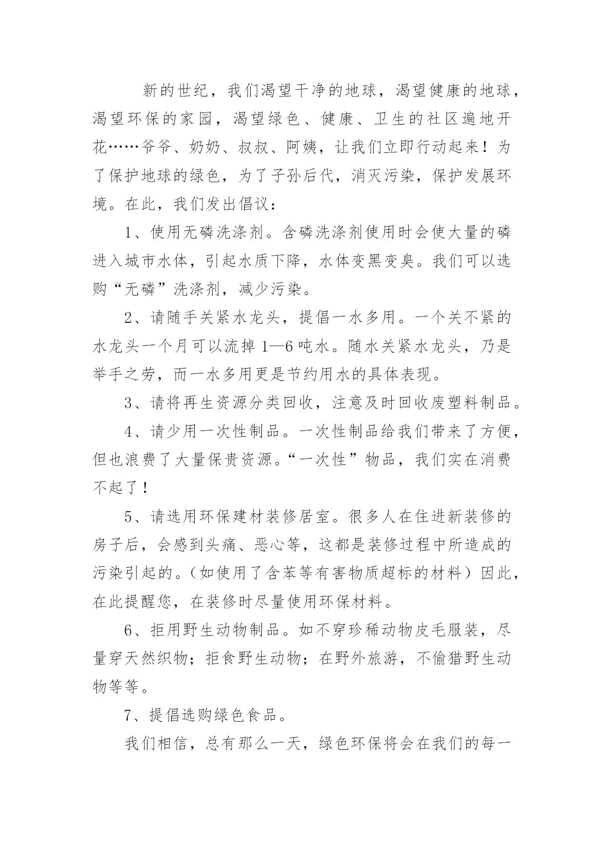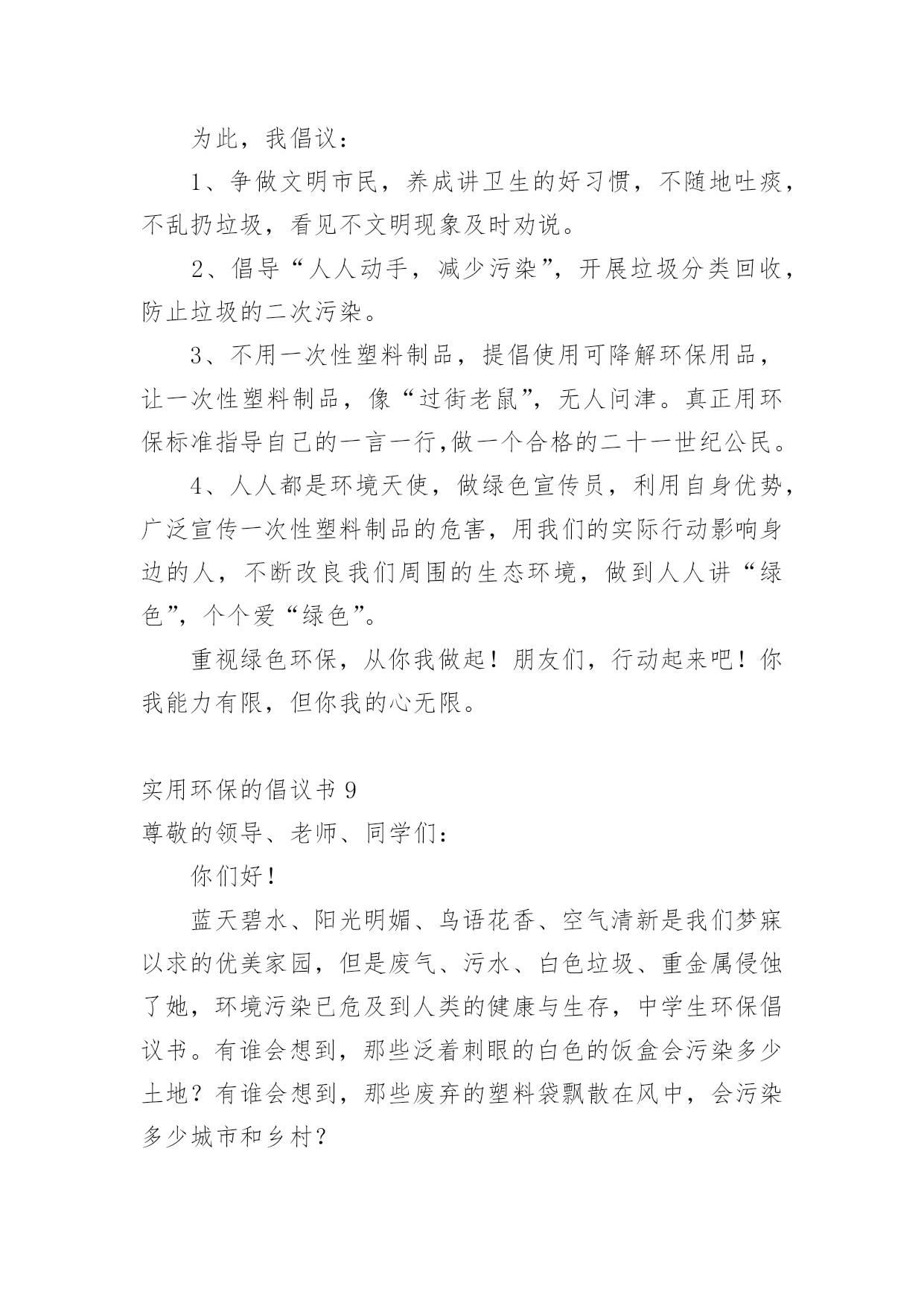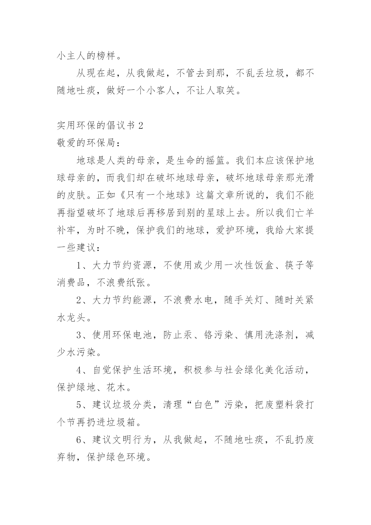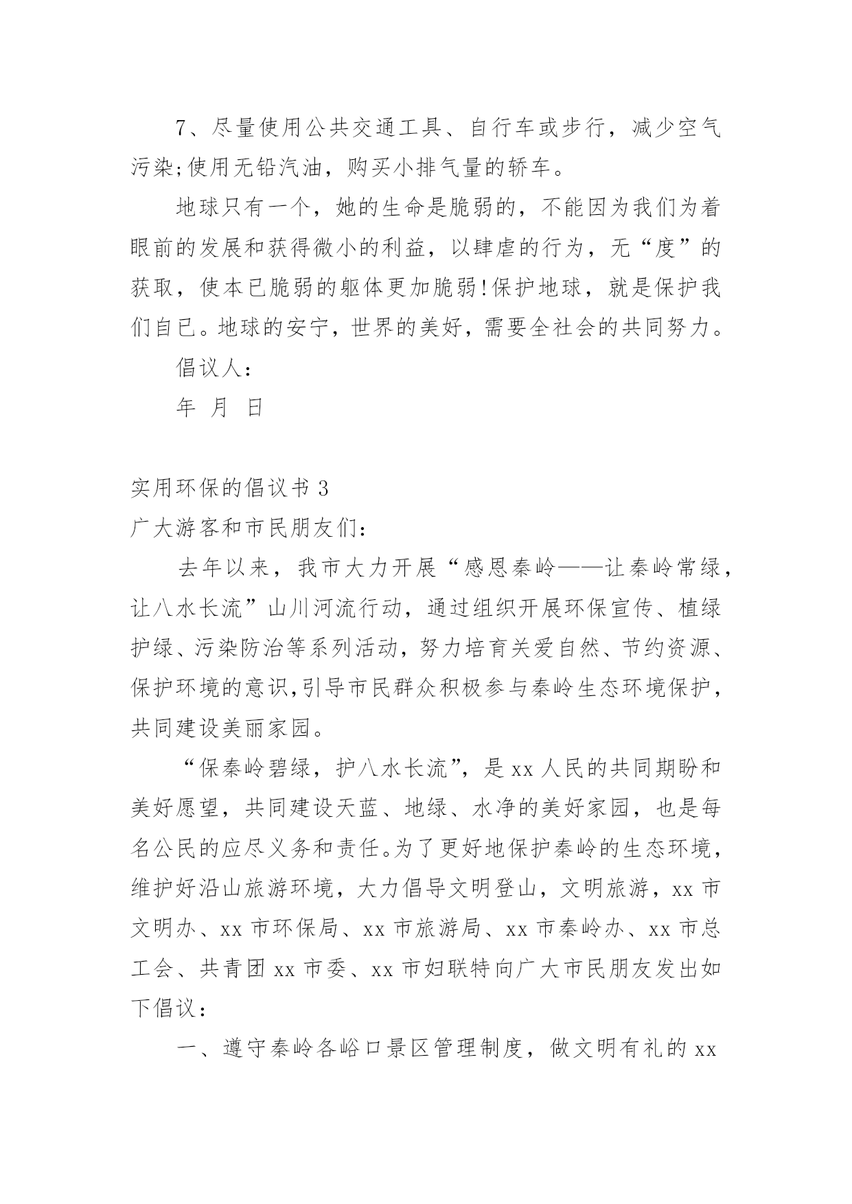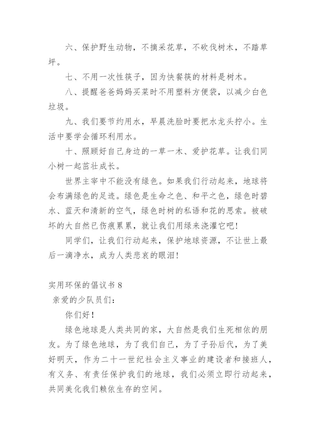 环保的倡议书实用环保的倡议书在现实社会中,倡议书对我们的作用越来越大,倡议书具有响应者不确定性的特征。倡议书的注意事项有许多,你确定会写吗?以下是小编精心整理的实用环保的倡议书,仅供参考,欢迎大家阅读。实用环保的倡议书1相信每个人都想在良好的生活环境里度过岁月吧!由于世界环保卫生过差,这些都表现在生活垃圾的处理上,它会给人类带来环境污染的影响,所以,我真诚的大家提出以下几点倡议:1.不要乱扔垃圾,不随地吐痰。2.节约用纸:打印过的纸用来做草稿纸;用打印过的纸的背面再打印。3.为环保作出贡献:多种花草树木。4.爱护好自己身边的环境。5.用完水或电就及时关紧。我知道,这几点小小的倡议还不足以代表我的爱国之心,所以我决定再为祖国写更多的倡议书,希望你们能接受我提出的意见,我也希望能有更多人爱国。从现在起,从我做起,不乱丢垃圾,不随地吐痰,做好小主人的榜样。从现在起,从我做起,不管去到那,不乱丢垃圾,都不随地吐痰,做好一个小客人,不让人取笑。实用环保的倡议书2敬爱的环保局:地球是人类的母亲,是生命的摇篮。我们本应该保护地球母亲的,而我们却在破坏地球母亲,破坏地球母亲那光滑的皮肤。正如《只有一个地球》这篇文章所说的,我们不能再指望破坏了地球后再移居到别的星球上去。所以我们亡羊补牢,为时不晚,保护我们的地球,爱护环境,我给大家提一些建议:1、大力节约资源,不使用或少用一次性饭盒、筷子等消费品,不浪费纸张。2、大力节约能源,不浪费水电,随手关灯、随时关紧水龙头。3、使用环保电池,防止汞、铬污染、慎用洗涤剂,减少水污染。4、自觉保护生活环境,积极参与社会绿化美化活动,保护绿地、花木。5、建议垃圾分类,清理“白色”污染,把废塑料袋打个节再扔进垃圾箱。6、建议文明行为,从我做起,不随地吐痰,不乱扔废弃物,保护绿色环境。7、尽量使用公共交通工具、自行车或步行,减少空气污染;使用无铅汽油,购买小排气量的轿车。地球只有一个,她的生命是脆弱的,不能因为我们为着眼前的发展和获得微小的利益,以肆虐的行为,无“度”的获取,使本已脆弱的躯体更加脆弱!保护地球,就是保护我们自已。地球的安宁,世界的美好,需要全社会的共同努力。倡议人:年月日实用环保的倡议书3广大游客和市民朋友们:去年以来,我市大力开展“感恩秦岭——让秦岭常绿,让八水长流”山川河流行动,通过组织开展环保宣传、植绿护绿、污染防治等系列活动,努力培育关爱自然、节约资源、保护环境的意识,引导市民群众积极参与秦岭生态环境保护,共同建设美丽家园。“保秦岭碧绿,护八水长流”,是xx人民的共同期盼和美好愿望,共同建设天蓝、地绿、水净的美好家园,也是每名公民的应尽义务和责任。为了更好地保护秦岭的生态环境,维护好沿山旅游环境,大力倡导文明登山,文明旅游,xx市文明办、xx市环保局、xx市旅游局、xx市秦岭办、xx市总工会、共青团xx市委、xx市妇联特向广大市民朋友发出如下倡议:一、遵守秦岭各峪口景区管理制度,做文明有礼的xx人;二、随身携带环保清洁袋,自觉将登山时产生和发现的'垃圾带下山;三、不将火种和易燃物带入景区,不在景区内烧烤、吸烟;四、不攀爬、踩踏、刻划、涂抹古建筑和石刻碑碣;五、保护绿色生命,不折花摘叶,不砍伐或损坏古树名木;六、保护景区内动物的栖息环境,不在景区内狩猎,保护生态平衡;七、不随意挖掘、开采山石,不破坏或带走景区的物品;八、保护景区内的水源,保河流永远清澈;九、义务宣传环保理念,勇于制止不文明的登山行为。文明旅游,人人都是一片风景;关爱秦岭,更需全社会共同努力。市民朋友们,让我们携起手来,以永恒的爱心和行动,保护我们自己的绿色生态家园!行遍万水千山,只留脚印一串,让我们从自身做起,从现在做起,共同营造讲文明、重礼仪、树形象的文明旅游环境,保秦岭碧绿,护八水长流,创建文明城市,建设美丽xx!xx市文明办xx市环保局xx市旅游局实用环保的倡议书4敬爱的叔叔、阿姨:大家好!你们知道吗,我们人类共有的家园-地球,由于空气污染、乱砍乱伐、汽车尾气等诸多原因遭到了严重的破坏,天空已不再像往日那样湛蓝,河流也缺少了昔日的碧绿,环境污染已成为影响我们生活的一大问题,改善我们的环境状况已迫在眉睫。为此,我们周村区实验学校全体同学提议:1、大力节约资源。不使用或少用一次性饭盒、筷子等消费品,不浪费纸张。2、大力节约能源。不浪费水电,随手关灯、随时关紧水龙头。3、使用环保电池,防止汞、铬污染、慎用洗涤剂,减少水污染。4、自觉保护生活环境,积极参与社会绿化美化活动,保护绿地花木。5、提倡垃圾分类。清理“白色”污染,把废塑料袋打个节再扔进垃圾箱。地球的安宁,世界的美好,需要全社会的共同努力。老师们、同学们!你心中有一个绿色之梦吗?请参加我们周村的环保活动吧!让我们把环保承诺变为实际行动,为改善周村的环境质量尽力。最后