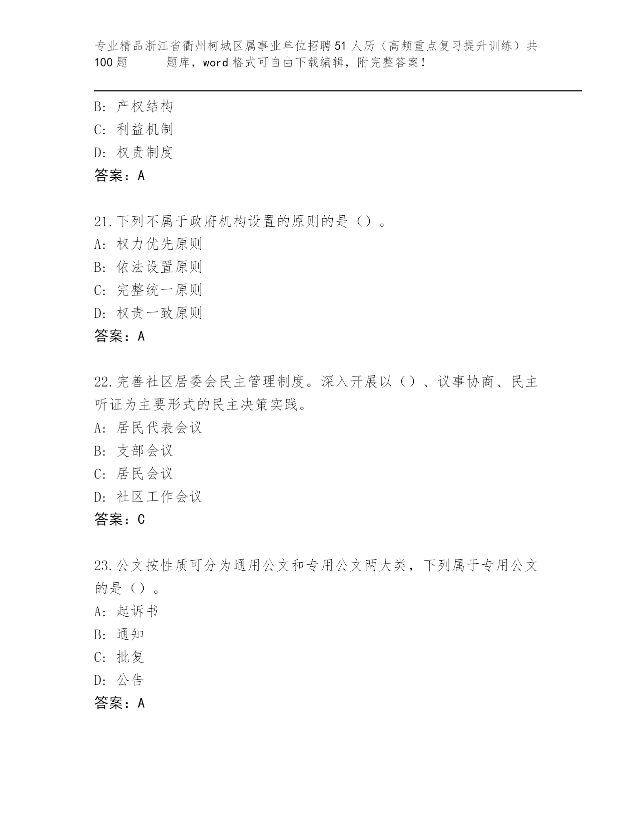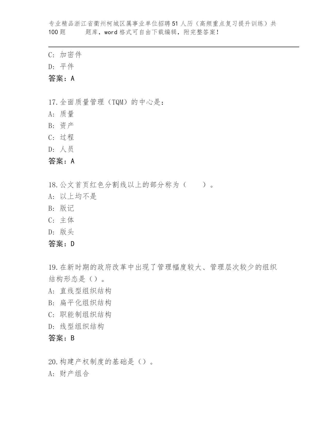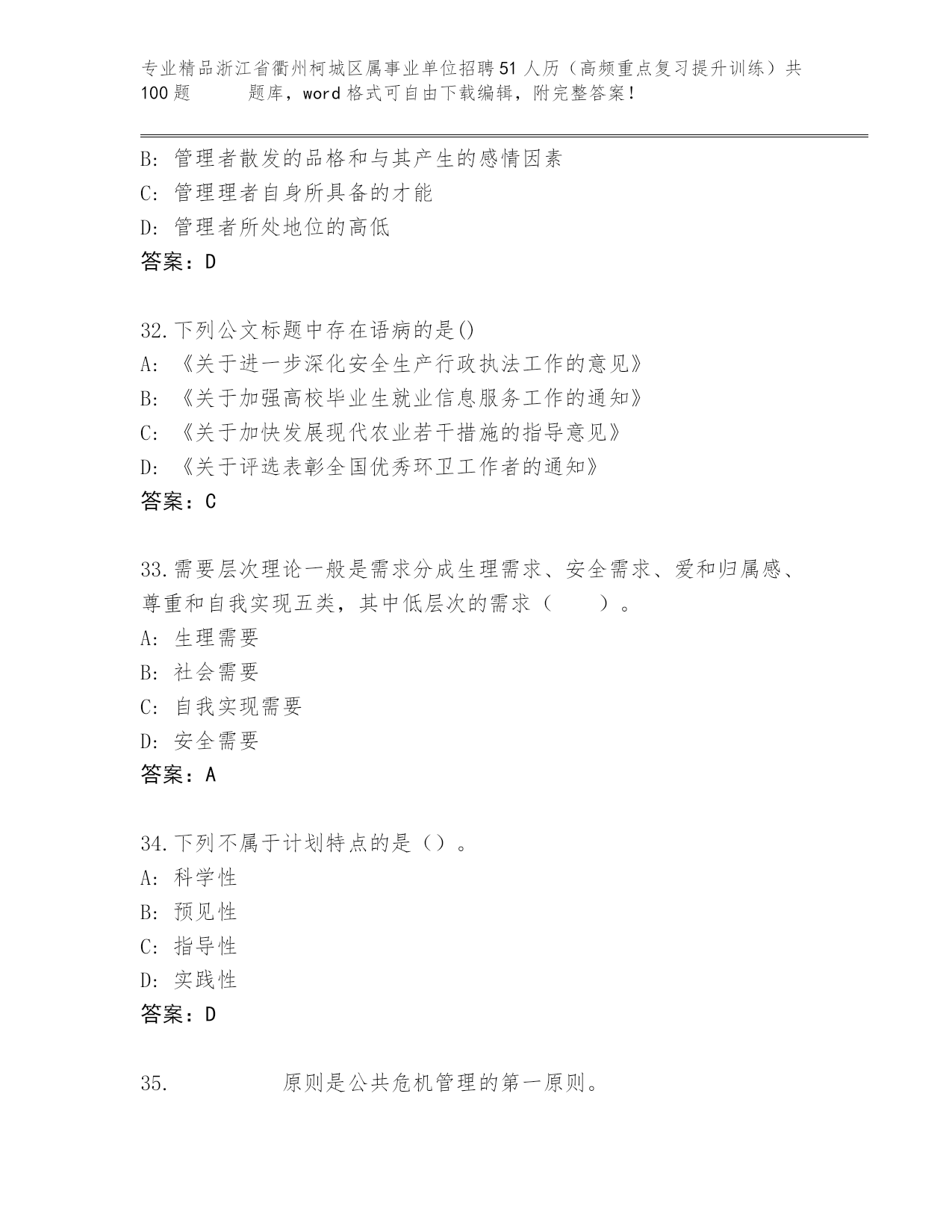 内部培训浙江省衢州柯城区属事业单位招聘51人历(高频重点复习提升训练)共100题 题库大全精品(A卷)