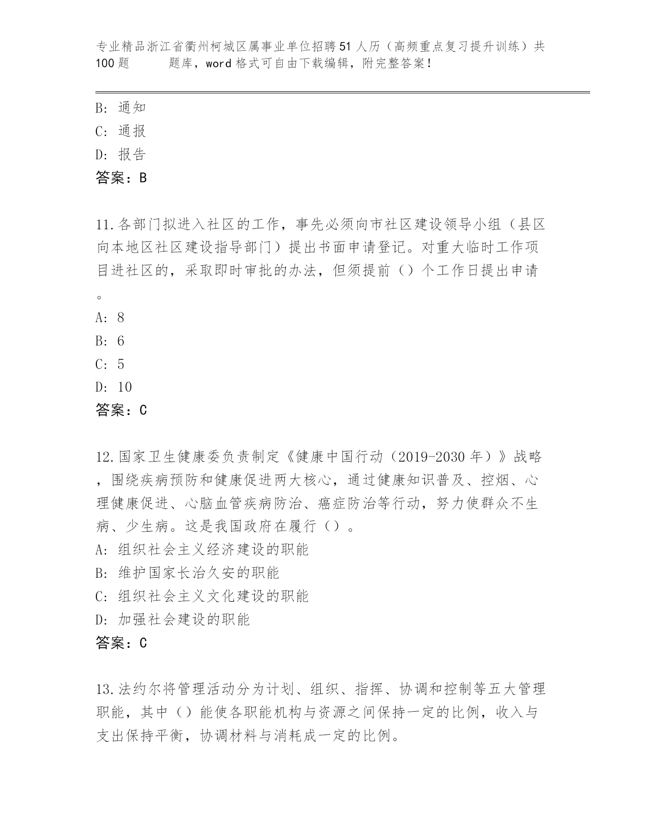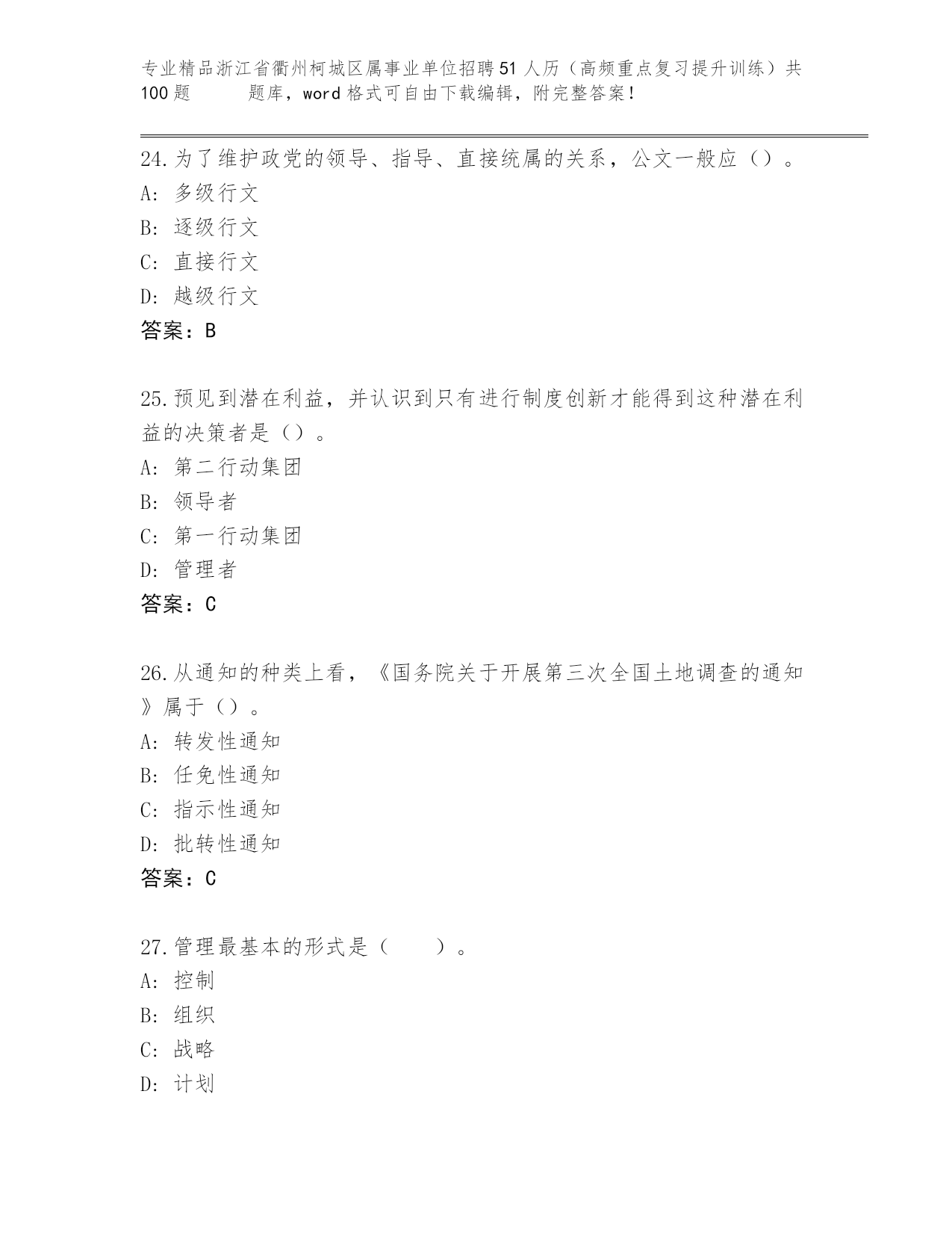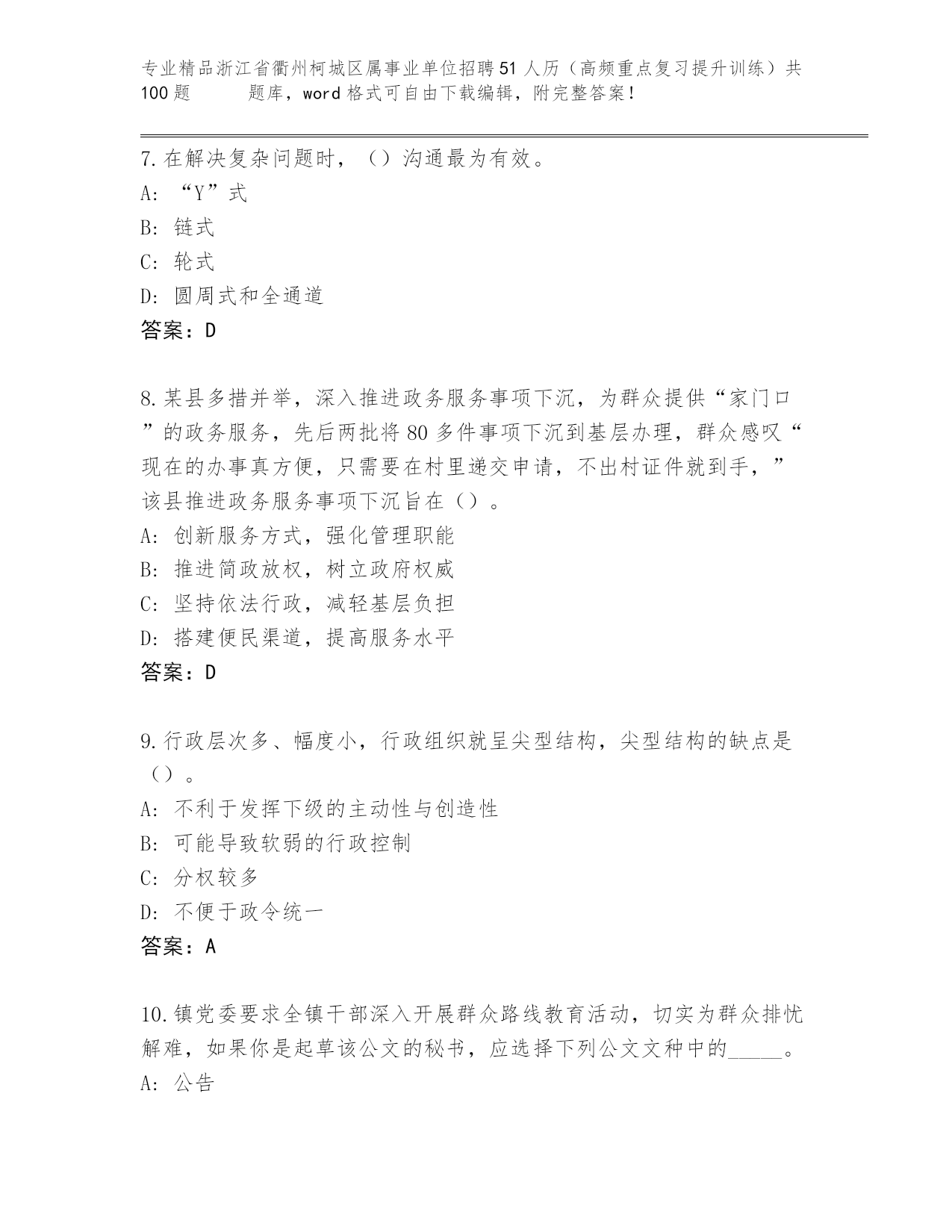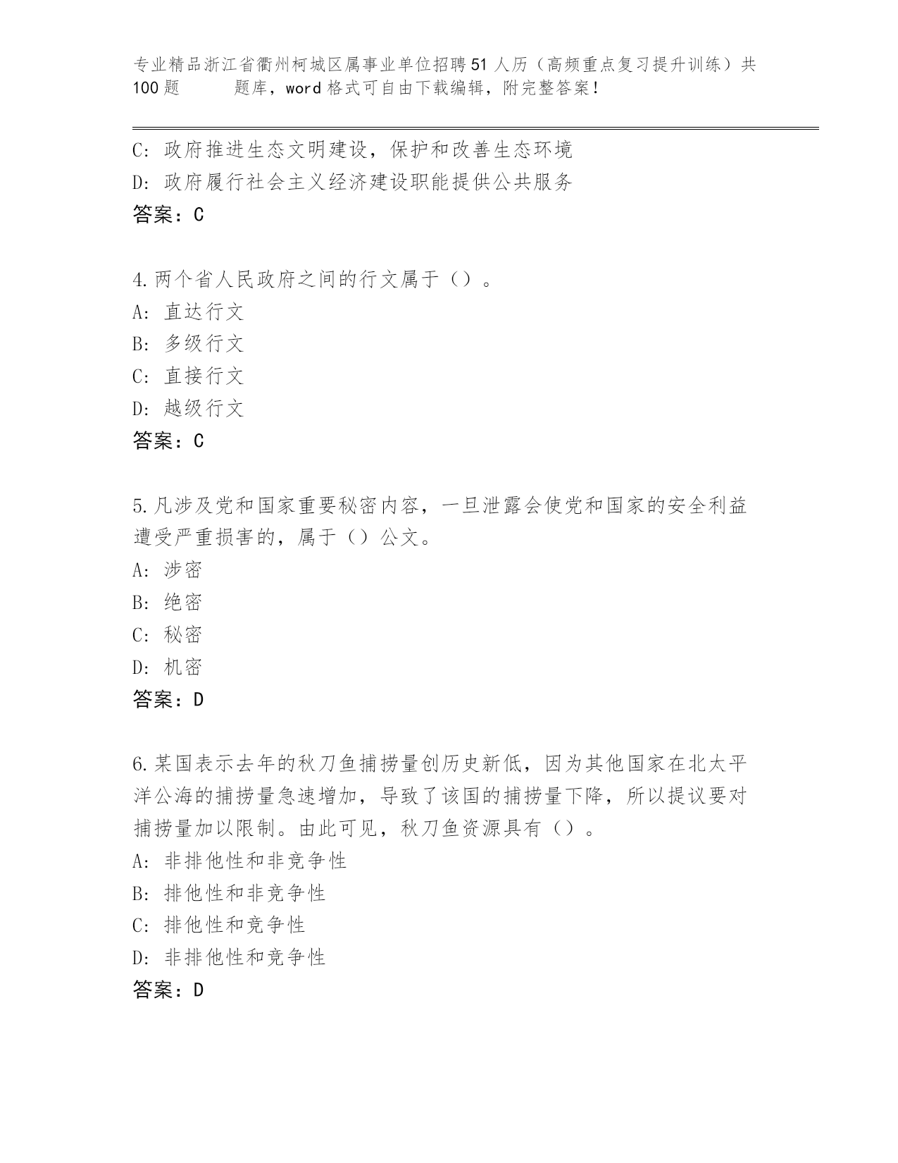 内部培训浙江省衢州柯城区属事业单位招聘51人历(高频重点复习提升训练)共100题 题库大全精品(A卷)