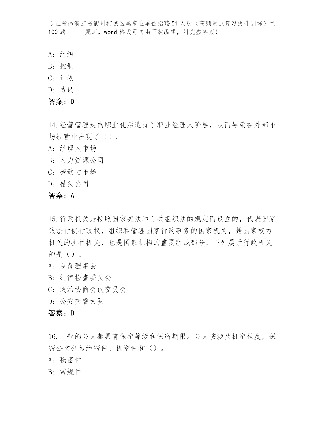 优选浙江省衢州柯城区属事业单位招聘51人历(高频重点复习提升训练)共100题 通用题库(名校卷)