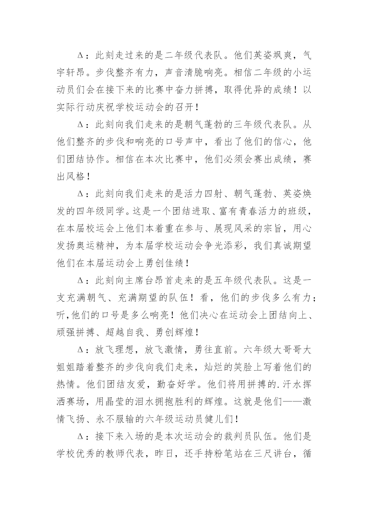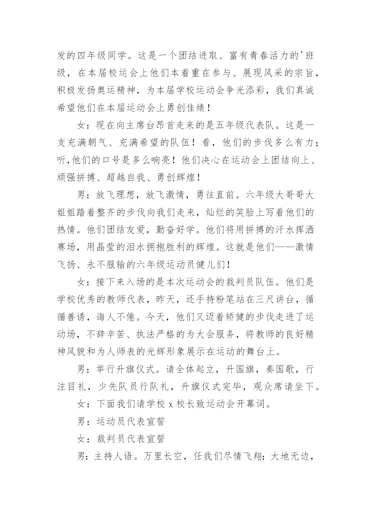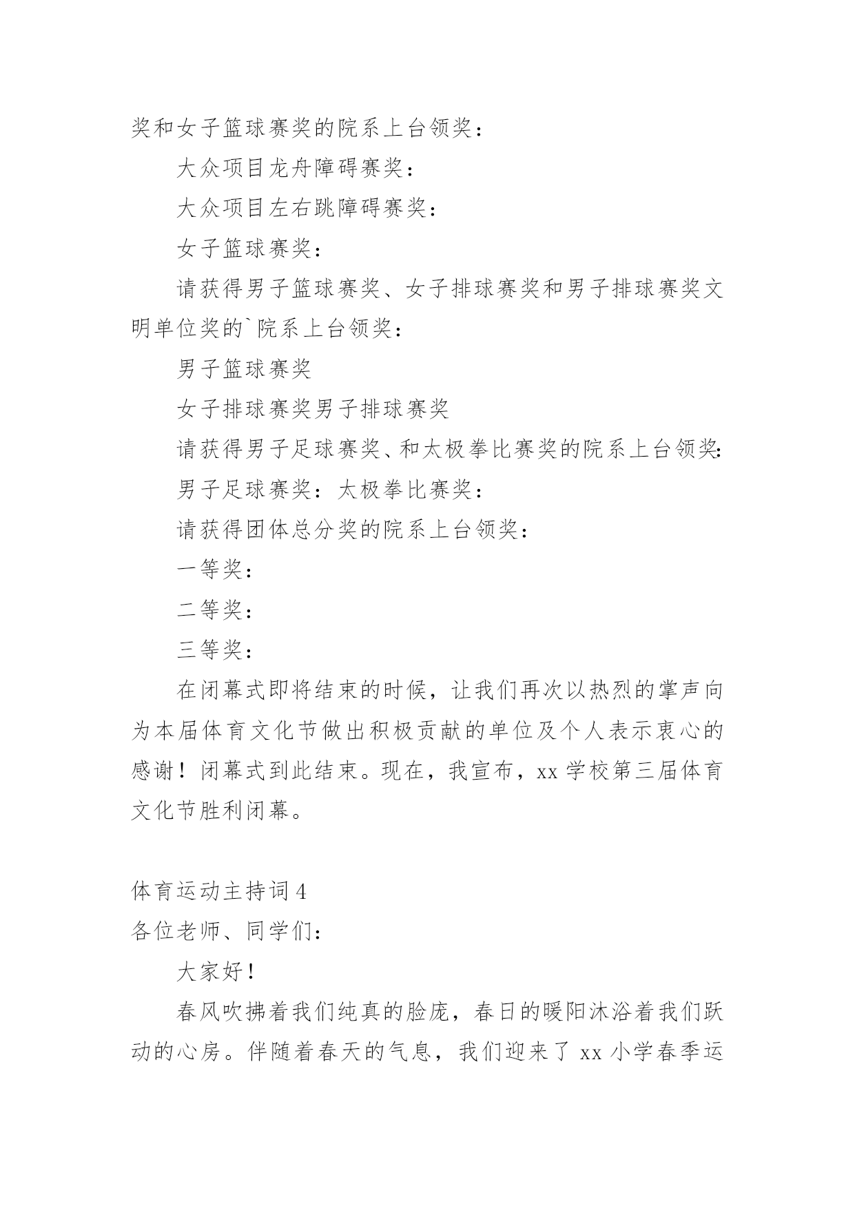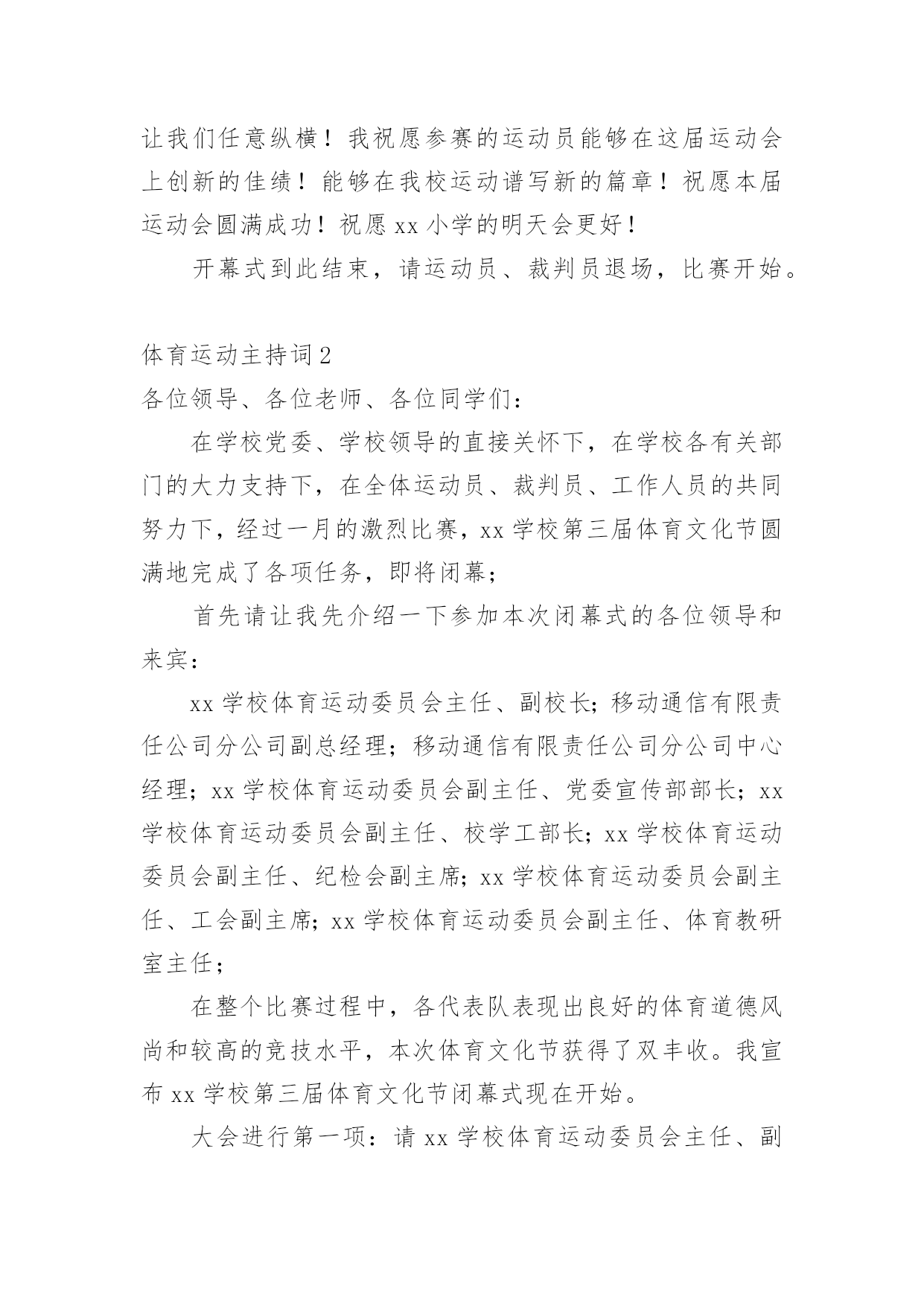 体育运动主持词体育运动主持词6篇主持词是主持人在台上表演的灵魂之所在。在当今社会生活中,各种场合可能都需要主持人,那么你会写主持词吗?下面是小编收集整理的体育运动主持词,希望能够帮助到大家。体育运动主持词1男:各位老师女:同学们:合:大家好!男:春风吹拂着我们纯真的脸庞,春日的暖阳沐浴着我们跃动的心房。伴随着春天的气息,我们迎来了xx小学春季运动会的胜利召开。女:在今天,我们将用行动践行奥林匹克精神,我们将用呐喊为xx小学春季运动会加油、为我们全体运动员们加油。男:本次运动会以文明、友谊、拼搏、向上为宗旨;努力发扬“拼搏,进取,友爱,互助”的精神,努力拼搏,勇攀高峰,赛出风格,赛出水平,充分展示个人风采,为各代表队增光,为校园添彩。女:在此,我代表全体师生向参加比赛的运动员表示热烈地祝贺!向本届运动会中的所有工作人员和服务人员表示衷心感谢!男:下面请x校长宣布“20xx年xx中学春季运动会开幕式现在开始!”女:请国旗队、运动员代表队、裁判员代表队入场。(播放运动员《进行曲》)入场式)男:首先进入我们视线的是国旗队!他们个个精神抖擞,意气风发!威仪又庄重,从他们炯炯有神的目光里我们看到了未来,看到了希望。女:走在队伍最前面的是我们一年级代表队。看!他们穿着整齐的服装,正向主席台走来。别看他们年纪小,个个都精神抖擞,充满生机,充满活力,一张张天真无邪的笑脸上洒满灿烂的阳光,他们是这次运动会的新生力量,多像是一群可爱的小天使哟!相信他们一定会以自己出色的表现为运动会增添新的色彩。小小的运动健儿们,祝你们成为本届运动会上最亮丽的一道风景线。男:现在走过来的是二年级代表队。他们英姿飒爽,气宇轩昂。步伐整齐有力,声音清脆响亮。相信二年级的小运动员们会在接下来的比赛中奋力拼搏,取得优异的成绩!以实际行动庆祝学校运动会的召开!女:现在向我们走来的是朝气蓬勃的三年级代表队。从他们整齐的步伐和响亮的口号声中,看出了他们的信心,他们团结协作。相信在本次比赛中,他们一定会赛出成绩,赛出风格!男:现在向我们走来的是活力四射、朝气蓬勃、英姿焕发的四年级同学。这是一个团结进取、富有青春活力的'班级,在本届校运会上他们本着重在参与、展现风采的宗旨,积极发扬奥运精神,为本届学校运动会争光添彩,我们真诚希望他们在本届运动会上勇创佳绩!女:现在向主席台昂首走来的是五年级代表队。这是一支充满朝气、充满希望的队伍!看,他们的步伐多么有力;听,他们的口号是多么响亮!他们决心在运动会上团结向上、顽强拼搏、超越自我、勇创辉煌!男:放飞理想,放飞激情,勇往直前。六年级大哥哥大姐姐踏着整齐的步伐向我们走来,灿烂的笑脸上写着他们的热情。他们团结友爱,勤奋好学。他们将用拼搏的汗水挥洒赛场,用晶莹的泪水拥抱胜利的辉煌。这就是他们——激情飞扬、永不服输的六年级运动员健儿们!女:接下来入场的是本次运动会的裁判员队伍。他们是学校优秀的教师代表,昨天,还手持粉笔站在三尺讲台,循循善诱,诲人不倦。今天,他们又迈着矫健的步伐走进了运动场,不辞辛苦、执法严格的为大会服务,将教师的良好精神风貌和为人师表的光辉形象展示在运动的舞台上。男:举行升旗仪式。请全体起立,升国旗,奏国歌,行注目礼,少先队员行队礼,升旗仪式完毕,观众席请坐下。女:下面我们请学校x校长致运动会开幕词。男:运动员代表宣誓女:裁判员代表宣誓男:主持人语。万里长空,任我们尽情飞翔;大地无边,让我们任意纵横!我祝愿参赛的运动员能够在这届运动会上创新的佳绩!能够在我校运动谱写新的篇章!祝愿本届运动会圆满成功!祝愿xx小学的明天会更好!开幕式到此结束,请运动员、裁判员退场,比赛开始。体育运动主持词2各位领导、各位老师、各位同学们:在学校党委、学校领导的直接关怀下,在学校各有关部门的大力支持下,在全体运动员、裁判员、工作人员的共同努力下,经过一月的激烈比赛,xx学校第三届体育文化节圆满地完成了各项任务,即将闭幕;首先请让我先介绍一下参加本次闭幕式的各位领导和来宾:xx学校体育运动委员会主任、副校长;移动通信有限责任公司分公司副总经理;移动通信有限责任公司分公司中心经理;xx学校体育运动委员会副主任、党委宣传部部长;xx学校体育运动委员会副主任、校学工部长;xx学校体育运动委员会副主任、纪检会副主席;xx学校体育运动委员会副主任、工会副主席;xx学校体育运动委员会副主任、体育教研室主任;在整个比赛过程中,各代表队表现出良好的体育道德风尚和较高的竞技水平,本次体育文化节获得了双丰收。我宣布xx学校第三届体育文化节闭幕式现在开始。大会进行第一项:请xx学校体育运动委员会主任、副校长致闭幕词。大会进行第二项:请移动通信有限责任公司分公司副总经理讲话。大会进行第三项:请xx学校体育运动委员会副主任、xx学校第三届体育文化节总栽判长宣布各项比赛成绩及入