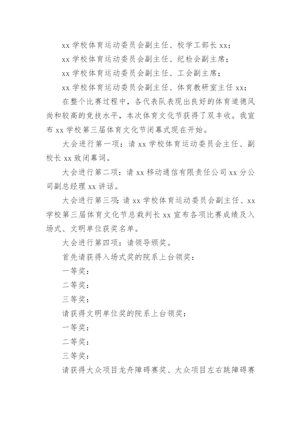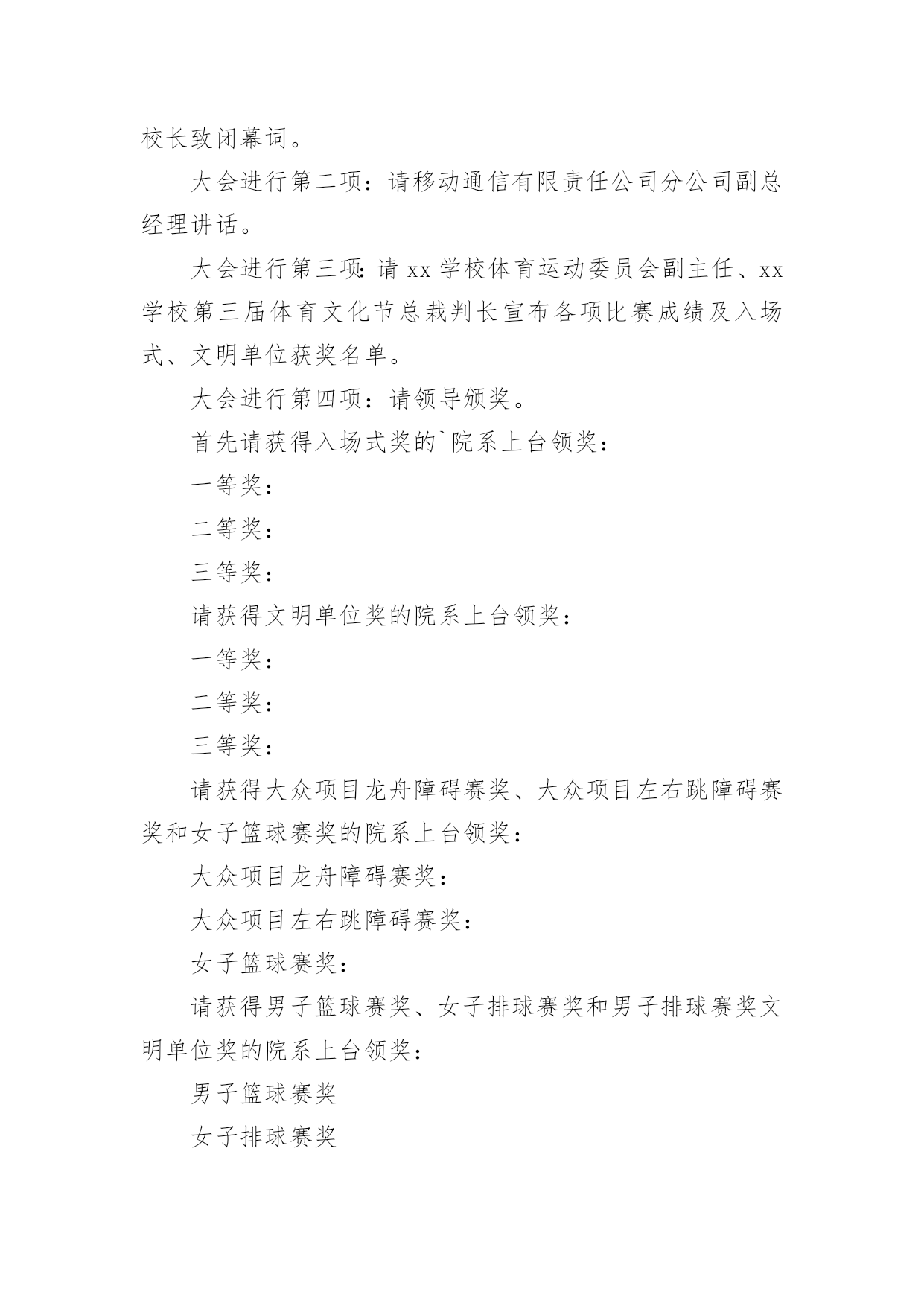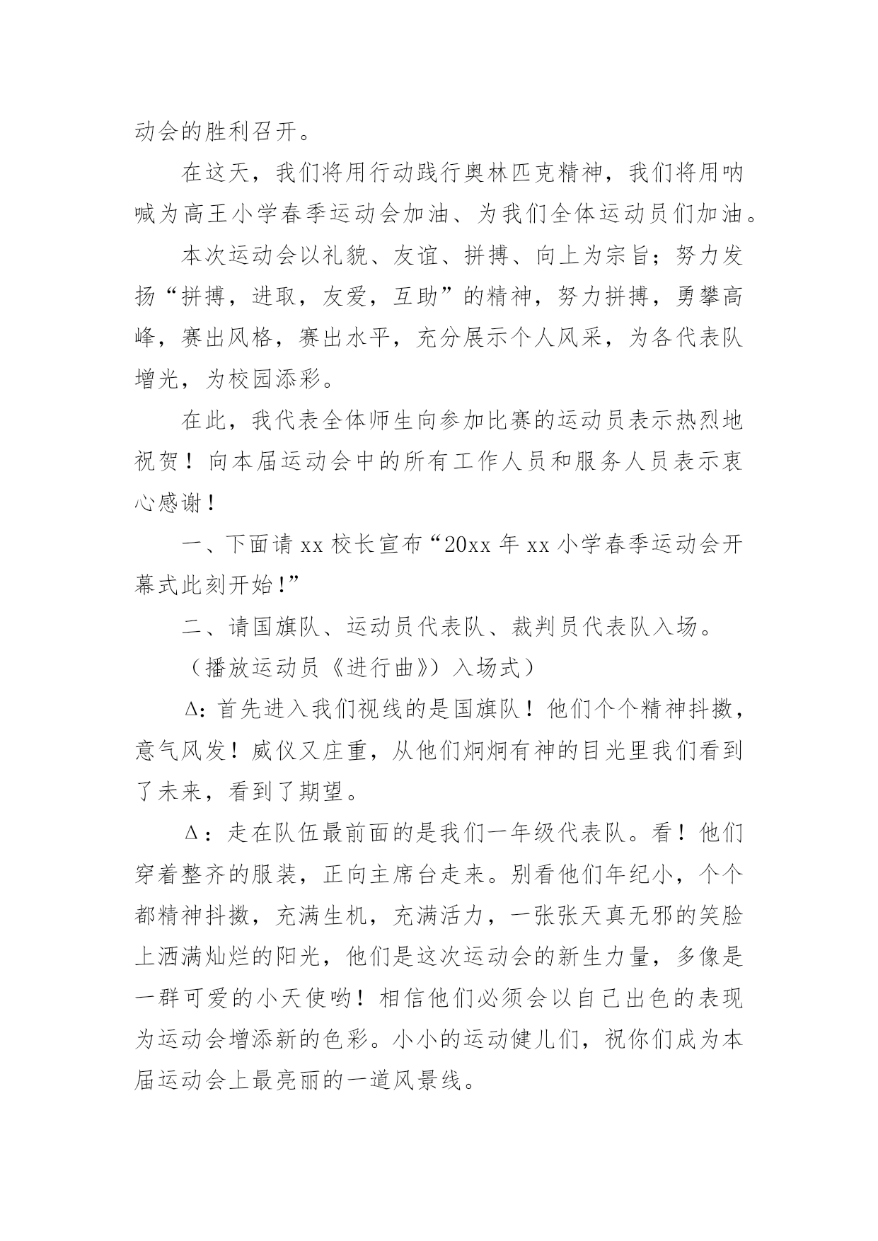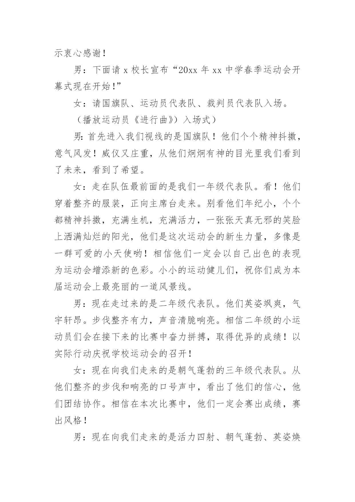 体育运动主持词体育运动主持词6篇主持词是主持人在台上表演的灵魂之所在。在当今社会生活中,各种场合可能都需要主持人,那么你会写主持词吗?下面是小编收集整理的体育运动主持词,希望能够帮助到大家。体育运动主持词1男:各位老师女:同学们:合:大家好!男:春风吹拂着我们纯真的脸庞,春日的暖阳沐浴着我们跃动的心房。伴随着春天的气息,我们迎来了xx小学春季运动会的胜利召开。女:在今天,我们将用行动践行奥林匹克精神,我们将用呐喊为xx小学春季运动会加油、为我们全体运动员们加油。男:本次运动会以文明、友谊、拼搏、向上为宗旨;努力发扬“拼搏,进取,友爱,互助”的精神,努力拼搏,勇攀高峰,赛出风格,赛出水平,充分展示个人风采,为各代表队增光,为校园添彩。女:在此,我代表全体师生向参加比赛的运动员表示热烈地祝贺!向本届运动会中的所有工作人员和服务人员表示衷心感谢!男:下面请x校长宣布“20xx年xx中学春季运动会开幕式现在开始!”女:请国旗队、运动员代表队、裁判员代表队入场。(播放运动员《进行曲》)入场式)男:首先进入我们视线的是国旗队!他们个个精神抖擞,意气风发!威仪又庄重,从他们炯炯有神的目光里我们看到了未来,看到了希望。女:走在队伍最前面的是我们一年级代表队。看!他们穿着整齐的服装,正向主席台走来。别看他们年纪小,个个都精神抖擞,充满生机,充满活力,一张张天真无邪的笑脸上洒满灿烂的阳光,他们是这次运动会的新生力量,多像是一群可爱的小天使哟!相信他们一定会以自己出色的表现为运动会增添新的色彩。小小的运动健儿们,祝你们成为本届运动会上最亮丽的一道风景线。男:现在走过来的是二年级代表队。他们英姿飒爽,气宇轩昂。步伐整齐有力,声音清脆响亮。相信二年级的小运动员们会在接下来的比赛中奋力拼搏,取得优异的成绩!以实际行动庆祝学校运动会的召开!女:现在向我们走来的是朝气蓬勃的三年级代表队。从他们整齐的步伐和响亮的口号声中,看出了他们的信心,他们团结协作。相信在本次比赛中,他们一定会赛出成绩,赛出风格!男:现在向我们走来的是活力四射、朝气蓬勃、英姿焕发的四年级同学。这是一个团结进取、富有青春活力的'班级,在本届校运会上他们本着重在参与、展现风采的宗旨,积极发扬奥运精神,为本届学校运动会争光添彩,我们真诚希望他们在本届运动会上勇创佳绩!女:现在向主席台昂首走来的是五年级代表队。这是一支充满朝气、充满希望的队伍!看,他们的步伐多么有力;听,他们的口号是多么响亮!他们决心在运动会上团结向上、顽强拼搏、超越自我、勇创辉煌!男:放飞理想,放飞激情,勇往直前。六年级大哥哥大姐姐踏着整齐的步伐向我们走来,灿烂的笑脸上写着他们的热情。他们团结友爱,勤奋好学。他们将用拼搏的汗水挥洒赛场,用晶莹的泪水拥抱胜利的辉煌。这就是他们——激情飞扬、永不服输的六年级运动员健儿们!女:接下来入场的是本次运动会的裁判员队伍。他们是学校优秀的教师代表,昨天,还手持粉笔站在三尺讲台,循循善诱,诲人不倦。今天,他们又迈着矫健的步伐走进了运动场,不辞辛苦、执法严格的为大会服务,将教师的良好精神风貌和为人师表的光辉形象展示在运动的舞台上。男:举行升旗仪式。请全体起立,升国旗,奏国歌,行注目礼,少先队员行队礼,升旗仪式完毕,观众席请坐下。女:下面我们请学校x校长致运动会开幕词。男:运动员代表宣誓女:裁判员代表宣誓男:主持人语。万里长空,任我们尽情飞翔;大地无边,让我们任意纵横!我祝愿参赛的运动员能够在这届运动会上创新的佳绩!能够在我校运动谱写新的篇章!祝愿本届运动会圆满成功!祝愿xx小学的明天会更好!开幕式到此结束,请运动员、裁判员退场,比赛开始。体育运动主持词2各位领导、各位老师、各位同学们:在学校党委、学校领导的直接关怀下,在学校各有关部门的大力支持下,在全体运动员、裁判员、工作人员的共同努力下,经过一月的激烈比赛,xx学校第三届体育文化节圆满地完成了各项任务,即将闭幕;首先请让我先介绍一下参加本次闭幕式的各位领导和来宾:xx学校体育运动委员会主任、副校长;移动通信有限责任公司分公司副总经理;移动通信有限责任公司分公司中心经理;xx学校体育运动委员会副主任、党委宣传部部长;xx学校体育运动委员会副主任、校学工部长;xx学校体育运动委员会副主任、纪检会副主席;xx学校体育运动委员会副主任、工会副主席;xx学校体育运动委员会副主任、体育教研室主任;在整个比赛过程中,各代表队表现出良好的体育道德风尚和较高的竞技水平,本次体育文化节获得了双丰收。我宣布xx学校第三届体育文化节闭幕式现在开始。大会进行第一项:请xx学校体育运动委员会主任、副校长致闭幕词。大会进行第二项:请移动通信有限责任公司分公司副总经理讲话。大会进行第三项:请xx学校体育运动委员会副主任、xx学校第三届体育文化节总栽判长宣布各项比赛成绩及入