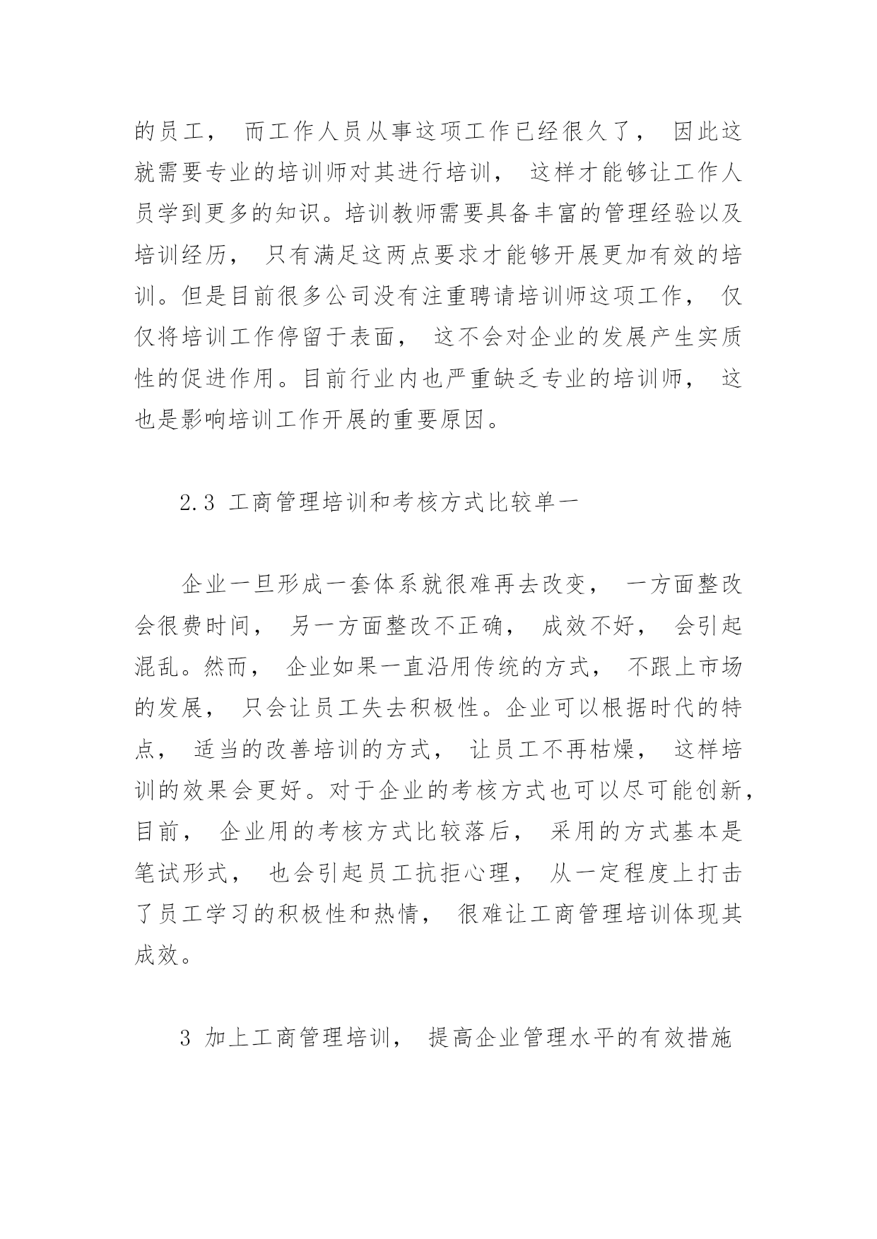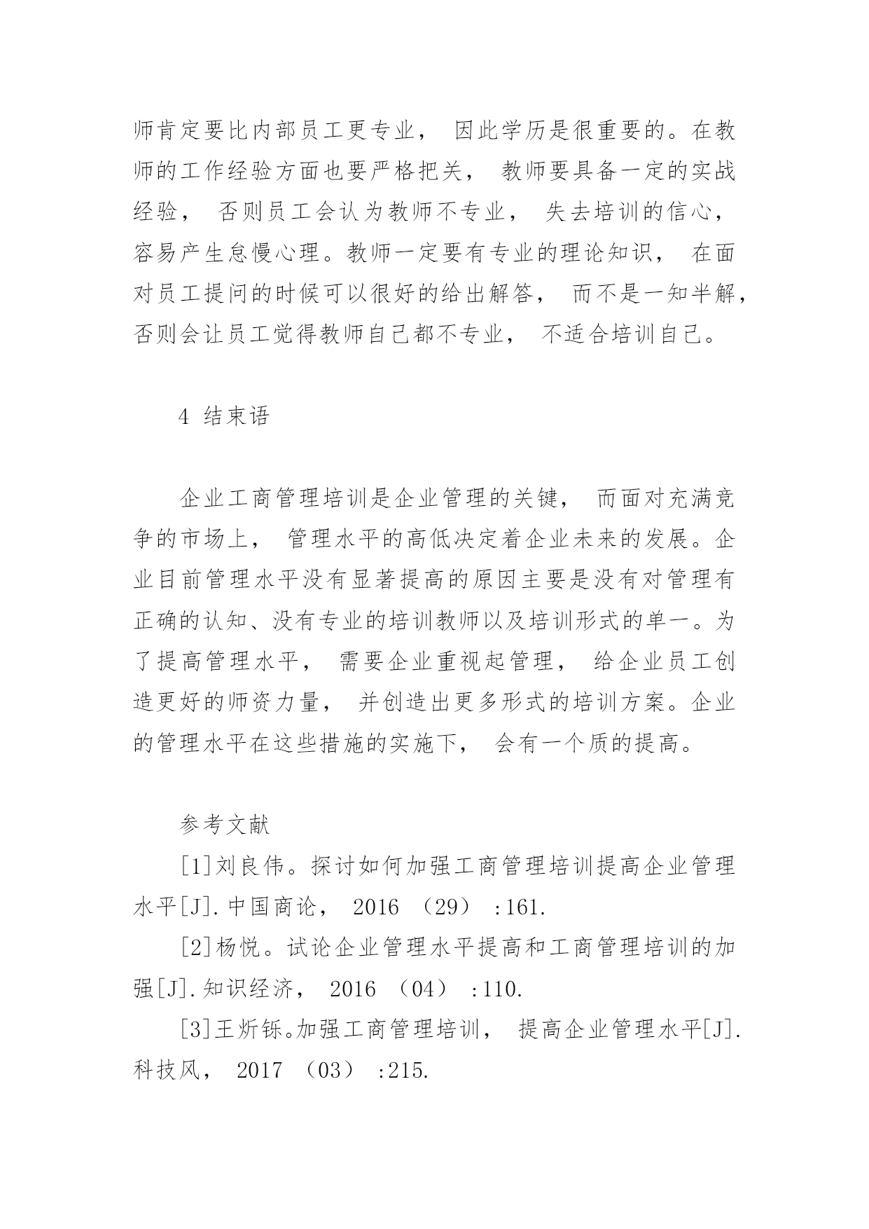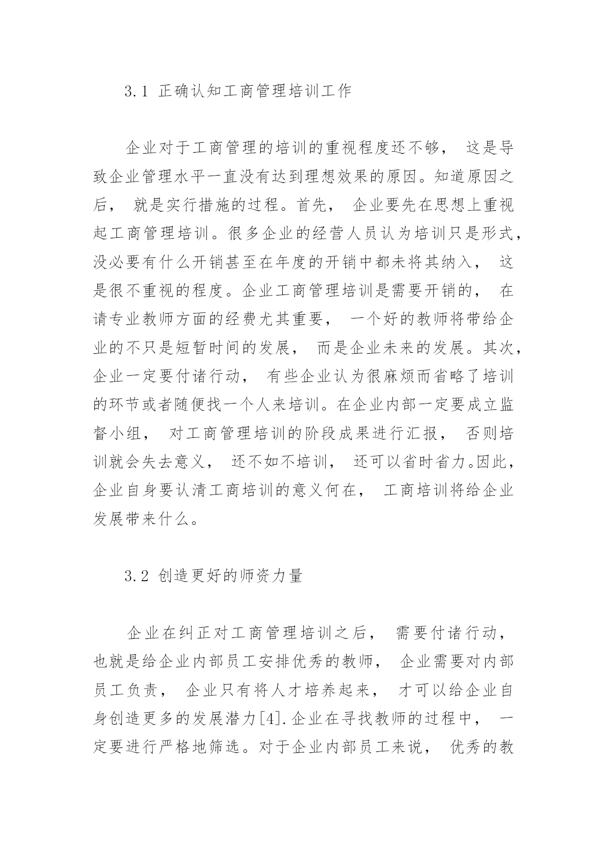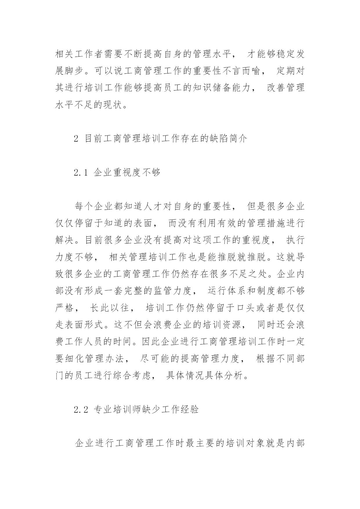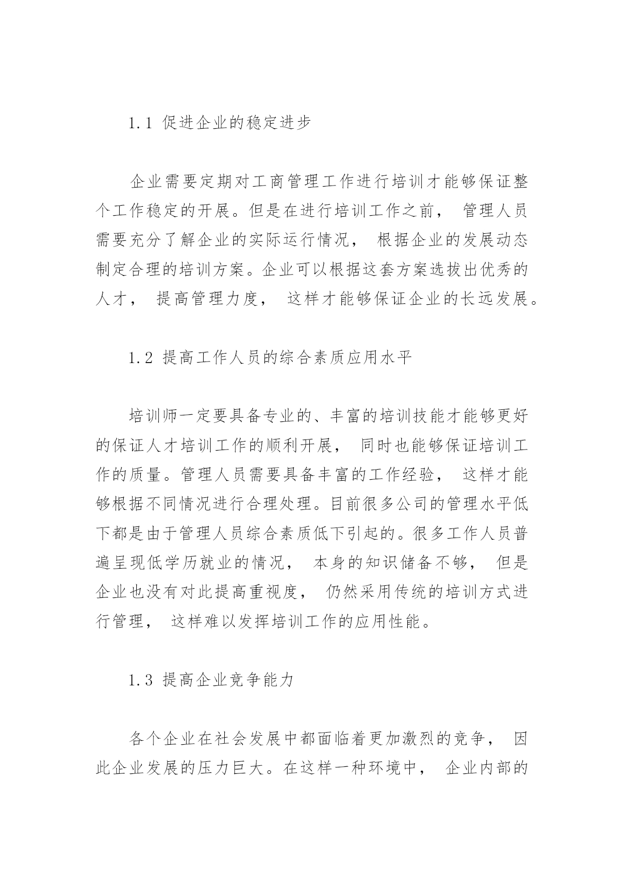 工商管理培训工作的意义探讨工商管理培训工作的意义探讨电大工商本科毕业论文名师推荐范文8篇之第五篇:工商管理培训工作的意义探讨摘要:对于一个企业而言,人才是这个企业发展的根本核心所在,目前很多企业都开始注重人才管理工作,逐渐加强管理工作的开展力度。企业能够有这种管理意识是非常难能可贵的,但是目前很多企业仍然没有从根本上提高管理水平,这项工作仍然存在很多不足之处。关键词:管理措施;培训方案;价值应用;企业发展;企业要想取得可持续性的发展就需要不断提高现有管理工作的水平,这样才能够为后续的发展提供良好的基础。但是实际进行工商管理工作时,工作人员经常会面临各种问题。开展培训工作的前提是要依据企业的发展情况为根本基础,基于实际情况制定适当的管理方案。1进行工商管理培训工作的重要意义1.1促进企业的稳定进步企业需要定期对工商管理工作进行培训才能够保证整个工作稳定的开展。但是在进行培训工作之前,管理人员需要充分了解企业的实际运行情况,根据企业的发展动态制定合理的培训方案。企业可以根据这套方案选拔出优秀的人才,提高管理力度,这样才能够保证企业的长远发展。1.2提高工作人员的综合素质应用水平培训师一定要具备专业的、丰富的培训技能才能够更好的保证人才培训工作的顺利开展,同时也能够保证培训工作的质量。管理人员需要具备丰富的工作经验,这样才能够根据不同情况进行合理处理。目前很多公司的管理水平低下都是由于管理人员综合素质低下引起的。很多工作人员普遍呈现低学历就业的情况,本身的知识储备不够,但是企业也没有对此提高重视度,仍然采用传统的培训方式进行管理,这样难以发挥培训工作的应用性能。1.3提高企业竞争能力各个企业在社会发展中都面临着更加激烈的竞争,因此企业发展的压力巨大。在这样一种环境中,企业内部的相关工作者需要不断提高自身的管理水平,才能够稳定发展脚步。可以说工商管理工作的重要性不言而喻,定期对其进行培训工作能够提高员工的知识储备能力,改善管理水平不足的现状。2目前工商管理培训工作存在的缺陷简介2.1企业重视度不够每个企业都知道人才对自身的重要性,但是很多企业仅仅停留于知道的表面,而没有利用有效的管理措施进行解决。目前很多企业没有提高对这项工作的重视度,执行力度不够,相关管理培训工作也是能推脱就推脱。这就导致很多企业的工商管理工作仍然存在很多不足之处。企业内部没有形成一套完整的监管力度,运行体系和制度都不够严格,长此以往,培训工作仍然停留于口头或者是仅仅走表面形式。这不但会浪费企业的培训资源,同时还会浪费工作人员的时间。因此企业进行工商管理培训工作时一定要细化管理办法,尽可能的提高管理力度,根据不同部门的员工进行综合考虑,具体情况具体分析。2.2专业培训师缺少工作经验企业进行工商管理工作时最主要的培训对象就是内部的员工,而工作人员从事这项工作已经很久了,因此这就需要专业的培训师对其进行培训,这样才能够让工作人员学到更多的知识。培训教师需要具备丰富的管理经验以及培训经历,只有满足这两点要求才能够开展更加有效的培训。但是目前很多公司没有注重聘请培训师这项工作,仅仅将培训工作停留于表面,这不会对企业的发展产生实质性的促进作用。目前行业内也严重缺乏专业的培训师,这也是影响培训工作开展的重要原因。2.3工商管理培训和考核方式比较单一企业一旦形成一套体系就很难再去改变,一方面整改会很费时间,另一方面整改不正确,成效不好,会引起混乱。然而,企业如果一直沿用传统的方式,不跟上市场的发展,只会让员工失去积极性。企业可以根据时代的特点,适当的改善培训的方式,让员工不再枯燥,这样培训的效果会更好。对于企业的考核方式也可以尽可能创新,目前,企业用的考核方式比较落后,采用的方式基本是笔试形式,也会引起员工抗拒心理,从一定程度上打击了员工学习的积极性和热情,很难让工商管理培训体现其成效。3加上工商管理培训,提高企业管理水平的有效措施3.1正确认知工商管理培训工作企业对于工商管理的培训的重视程度还不够,这是导致企业管理水平一直没有达到理想效果的原因。知道原因之后,就是实行措施的过程。首先,企业要先在思想上重视起工商管理培训。很多企业的经营人员认为培训只是形式,没必要有什么开销甚至在年度的开销中都未将其纳入,这是很不重视的程度。企业工商管理培训是需要开销的,在请专业教师方面的经费尤其重要,一个好的教师将带给企业的不只是短暂时间的发展,而是企业未来的发展。其次,企业一定要付诸行动,有些企业认为很麻烦而省略了培训的环节或者随便找一个人来培训。在企业内部一定要成立监督小组,对工商管理培训的阶段成果进行汇报,否则培训就会失去意义,还不如不培训,还可以省时省力。因此,企业自身要认清工商培训的意义何在,工商培训将给企业发展带来什么。3.2创造更好的师资力量企业在纠正对工商管理培训之后,需要付