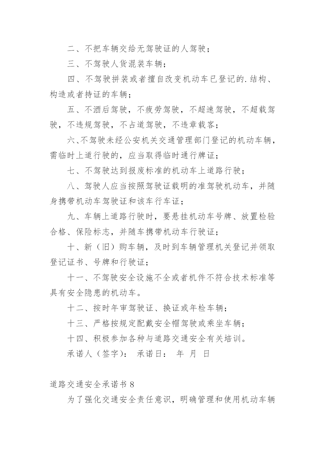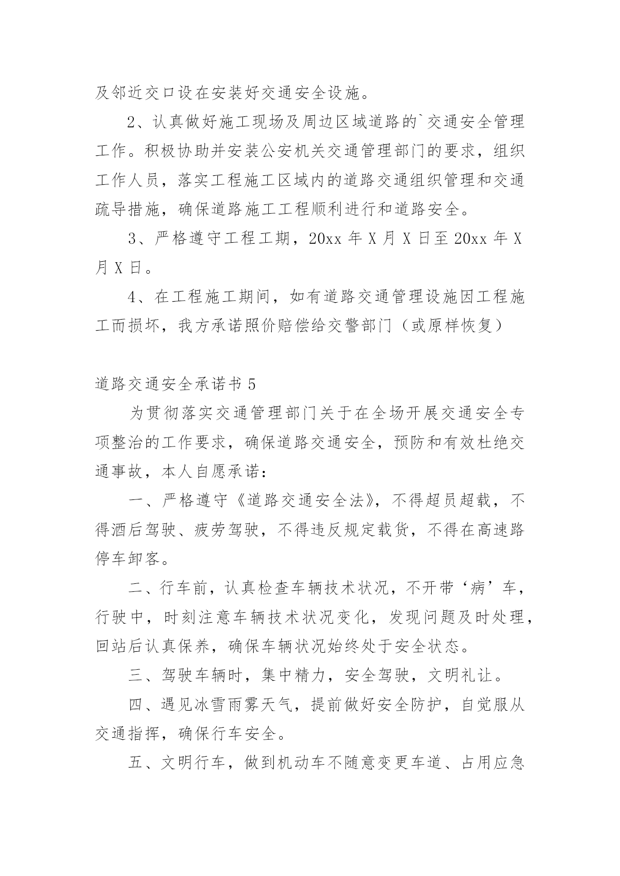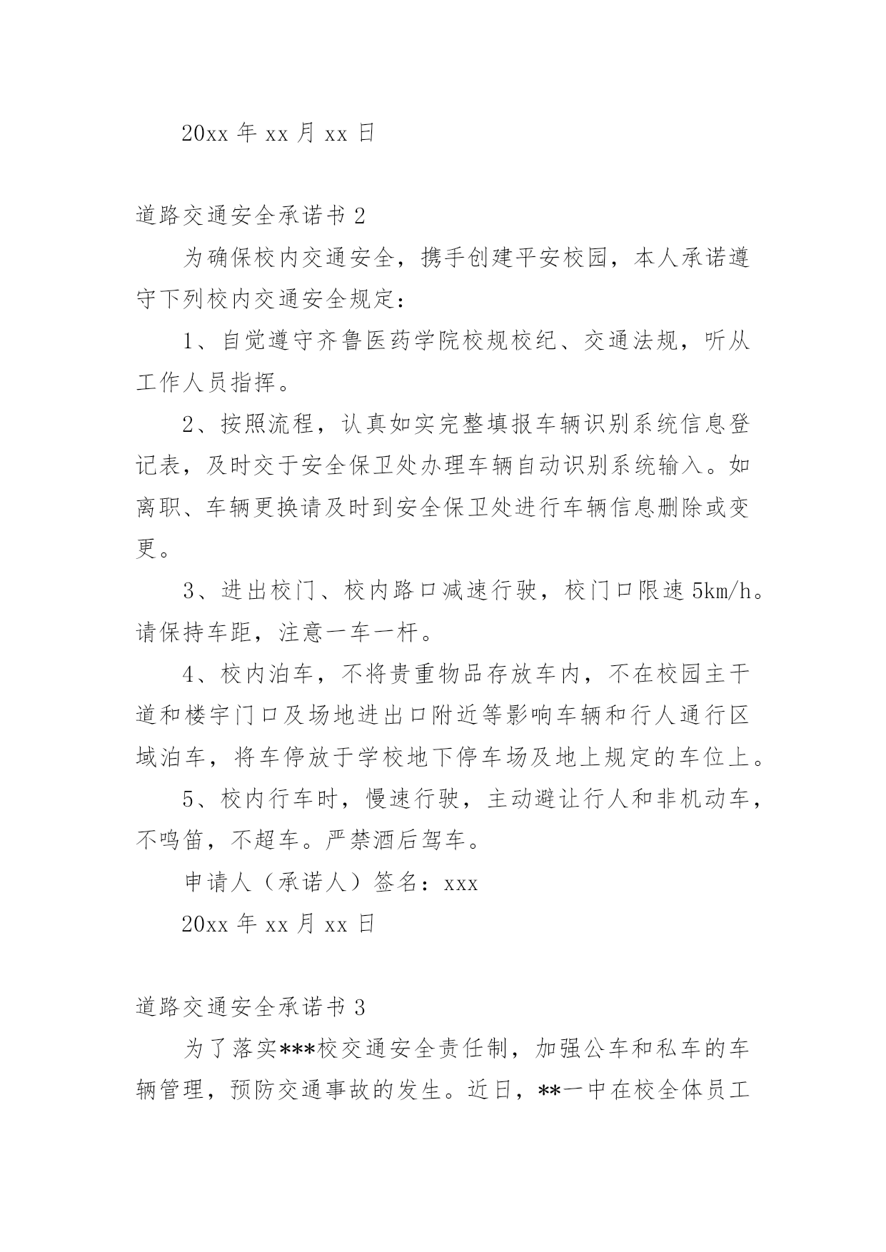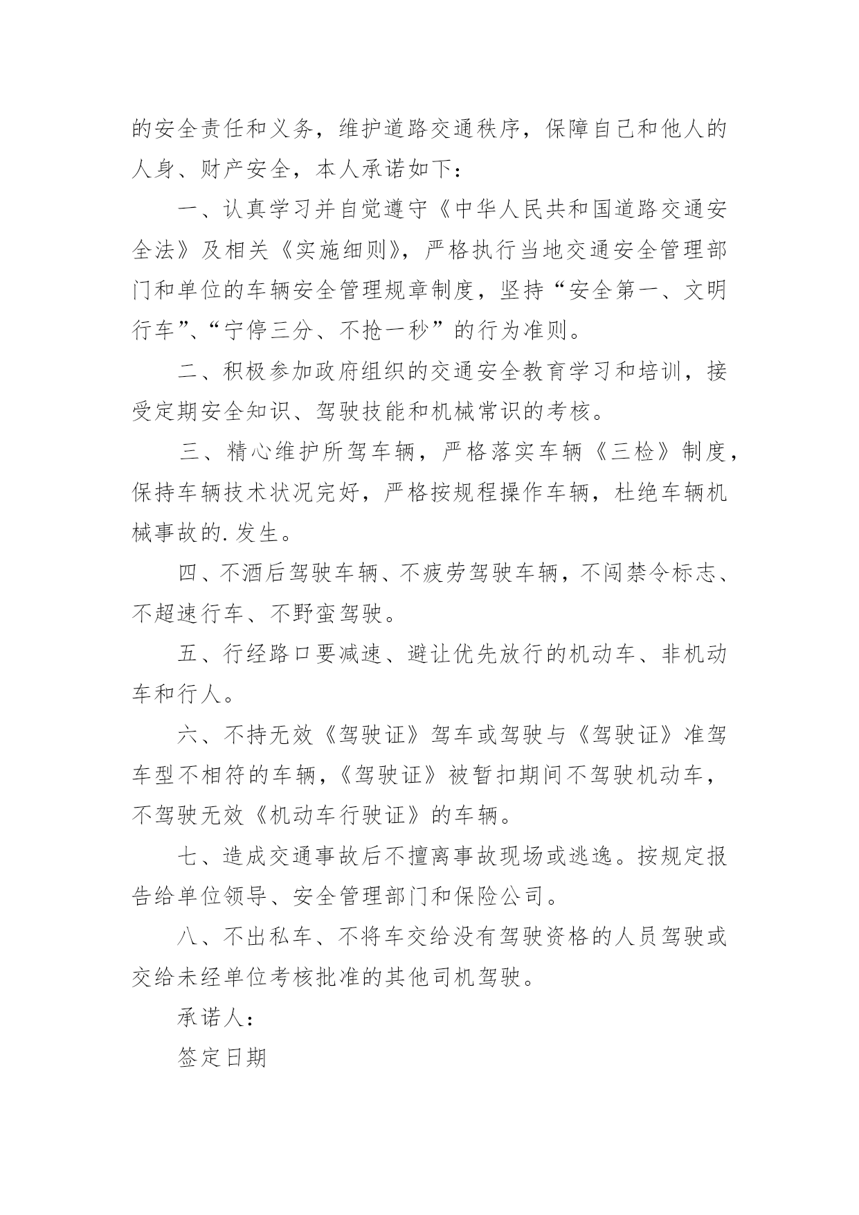 道路交通安全承诺书现如今,承诺书与我们的生活息息相关,承诺书在写作上具有一定的格式要求。为了让您在写承诺书时更加简单方便,下面是小编为大家整理的道路交通安全承诺书,希望对大家有所帮助。道路交通安全承诺书1为了防止交通事故的发生,根据上级集中整治“三超一疲劳”专项行动,保障广大旅客出行安全,本人承诺如下:一、严格遵守《道路交通安全法》及相关交通法规,不超速行驶,不超员载客,不疲劳驾驶,不酒后驾驶,不在高速上停车上下旅客。二、行车前,认真检查车辆技术状况,不开带病车,行车中,时刻注意车辆技术状况变化,发现问题及时处置,回站后,认真保养车辆,确保车辆状况始终处于完好状态。三、驾驶车辆时,集中精力,安全驾驶,文明礼让。四、遇有冰雪雾天气,提前做好安全防护,自觉服从交通指挥,确保行车安全。五、积极参加单位组织的交通安全宣传教育活动,自觉提高交通安全意识,做到警钟长鸣。车辆牌号:xx承诺人:xxx联系电话:xx20xx年xx月xx日道路交通安全承诺书2为确保校内交通安全,携手创建平安校园,本人承诺遵守下列校内交通安全规定:1、自觉遵守齐鲁医药学院校规校纪、交通法规,听从工作人员指挥。2、按照流程,认真如实完整填报车辆识别系统信息登记表,及时交于安全保卫处办理车辆自动识别系统输入。如离职、车辆更换请及时到安全保卫处进行车辆信息删除或变更。3、进出校门、校内路口减速行驶,校门口限速5km/h。请保持车距,注意一车一杆。4、校内泊车,不将贵重物品存放车内,不在校园主干道和楼宇门口及场地进出口附近等影响车辆和行人通行区域泊车,将车停放于学校地下停车场及地上规定的车位上。5、校内行车时,慢速行驶,主动避让行人和非机动车,不鸣笛,不超车。严禁酒后驾车。申请人(承诺人)签名:xxx20xx年xx月xx日道路交通安全承诺书3为了落实***校交通安全责任制,加强公车和私车的车辆管理,预防交通事故的发生。近日,**一中在校全体员工中签定交通安全保证书,要求全体员工要自觉遵守公司的各项交通管理制度,杜绝各类交通事故的发生,交通安全保证书签定率达到100%。一是学校对因学习需要外出办事的人员,实行统一派车制度,职工不得驾驶私有机动车办公事,不允许驾驶公车办私车,对违反规定者,发生交通事故由交通管理部门处理,公司不承担任何责任;二是公司专职驾驶员要认真学习《交通安全法》等法律法规。坚持出车前、行驶中、收车后的车辆检查,不开带病车,不酒后驾车,不无证驾车,不肇事逃逸,开文明车。自觉遵守单位的交通安全管理和日常管理;三是公司根据职工居住地区分布情况,配发了班车,因此,凡职工驾驶车辆、骑摩托车和自行车上下班者,属个人行为,如发生交通事故,公司不承担任何责任;四是根据钻二质安[20xx]4号和钻二[20xx]1号文《关于转发“关于禁止一线钻井职工在队期间回家的通知”的`通知》的文件规定,钻井队职工在队上班和下班休息期间禁止回家,换班时职工必须统一乘坐公司安排的换班车,禁止驾车、骑摩托车和自车倒班,否则,发生交通事故公司不承担任何责任。我坚决响应学校“关爱生命、文明乘车、安全出行”的号召,自觉遵守,并大力向家人宣传交通规则,做到:1、不骑车上学,不骑车载人,未满14岁不骑车上路;2、认真学习交通知识,严守道路交通规则;3、坚决拒坐“三轮车、三无车、超载车”等不附合安全规范的车辆;4、路途中坚决做到“一躲避、二靠边、三观望、四通过”的原则;5、服从学校安全监督员的管理,严守上下楼梯“不拥挤、不奔跑、不推搡”的原则。承诺人:承诺时间:道路交通安全承诺书4因广州市广园东路沿线水浸点改造建设,我单位需临时占用、挖掘广园快速路上分别位于科韵路立交东北、东南、西北、西南的四个地点以及广园快速路珠吉路口,实施广州市广园东路沿线水浸点改造工程。为了减少工程对道路安全和管理的影响,确保道路施工顺利进行和该区域内的交通安全、有序、畅通,根据《中华人民共和国道路交通安全法》及其《实施条例》等有关法律法规的规定,我单位承诺做到:1、认真做好施工现场安全防护工程。在道路工程施工开挖前,负责落实施工区域外围维护(使用白色彩钢板或钢护栏实行全封闭施工)保证道路的整洁,并做好沿路各单位及居民的宣传、解释工作。在道路施工期间,严格按照《中华人民共和国道路交通安全法》及其《实施条例》、等法律、法规、标准以及道路安全管理的实际需要,负责在施工路段及邻近交口设在安装好交通安全设施。2、认真做好施工现场及周边区域道路的`交通安全管理工作。积极协助并安装公安机关交通管理部门的要求,组织工作人员,落实工程施工区域内的道路交通组织管理和交通疏导措施,确保道路施工工程顺利进行和道路安全。3、严格遵守工程工期,20xx年X月X日至20xx年X月X日。4、在工程施工期间,如有道路交通管理设施因工程施工而损坏,我方承诺照价赔