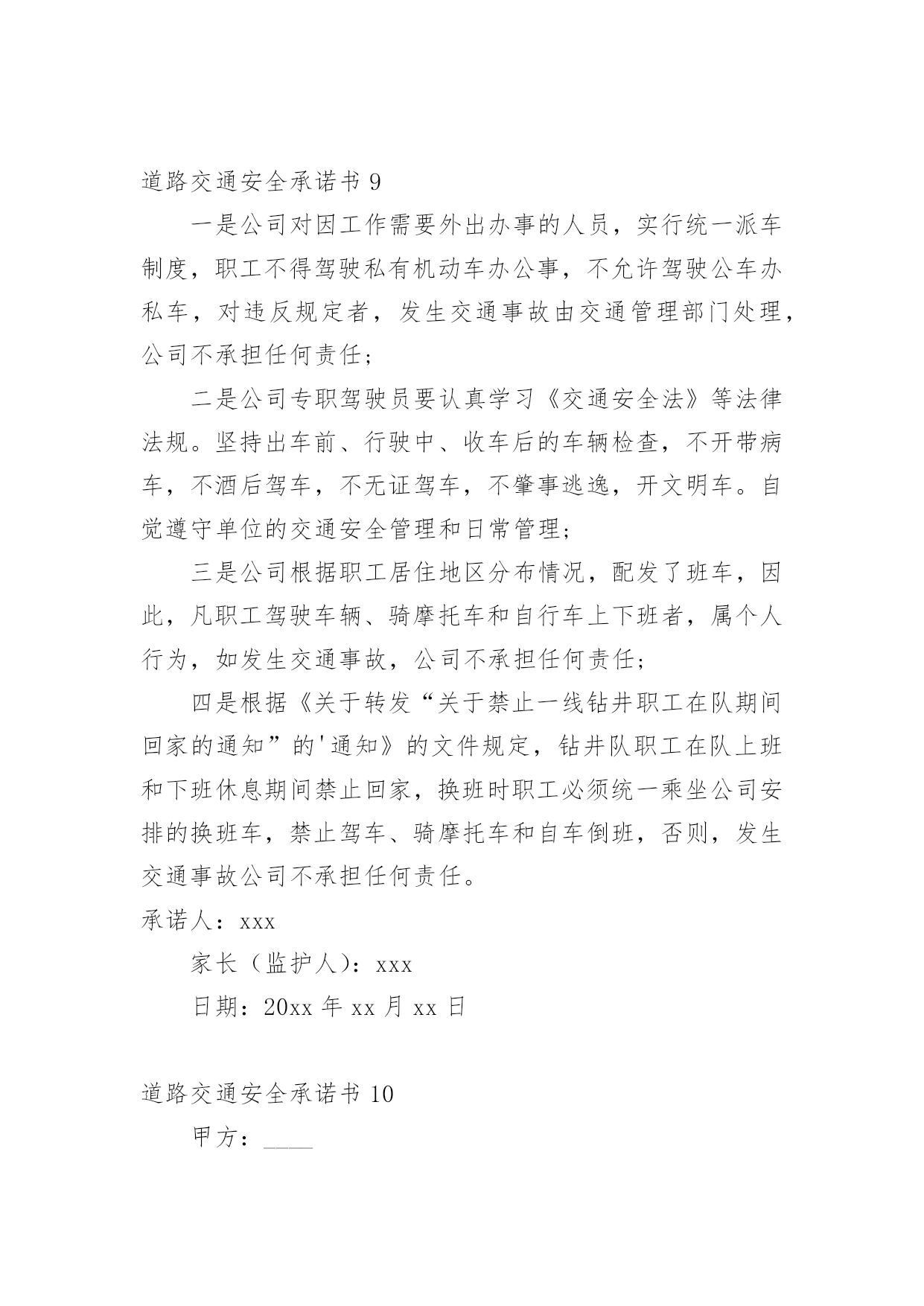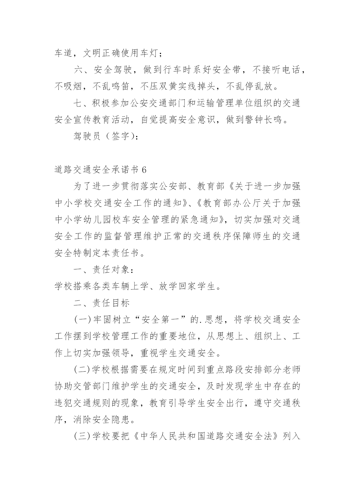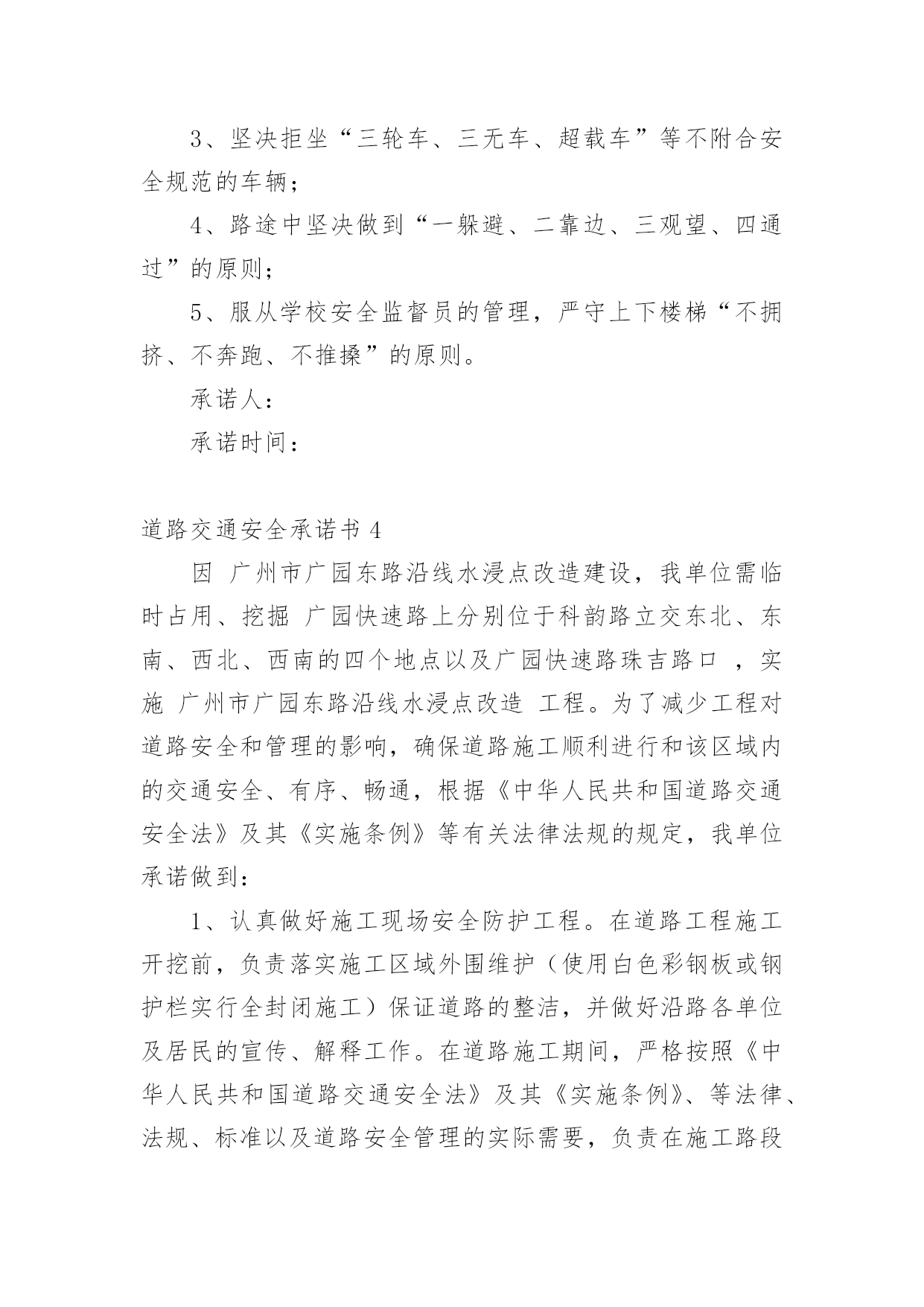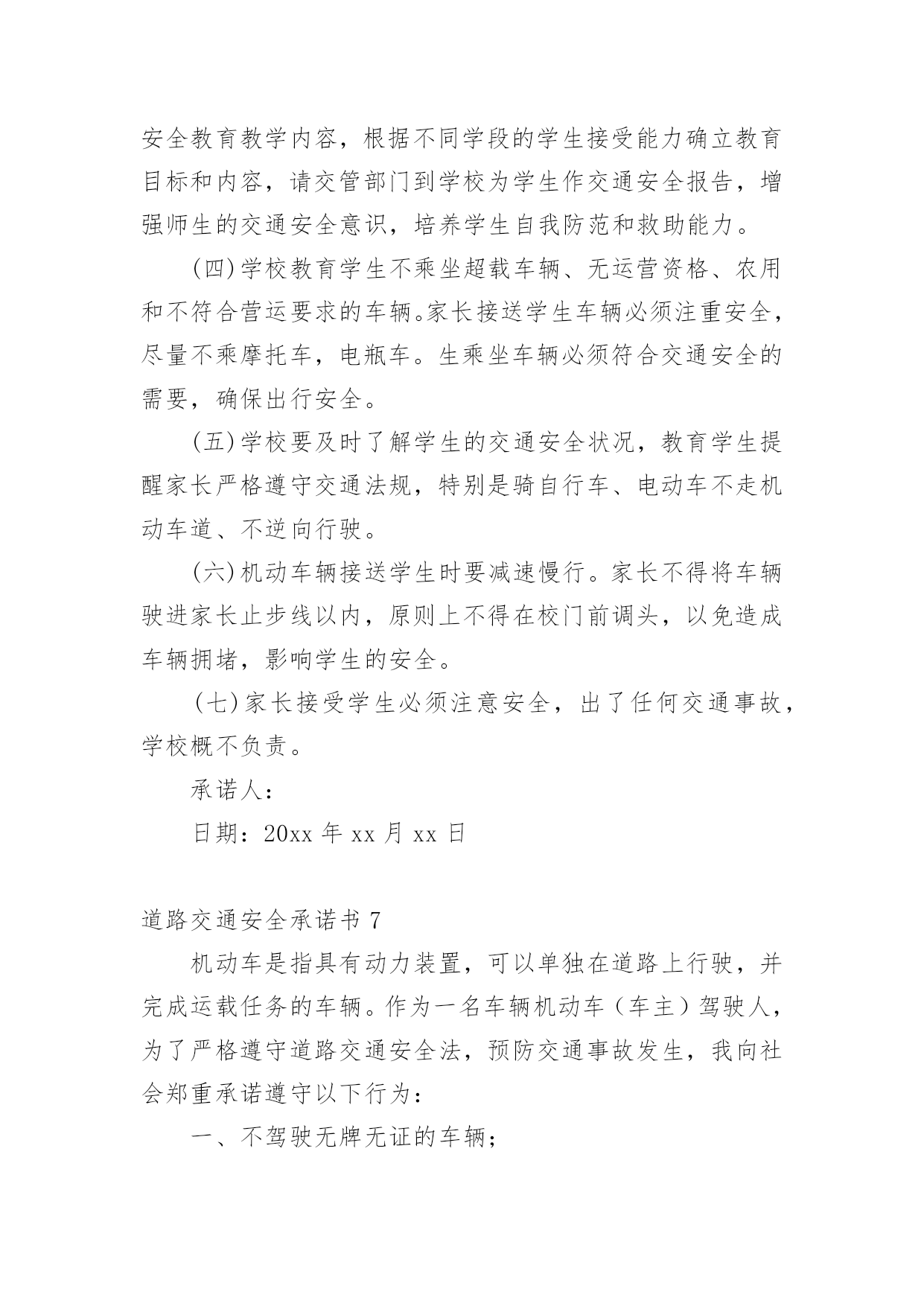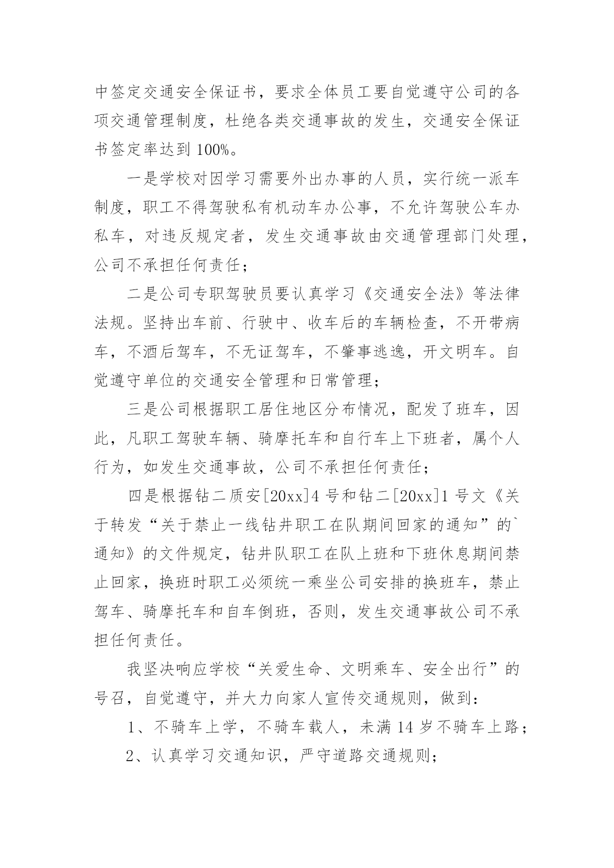道路交通安全承诺书现如今,承诺书与我们的生活息息相关,承诺书在写作上具有一定的格式要求。为了让您在写承诺书时更加简单方便,下面是小编为大家整理的道路交通安全承诺书,希望对大家有所帮助。道路交通安全承诺书1为了防止交通事故的发生,根据上级集中整治“三超一疲劳”专项行动,保障广大旅客出行安全,本人承诺如下:一、严格遵守《道路交通安全法》及相关交通法规,不超速行驶,不超员载客,不疲劳驾驶,不酒后驾驶,不在高速上停车上下旅客。二、行车前,认真检查车辆技术状况,不开带病车,行车中,时刻注意车辆技术状况变化,发现问题及时处置,回站后,认真保养车辆,确保车辆状况始终处于完好状态。三、驾驶车辆时,集中精力,安全驾驶,文明礼让。四、遇有冰雪雾天气,提前做好安全防护,自觉服从交通指挥,确保行车安全。五、积极参加单位组织的交通安全宣传教育活动,自觉提高交通安全意识,做到警钟长鸣。车辆牌号:xx承诺人:xxx联系电话:xx20xx年xx月xx日道路交通安全承诺书2为确保校内交通安全,携手创建平安校园,本人承诺遵守下列校内交通安全规定:1、自觉遵守齐鲁医药学院校规校纪、交通法规,听从工作人员指挥。2、按照流程,认真如实完整填报车辆识别系统信息登记表,及时交于安全保卫处办理车辆自动识别系统输入。如离职、车辆更换请及时到安全保卫处进行车辆信息删除或变更。3、进出校门、校内路口减速行驶,校门口限速5km/h。请保持车距,注意一车一杆。4、校内泊车,不将贵重物品存放车内,不在校园主干道和楼宇门口及场地进出口附近等影响车辆和行人通行区域泊车,将车停放于学校地下停车场及地上规定的车位上。5、校内行车时,慢速行驶,主动避让行人和非机动车,不鸣笛,不超车。严禁酒后驾车。申请人(承诺人)签名:xxx20xx年xx月xx日道路交通安全承诺书3为了落实***校交通安全责任制,加强公车和私车的车辆管理,预防交通事故的发生。近日,**一中在校全体员工中签定交通安全保证书,要求全体员工要自觉遵守公司的各项交通管理制度,杜绝各类交通事故的发生,交通安全保证书签定率达到100%。一是学校对因学习需要外出办事的人员,实行统一派车制度,职工不得驾驶私有机动车办公事,不允许驾驶公车办私车,对违反规定者,发生交通事故由交通管理部门处理,公司不承担任何责任;二是公司专职驾驶员要认真学习《交通安全法》等法律法规。坚持出车前、行驶中、收车后的车辆检查,不开带病车,不酒后驾车,不无证驾车,不肇事逃逸,开文明车。自觉遵守单位的交通安全管理和日常管理;三是公司根据职工居住地区分布情况,配发了班车,因此,凡职工驾驶车辆、骑摩托车和自行车上下班者,属个人行为,如发生交通事故,公司不承担任何责任;四是根据钻二质安[20xx]4号和钻二[20xx]1号文《关于转发“关于禁止一线钻井职工在队期间回家的通知”的`通知》的文件规定,钻井队职工在队上班和下班休息期间禁止回家,换班时职工必须统一乘坐公司安排的换班车,禁止驾车、骑摩托车和自车倒班,否则,发生交通事故公司不承担任何责任。我坚决响应学校“关爱生命、文明乘车、安全出行”的号召,自觉遵守,并大力向家人宣传交通规则,做到:1、不骑车上学,不骑车载人,未满14岁不骑车上路;2、认真学习交通知识,严守道路交通规则;3、坚决拒坐“三轮车、三无车、超载车”等不附合安全规范的车辆;4、路途中坚决做到“一躲避、二靠边、三观望、四通过”的原则;5、服从学校安全监督员的管理,严守上下楼梯“不拥挤、不奔跑、不推搡”的原则。承诺人:承诺时间:道路交通安全承诺书4因广州市广园东路沿线水浸点改造建设,我单位需临时占用、挖掘广园快速路上分别位于科韵路立交东北、东南、西北、西南的四个地点以及广园快速路珠吉路口,实施广州市广园东路沿线水浸点改造工程。为了减少工程对道路安全和管理的影响,确保道路施工顺利进行和该区域内的交通安全、有序、畅通,根据《中华人民共和国道路交通安全法》及其《实施条例》等有关法律法规的规定,我单位承诺做到:1、认真做好施工现场安全防护工程。在道路工程施工开挖前,负责落实施工区域外围维护(使用白色彩钢板或钢护栏实行全封闭施工)保证道路的整洁,并做好沿路各单位及居民的宣传、解释工作。在道路施工期间,严格按照《中华人民共和国道路交通安全法》及其《实施条例》、等法律、法规、标准以及道路安全管理的实际需要,负责在施工路段及邻近交口设在安装好交通安全设施。2、认真做好施工现场及周边区域道路的`交通安全管理工作。积极协助并安装公安机关交通管理部门的要求,组织工作人员,落实工程施工区域内的道路交通组织管理和交通疏导措施,确保道路施工工程顺利进行和道路安全。3、严格遵守工程工期,20xx年X月X日至20xx年X月X日。4、在工程施工期间,如有道路交通管理设施因工程施工而损坏,我方承诺照价赔