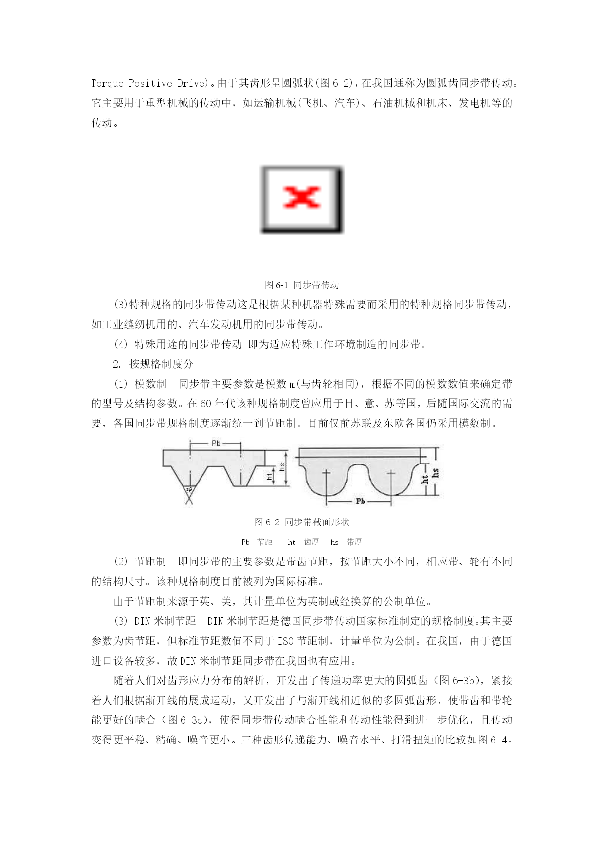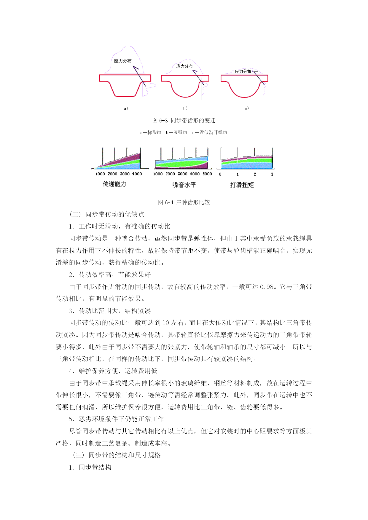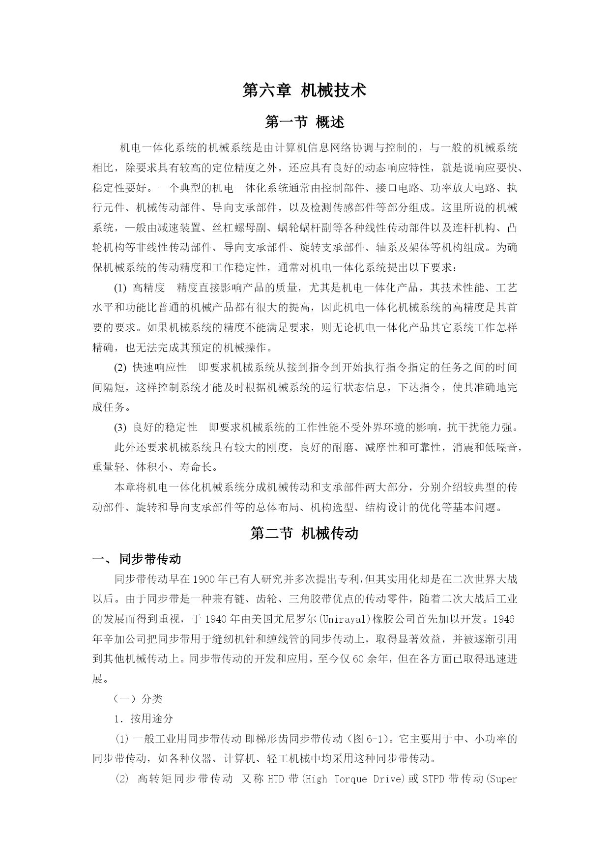 第六章机械技术第一节概述机电一体化系统的机械系统是由计算机信息网络协调与控制的,与一般的机械系统相比,除要求具有较高的定位精度之外,还应具有良好的动态响应特性,就是说响应要快、稳定性要好。一个典型的机电一体化系统通常由控制部件、接口电路、功率放大电路、执行元件、机械传动部件、导向支承部件,以及检测传感部件等部分组成。这里所说的机械系统,—般由减速装置、丝杠螺母副、蜗轮蜗杆副等各种线性传动部件以及连杆机构、凸轮机构等非线性传动部件、导向支承部件、旋转支承部件、轴系及架体等机构组成。为确保机械系统的传动精度和工作稳定性,通常对机电一体化系统提出以下要求:(1)高精度精度直接影响产品的质量,尤其是机电一体化产品,其技术性能、工艺水平和功能比普通的机械产品都有很大的提高,因此机电一体化机械系统的高精度是其首要的要求。如果机械系统的精度不能满足要求,则无论机电一体化产品其它系统工作怎样精确,也无法完成其预定的机械操作。(2)快速响应性即要求机械系统从接到指令到开始执行指令指定的任务之间的时间间隔短,这样控制系统才能及时根据机械系统的运行状态信息,下达指令,使其准确地完成任务。(3)良好的稳定性即要求机械系统的工作性能不受外界环境的影响,抗干扰能力强。此外还要求机械系统具有较大的刚度,良好的耐磨、减摩性和可靠性,消震和低噪音,重量轻、体积小、寿命长。本章将机电一体化机械系统分成机械传动和支承部件两大部分,分别介绍较典型的传动部件、旋转和导向支承部件等的总体布局、机构选型、结构设计的优化等基本问题。第二节机械传动同步带传动同步带传动早在1900年已有人研究并多次提出专利,但其实用化却是在二次世界大战以后。由于同步带是一种兼有链、齿轮、三角胶带优点的传动零件,随着二次大战后工业的发展而得到重视,于1940年由美国尤尼罗尔(Unirayal)橡胶公司首先加以开发。1946年辛加公司把同步带用于缝纫机针和缠线管的同步传动上,取得显著效益,并被逐渐引用到其他机械传动上。同步带传动的开发和应用,至今仅60余年,但在各方面已取得迅速进展。(一)分类1.按用途分(1)一般工业用同步带传动即梯形齿同步带传动(图6-1)。它主要用于中、小功率的同步带传动,如各种仪器、计算机、轻工机械中均采用这种同步带传动。(2)高转矩同步带传动又称HTD带(HighTorqueDrive)或STPD带传动(SuperTorquePositiveDrive)。由于其齿形呈圆弧状(图6-2),在我国通称为圆弧齿同步带传动。它主要用于重型机械的传动中,如运输机械(飞机、汽车)、石油机械和机床、发电机等的传动。图6-1同步带传动(3)特种规格的同步带传动这是根据某种机器特殊需要而采用的特种规格同步带传动,如工业缝纫机用的、汽车发动机用的同步带传动。(4)特殊用途的同步带传动即为适应特殊工作环境制造的同步带。2.按规格制度分(1)模数制同步带主要参数是模数m(与齿轮相同),根据不同的模数数值来确定带的型号及结构参数。在60年代该种规格制度曾应用于日、意、苏等国,后随国际交流的需要,各国同步带规格制度逐渐统一到节距制。目前仅前苏联及东欧各国仍采用模数制。图6-2同步带截面形状Pb—节距ht—齿厚hs—带厚(2)节距制即同步带的主要参数是带齿节距,按节距大小不同,相应带、轮有不同的结构尺寸。该种规格制度目前被列为国际标准。由于节距制来源于英、美,其计量单位为英制或经换算的公制单位。(3)DIN米制节距DIN米制节距是德国同步带传动国家标准制定的规格制度。其主要参数为齿节距,但标准节距数值不同于ISO节距制,计量单位为公制。在我国,由于德国进口设备较多,故DIN米制节距同步带在我国也有应用。随着人们对齿形应力分布的解析,开发出了传递功率更大的圆弧齿(图6-3b),紧接着人们根据渐开线的展成运动,又开发出了与渐开线相近似的多圆弧齿形,使带齿和带轮能更好的啮合(图6-3c),使得同步带传动啮合性能和传动性能得到进一步优化,且传动变得更平稳、精确、噪音更小。三种齿形传递能力、噪音水平、打滑扭矩的比较如图6-4。a)b)c)图6-3同步带齿形的变迁a—梯形齿b—圆弧齿c—近似渐开线齿图6-4三种齿形比较(二)同步带传动的优缺点1.工作时无滑动,有准确的传动比同步带传动是一种啮合传动,虽然同步带是弹性体,但由于其中承受负载的承载绳具有在拉力作用下不伸长的特性,故能保持带节距不变,使带与轮齿槽能正确啮合,实现无滑差的同步传动,获得精确的传动比。2.传动效率高,节能效果好由于同步带作无滑动的同步传动,故有较高的传动效率,一般可达0.98。它与三角带传动相比,有明显的节能效果。3.传动比范围大,结构紧凑同步带传动的传动比一般可