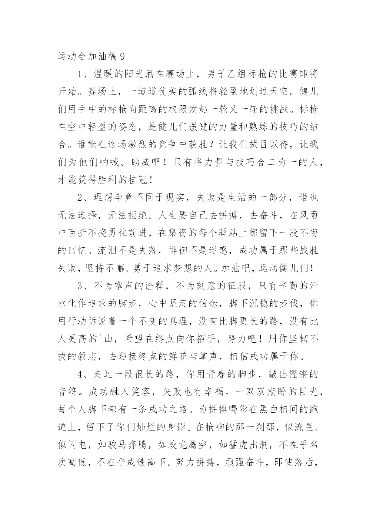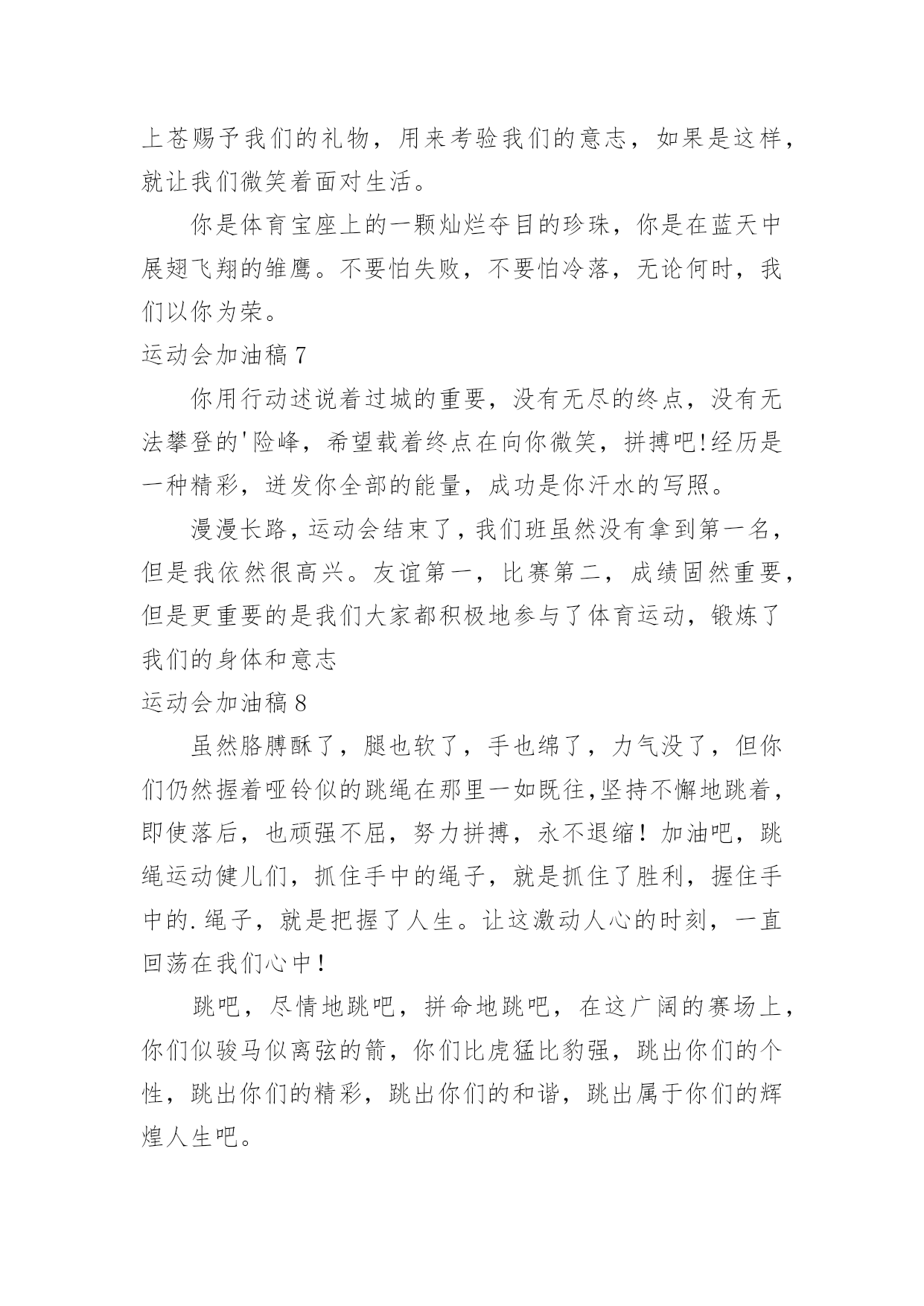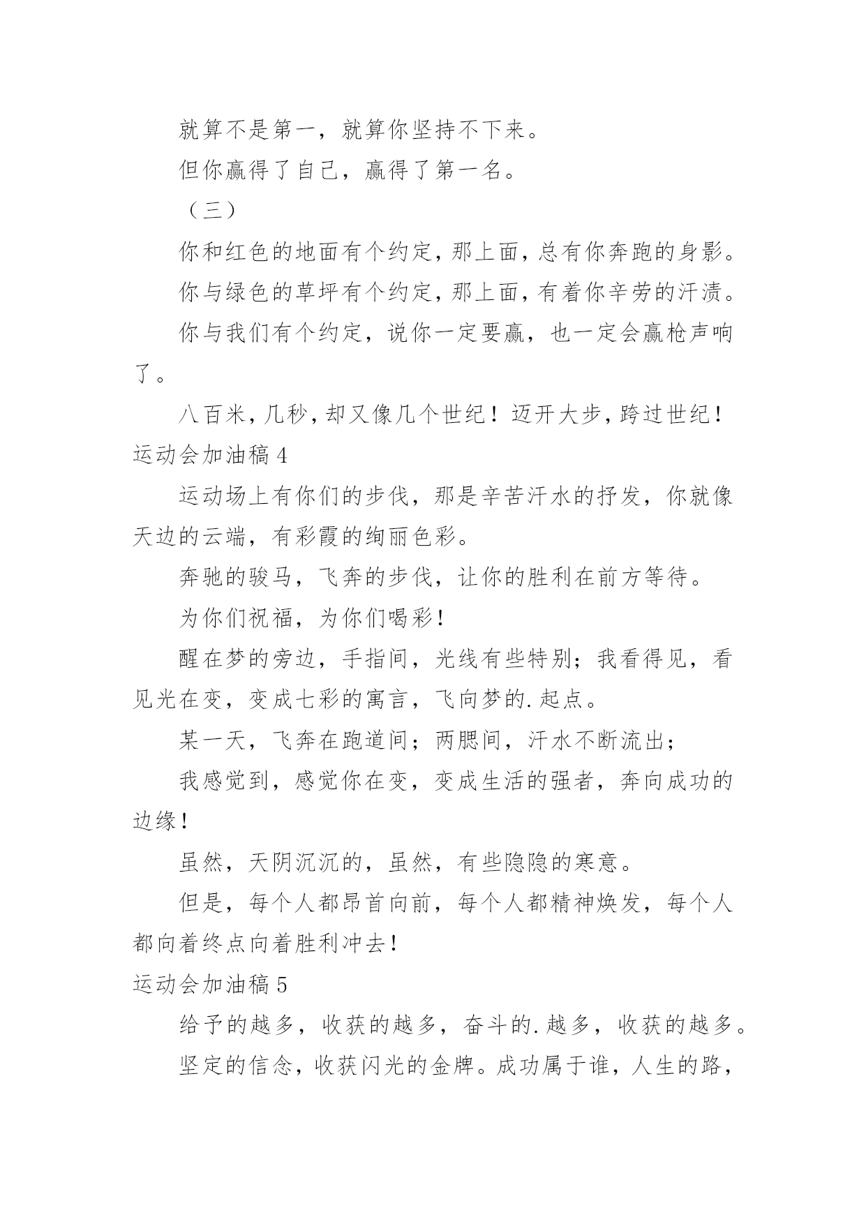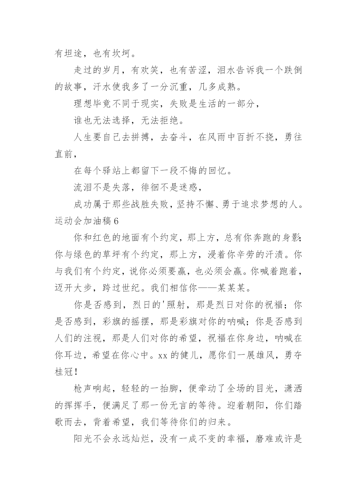 运动会加油稿运动会加油稿在社会发展不断提速的今天,越来越多人会去使用加油稿,加油稿可以增添对方必胜的勇气和信心。为了让您在写加油稿时更加简单方便,下面是小编为大家整理的运动会加油稿,仅供参考,希望能够帮助到大家。运动会加油稿1漫漫征途,加油吧!运动健儿们。不要畏惧对手的'强大,你的对手只有你自己。1000米算不得什么,付出的泪水就要得到回报。看,秋风在为你喝彩,和煦的阳光在为你加油。冲吧,运动健儿们。你所有的朋友在为你呐喊。运动会加油稿2大海如此的浩淼,鼓声多么美妙,运动员们,你们不再像平时那样渺小,我们默默的祈祷,以你们为骄傲,我们会永远为你们叫好。青春的脚步,青春的速度,青春的活力,青春的激情,将会在你们的身上尽情体现。迎接自我,挑战自我,战胜自我!我们坚信你们一定能行,加油吧,运动员!终点就在眼前!年轻的我们自信飞扬,青春的气息如同初升的朝阳,蓬勃的力量如同阳光的挥洒。此时此刻,跑道便是我们精彩的舞台,声声加油便是我们的.奖项!论何成功,谈何荣辱,心中的信念只有一个:拼搏!萧瑟的秋风,挡不住你们破竹的锐气。毅力与精神活跃在会场上,湿透的衣衫,满头的大汗,无限追求,奋力追赶,我们为你欢呼跳跃。运动会加油稿3(一)你是运动场的心脏,跳动梦想。你是漫长路的精神,激励辉煌。你们是将上下求索的人!风为你加油,云为你助兴。坚定,执着,耐力与希望。在延伸的白色跑道中点点凝聚!力量,信念,拼搏与奋斗。在遥远的终点线上渐渐明亮!时代的强音正在你的`脚下踏响。(二)听到800米跑,你会害怕自己会输,或自己坚持不下来。但是只要你努力了,为这件事情用心了。就算不是第一,就算你坚持不下来。但你赢得了自己,赢得了第一名。(三)你和红色的地面有个约定,那上面,总有你奔跑的身影。你与绿色的草坪有个约定,那上面,有着你辛劳的汗渍。你与我们有个约定,说你一定要赢,也一定会赢枪声响了。八百米,几秒,却又像几个世纪!迈开大步,跨过世纪!运动会加油稿4运动场上有你们的步伐,那是辛苦汗水的抒发,你就像天边的云端,有彩霞的绚丽色彩。奔驰的骏马,飞奔的步伐,让你的胜利在前方等待。为你们祝福,为你们喝彩!醒在梦的旁边,手指间,光线有些特别;我看得见,看见光在变,变成七彩的寓言,飞向梦的.起点。某一天,飞奔在跑道间;两腮间,汗水不断流出;我感觉到,感觉你在变,变成生活的强者,奔向成功的边缘!虽然,天阴沉沉的,虽然,有些隐隐的寒意。但是,每个人都昂首向前,每个人都精神焕发,每个人都向着终点向着胜利冲去!运动会加油稿5给予的越多,收获的越多,奋斗的.越多,收获的越多。坚定的信念,收获闪光的金牌。成功属于谁,人生的路,有坦途,也有坎坷。走过的岁月,有欢笑,也有苦涩,泪水告诉我一个跌倒的故事,汗水使我多了一分沉重,几多成熟。理想毕竟不同于现实,失败是生活的一部分,谁也无法选择,无法拒绝。人生要自己去拼搏,去奋斗,在风雨中百折不挠,勇往直前,在每个驿站上都留下一段不悔的回忆。流泪不是失落,徘徊不是迷惑,成功属于那些战胜失败,坚持不懈、勇于追求梦想的人。运动会加油稿6你和红色的地面有个约定,那上方,总有你奔跑的身影;你与绿色的草坪有个约定,那上方,浸着你辛劳的汗渍。你与我们有个约定,说你必须要赢,也必须会赢。你喊着跑着,迈开大步,跨过世纪。我们相信你——某某某。你是否感到,烈日的'照射,那是烈日对你的祝福;你是否感到,彩旗的摇摆,那是彩旗对你的呐喊;你是否感到人们的注视,那是人们对你的希望,祝福在你身边,呐喊在你耳边,希望在你心中。xx的健儿,愿你们一展雄风,勇夺桂冠!枪声响起,轻轻的一抬脚,便牵动了全场的目光,潇洒的挥挥手,便满足了那一份无言的等待。迎着朝阳,你们踏歌而去,背着希望,我们等待你们的归来。阳光不会永远灿烂,没有一成不变的幸福,磨难或许是上苍赐予我们的礼物,用来考验我们的意志,如果是这样,就让我们微笑着面对生活。你是体育宝座上的一颗灿烂夺目的珍珠,你是在蓝天中展翅飞翔的雏鹰。不要怕失败,不要怕冷落,无论何时,我们以你为荣。运动会加油稿7你用行动述说着过城的重要,没有无尽的终点,没有无法攀登的'险峰,希望载着终点在向你微笑,拼搏吧!经历是一种精彩,迸发你全部的能量,成功是你汗水的写照。漫漫长路,运动会结束了,我们班虽然没有拿到第一名,但是我依然很高兴。友谊第一,比赛第二,成绩固然重要,但是更重要的是我们大家都积极地参与了体育运动,锻炼了我们的身体和意志运动会加油稿8虽然胳膊酥了,腿也软了,手也绵了,力气没了,但你们仍然握着哑铃似的跳绳在那里一如既往,坚持不懈地跳着,即使落后,也顽强不屈,努力拼搏,永不退缩!加油吧,跳绳运动健儿们,抓住手中的绳子,就是抓住了胜利,握住手中的.绳子,就是把握了人生。让这激动人心的时刻,一直回荡在我们心中!跳吧,尽情地跳吧,拼命地跳吧,在这